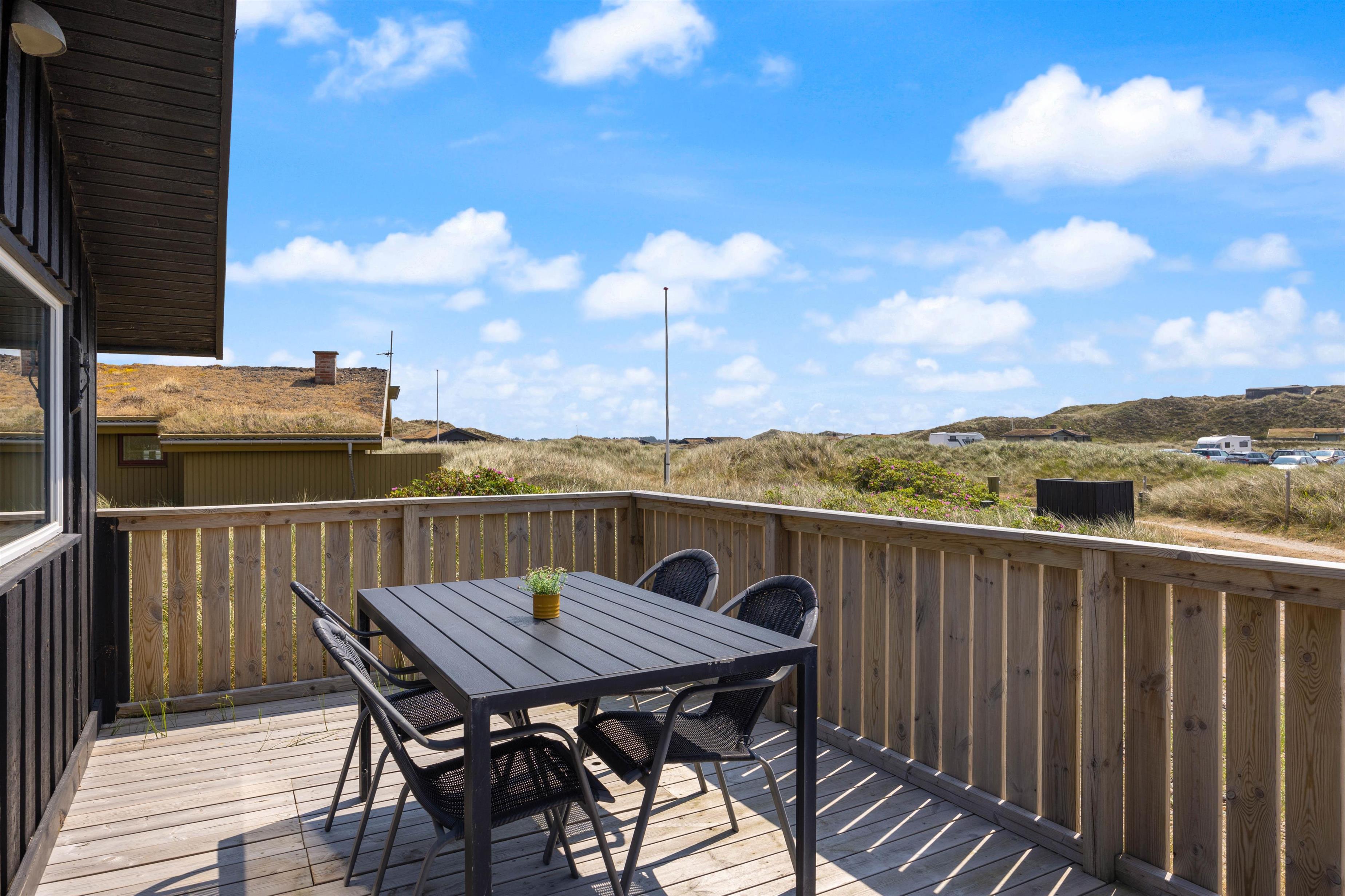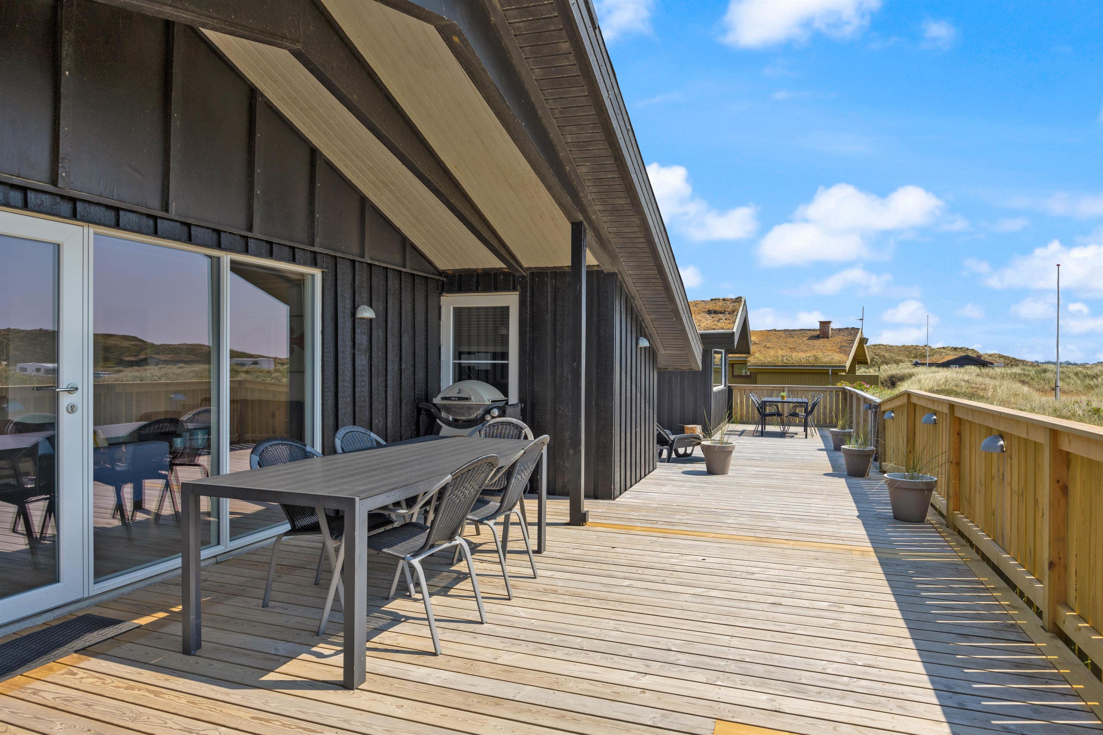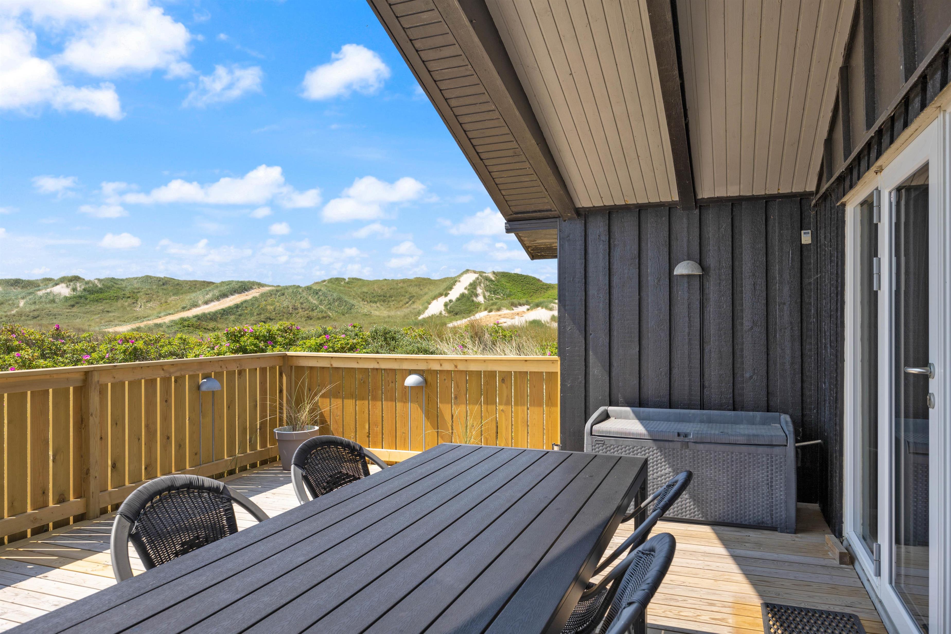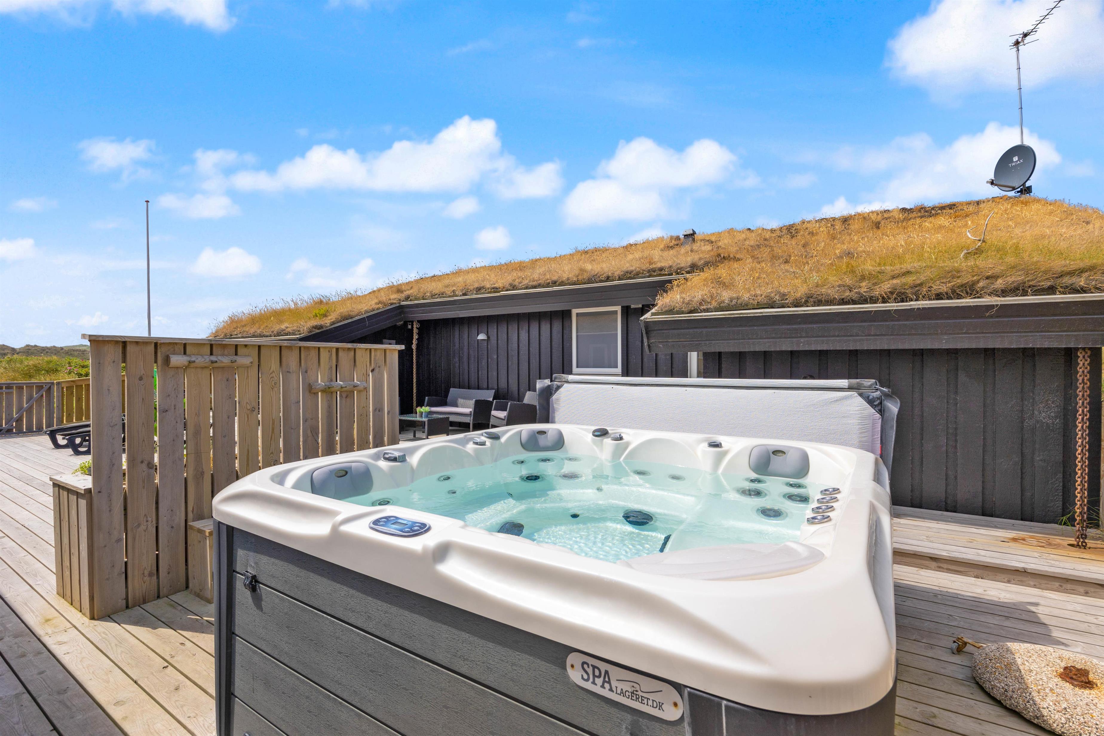 På den østvendte terrasse ved sommerhusets indgang kan I sætte jer til rette med morgenkaffen og få den perfekte start på dagen. Her kan I også slappe af til lyden fra bølgerne og nyde en gang massage i det varme udespa eller et varmt bad under udendørsbruseren; måske efter en forfriskende dukkert i Vesterhavet? Udebruseren kan benyttes fra april til november måned.