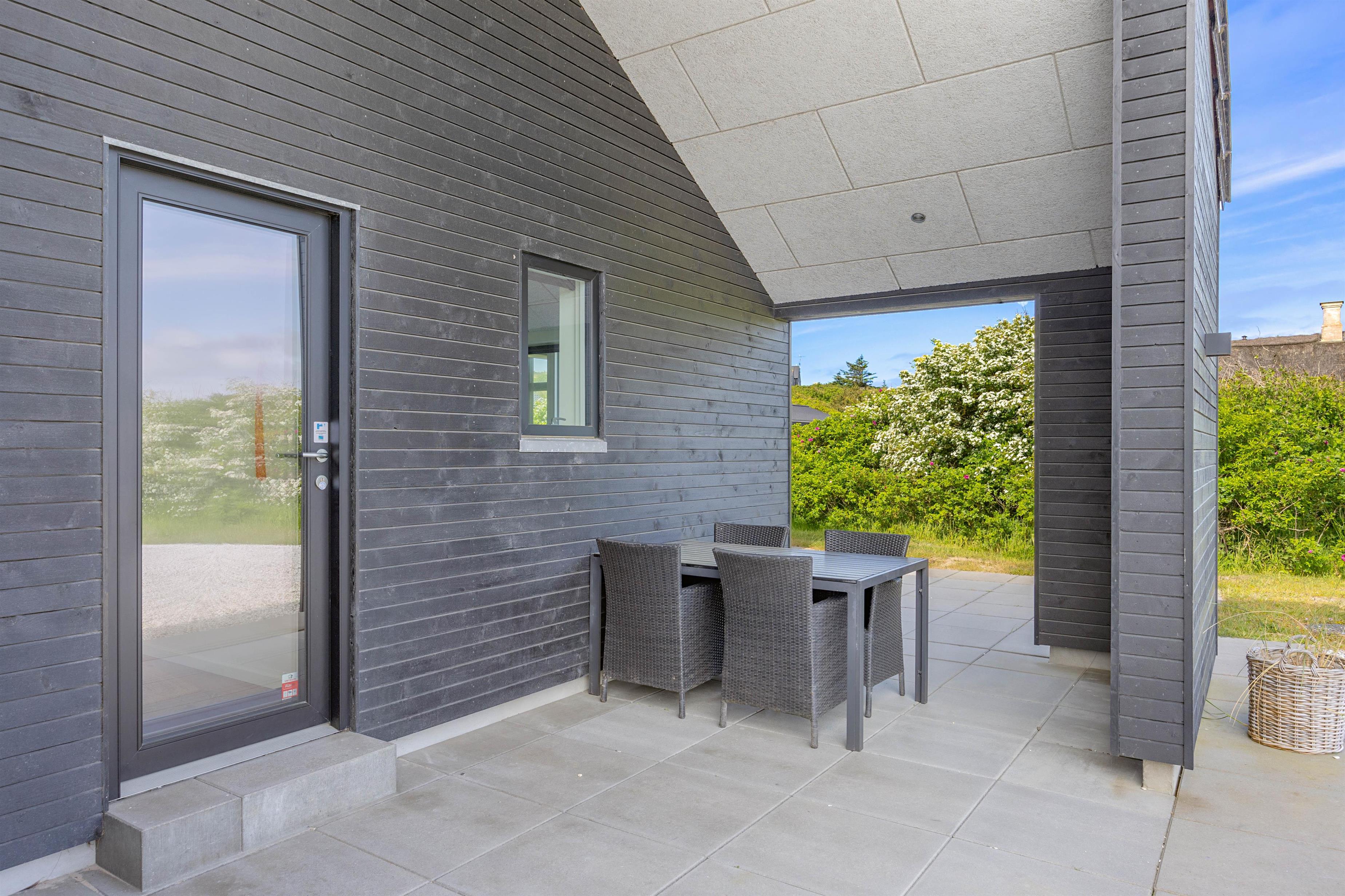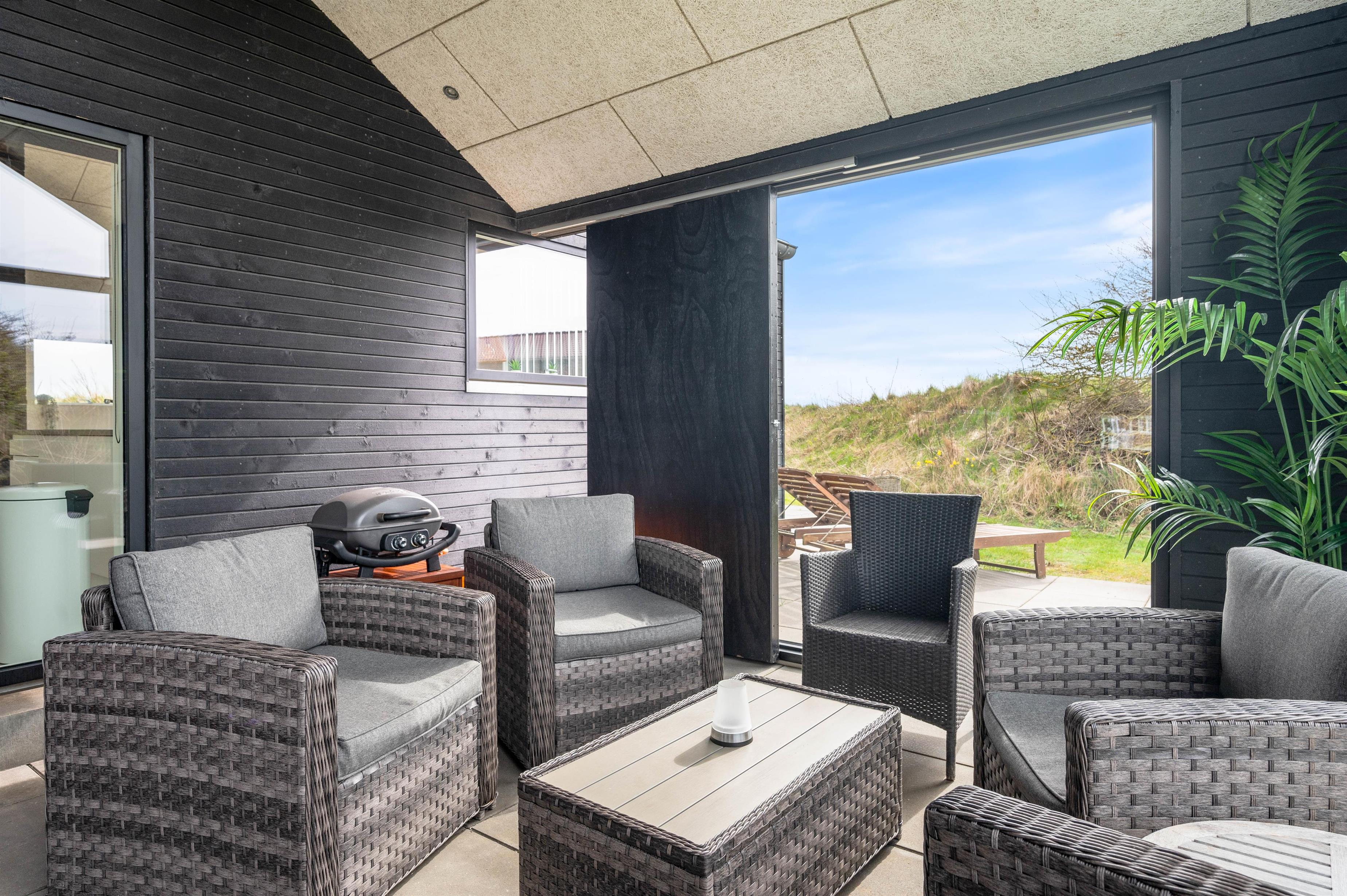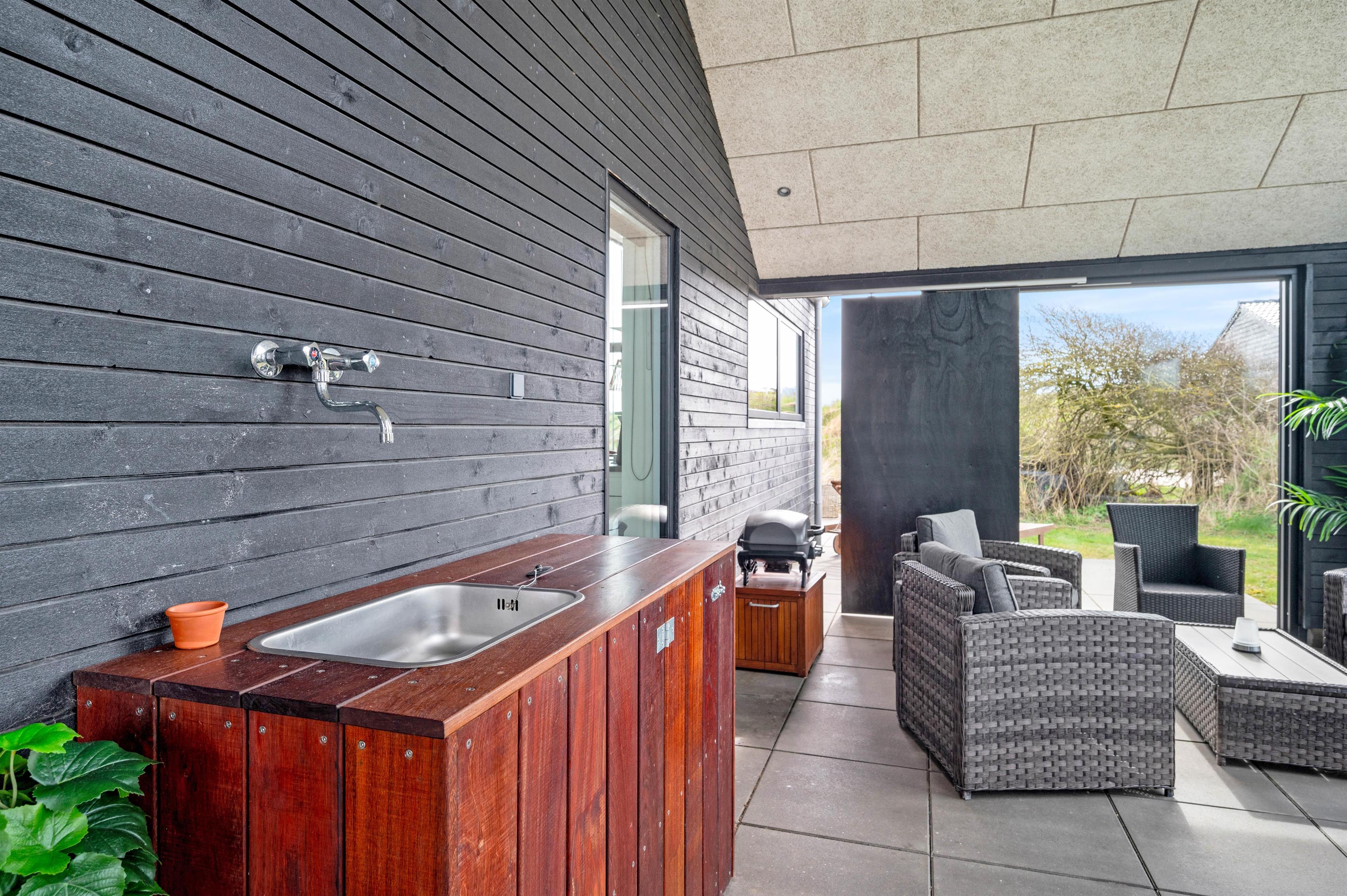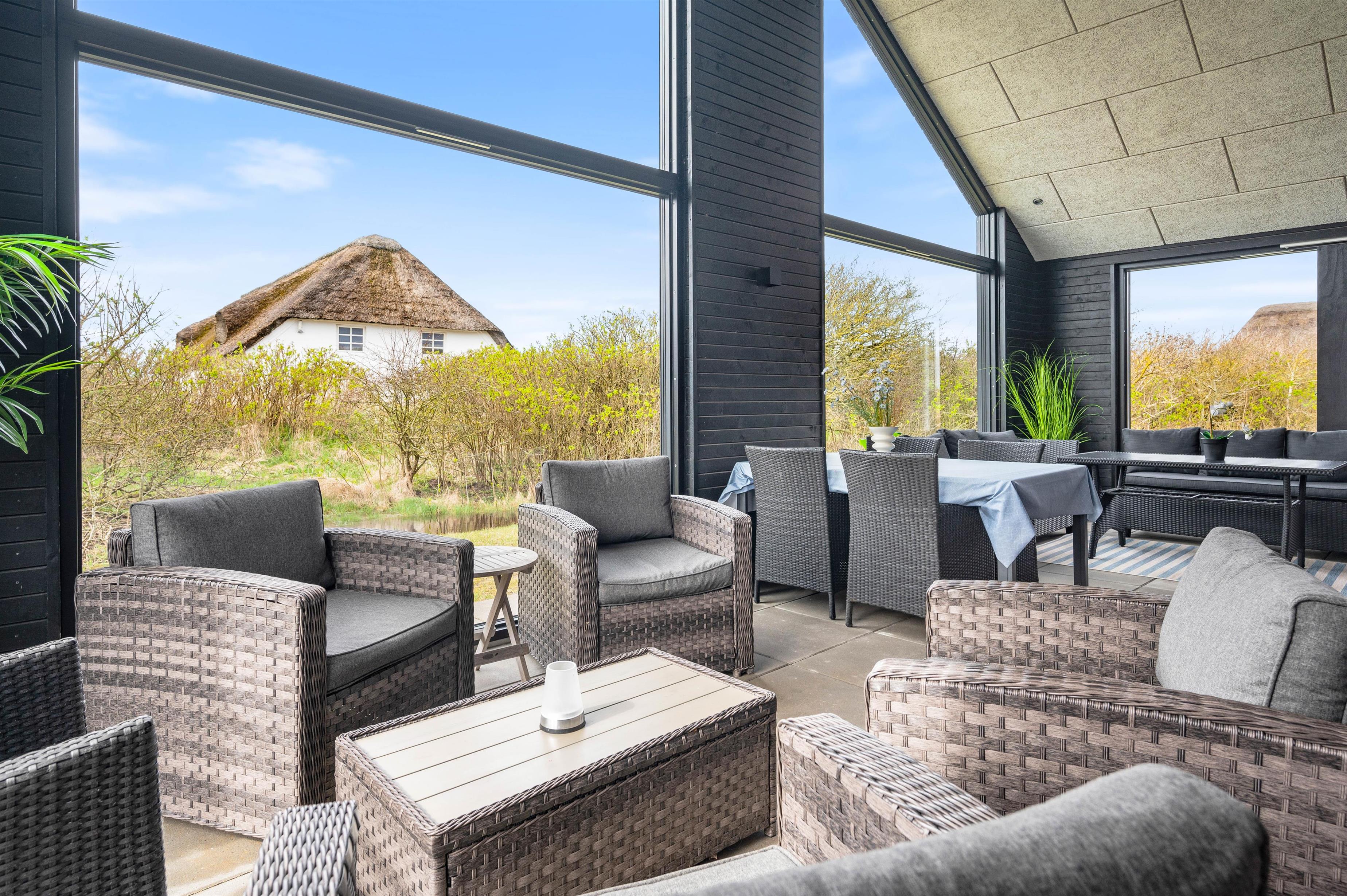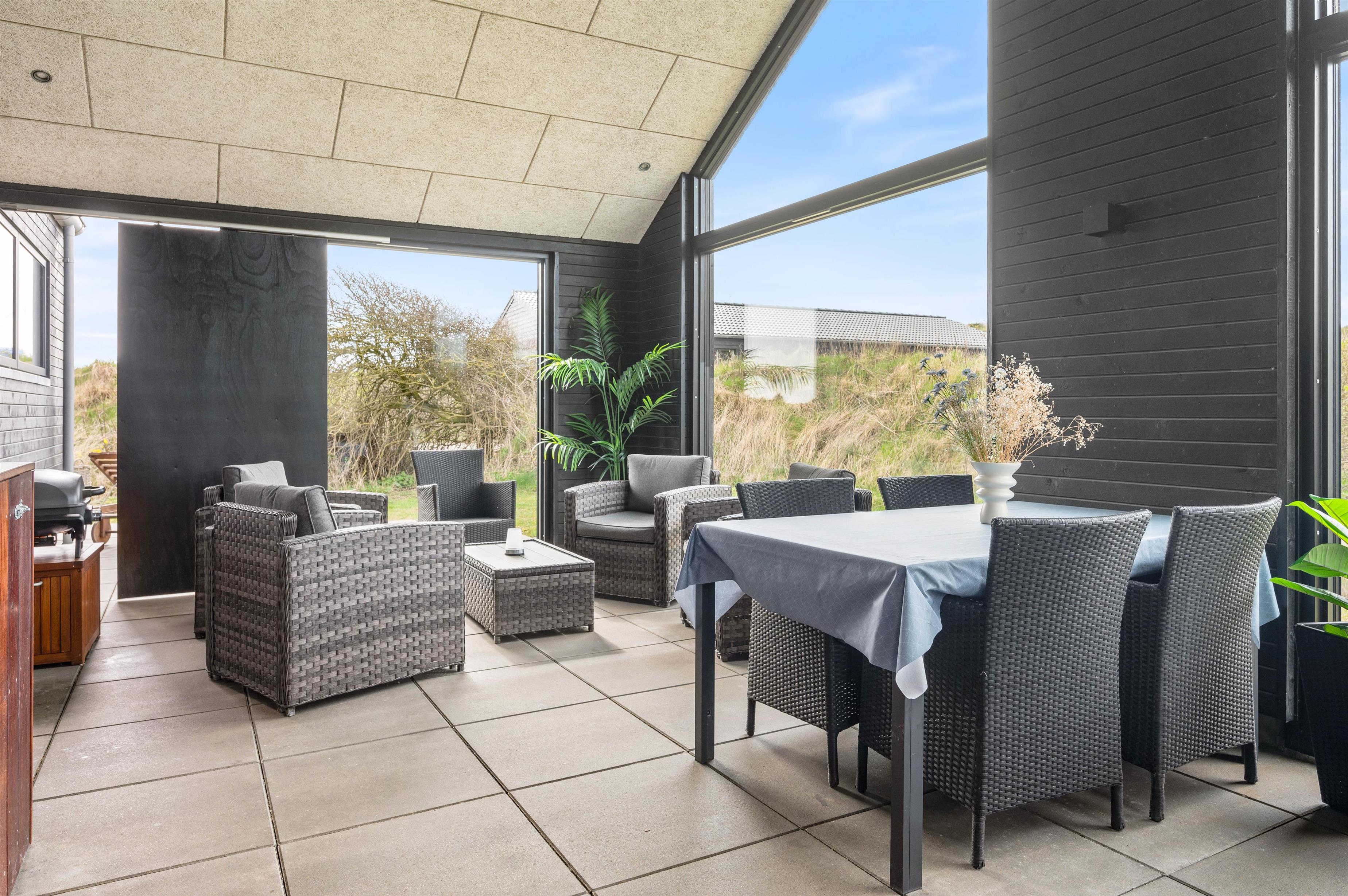 Også udvendigt har sommerhuset masser at byde på. Terrassen har både en afskærmet og overdækket del på hele 50m2, og en åben del, så I til hver en tid kan nyde den friske havluft og betragte Houvigs smukke natur. I kan trygt lade børnene eller jeres kæledyr lege frit på terrassen, da den også kan aflukkes. Havemøbler, liggestole og en god grill sørger for, at I kan få det bedste ud af de solrige dage på terrassen og runde af med en hyggelig grillaften i den lune aftensol. Der er også en dejlig udestue ca. 40 m2m hvor I kan sidde og hygge jer.