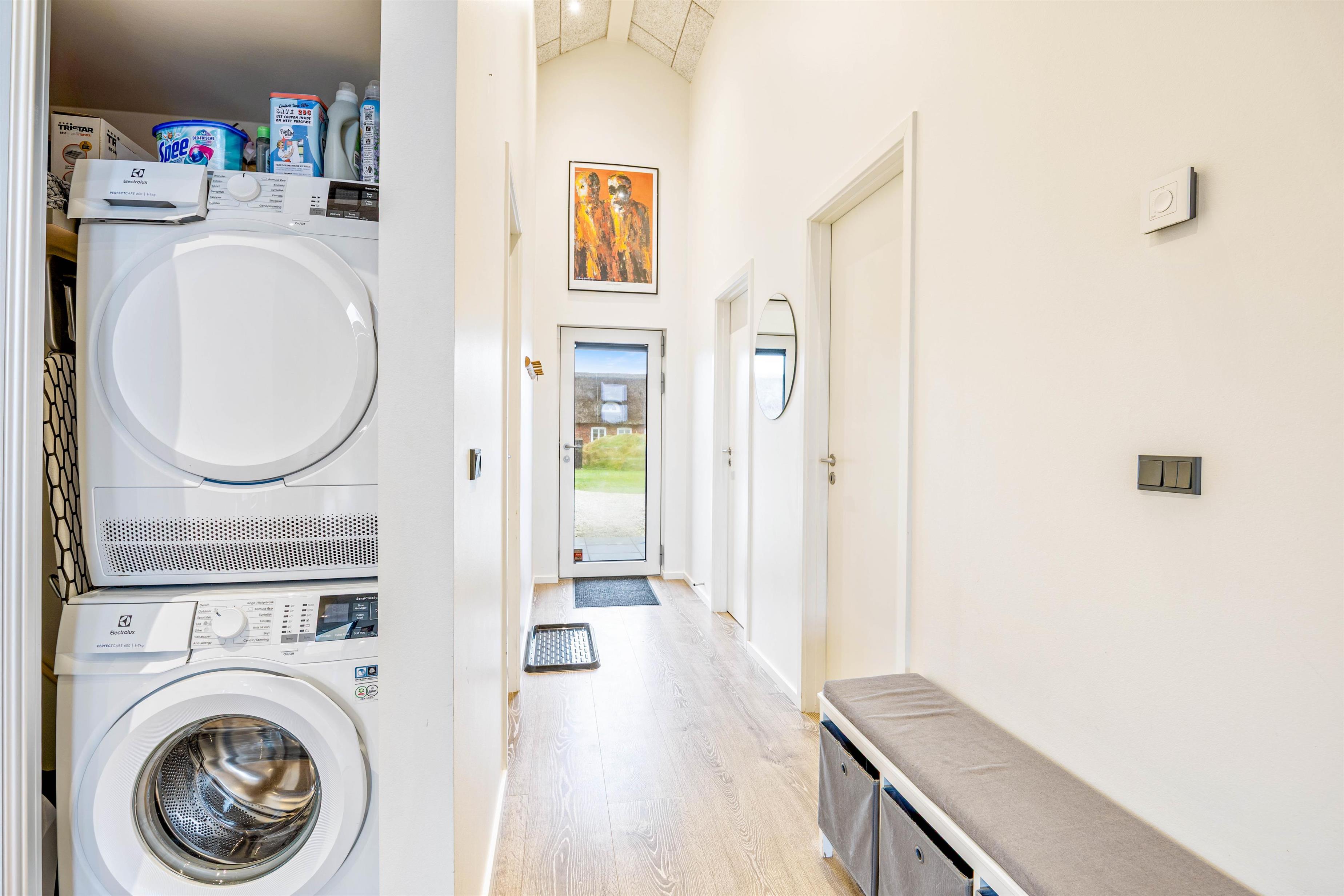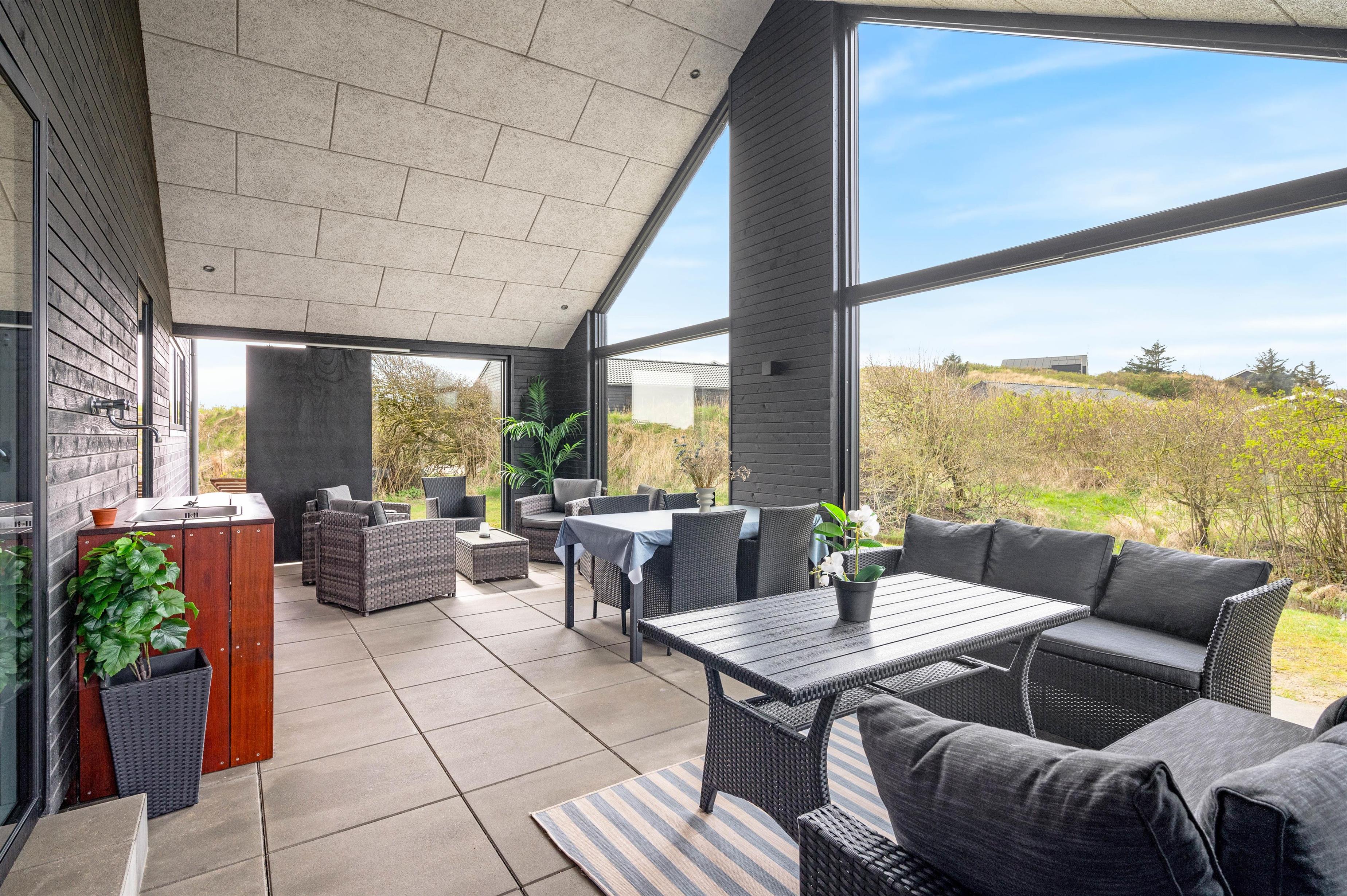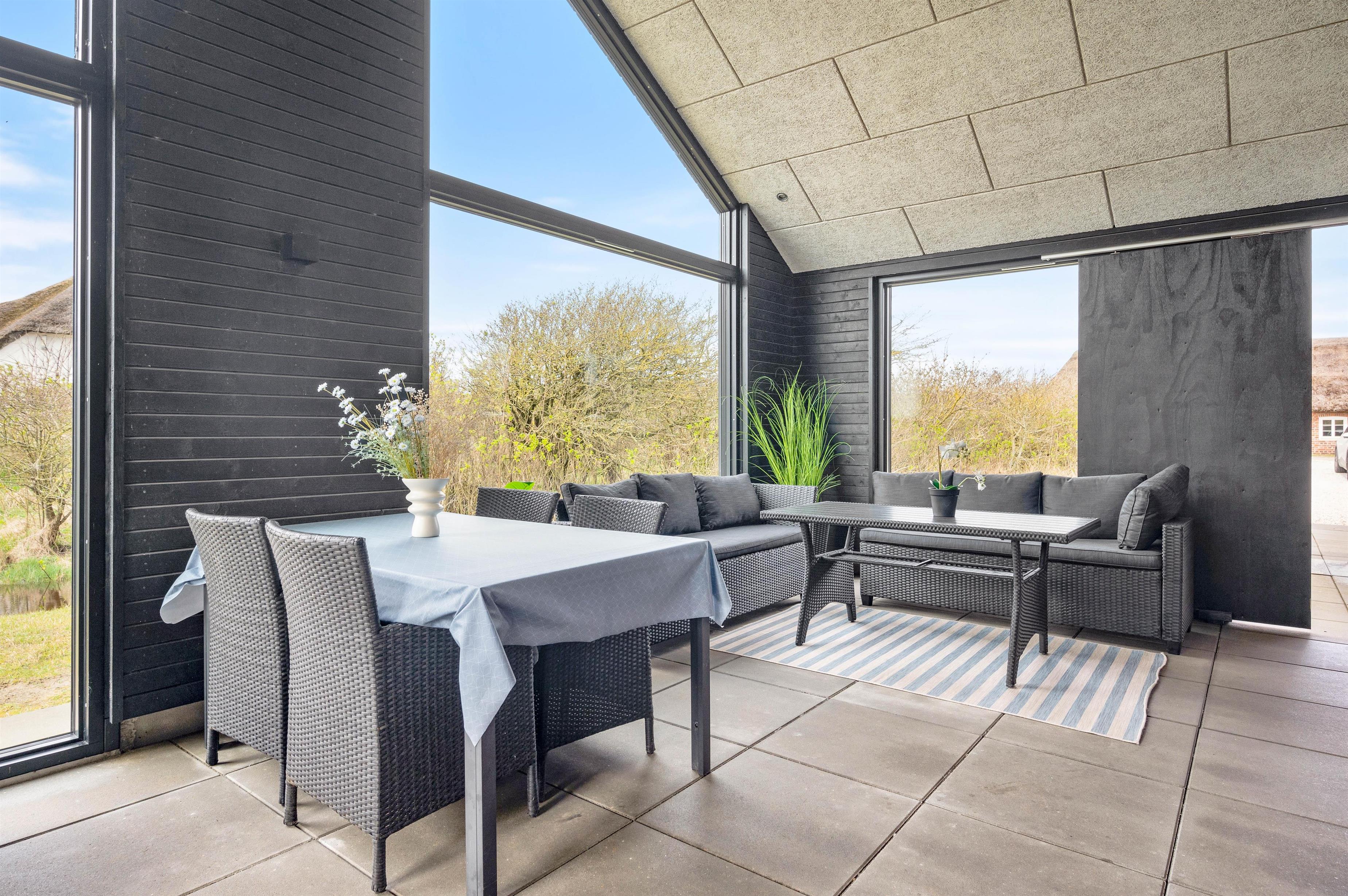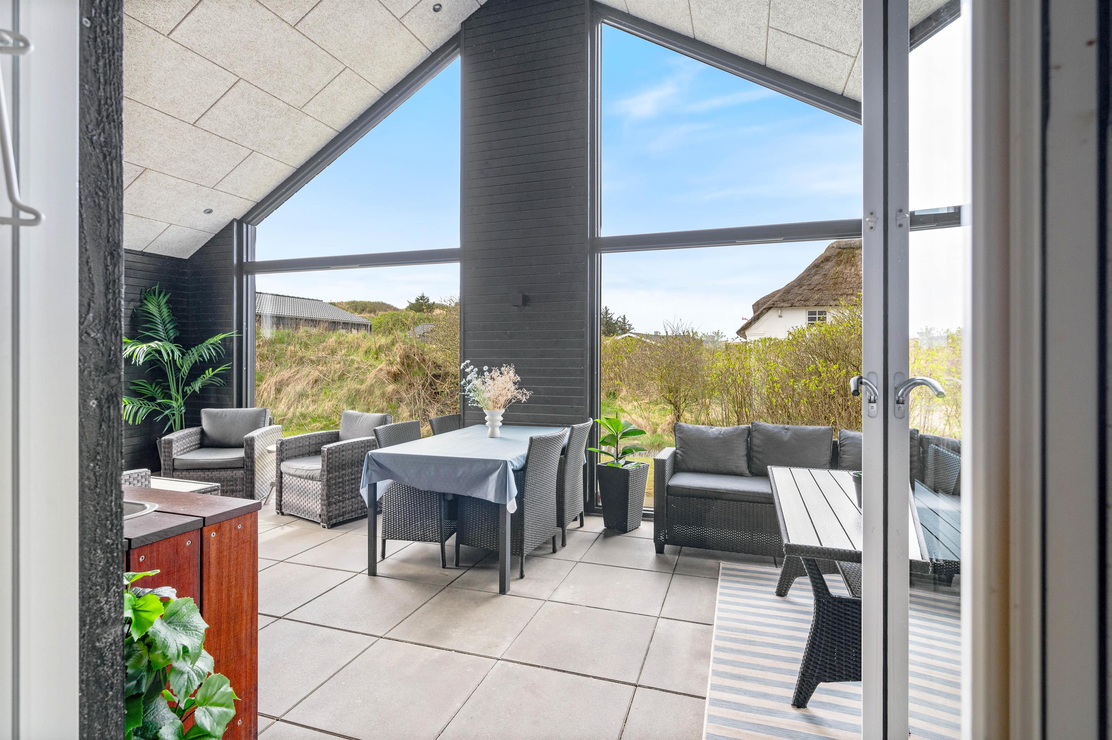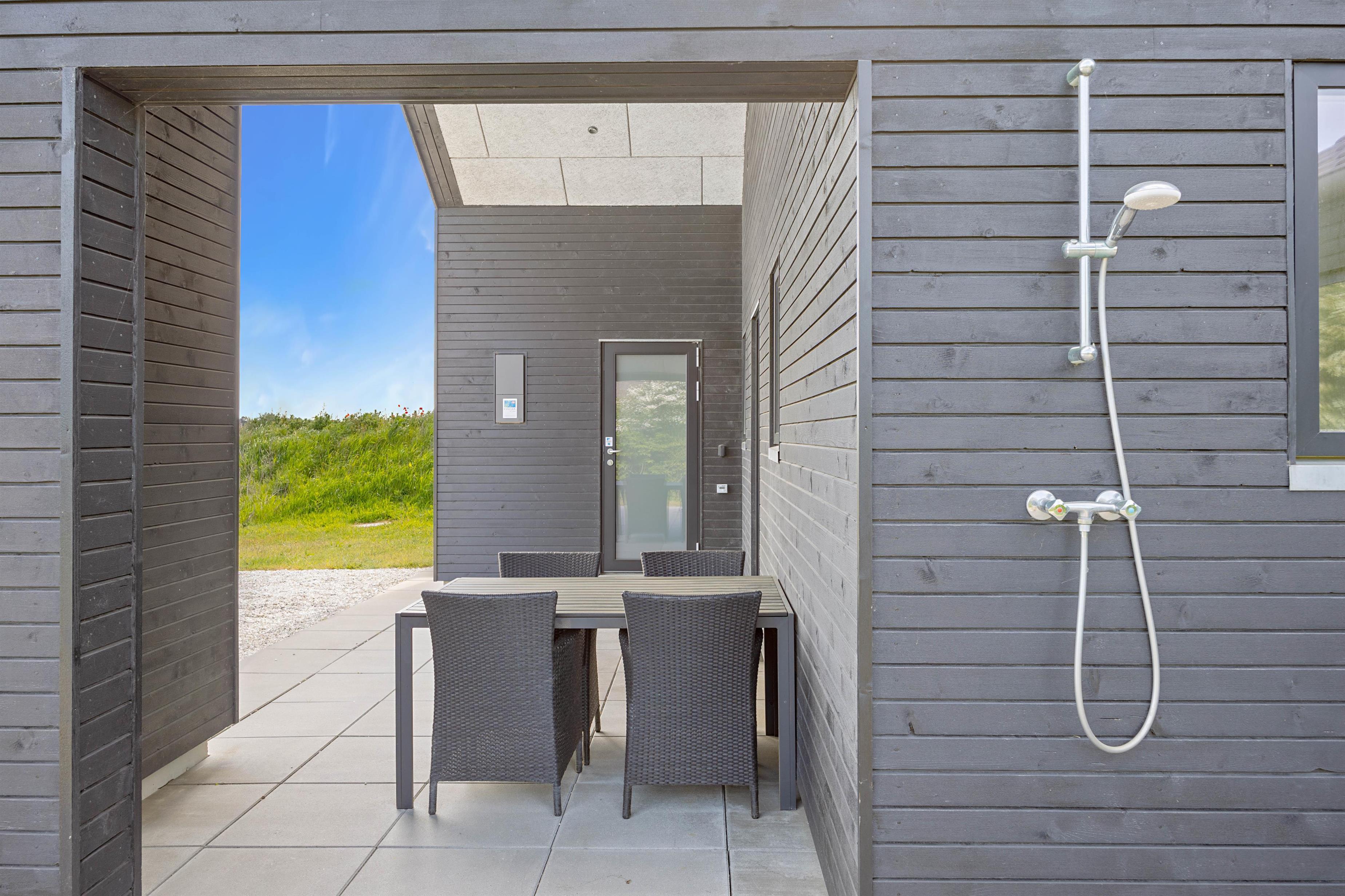 Også udvendigt har sommerhuset masser at byde på. Terrassen har både en afskærmet og overdækket del på hele 50m2, og en åben del, så I til hver en tid kan nyde den friske havluft og betragte Houvigs smukke natur. I kan trygt lade børnene eller jeres kæledyr lege frit på terrassen, da den også kan aflukkes. Havemøbler, liggestole og en god grill sørger for, at I kan få det bedste ud af de solrige dage på terrassen og runde af med en hyggelig grillaften i den lune aftensol. Der er også en dejlig udestue ca. 40 m2m hvor I kan sidde og hygge jer.