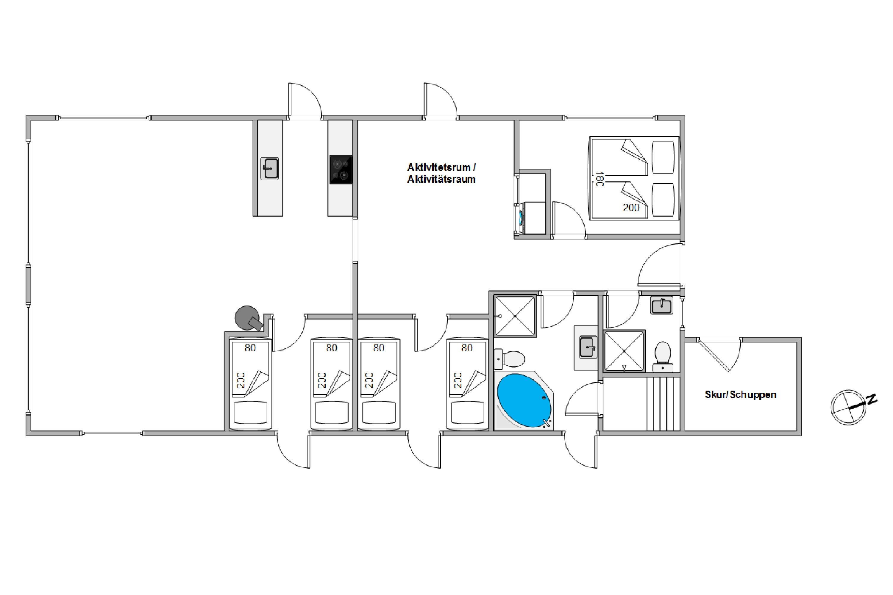 Sommerhusets hjerte er opholdsrummet, som ligger i åben forbindelse med både køkken og spiseafdeling. Her kan I tilbringe et hav af hyggelige feriestunder med fælles madlavning, lækre feriemåltider og afslapning på sofaen, mens brændeovnen knitrer i baggrunden. I forbindelse med opholdsrummet ligger desuden aktivitetsrummet, hvor de konkurrenceglade gæster rigtig kan få lov at boltre sig og konkurrere i en omgang bordfodbold.