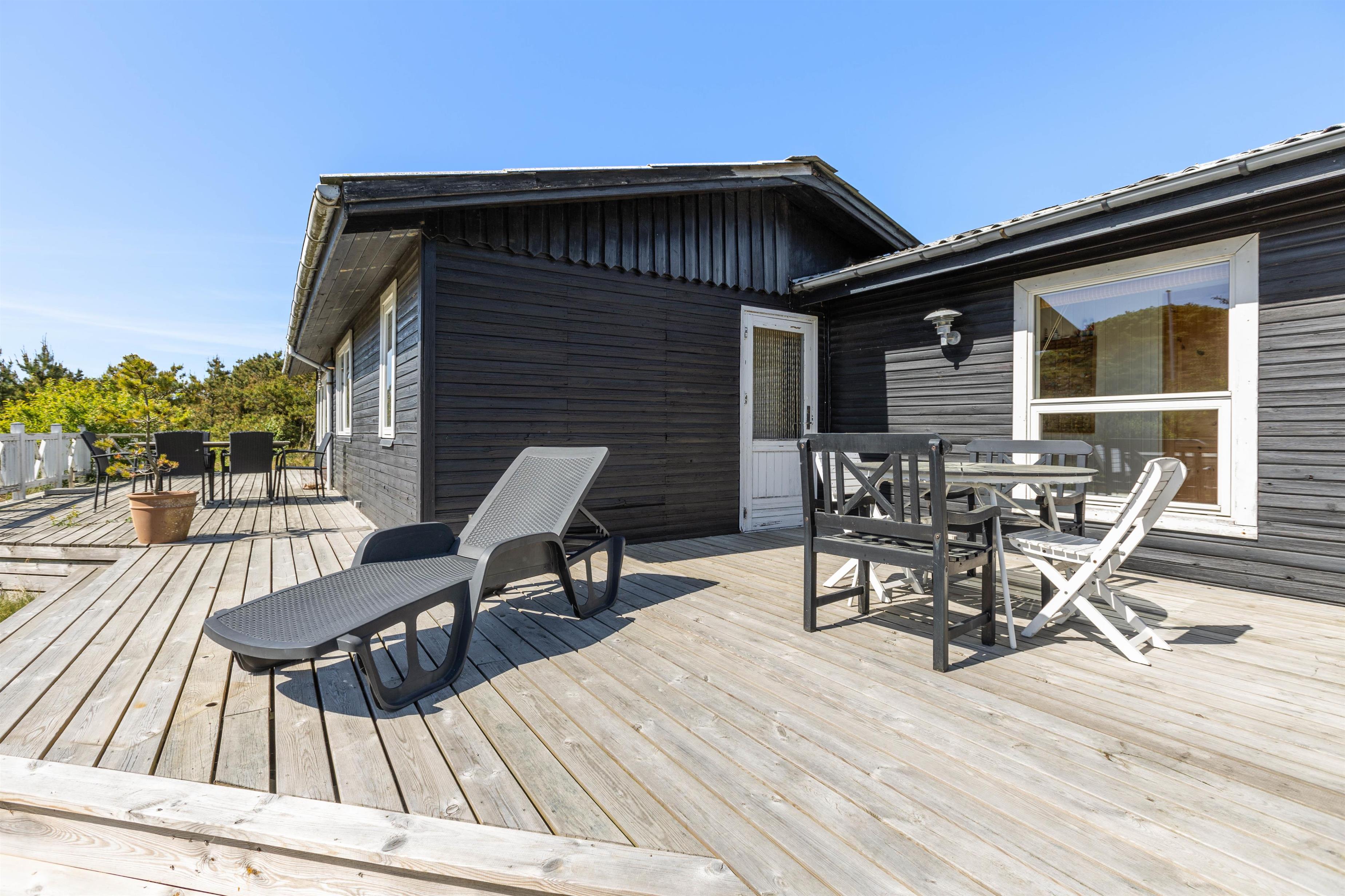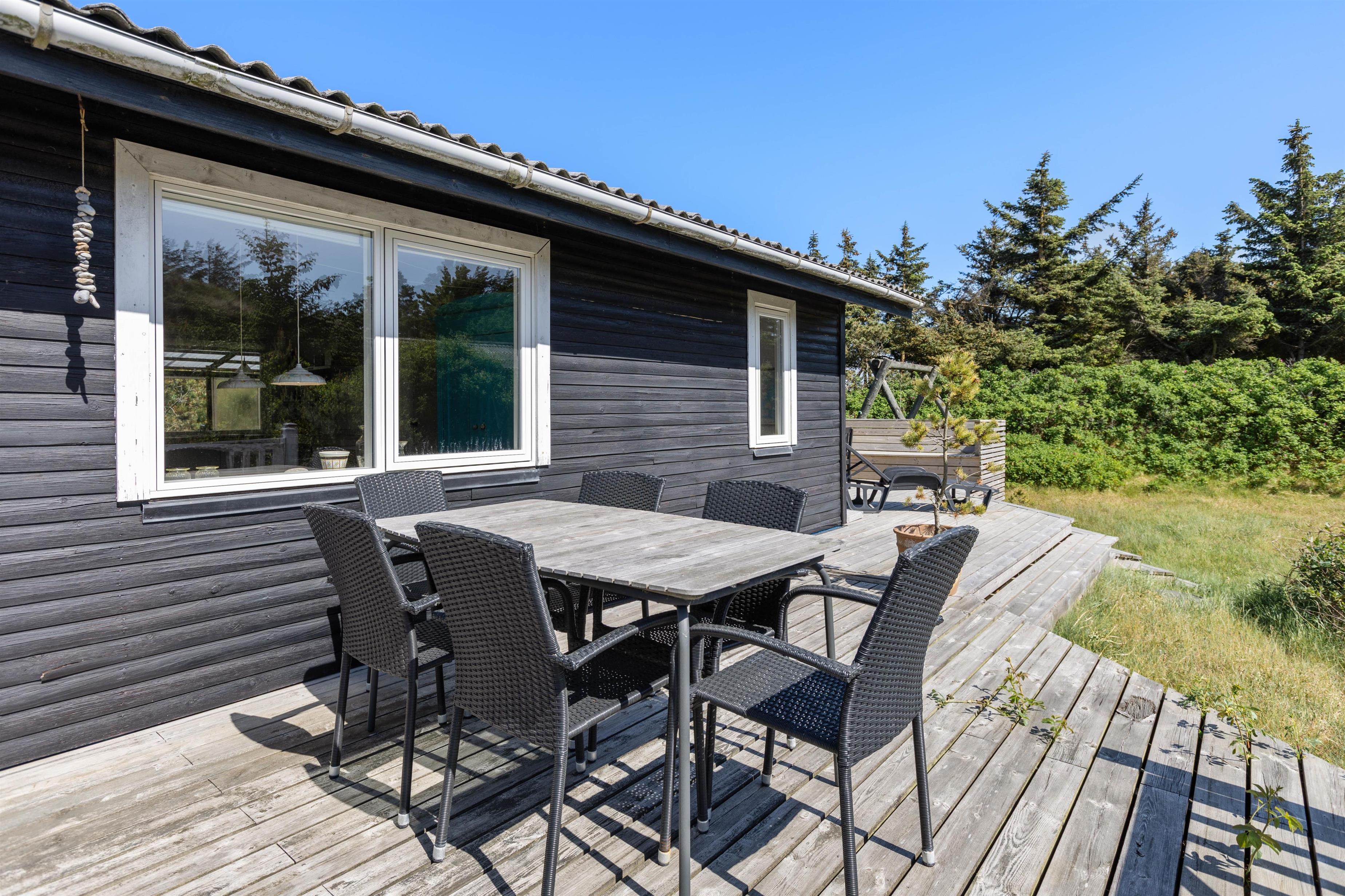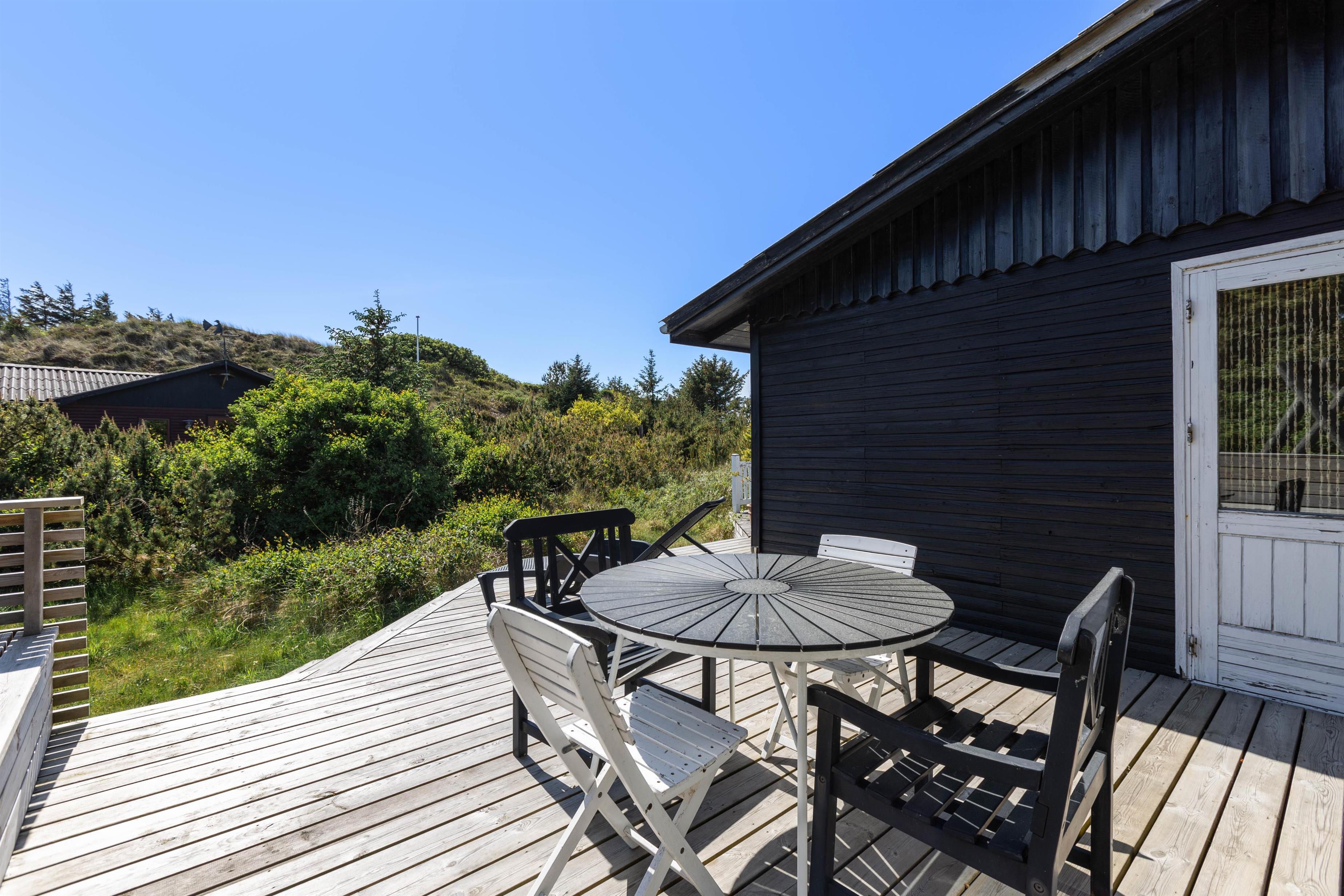 Sommerhuset ligger på en dejlig ugeneret naturgrund. Rundt om huset er der marehalm og småbuske, som omkranser huset. Om sommeren er det oplagt at nyde udelivet fra terrassen. Her kan I tænde op i grillen og nyde en god middag sammen med familien. Her naturligvis også tilhørende havemøbler, hvilket gør det nærmest umuligt ikke at sidde herude på gode sommerdage.