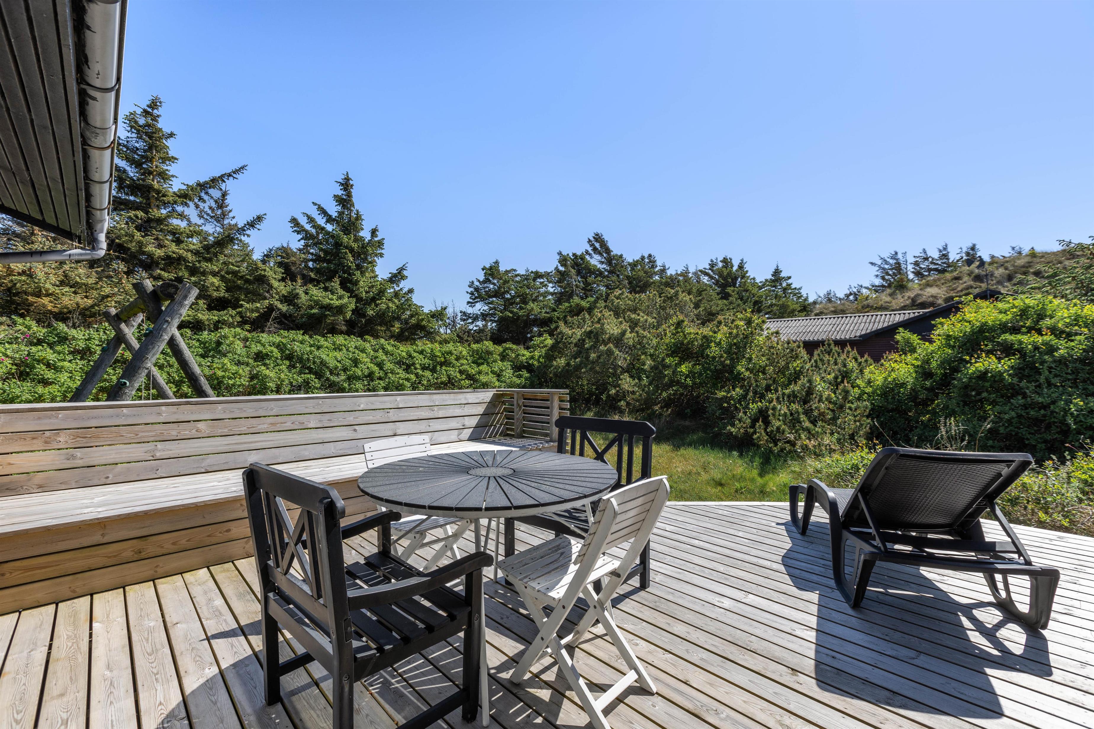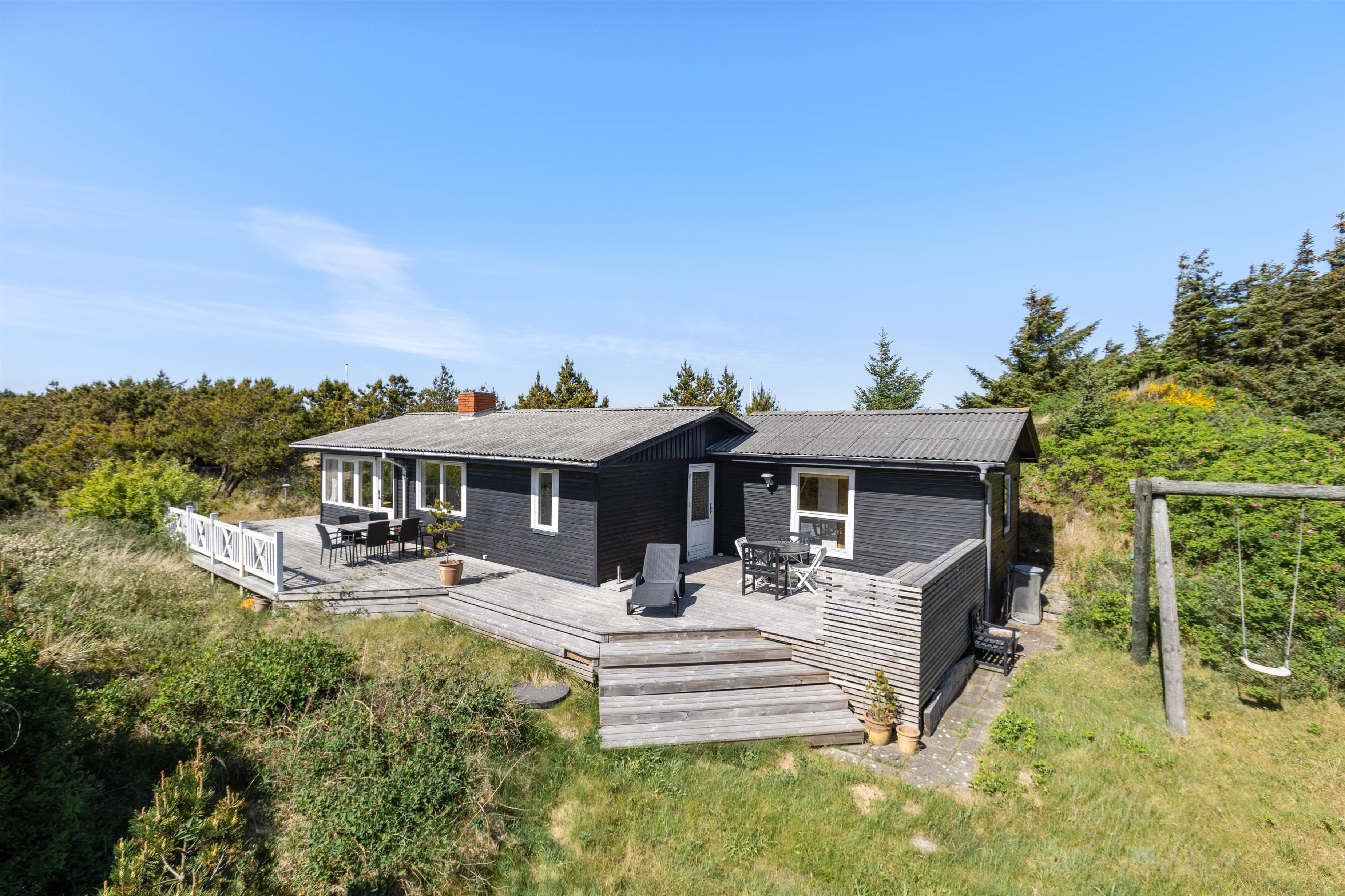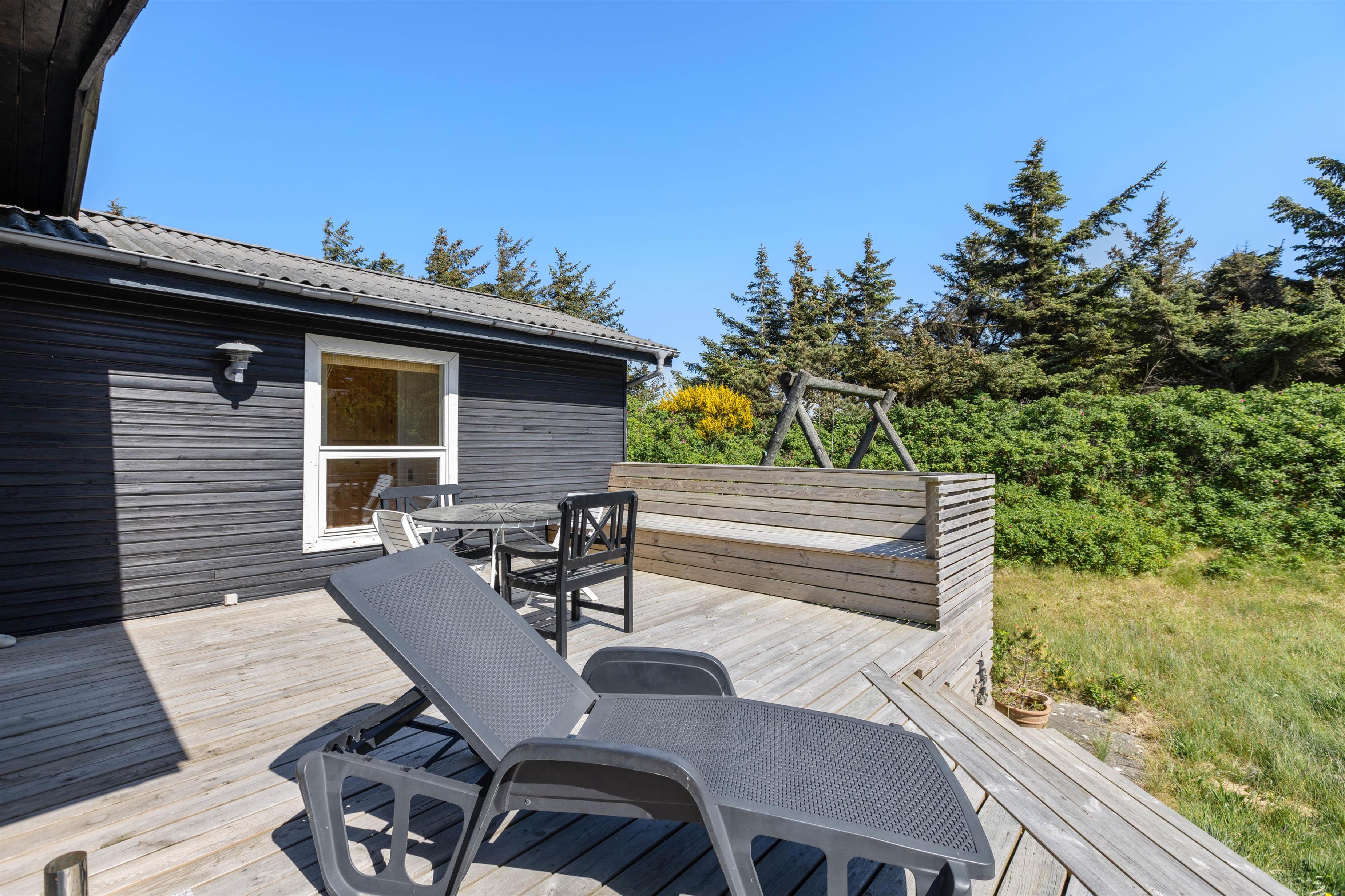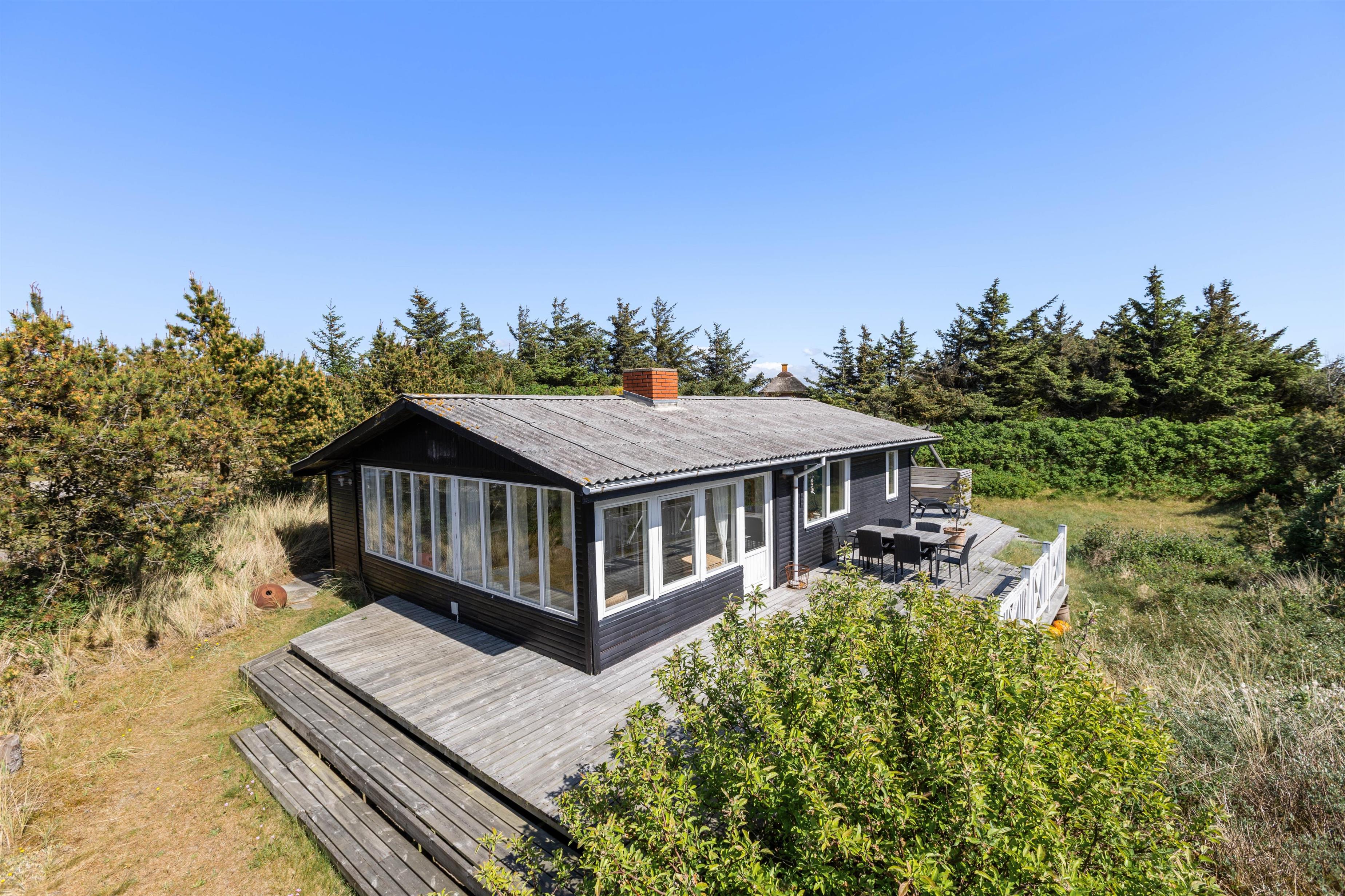 Sommerhuset ligger på en dejlig ugeneret naturgrund. Rundt om huset er der marehalm og småbuske, som omkranser huset. Om sommeren er det oplagt at nyde udelivet fra terrassen. Her kan I tænde op i grillen og nyde en god middag sammen med familien. Her naturligvis også tilhørende havemøbler, hvilket gør det nærmest umuligt ikke at sidde herude på gode sommerdage.