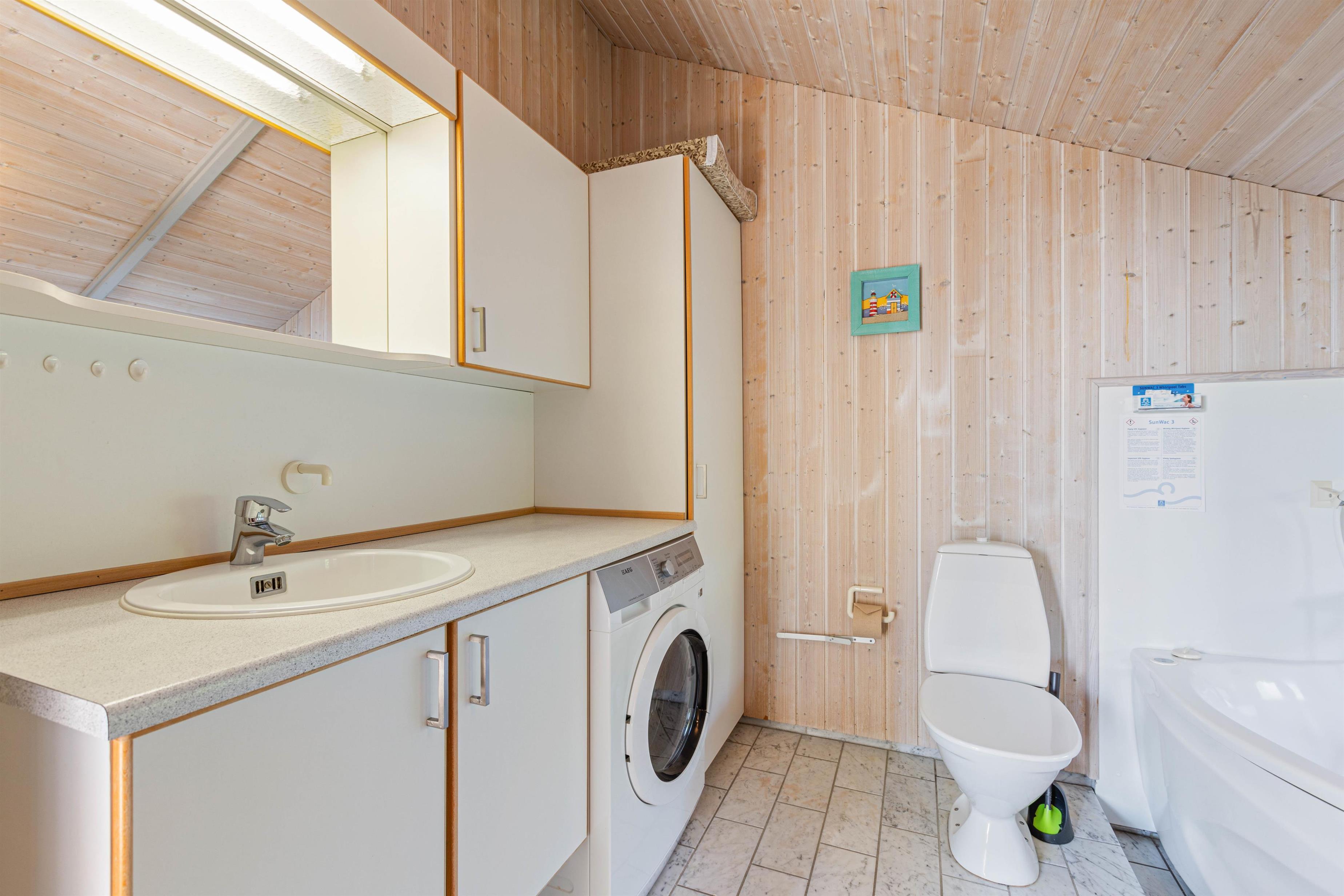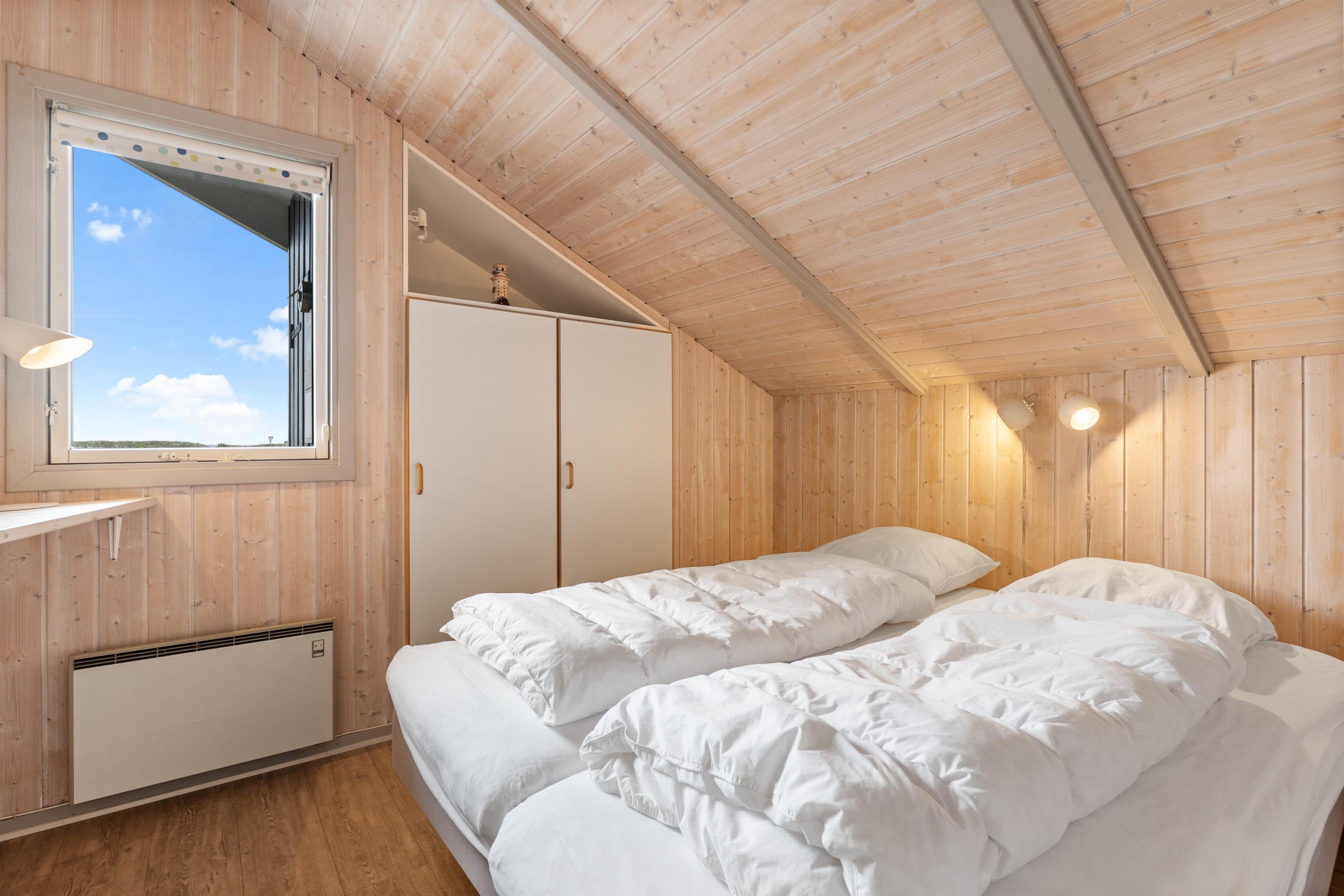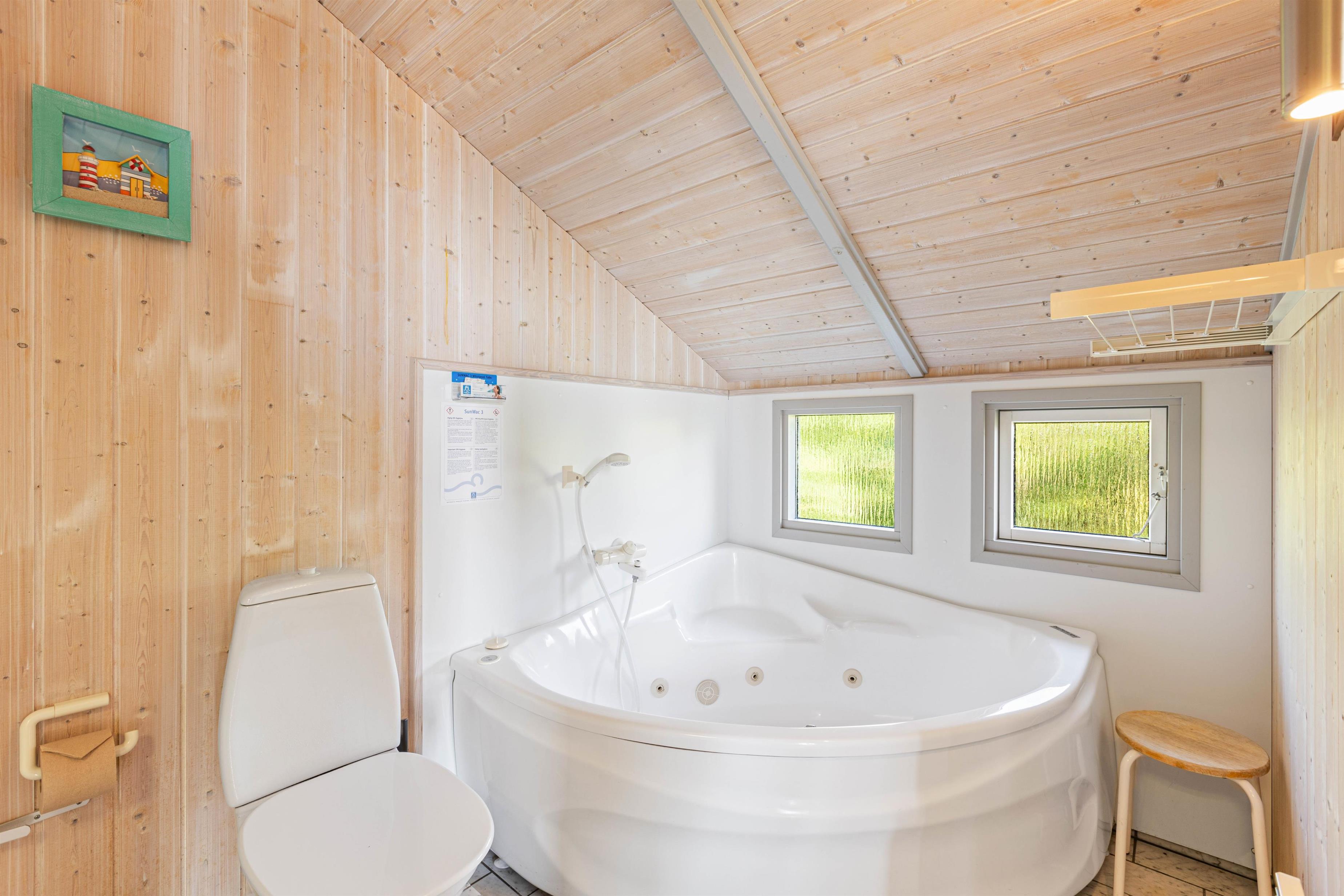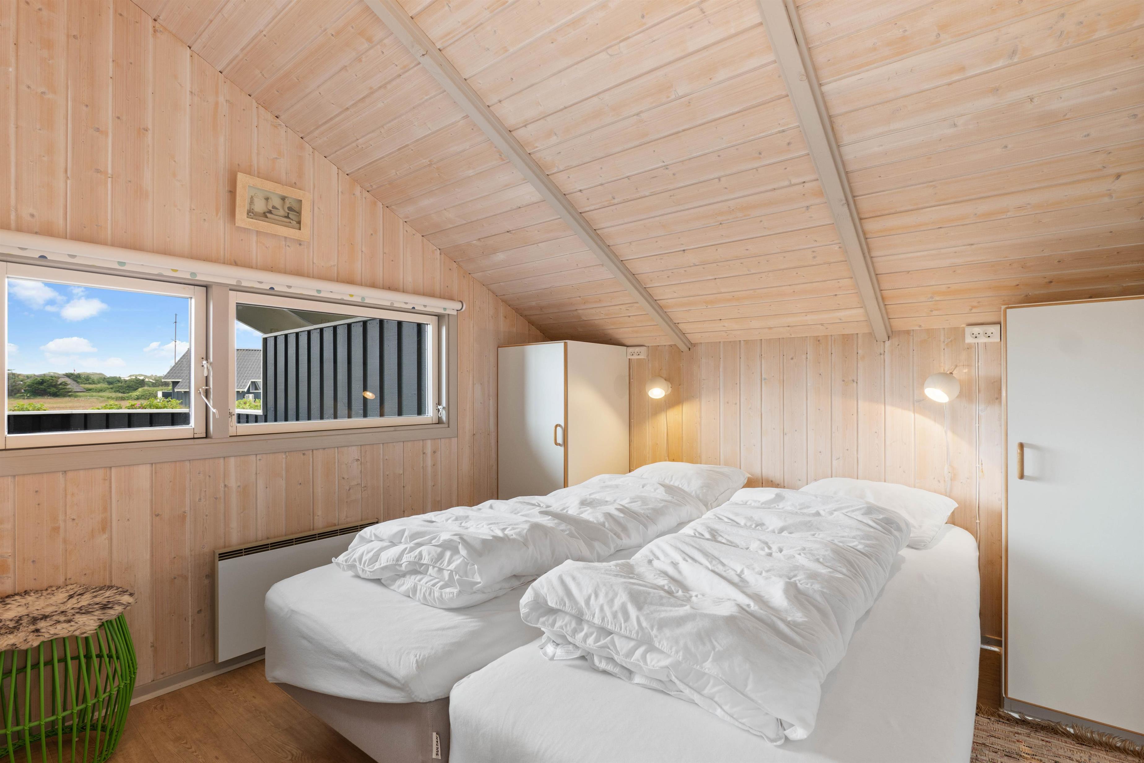 Dette sommerhus har i alt 4 soveværelser, hvor 2 af værelserne hver har en dobbeltseng og de sidste 2 værelser har hver en enkelt seng. Der er et stort badeværelse, der er gulvvarme, en hjørnespa, sauna og en bruseniche. Derudover er der et gæstetoilet. Køkkenet er udstyret med en mikroovn, en fryser på 30 L og en opvaskemaskine.