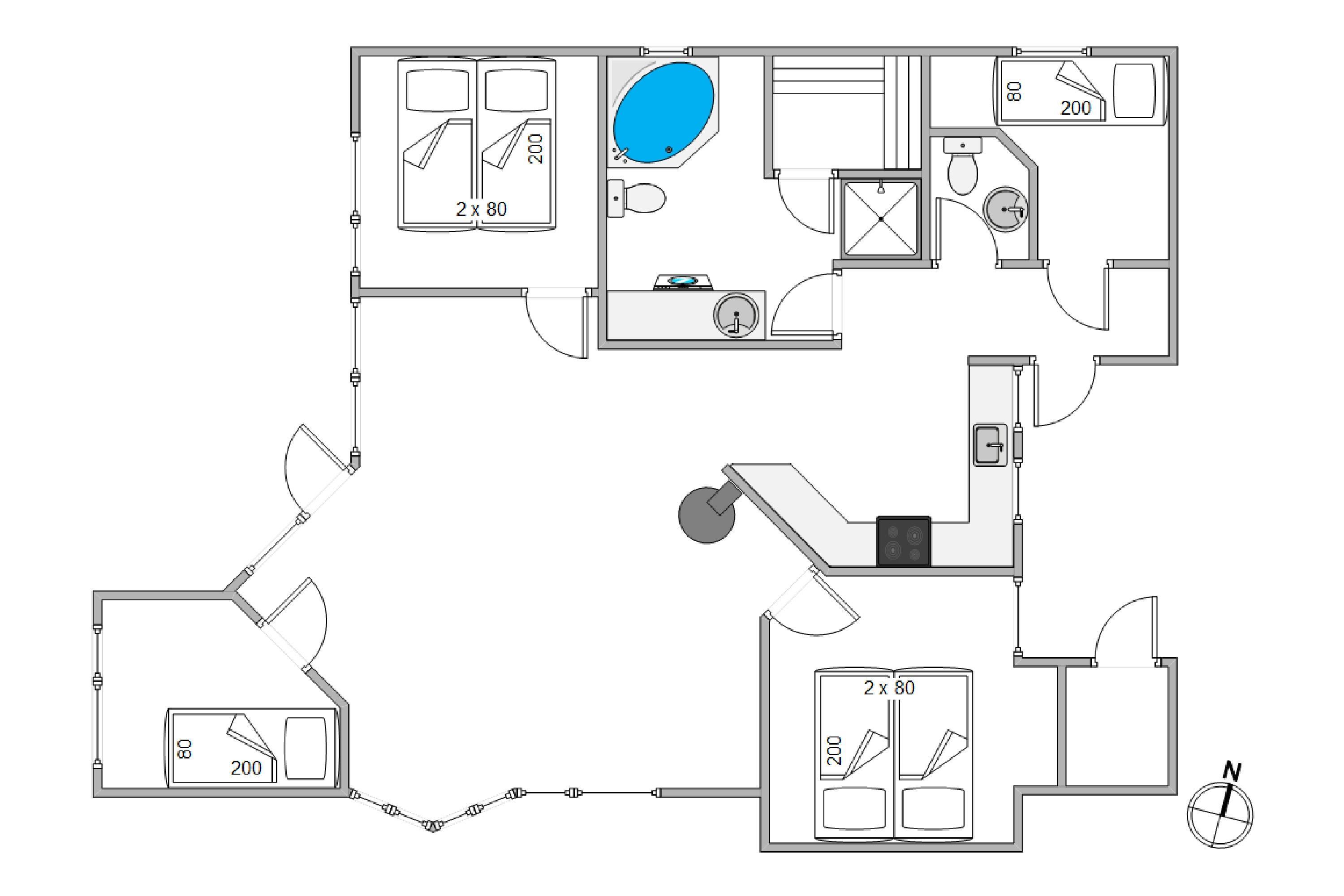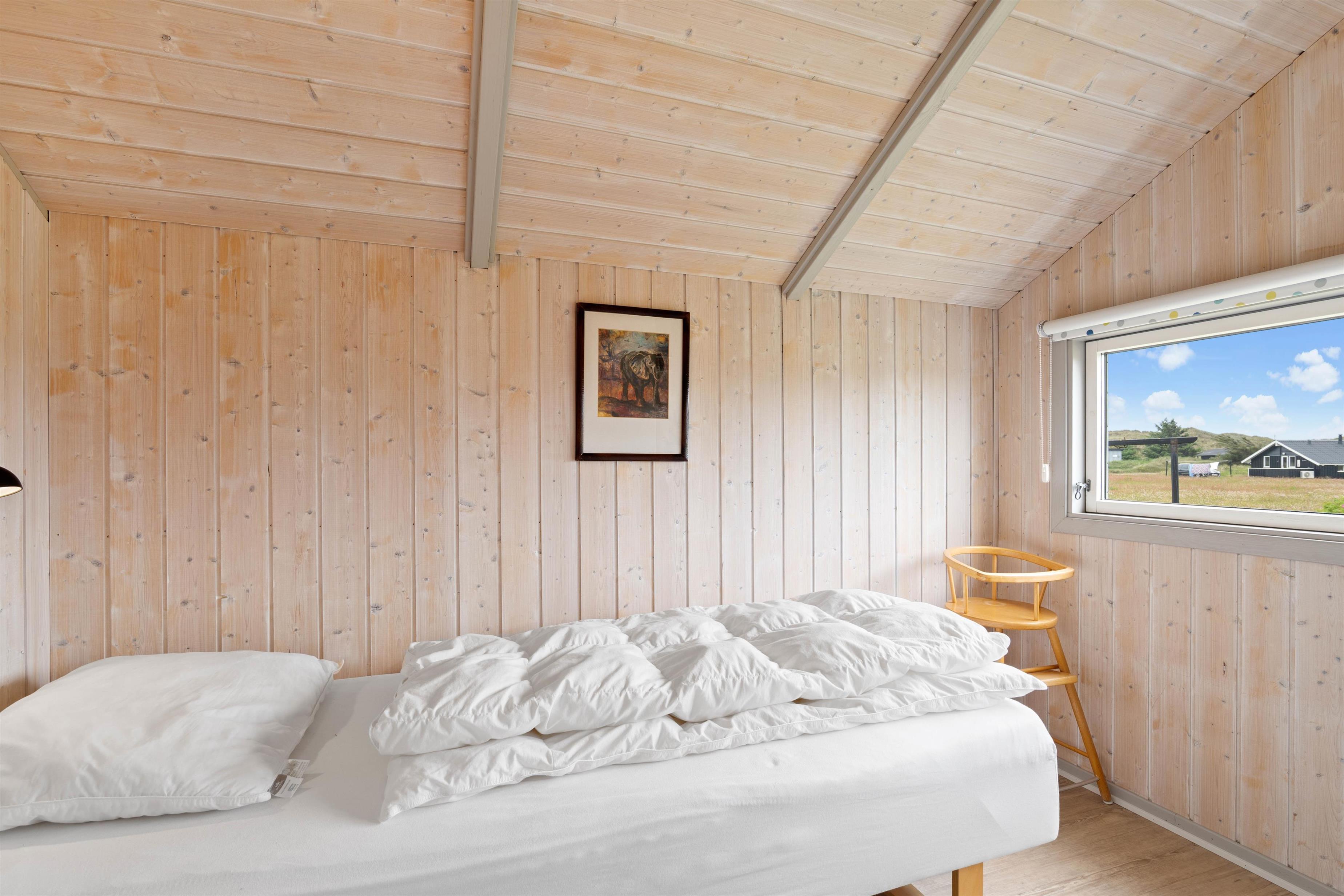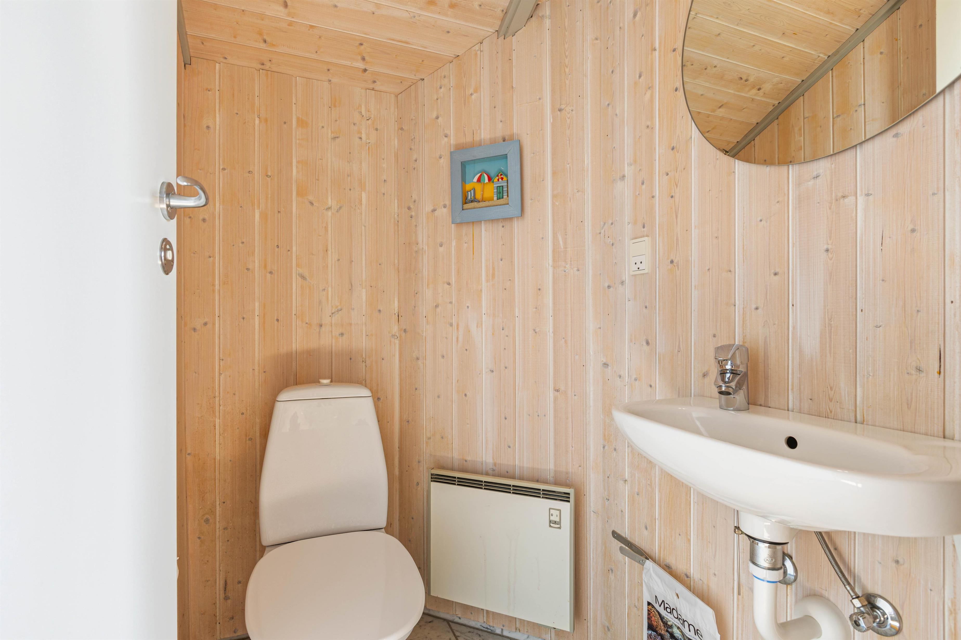 Dette sommerhus har i alt 4 soveværelser, hvor 2 af værelserne hver har en dobbeltseng og de sidste 2 værelser har hver en enkelt seng. Der er et stort badeværelse, der er gulvvarme, en hjørnespa, sauna og en bruseniche. Derudover er der et gæstetoilet. Køkkenet er udstyret med en mikroovn, en fryser på 30 L og en opvaskemaskine.
