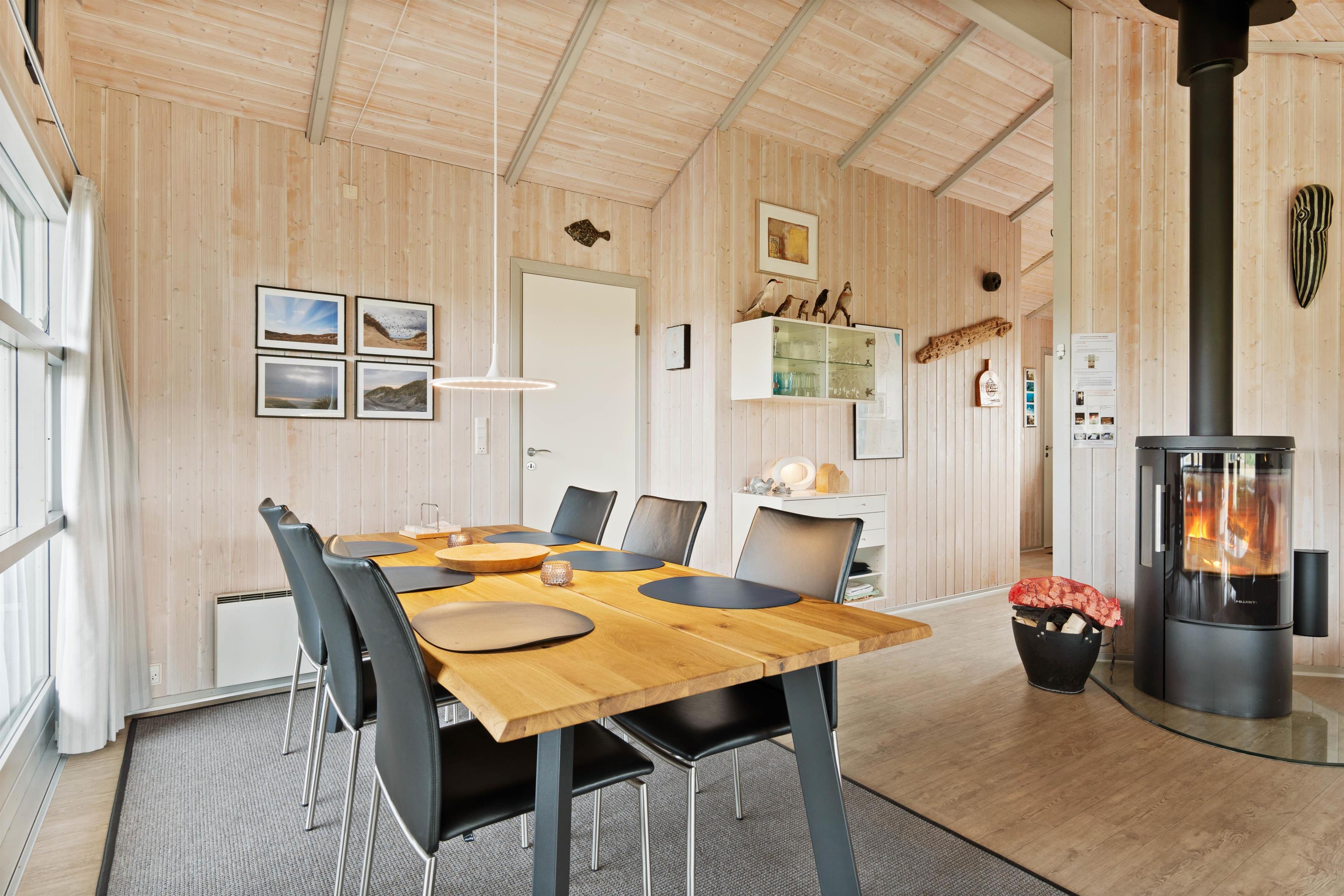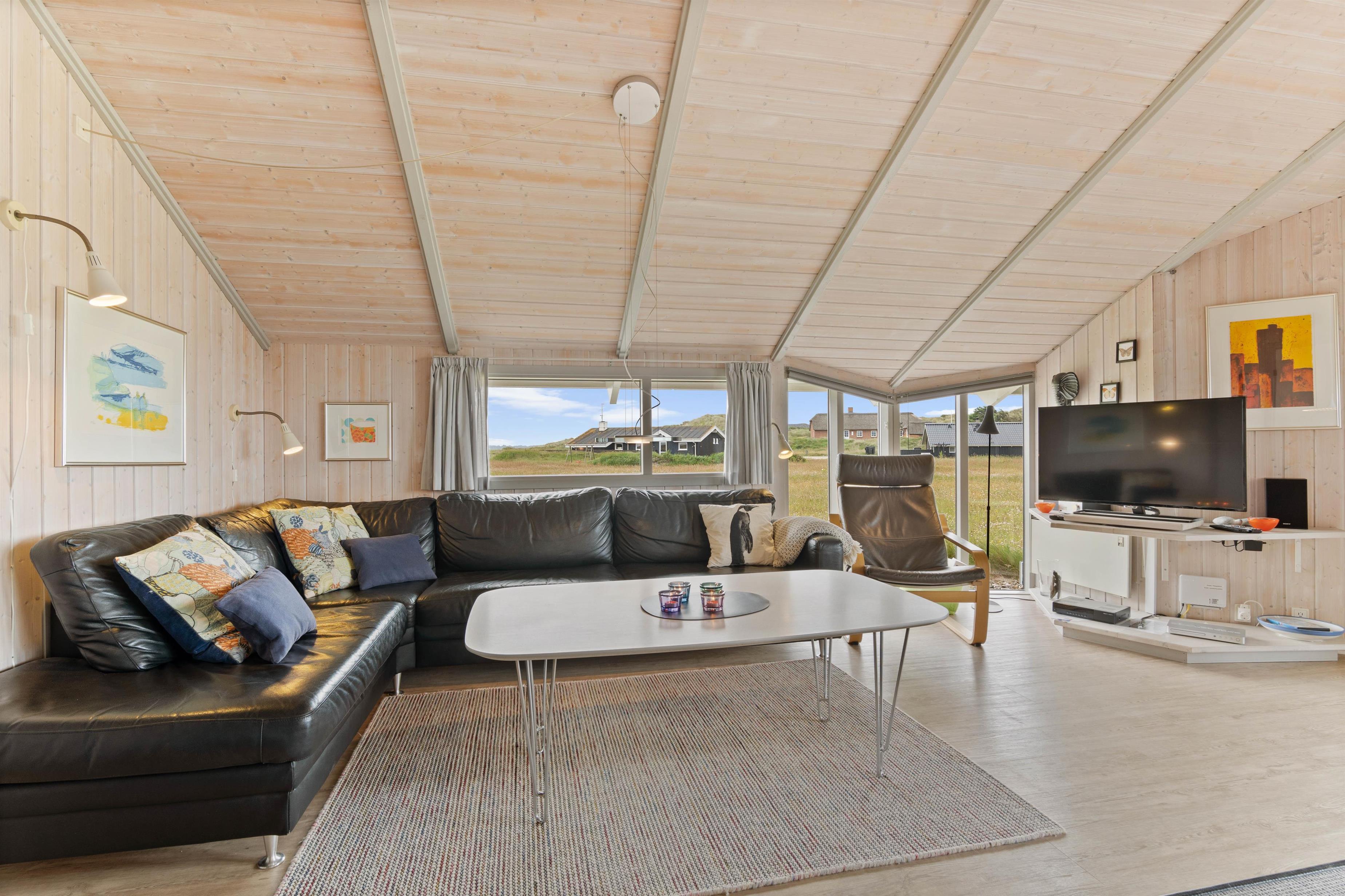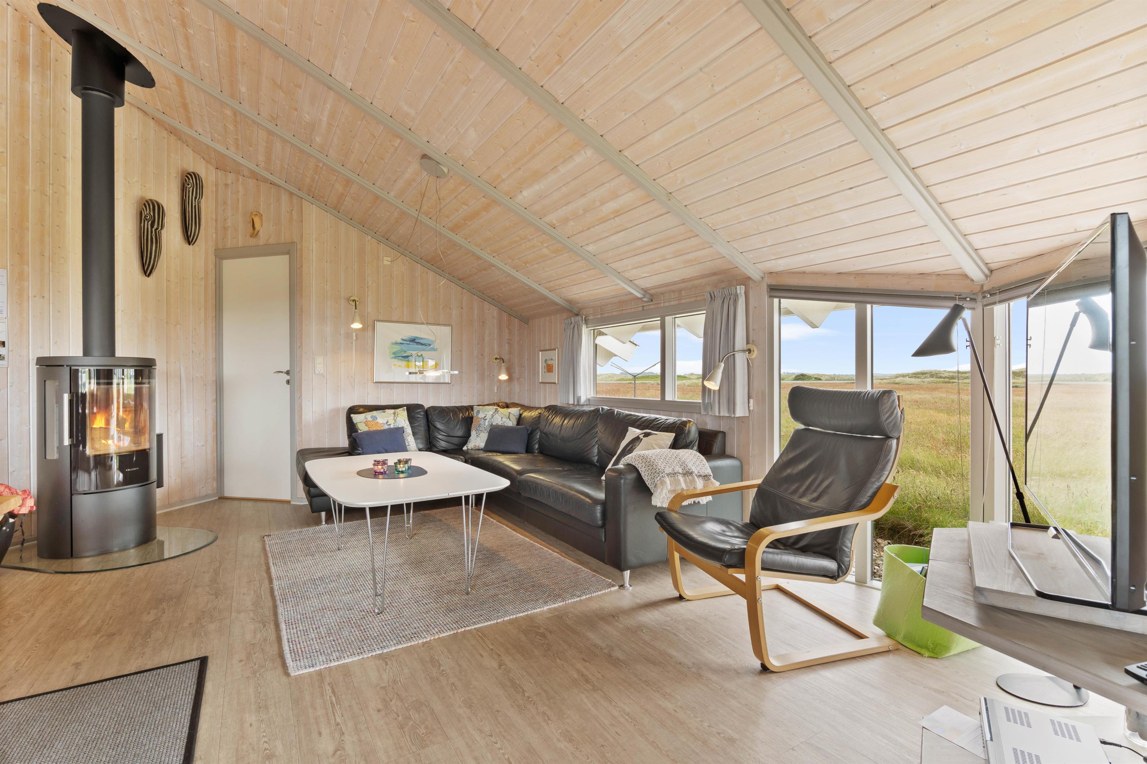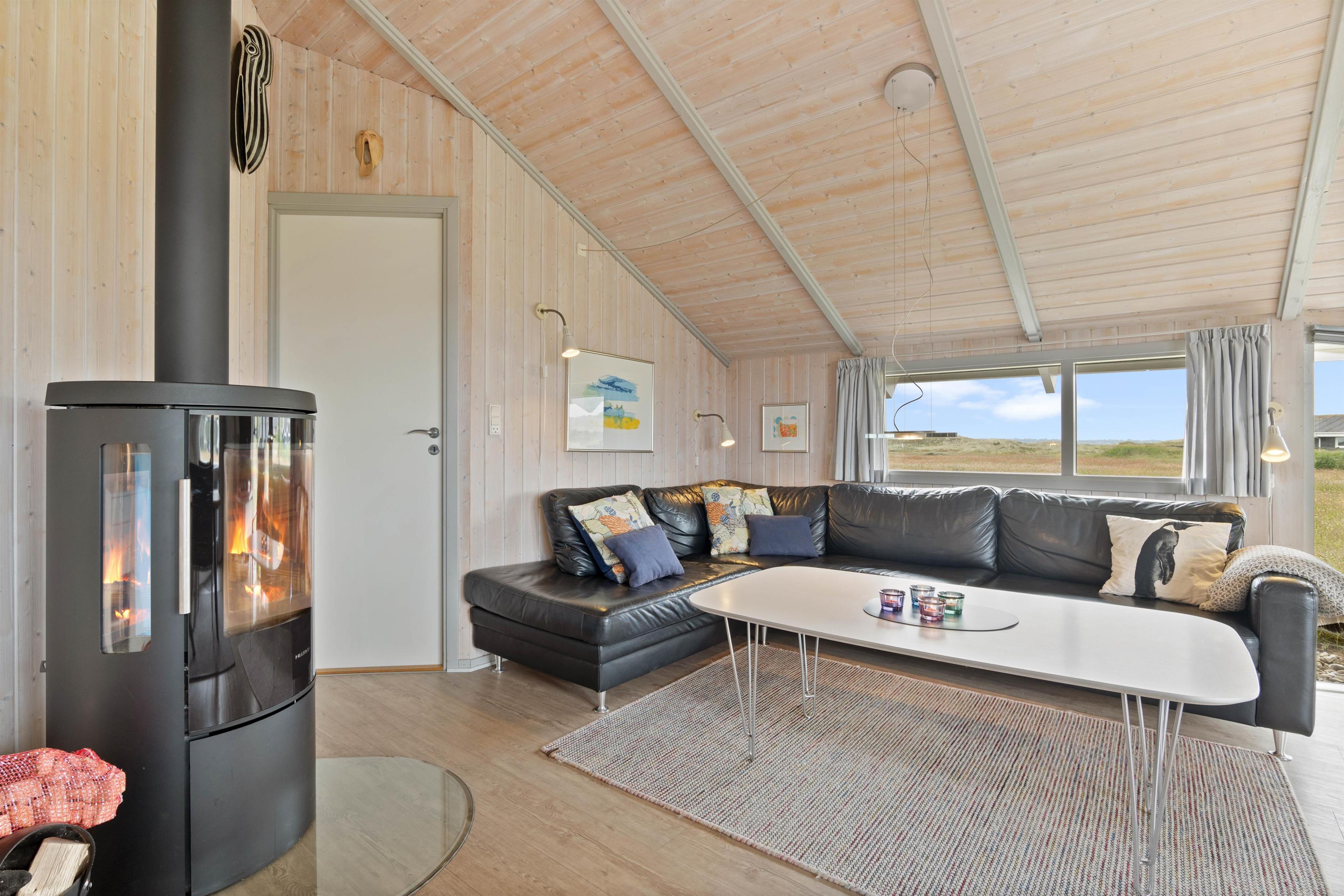 Stuen er hyggeligt møbleret og har træloft til kip samt et flot trælaminatgulv. Den hyggelige brændeovn spreder både hygge og varme, mens fladskærms-TV'et, DVD'en, radioen m/CD-afspiller og det gratis trådløse internet med god hastighed sørger for underholdningen. I sommerhuset er der desuden en kombineret vaskemaskine og tørretumbler.