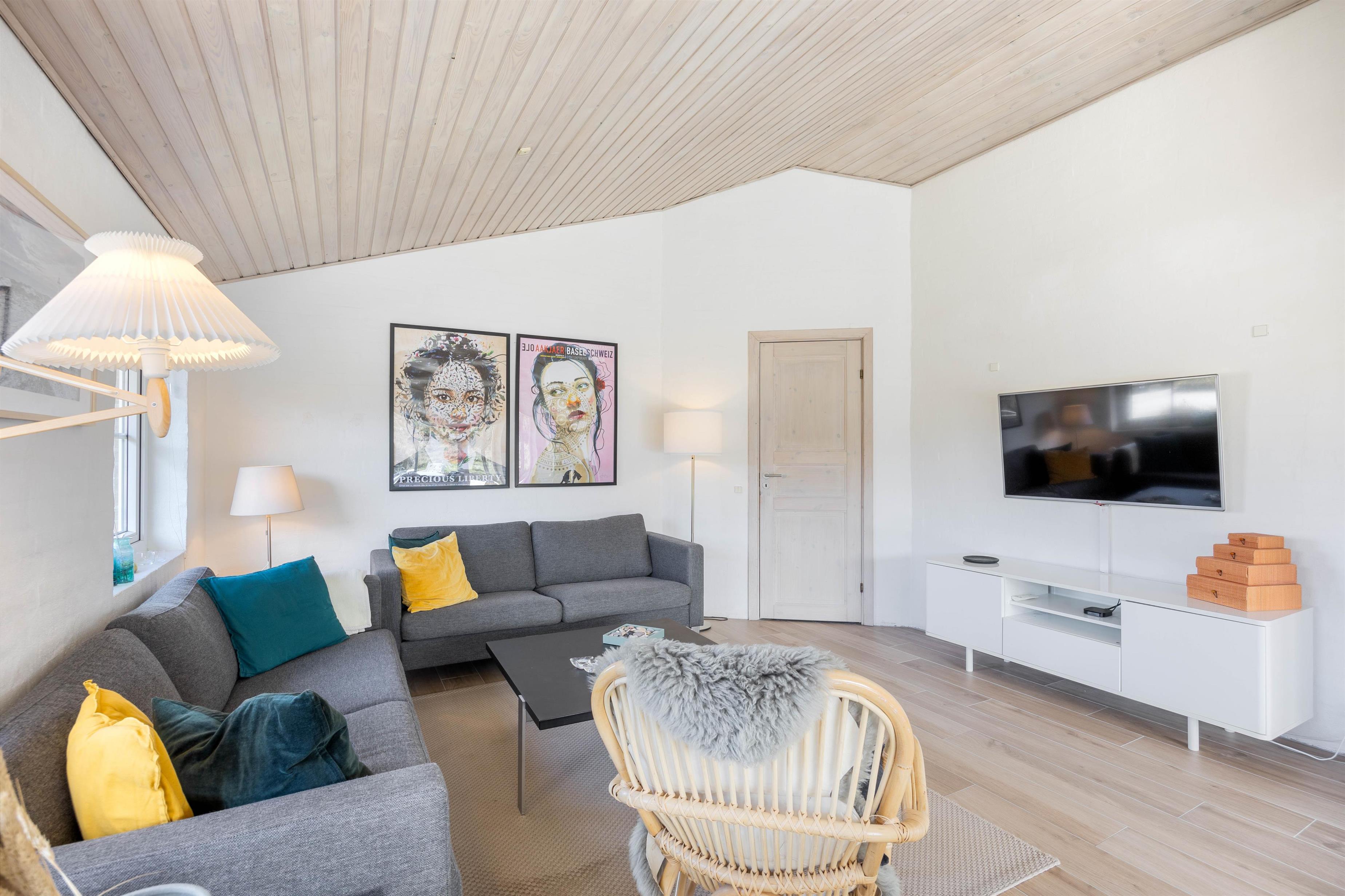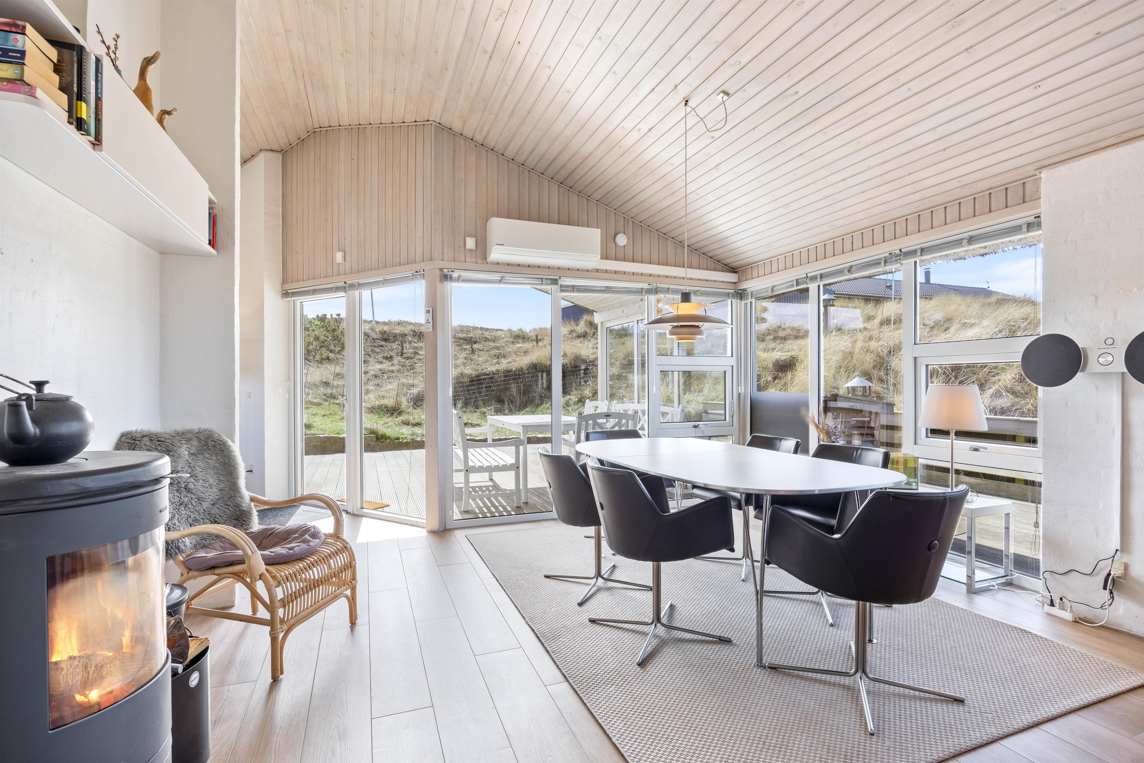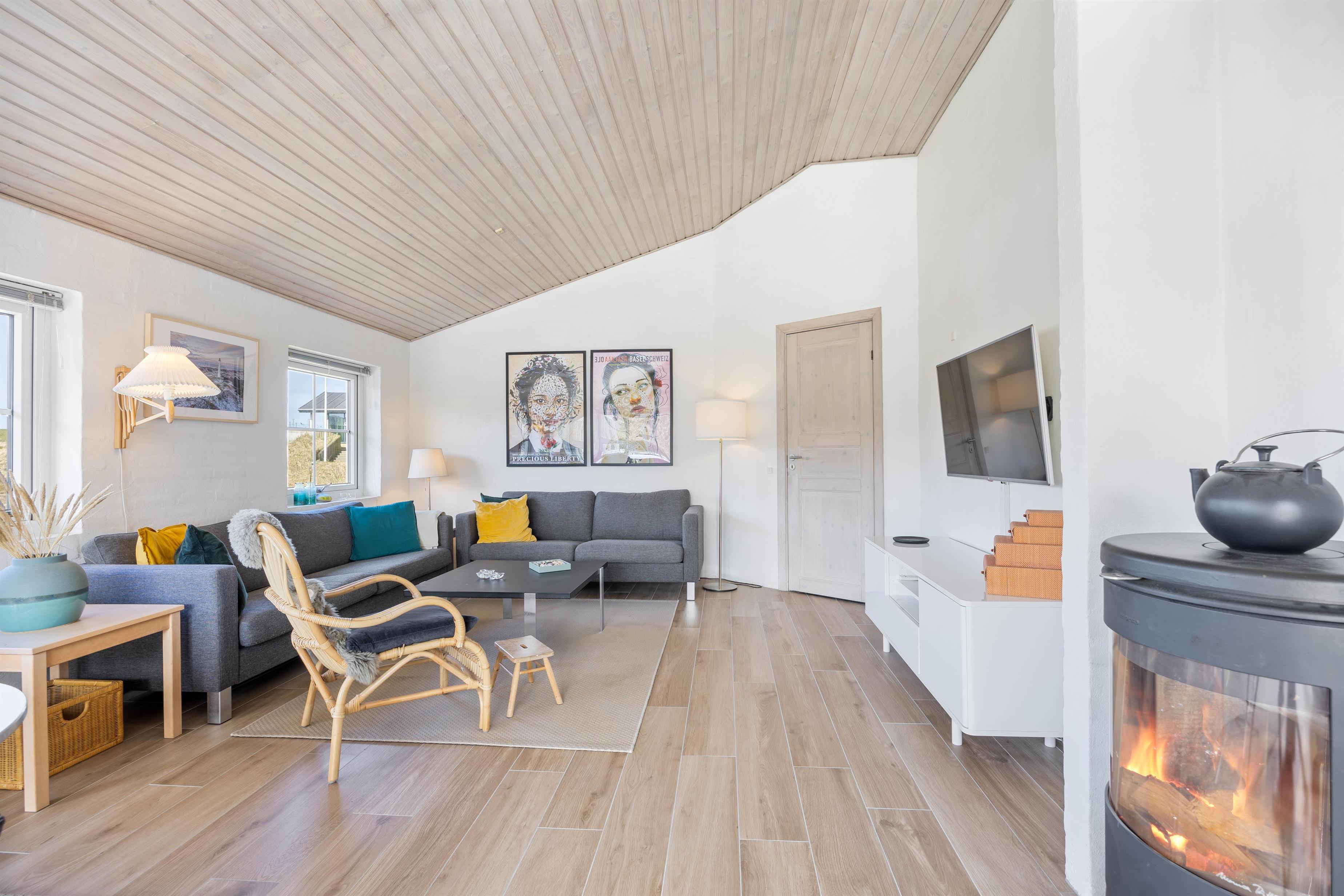 Fra den store lyse stue har I en betagende udsigt over klitlandskabet. I stuen er der både varmepumpe samt en dejlig brændeovn, der sikrer en behagelig varme når I hygger med familiespil, en god bog eller sammen ser en film på det store fladskærmsfjernsyn. Klitdalen 95 har parabol og naturligvis trådløst internet.