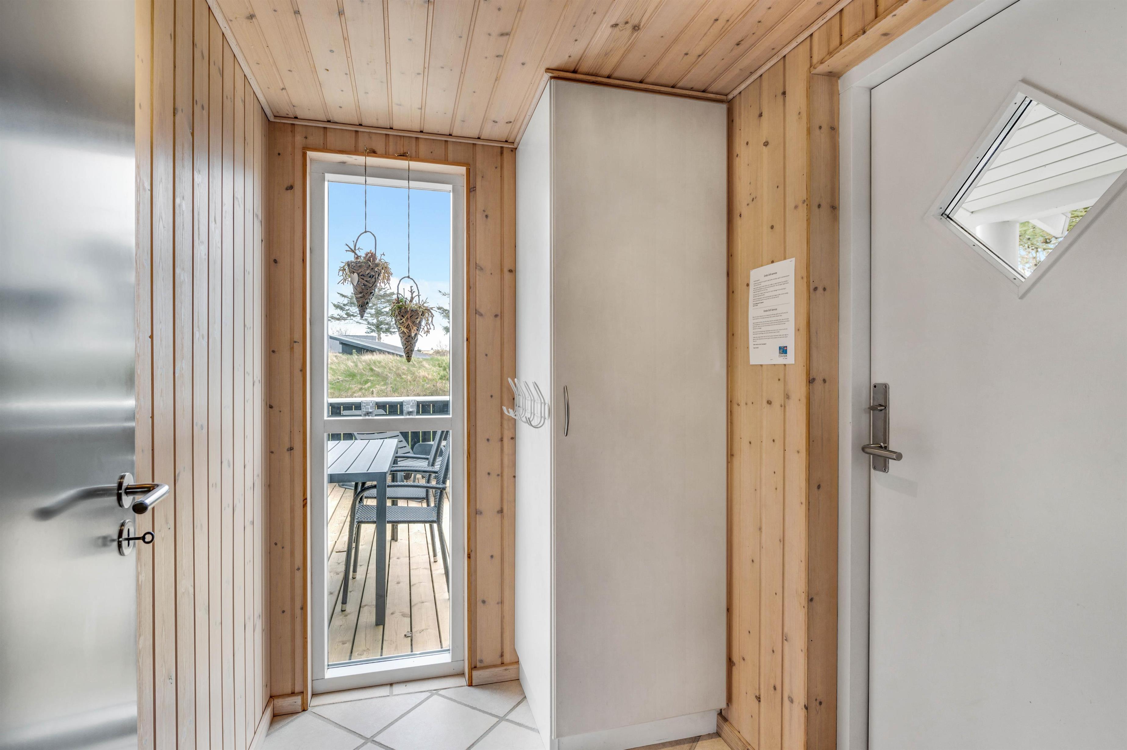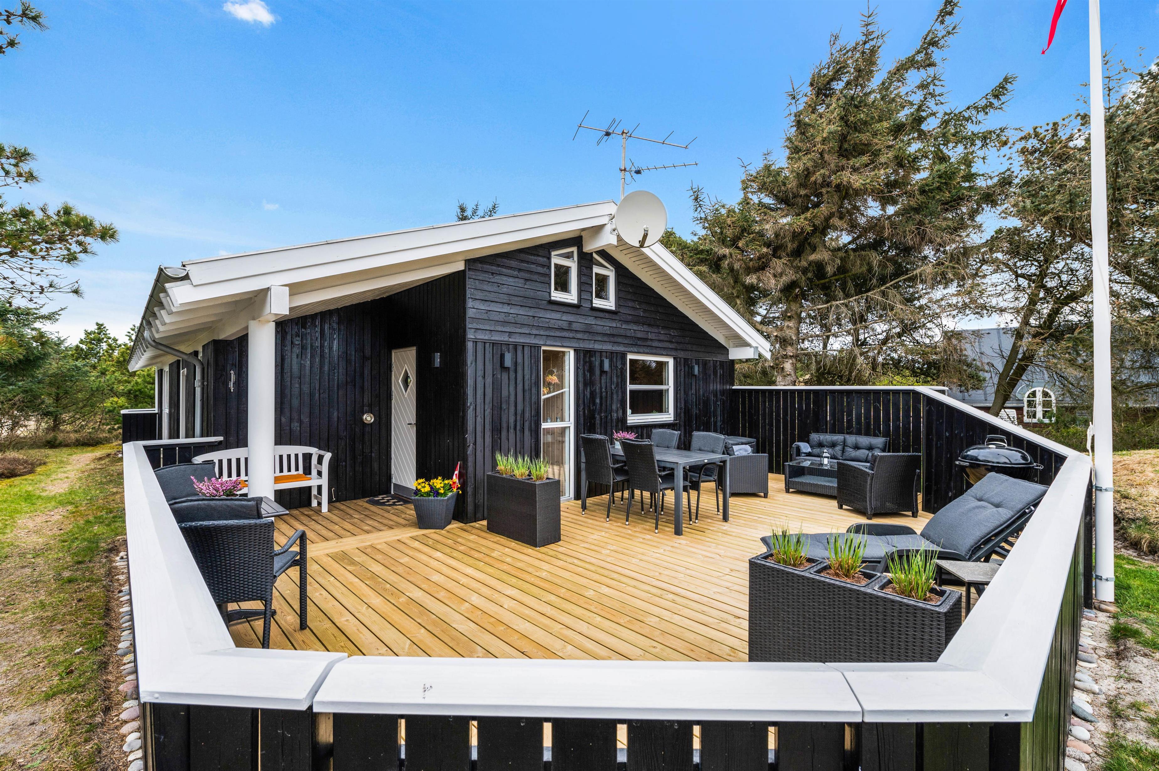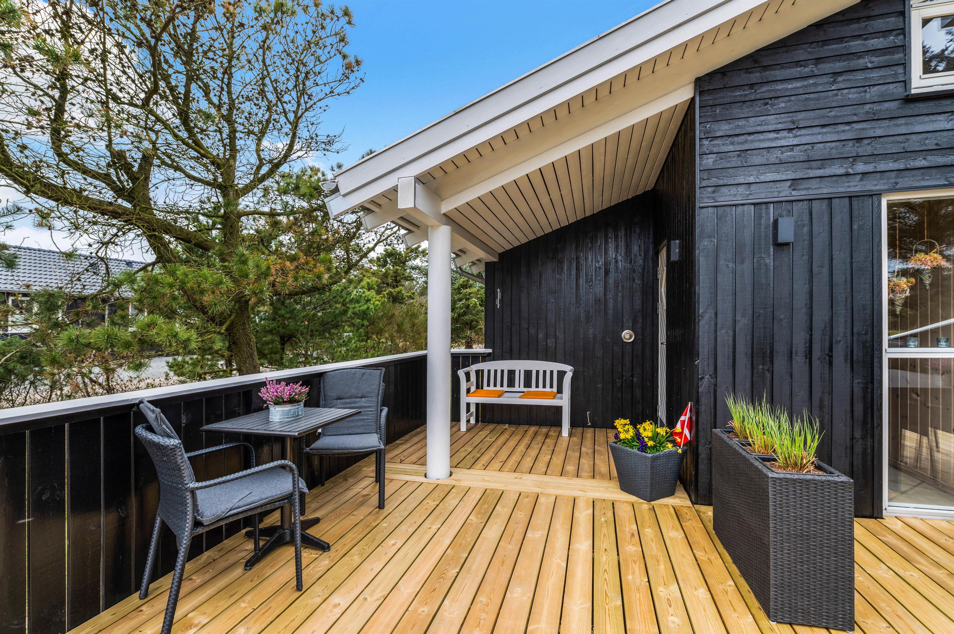 Huset har to dejlige lukkede terrasser, så der er rig mulighed for at tilbringe hele dagen i solen og den friske luft. Den ene terrasse er placeret i den østlige ende af huset, så her kan man nyde både morgenmaden og frokosten i det fri. Den anden terrasse ligger vest for huset og er delvist overdækket. Denne er helt ideel til hyggelige grillaftener med Vesterhavets brusen i baggrunden.