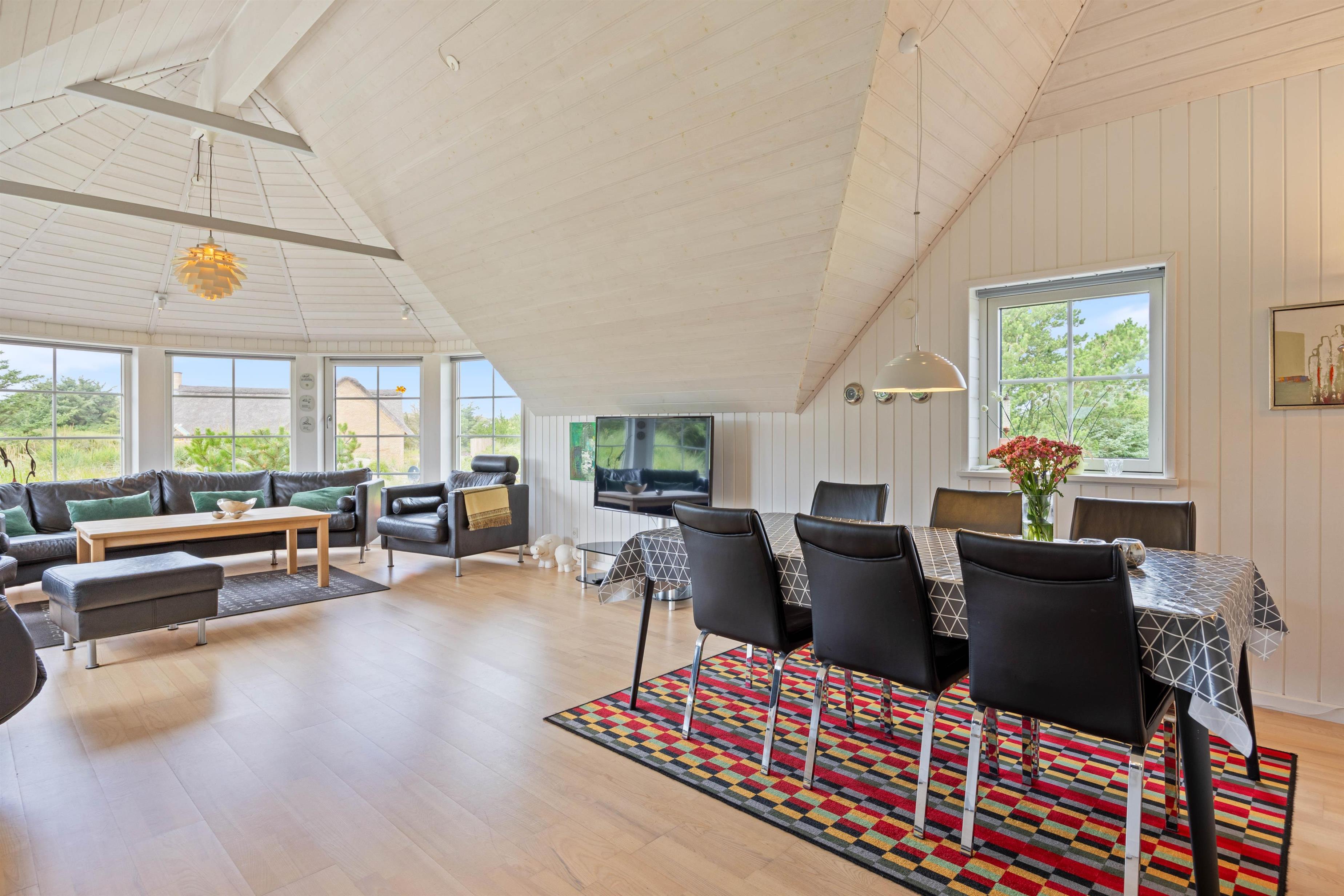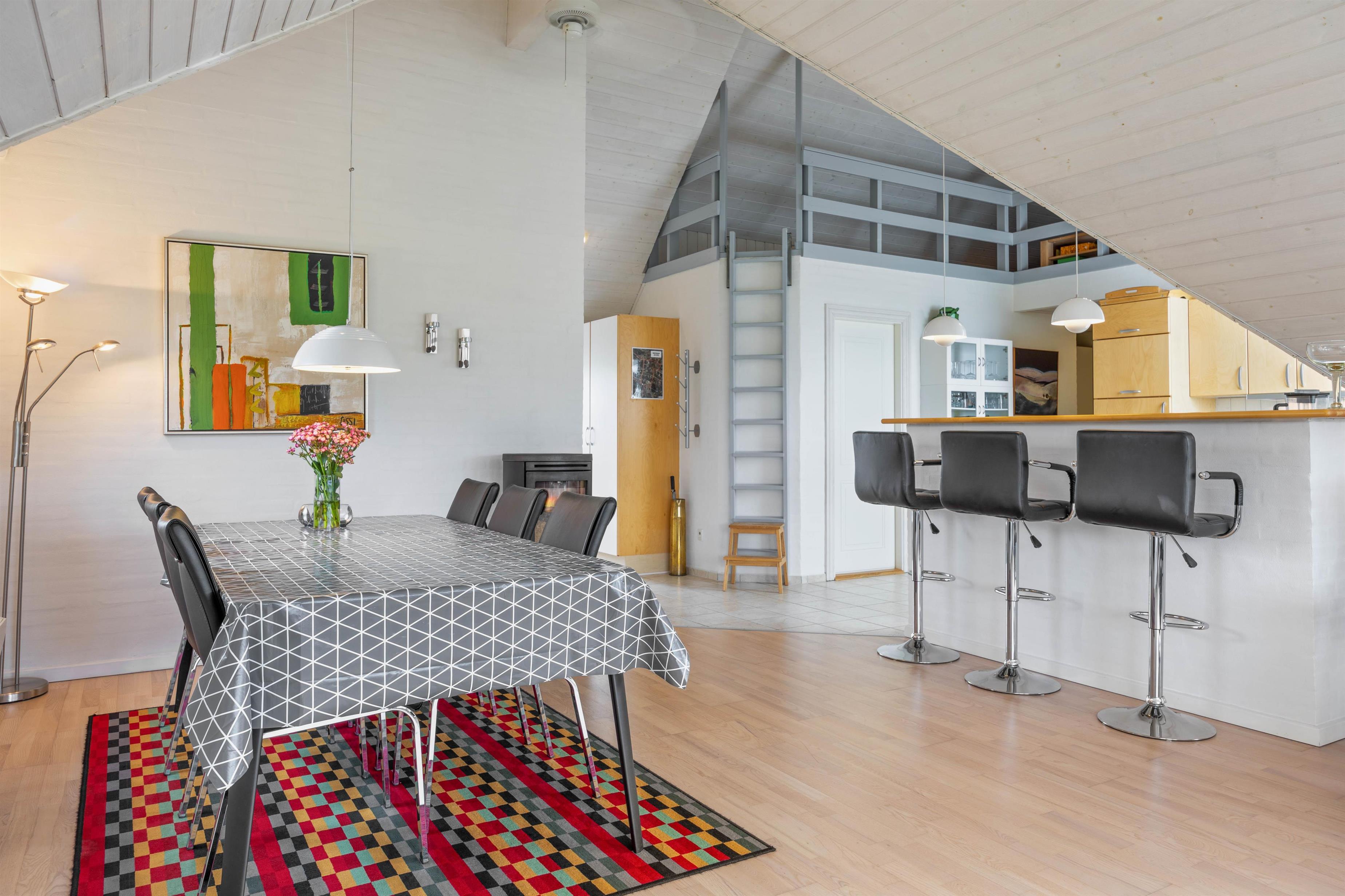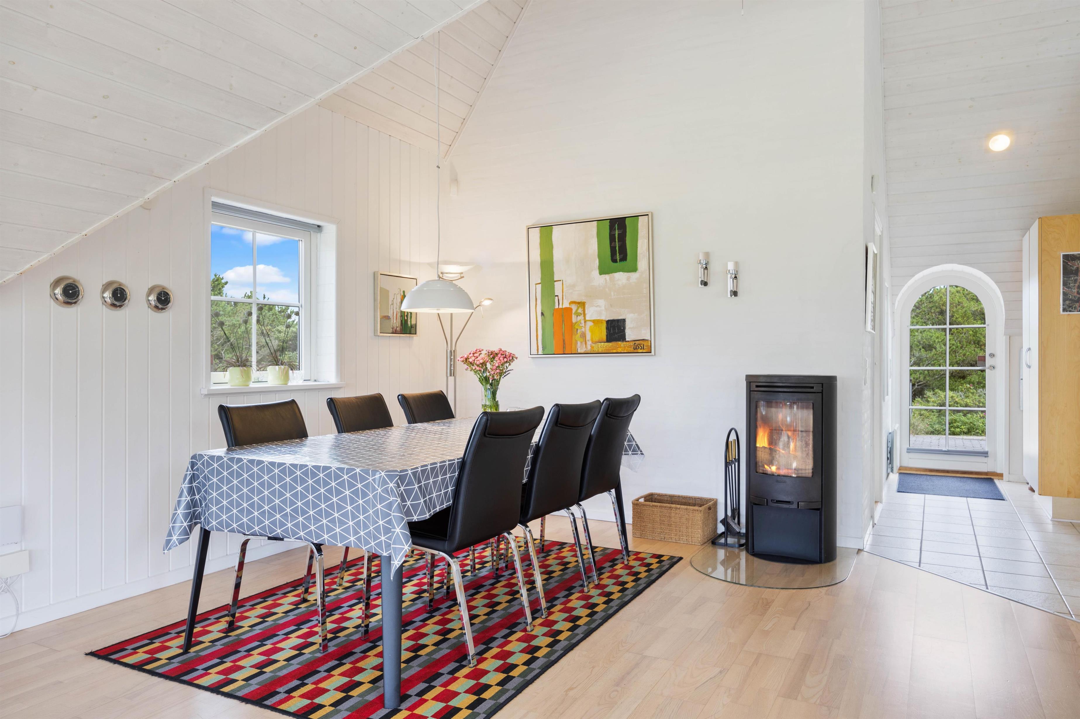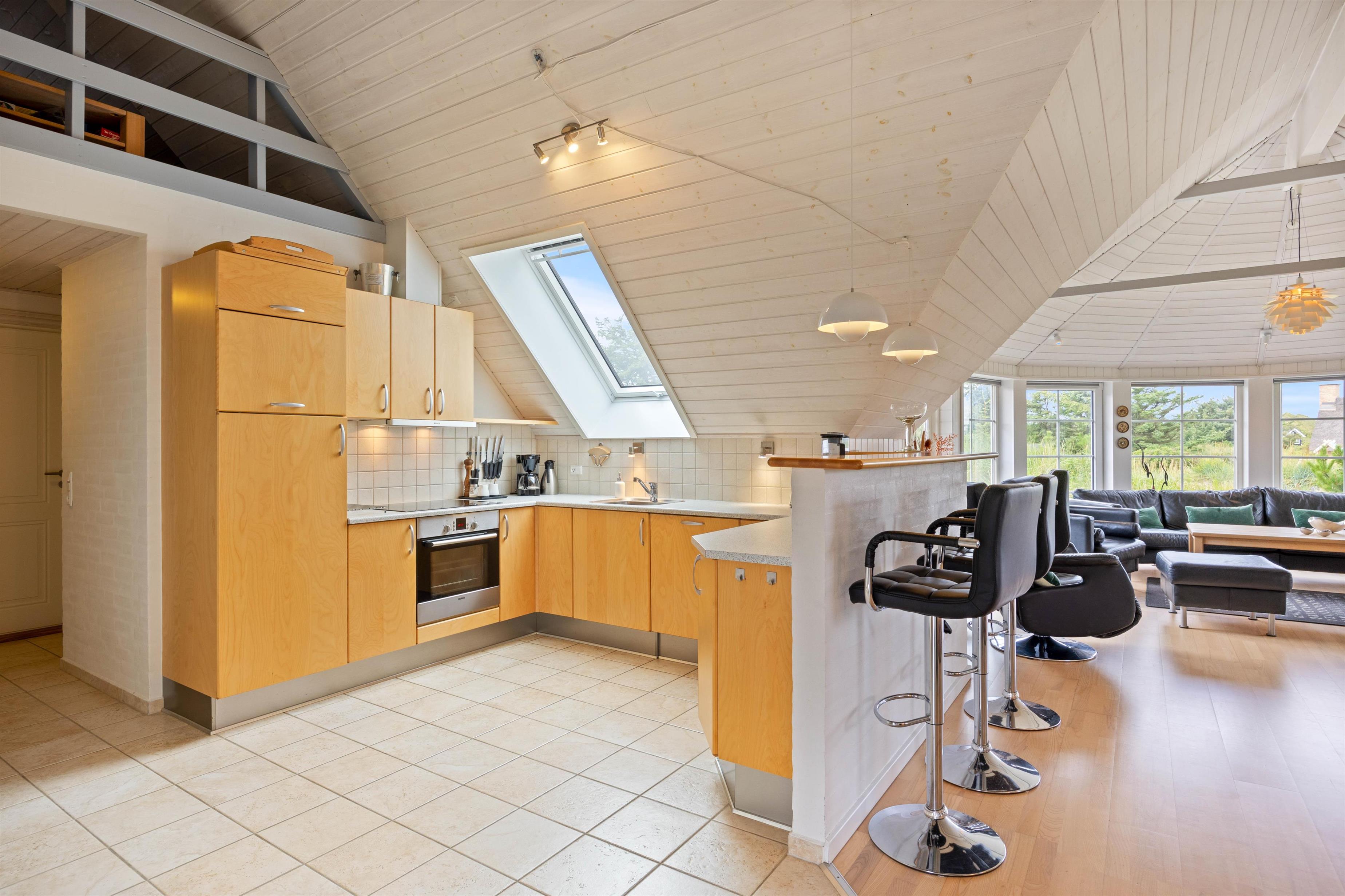 I sommerhusets midte, som også er sommerhusets hjerte, ligger det store køkken-alum med flot loft til kip, hvilket giver en god rumfornemmelse. Det er her familien mødes. Her er der masser af plads til, at børnene kan løbe frem og tilbage – mellem værelser og uderum. Gulvene er en flot kombination af lyse trælaminatgulve og praktiske klinker i køkkenområdet. De lyse farver i indretningen får inde- og uderummene til at flyde sammen, når dørene åbnes mod terrassen. Stuen ligger badet i et flot lys fra de mange vinduesfag, som inviterer naturen indenfor i indretningen.