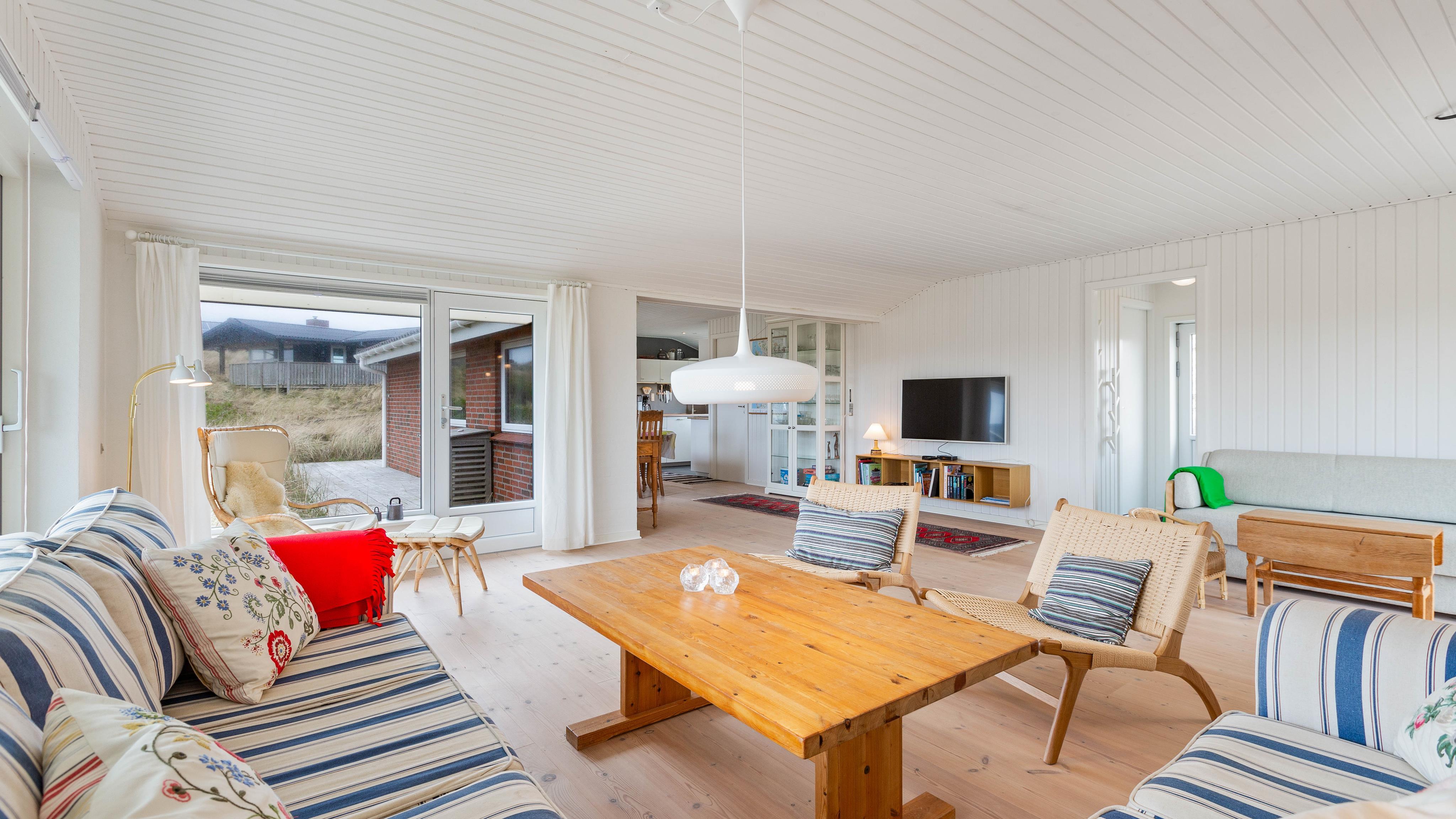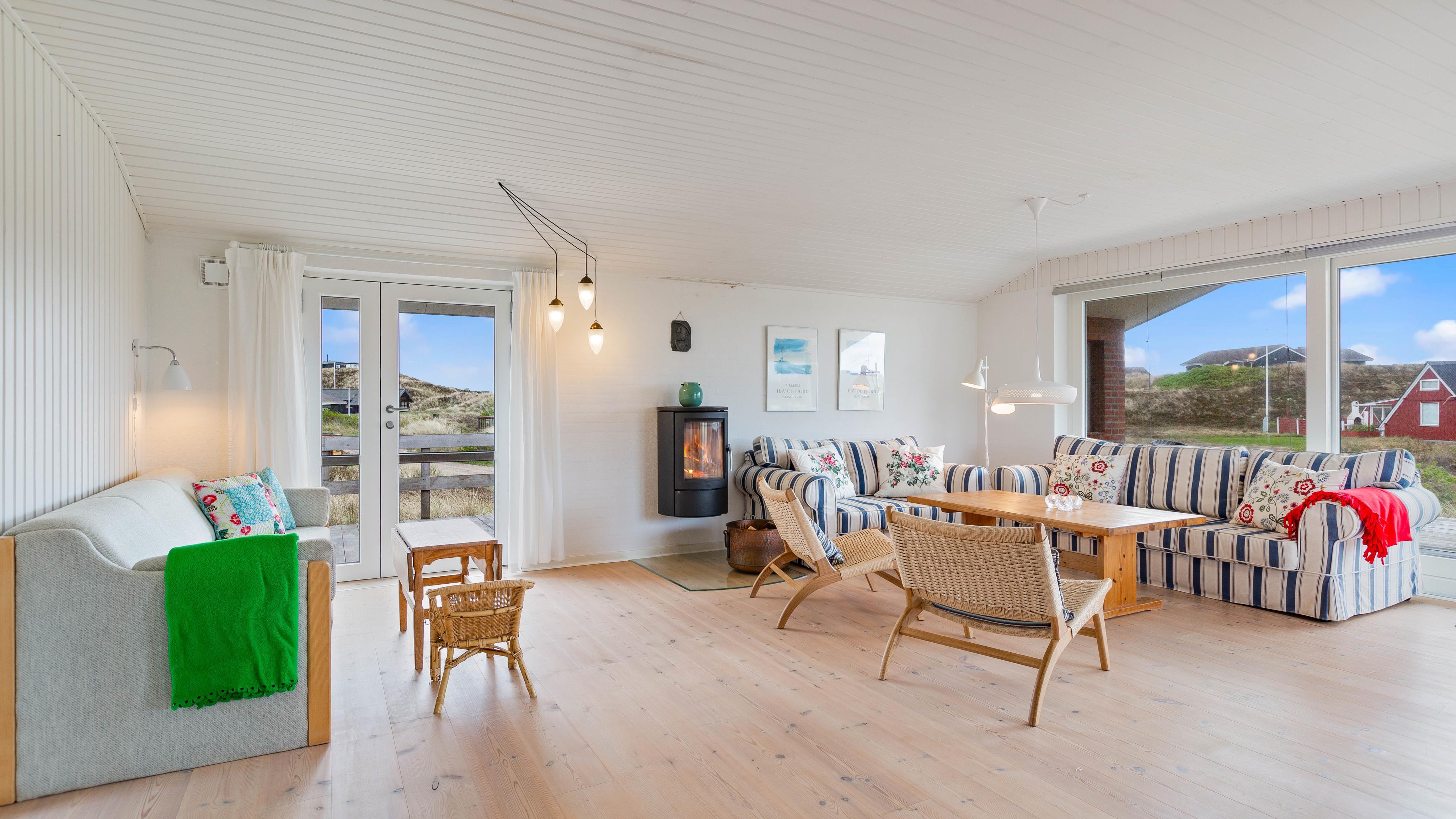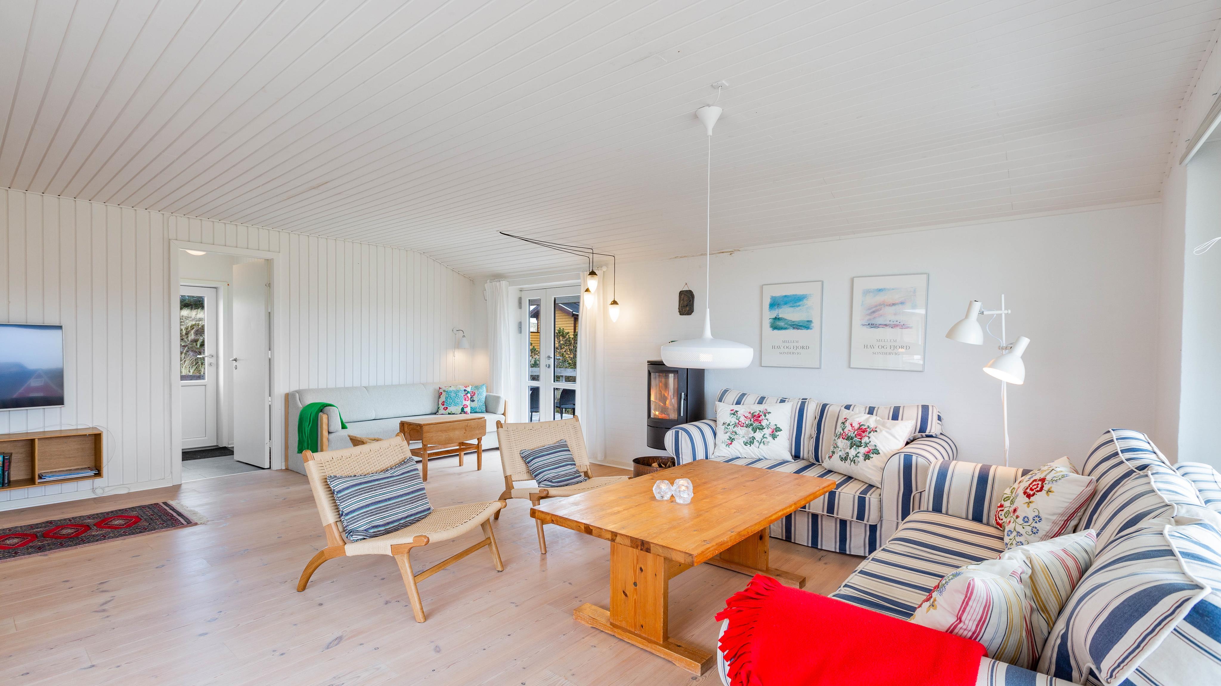 Når I træder ind i feriehuset, bliver I mødt af et stort opholdsrum, der forbinder køkken, stue og spiseplads. Stuen vil helt sikkert blive omdrejningspunktet for jeres ferieaktiviteter, uanset om I laver mad sammen, har sjove spilleaftener eller hygger jer i sofaen med jeres yndlingsserie. Alle kan finde noget, de kan lide her. På kolde og regnfulde dage kan I sidde foran brændeovnen med en god bog og en varm kop te og lytte til ildens knitren. Den energibesparende luft-til-luft varmepumpe i feriehuset sikrer en konstant og behagelig varme.