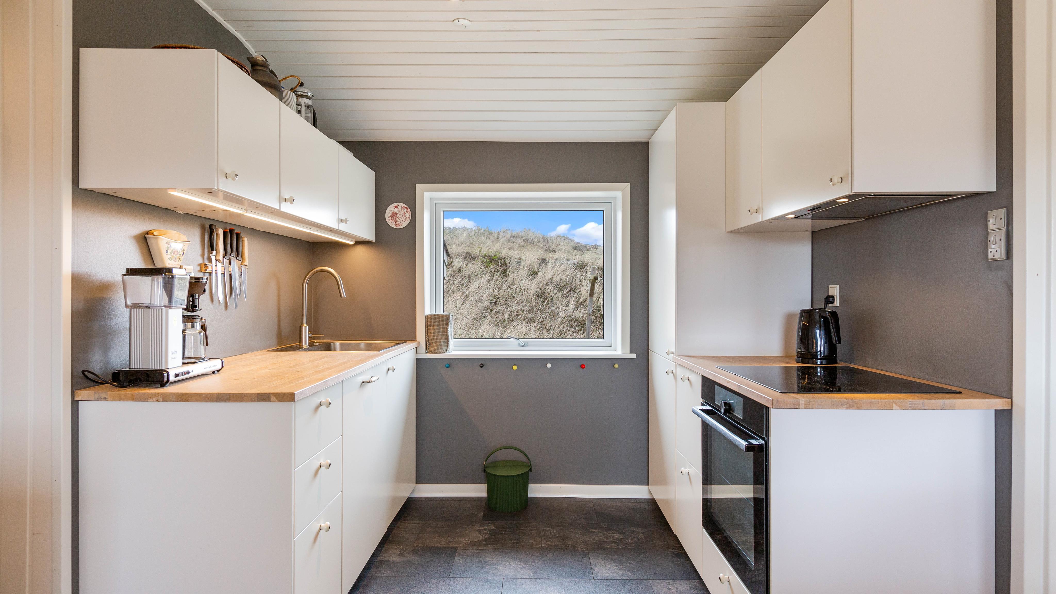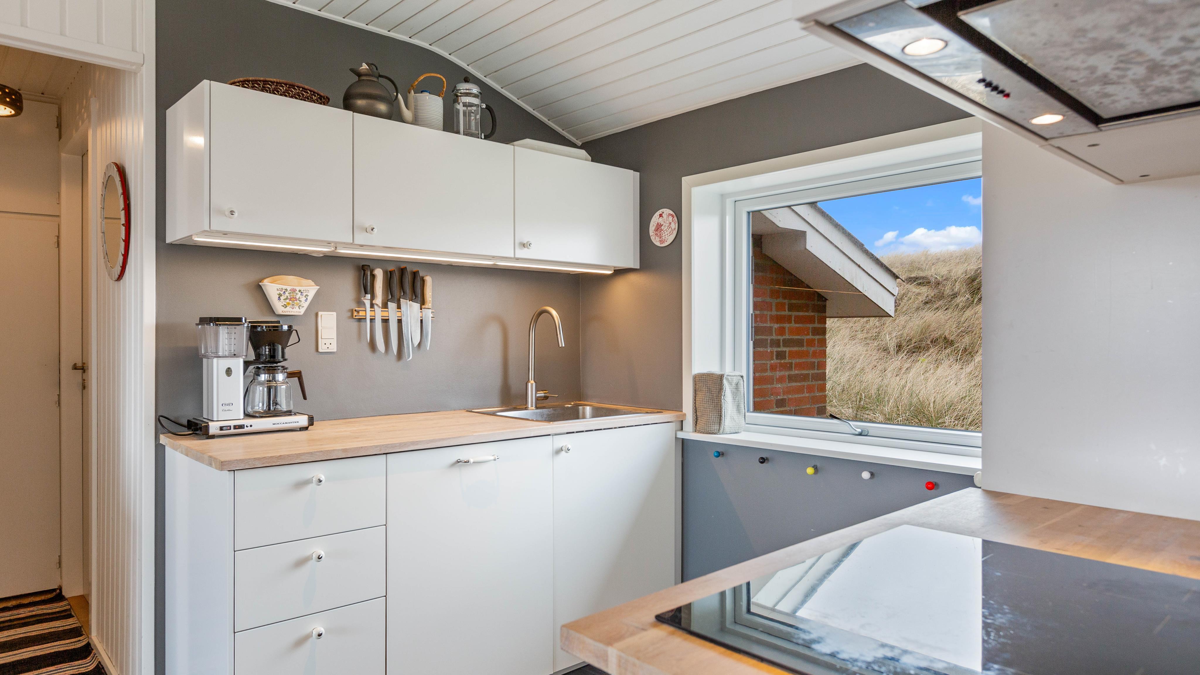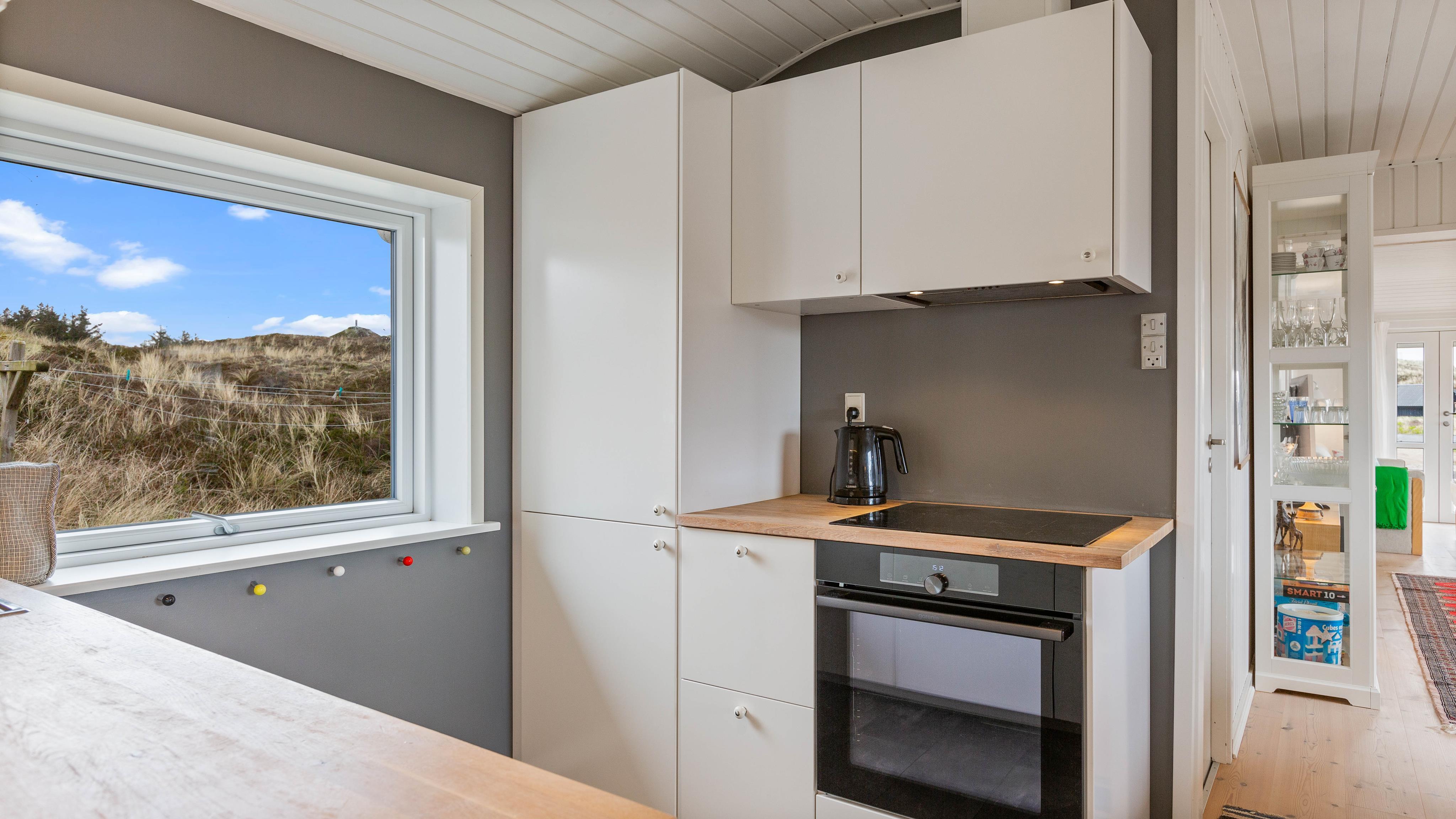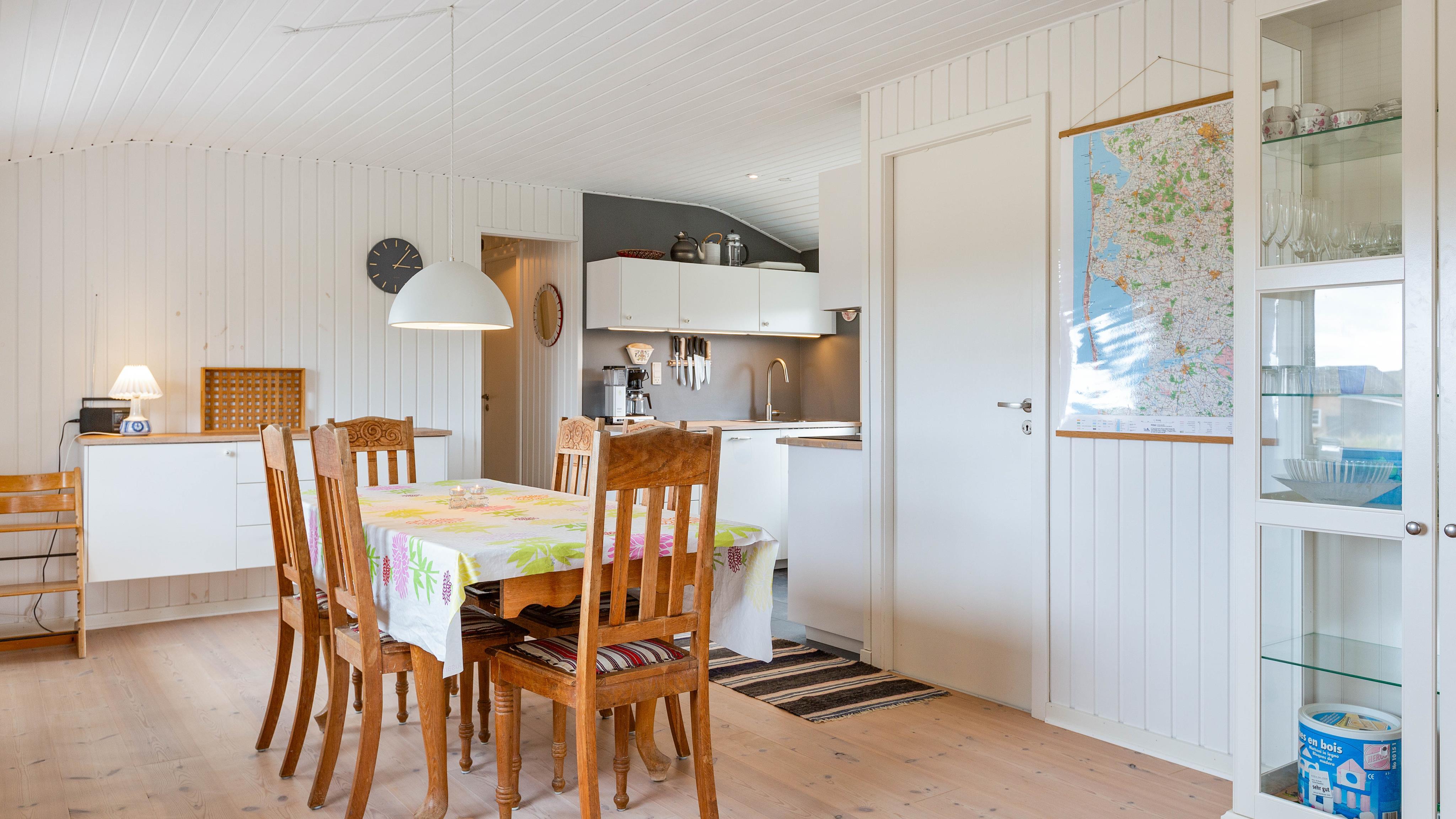 Når I træder ind i feriehuset, bliver I mødt af et stort opholdsrum, der forbinder køkken, stue og spiseplads. Stuen vil helt sikkert blive omdrejningspunktet for jeres ferieaktiviteter, uanset om I laver mad sammen, har sjove spilleaftener eller hygger jer i sofaen med jeres yndlingsserie. Alle kan finde noget, de kan lide her. På kolde og regnfulde dage kan I sidde foran brændeovnen med en god bog og en varm kop te og lytte til ildens knitren. Den energibesparende luft-til-luft varmepumpe i feriehuset sikrer en konstant og behagelig varme.