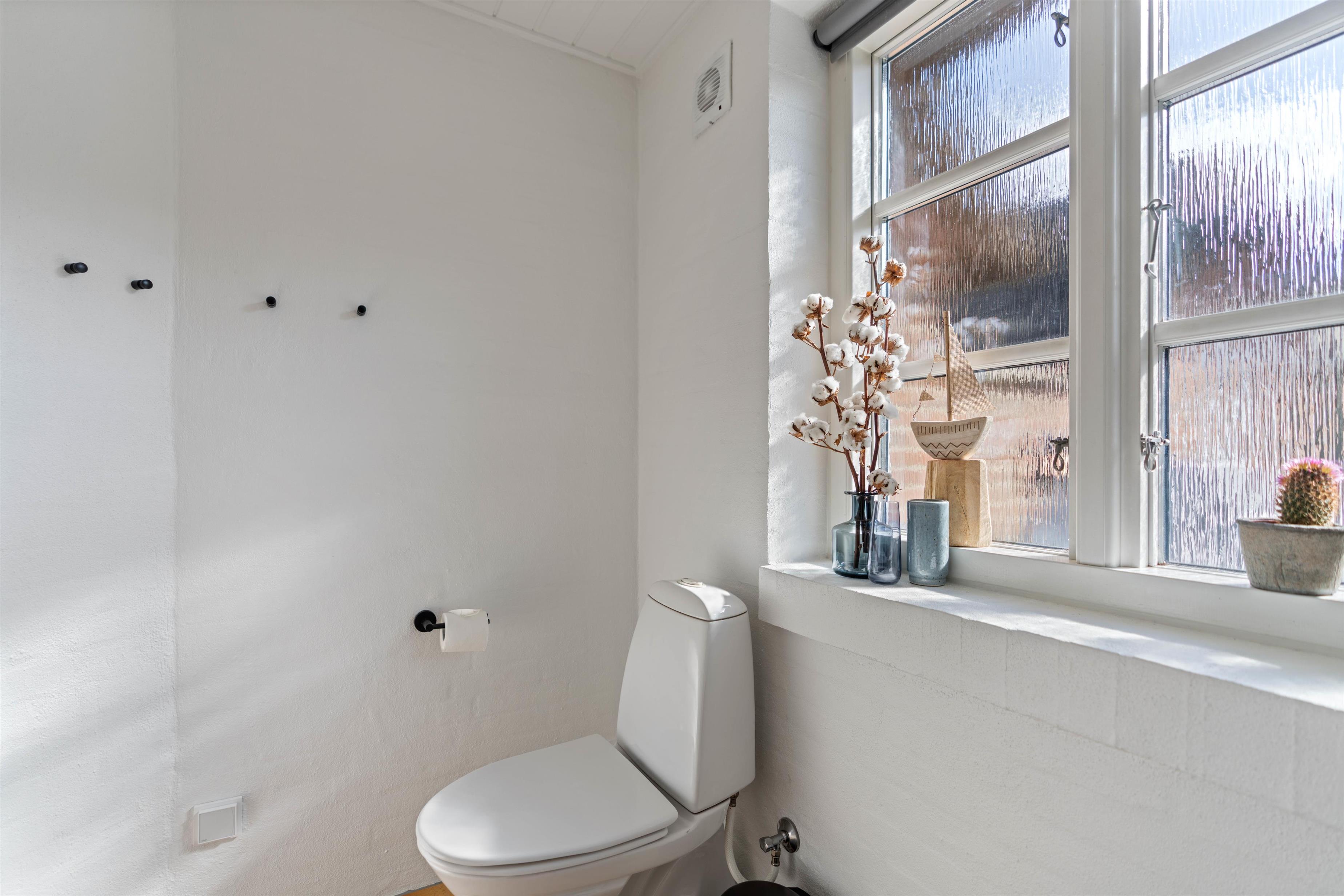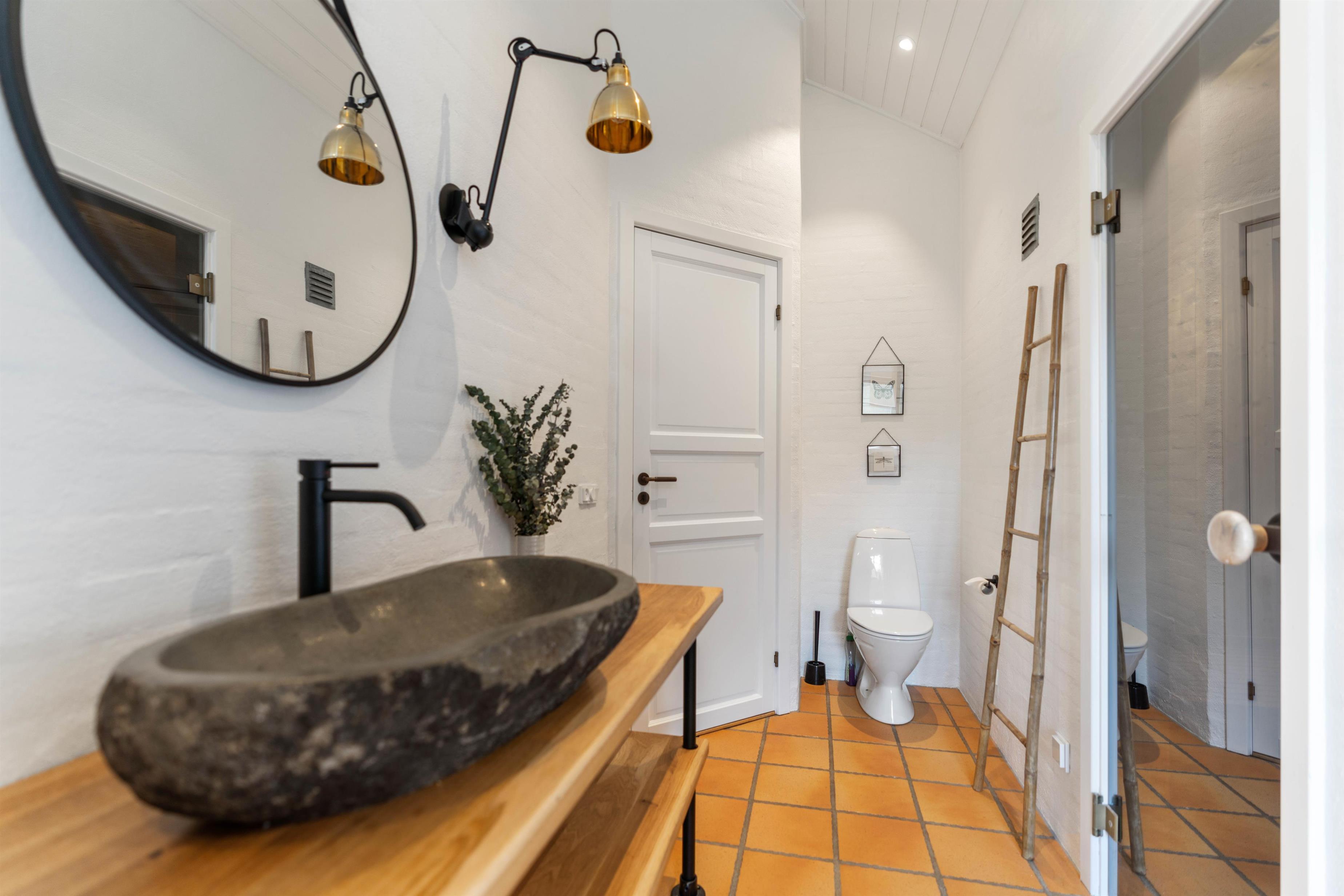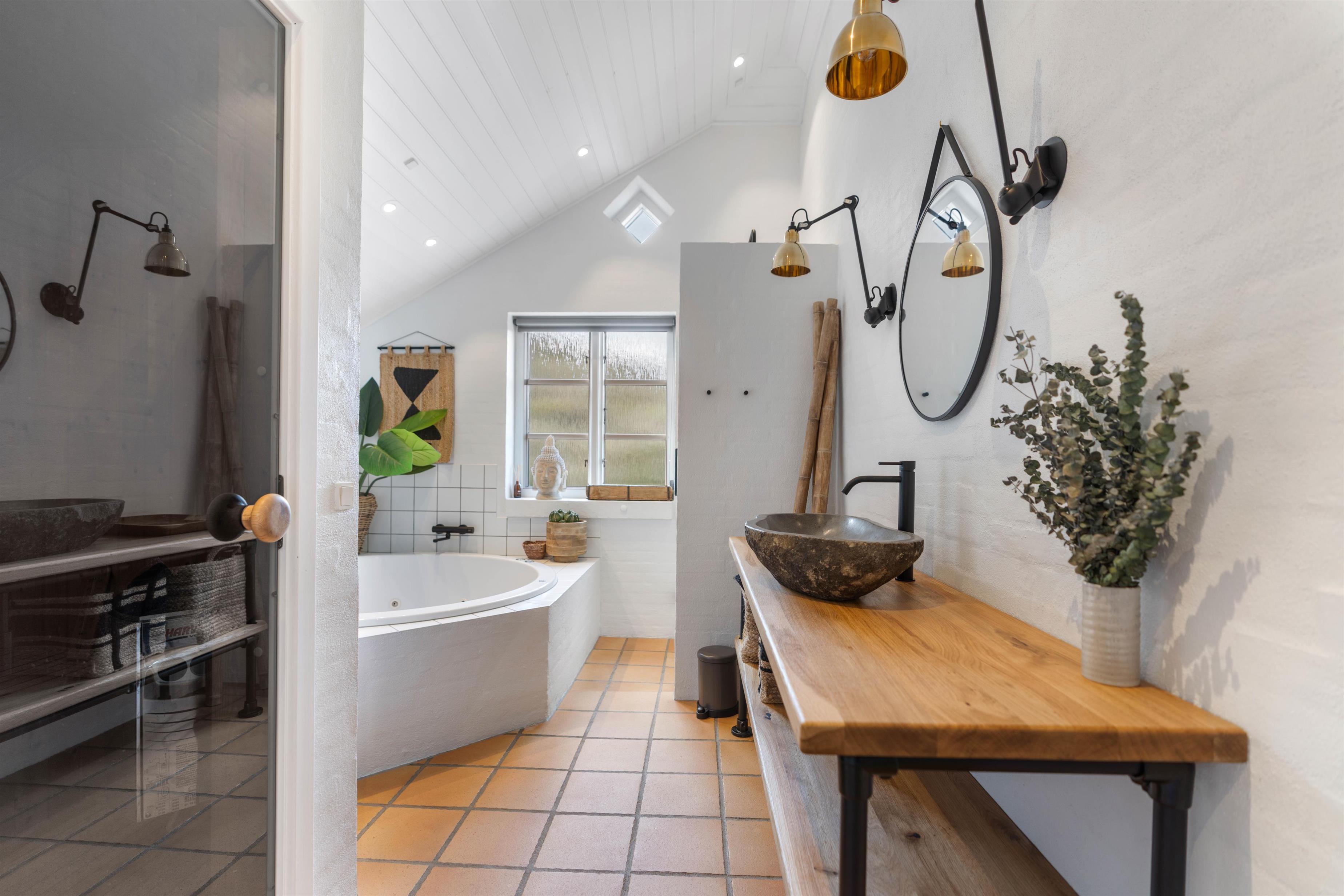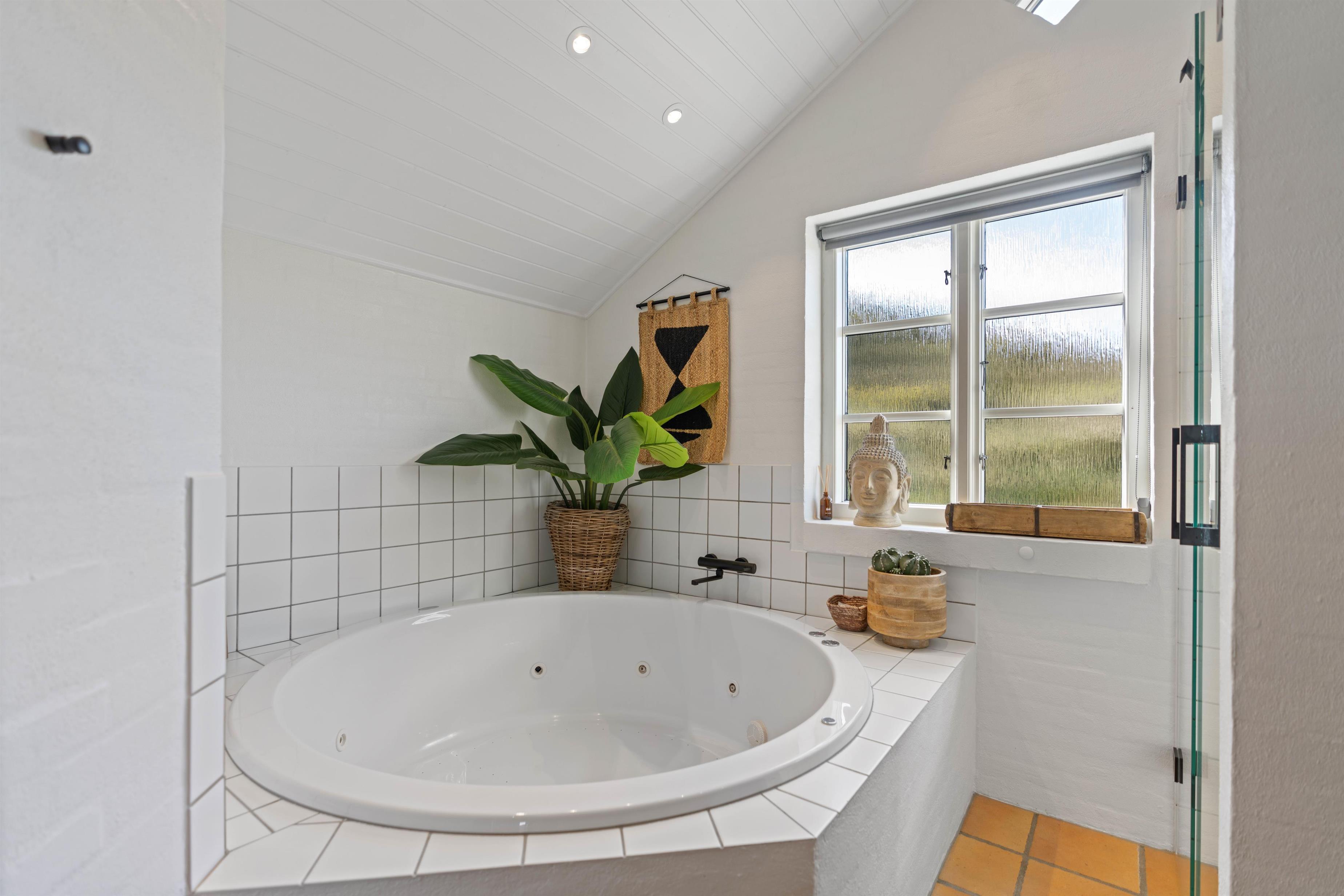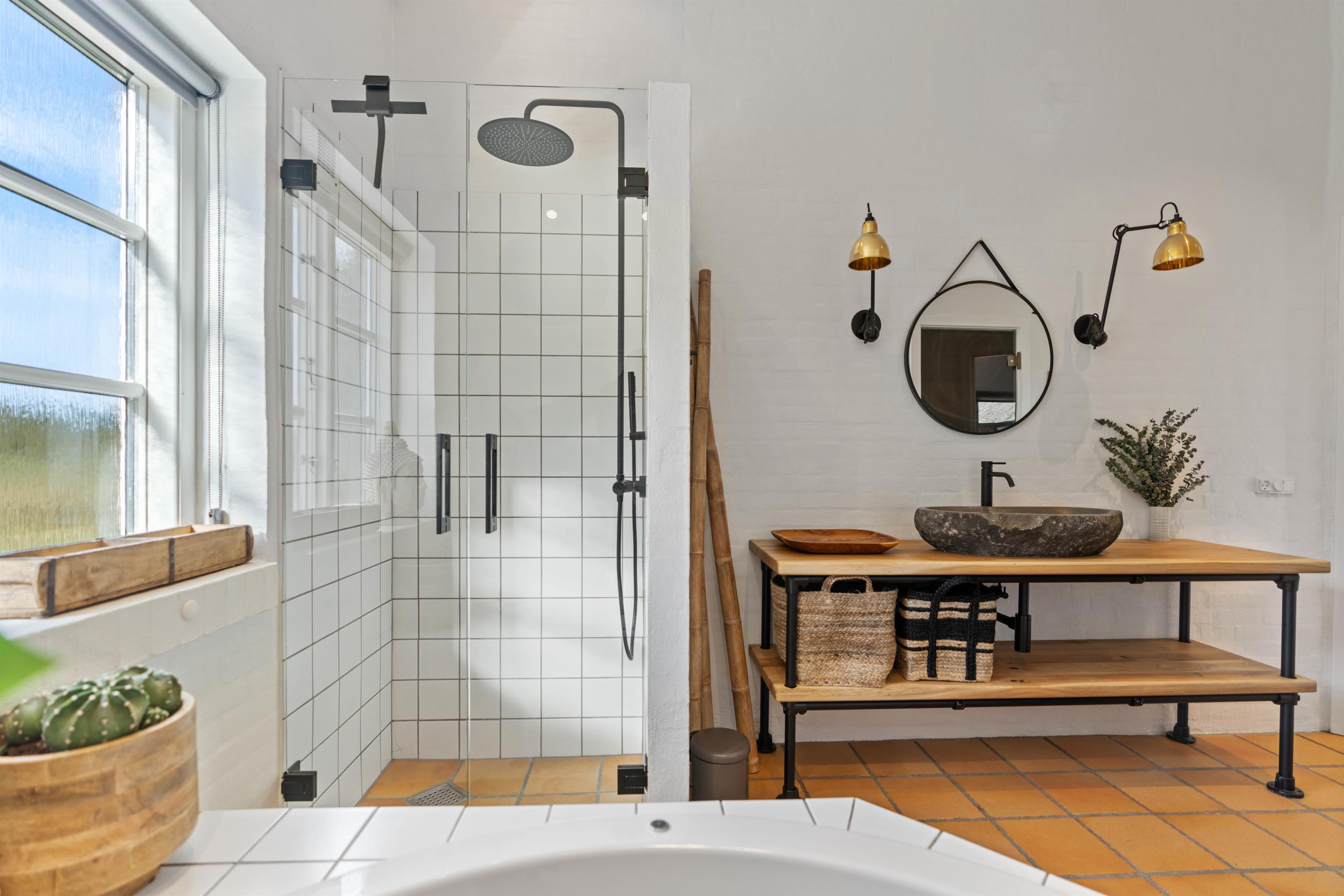 Sommerhuset har 2 badeværelser. Begge med gulvvarme og bruseniche. I det store badeværelse finder I et lækkert, rundt spabad og indgang til husets sauna, så I også kan nyde et strejf hjemme-wellness.
