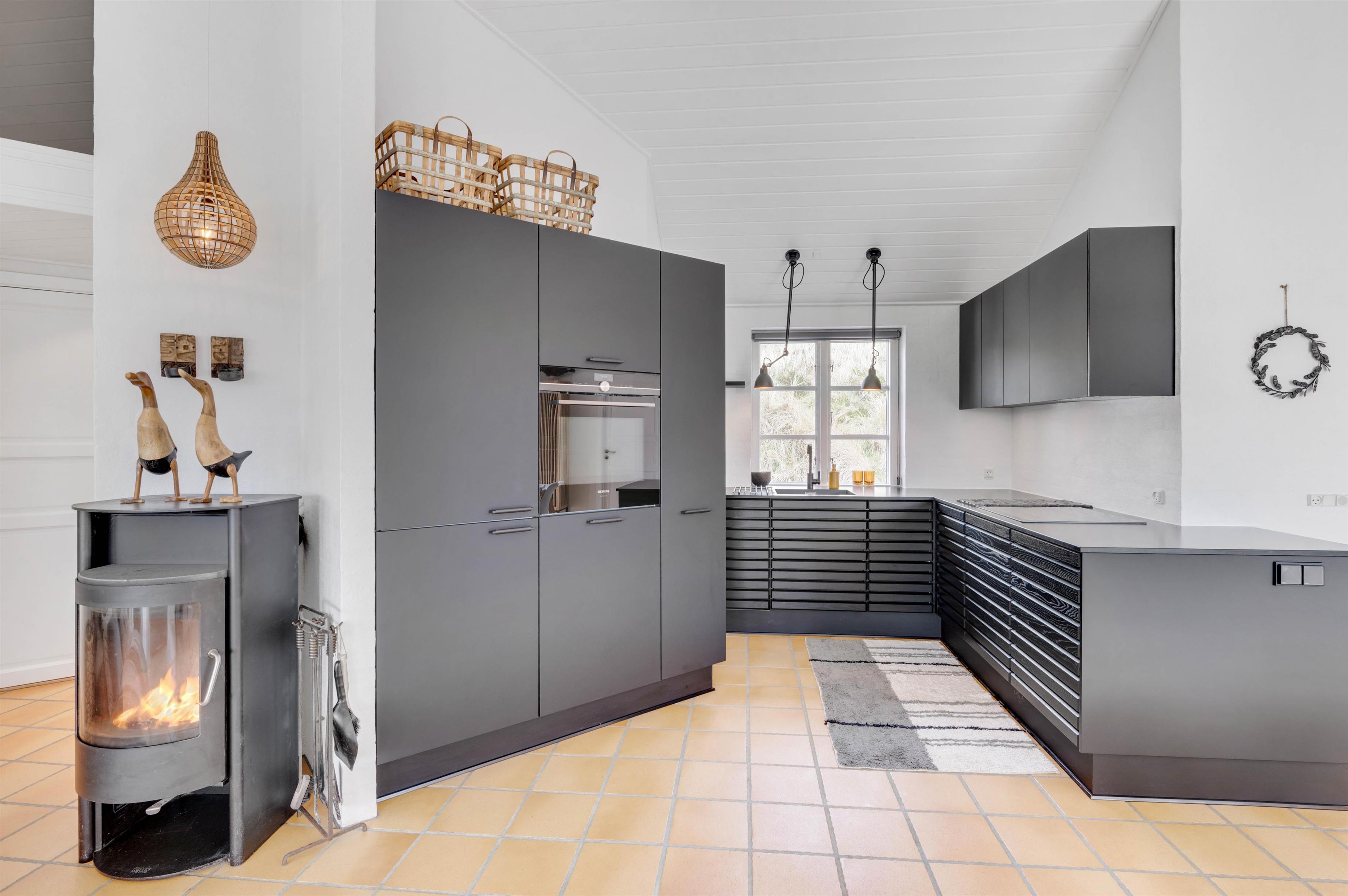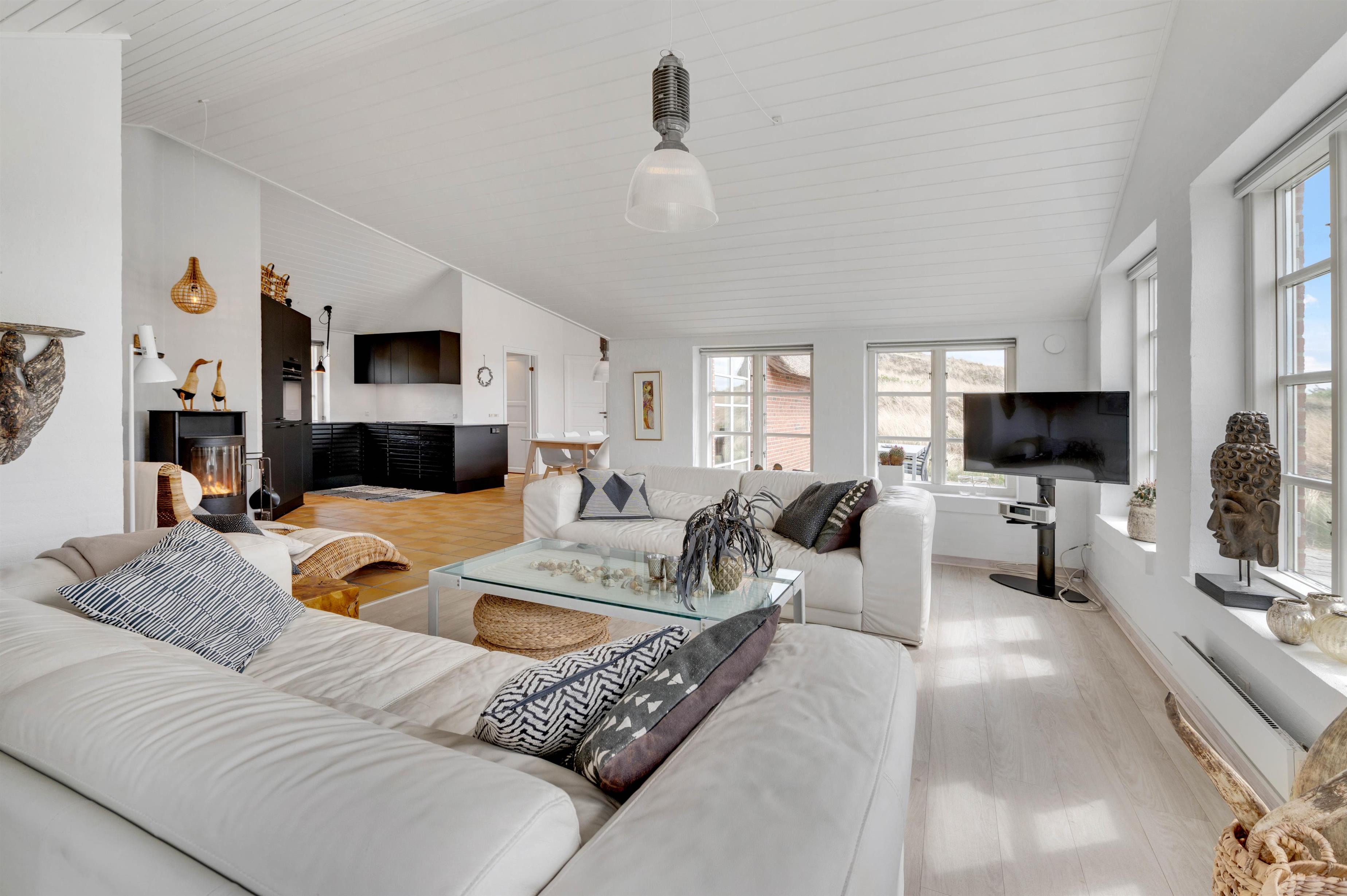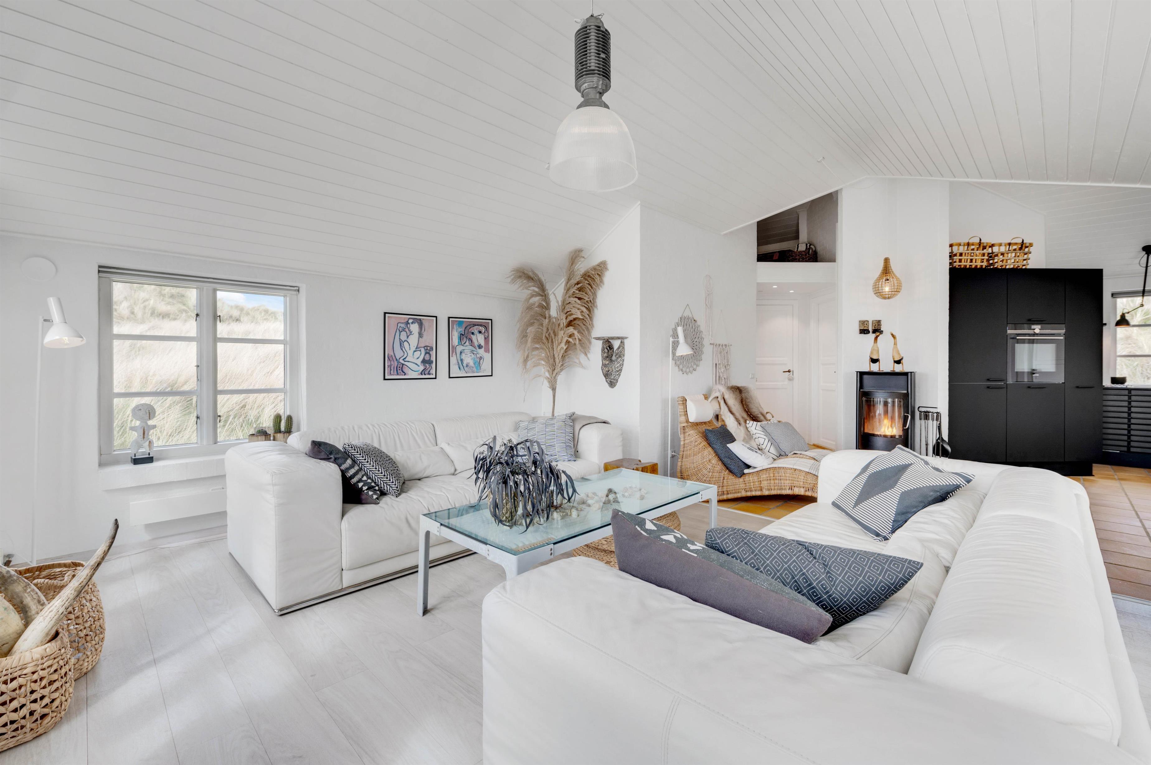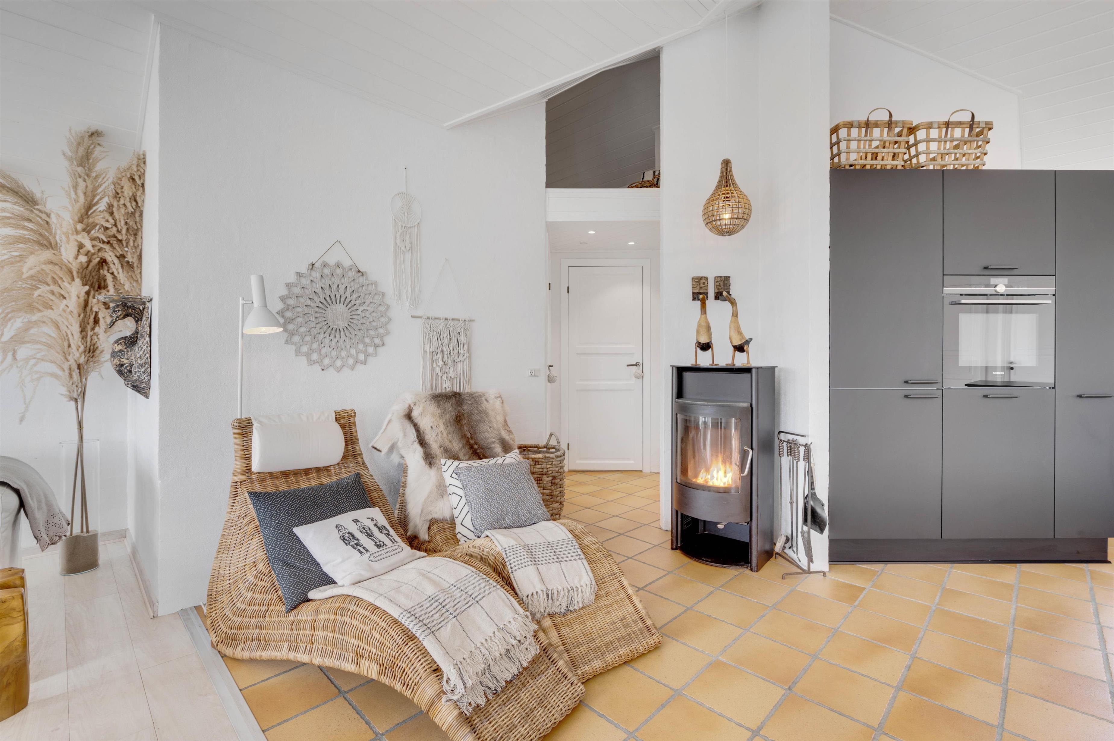 Køkkenet er i åben forbindelse med spisestuen. Køkkenet er yderst veludstyret, og her kunne amatørkokken uden tvivl forberede en lækker middag. I den hyggelige og smagfuldt indrettede stue er der et smukt lysindfald fra de høje vinduespartier og ikke mindst en fantastisk udsigt. Her finder I flere hyggekroge, hvor I kan slå jer ned og slappe af. Endnu et af sommerhusets highlights er brændeovnen, der på de køligere dage kan hjælpe med at varme sommerhuset op, og ikke mindst hjælpe med at sprede en masse feriehygge og god atmosfære