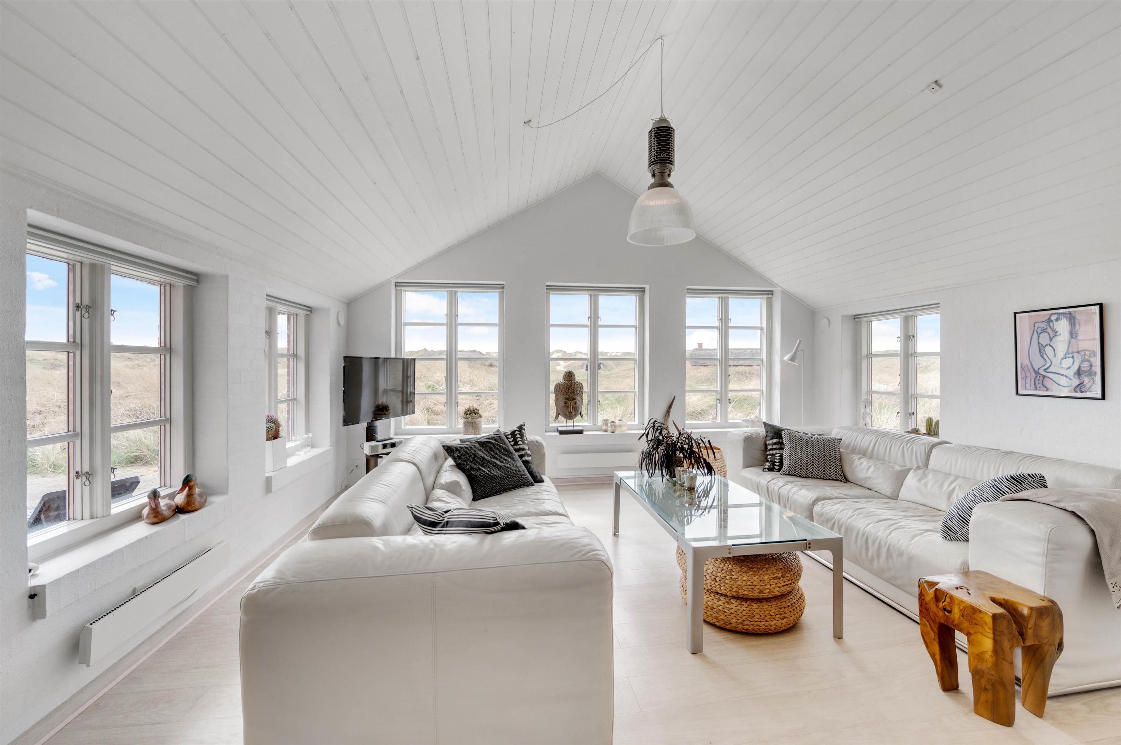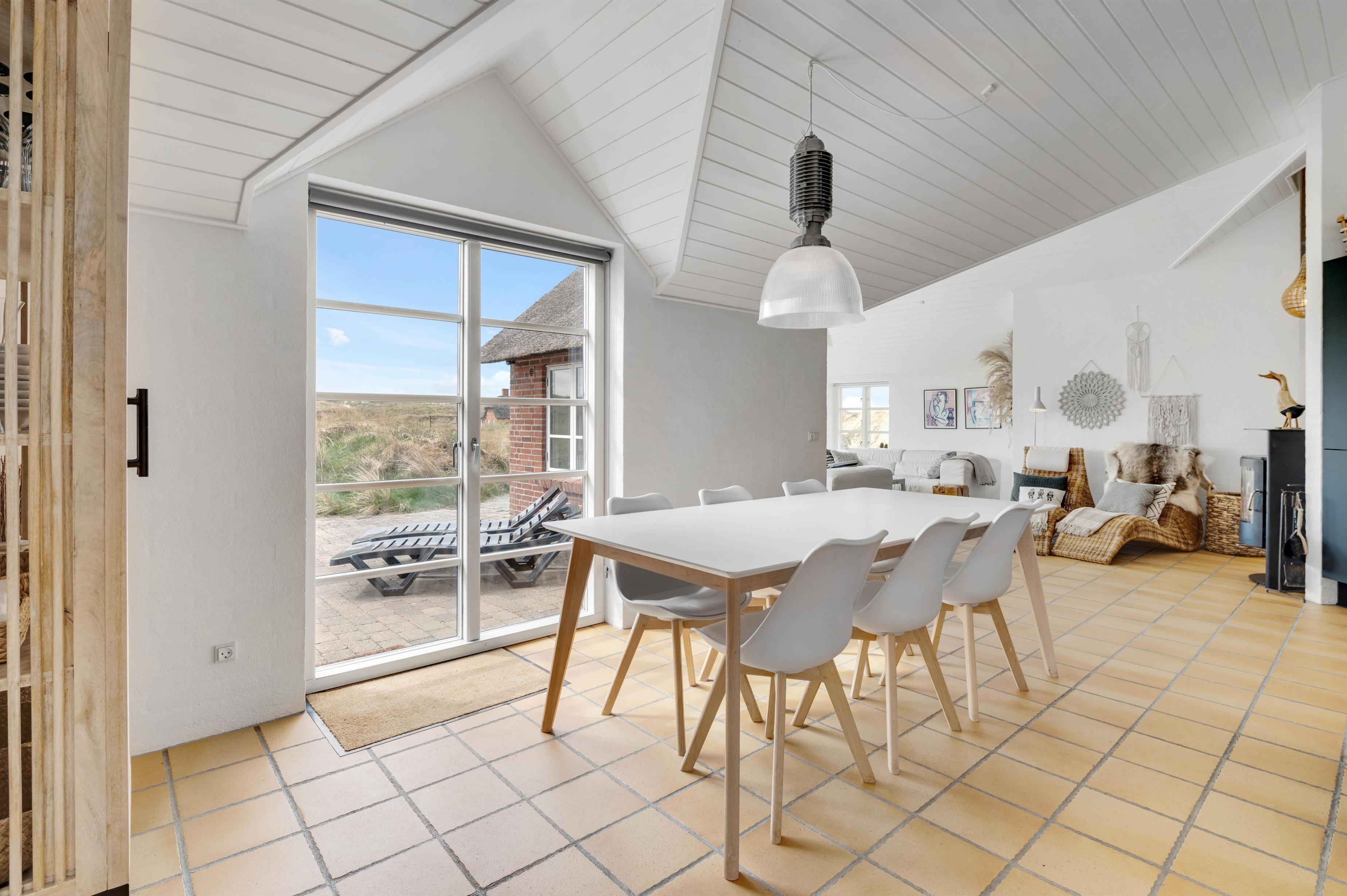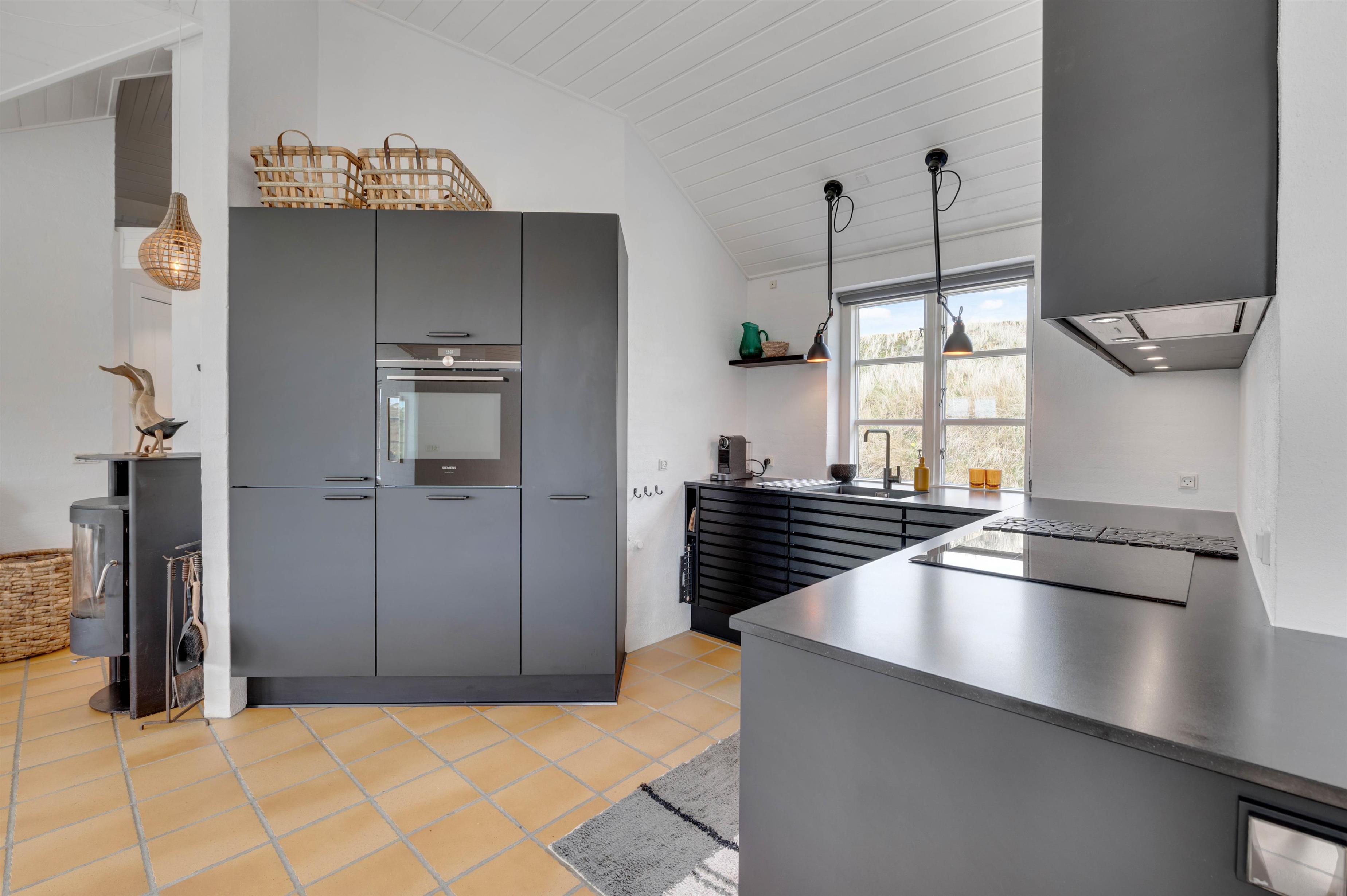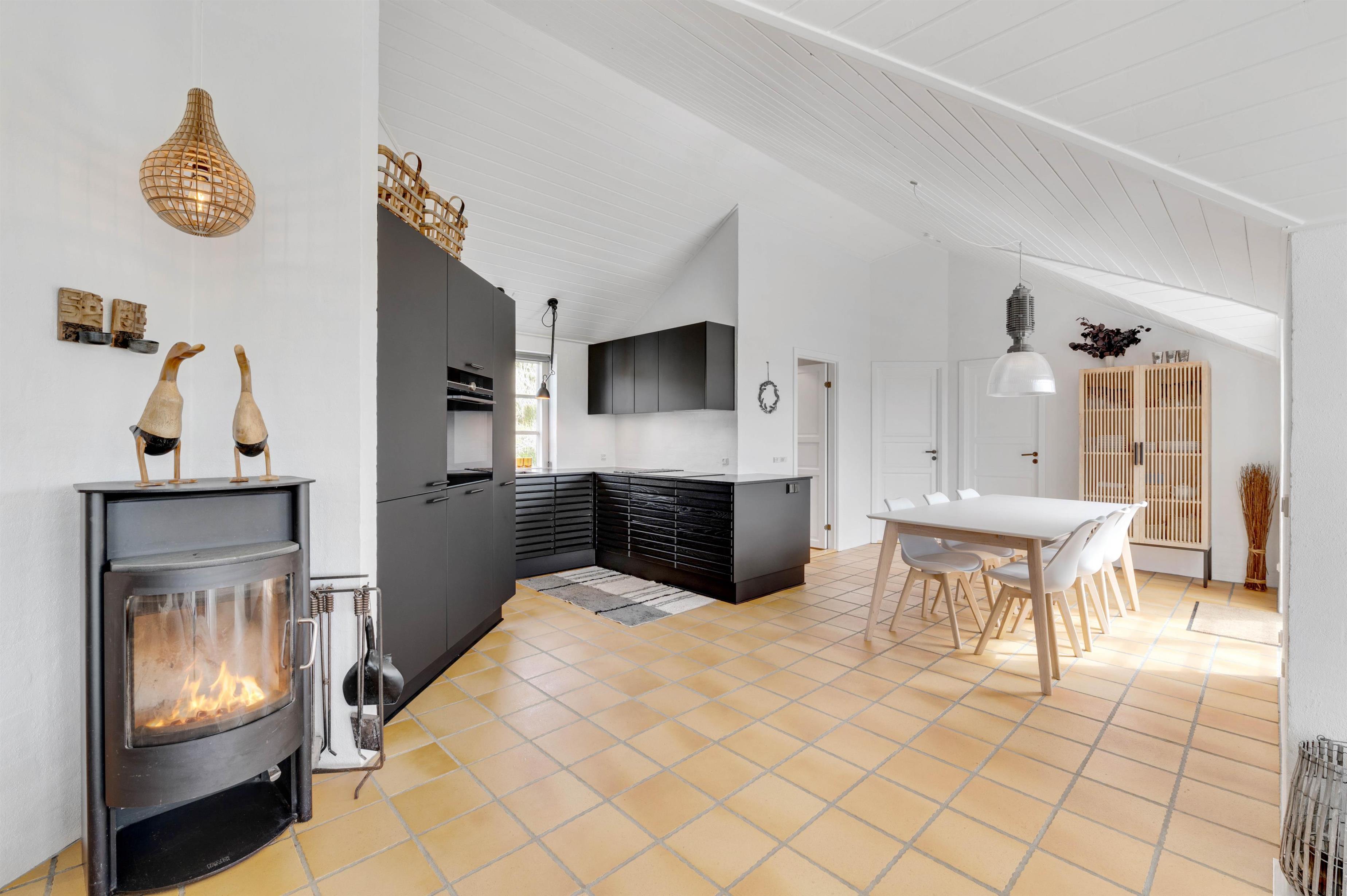 Køkkenet er i åben forbindelse med spisestuen. Køkkenet er yderst veludstyret, og her kunne amatørkokken uden tvivl forberede en lækker middag. I den hyggelige og smagfuldt indrettede stue er der et smukt lysindfald fra de høje vinduespartier og ikke mindst en fantastisk udsigt. Her finder I flere hyggekroge, hvor I kan slå jer ned og slappe af. Endnu et af sommerhusets highlights er brændeovnen, der på de køligere dage kan hjælpe med at varme sommerhuset op, og ikke mindst hjælpe med at sprede en masse feriehygge og god atmosfære