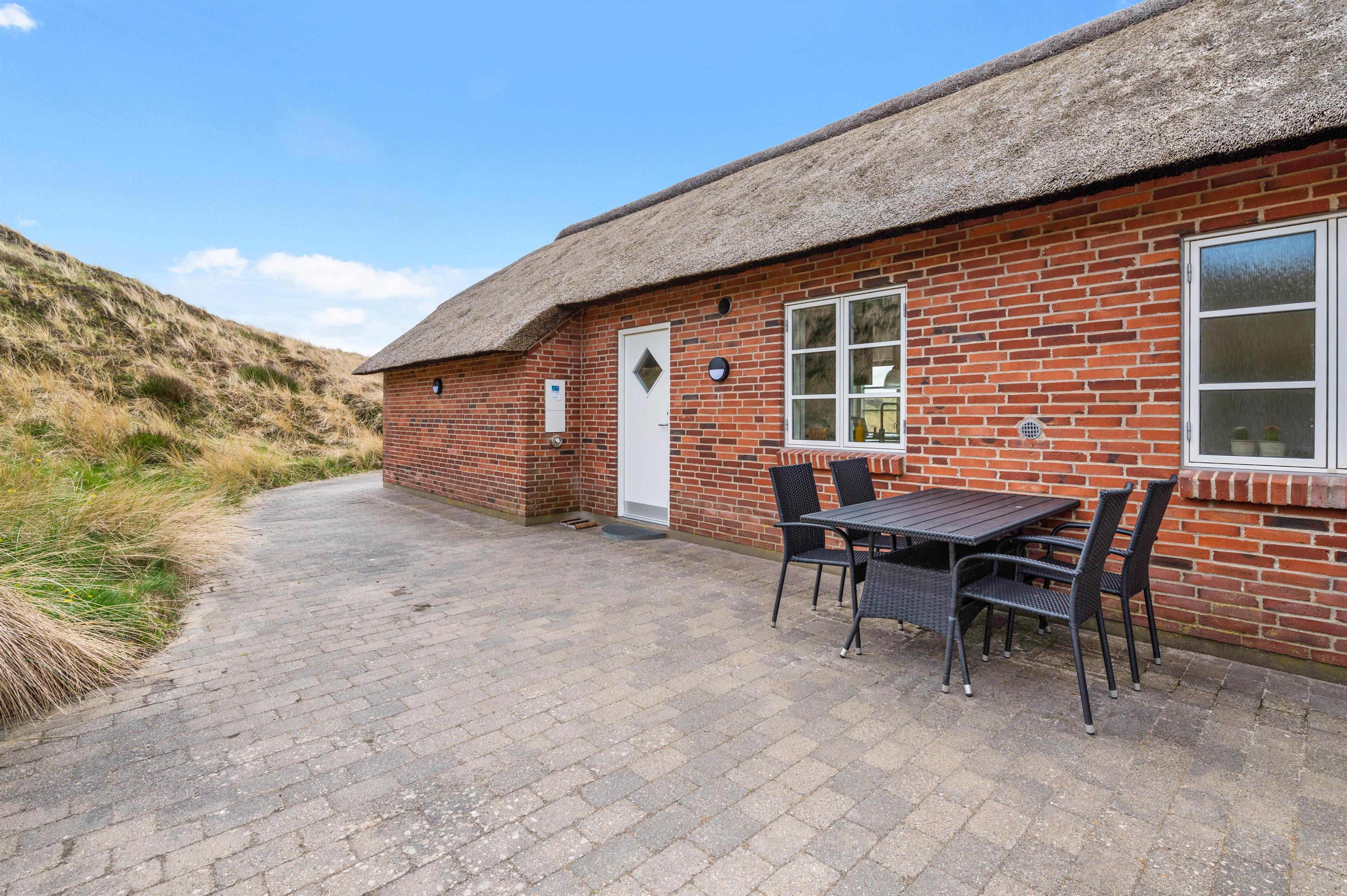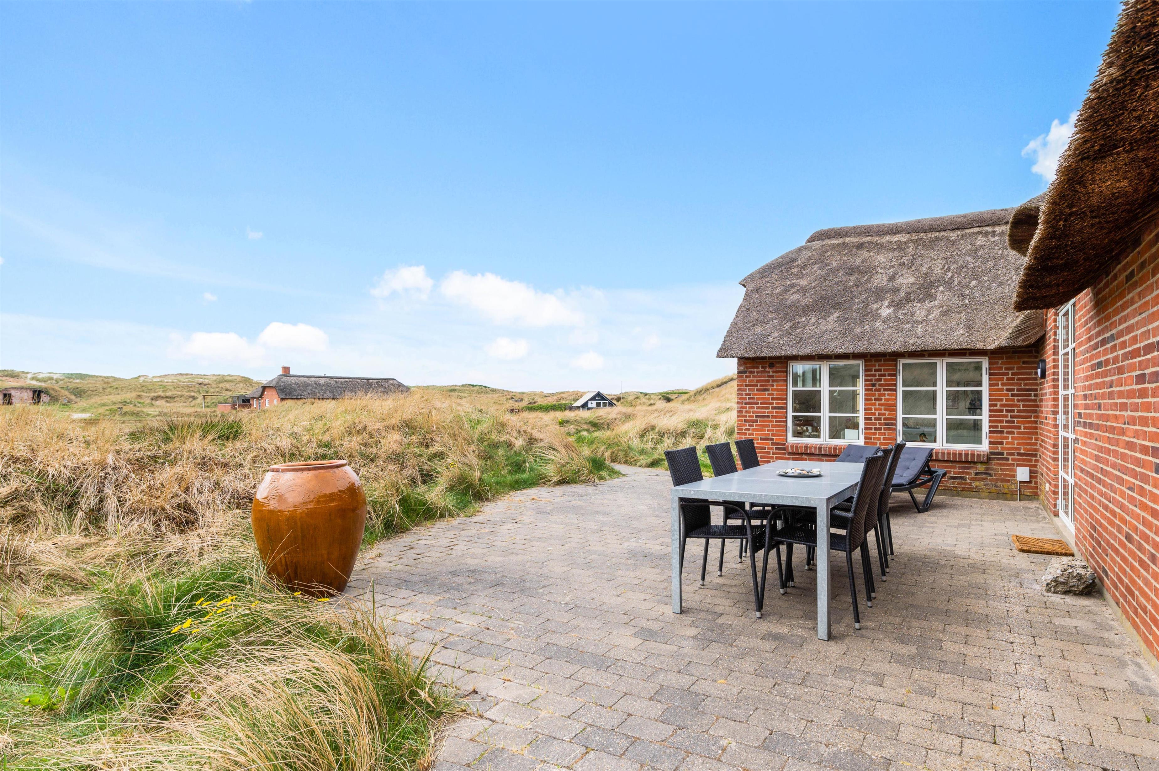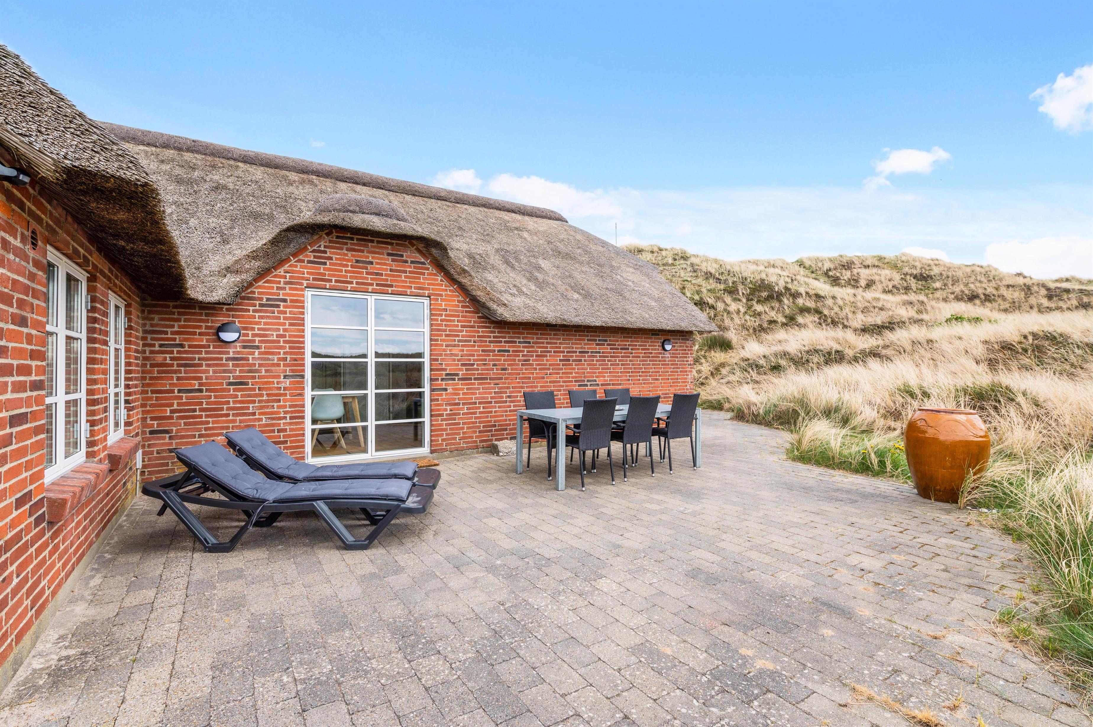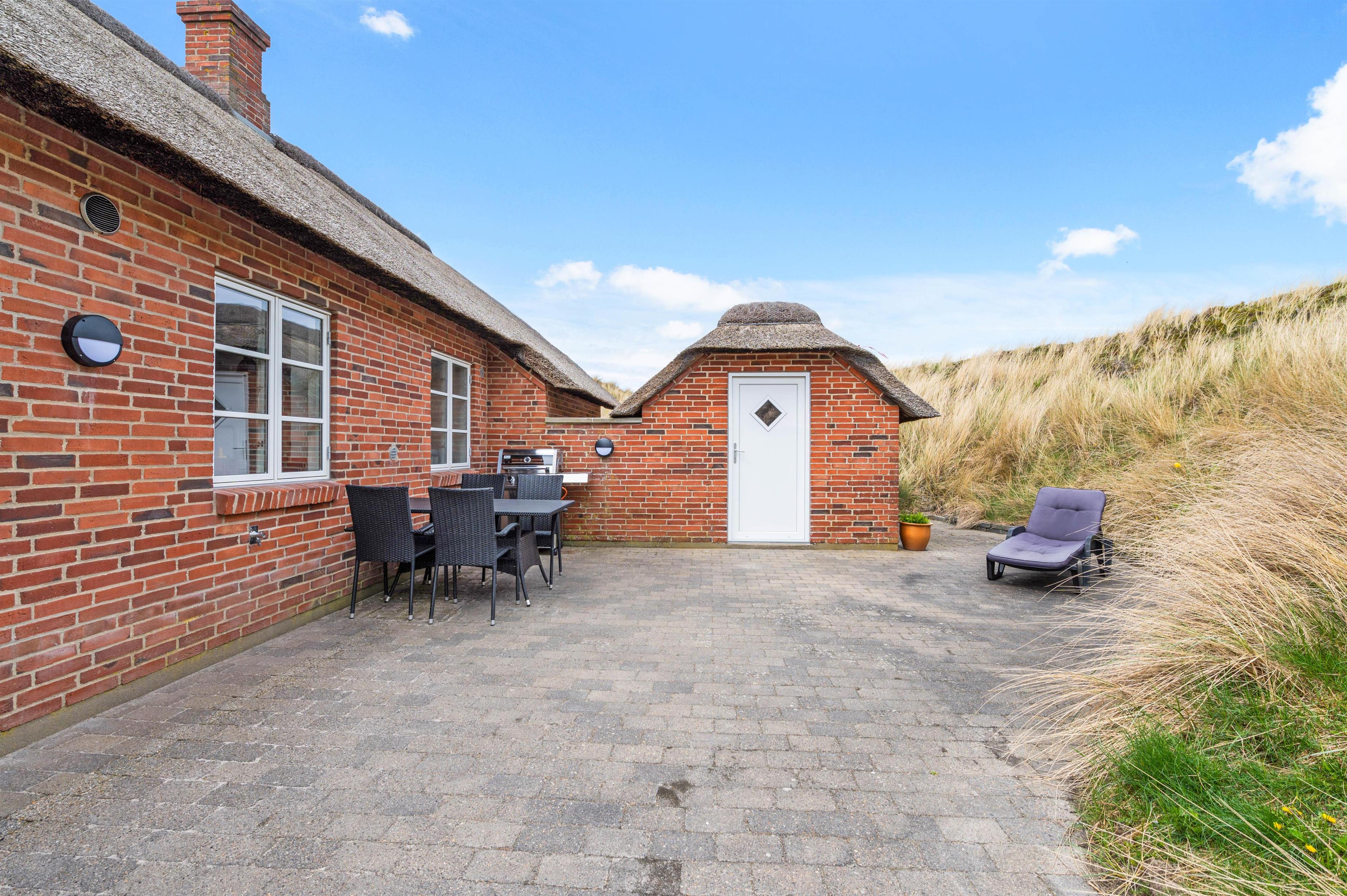 Sommerhuset har 2 skønne terrasser. Den ene vender mod øst, og en anden mod vest. Den østvendte terrasse er fantastisk placeret og nærmest bygget ind i en klit, som sammen med huset og det lille udhus giver gode læmuligheder samt masser af privatliv. Fra terrassen mod vest er der en helt enestående udsigt over det smukke klitlandskab. På terrasserne finder I selvfølgelig havemøbler, liggestole og grill.