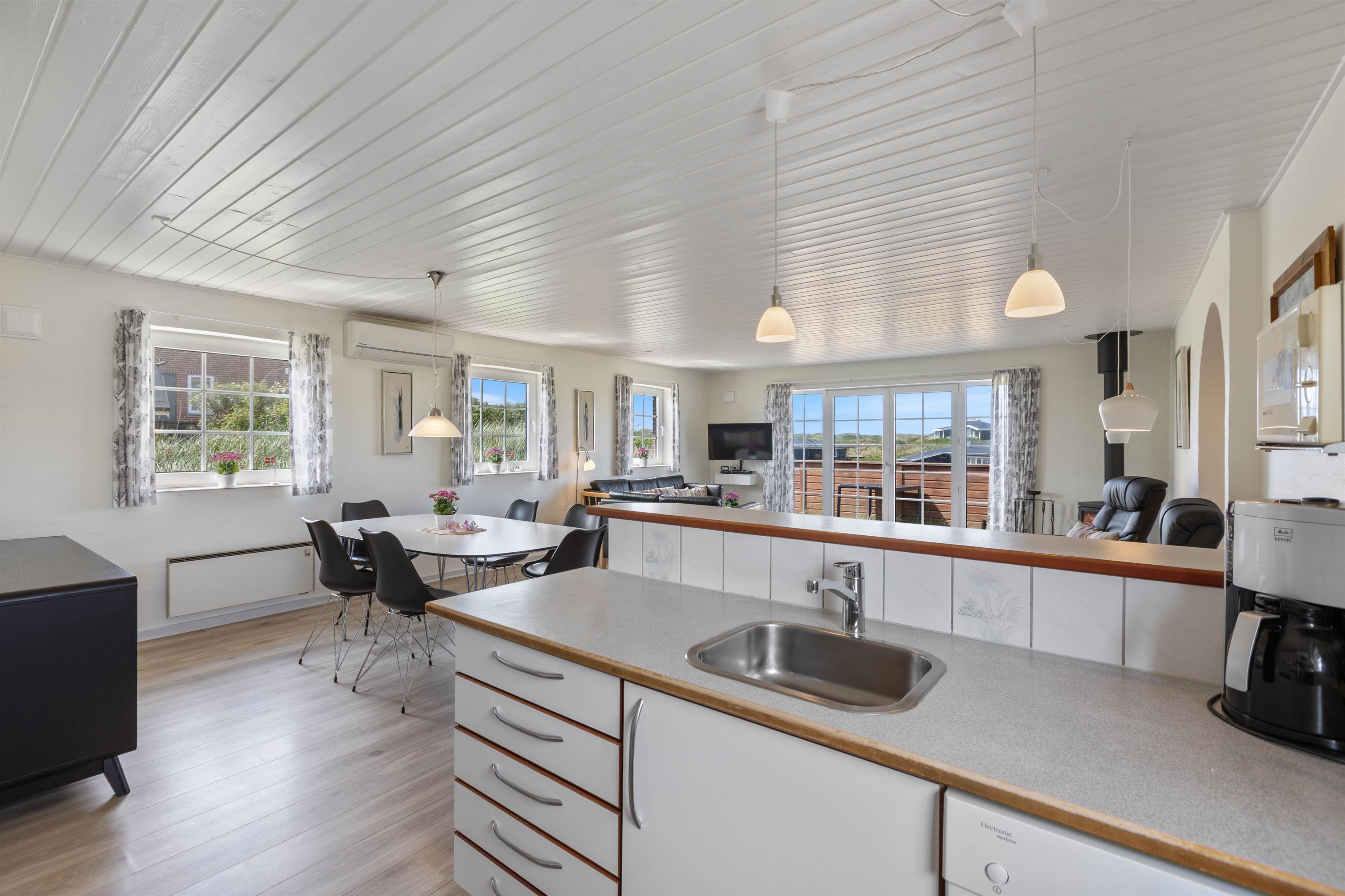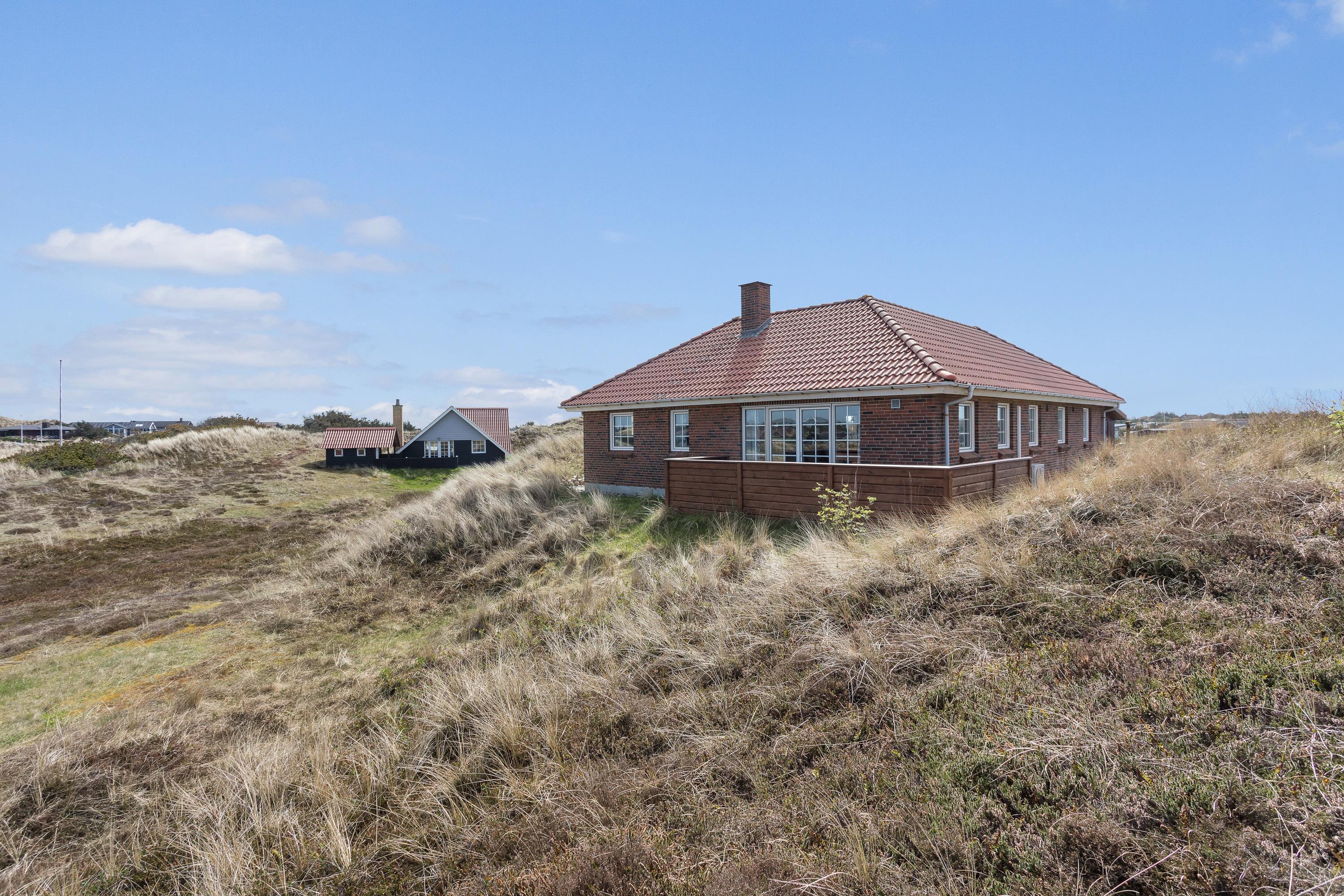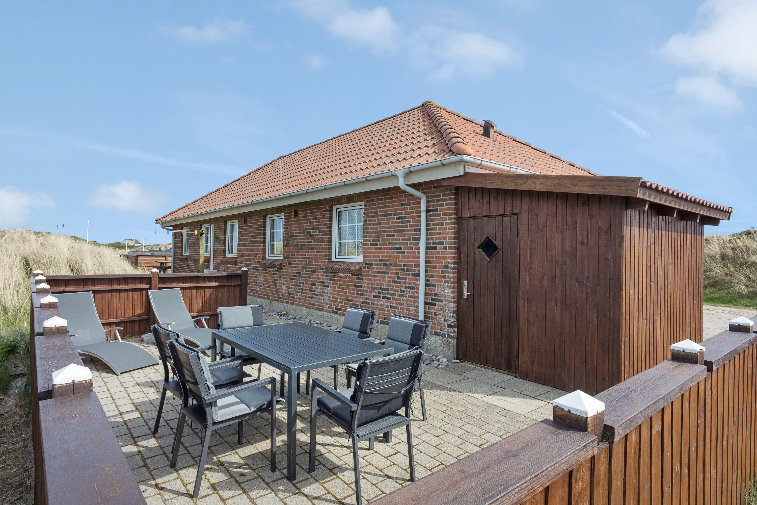 Udvendigt finder I en afskærmet terrasse, hvor I kan nyde det gode vejr og den friske havbrise (og selvfølgelig det skønne klitlandskab, I er omgivet af). I sommertiden kan der tændes op i grillen, og liggestole og havemøbler står klar, så I kan udnytte hver eneste solstråle.
