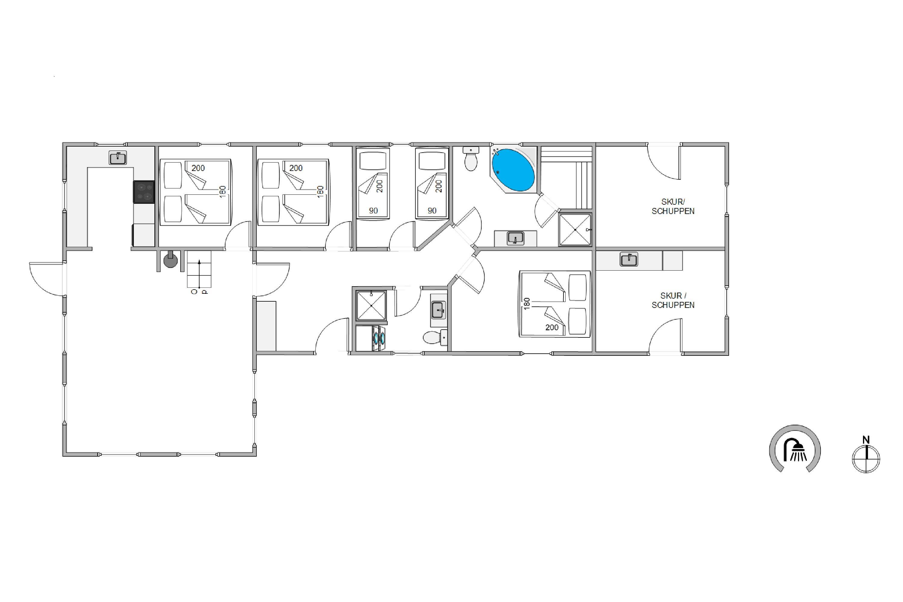 Trænger du til at strække benene efter et par timer i solen? Blot følg stien fra huset og ind i klitterne. Efter få minutter står du på den lange sandstrand og kan dyppe tæerne i Vesterhavet. Du kan også få et forfriskende skyl under udendørsbruseren på terrassen. Udebruseren kan benyttes fra april til november.