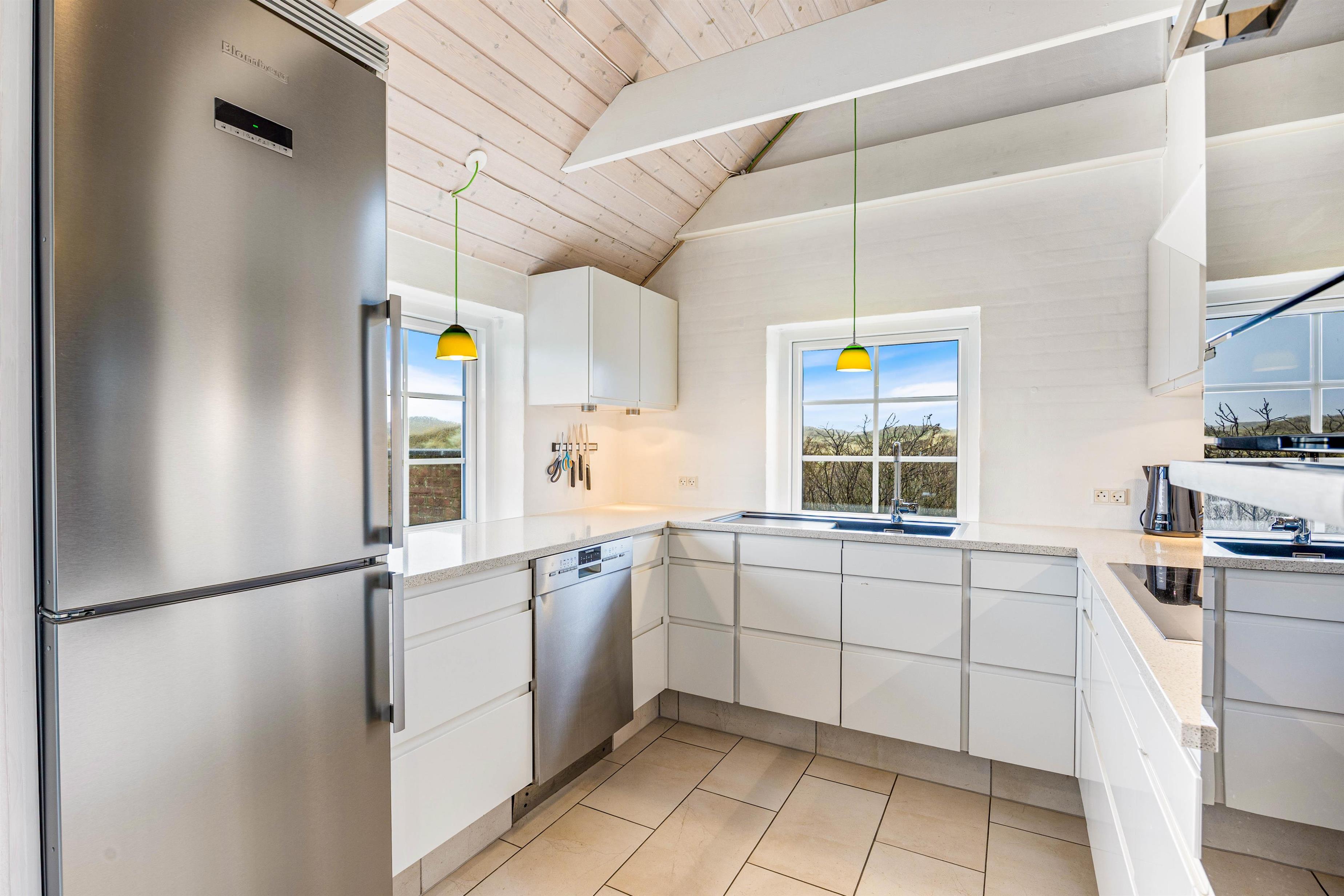 Den yderst smagfulde indretning byder på alt, hvad I skal bruge til jeres ferie på vestkysten. Det lyse og moderne køkken er indrettet med kvalitets hårde hvidevarer og følger stilen fra resten af sommerhuset, så det fremstår velintegreret. Her kan den professionelle feriekok slå sig løs og nyde udsigten på klitlandskabet imens.