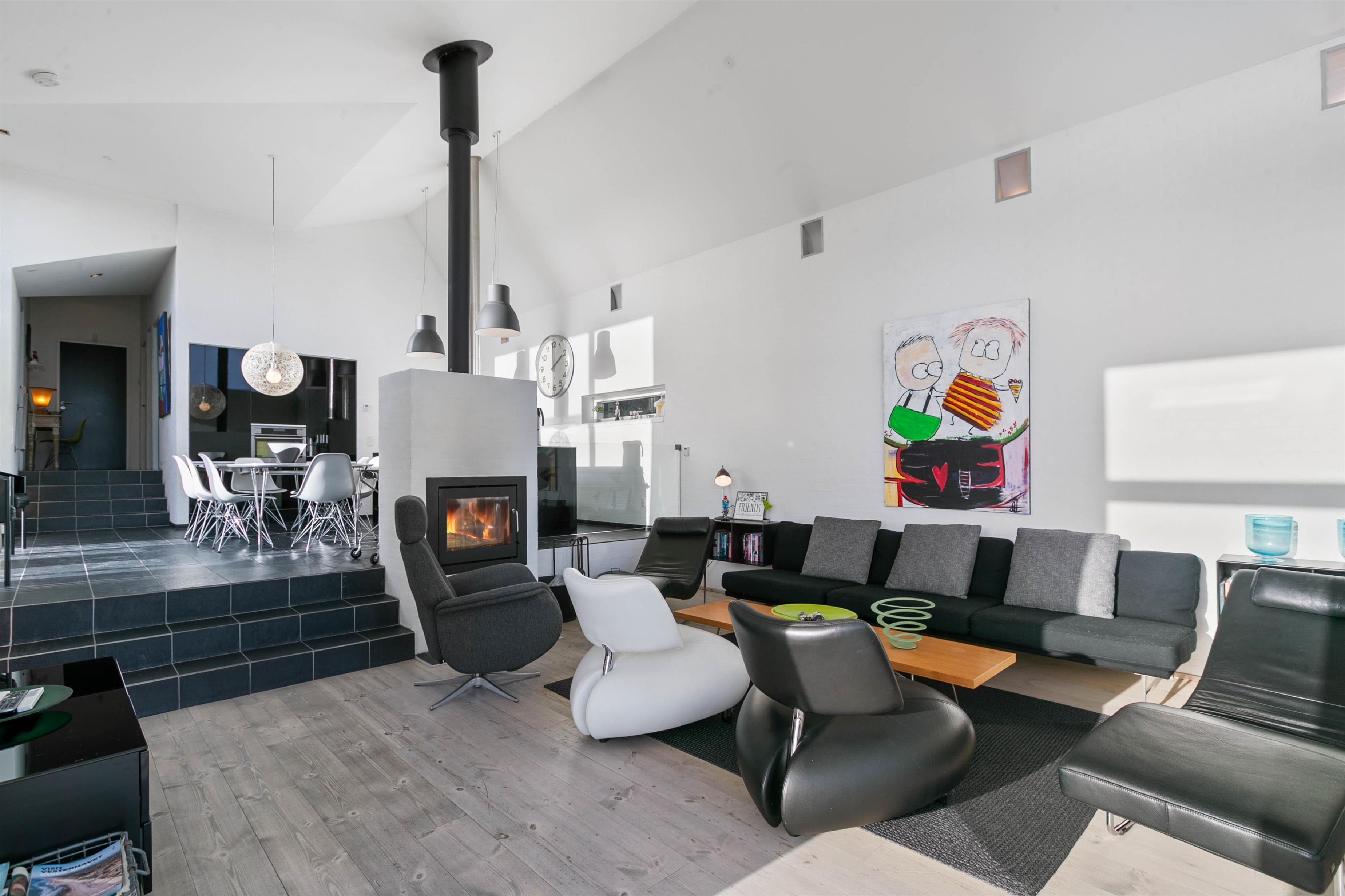 Den nedsænkede stue med smart TV og smukke designermøbler indbyder til ren afslapning, hygge og kvalitetstid – uanset om det er med hele familien eller blot i romantisk tosomhed. Og det flotte åbne køkken bliver hurtigt til det muntre køkken, hvor den fælles madlavning går som en leg.
