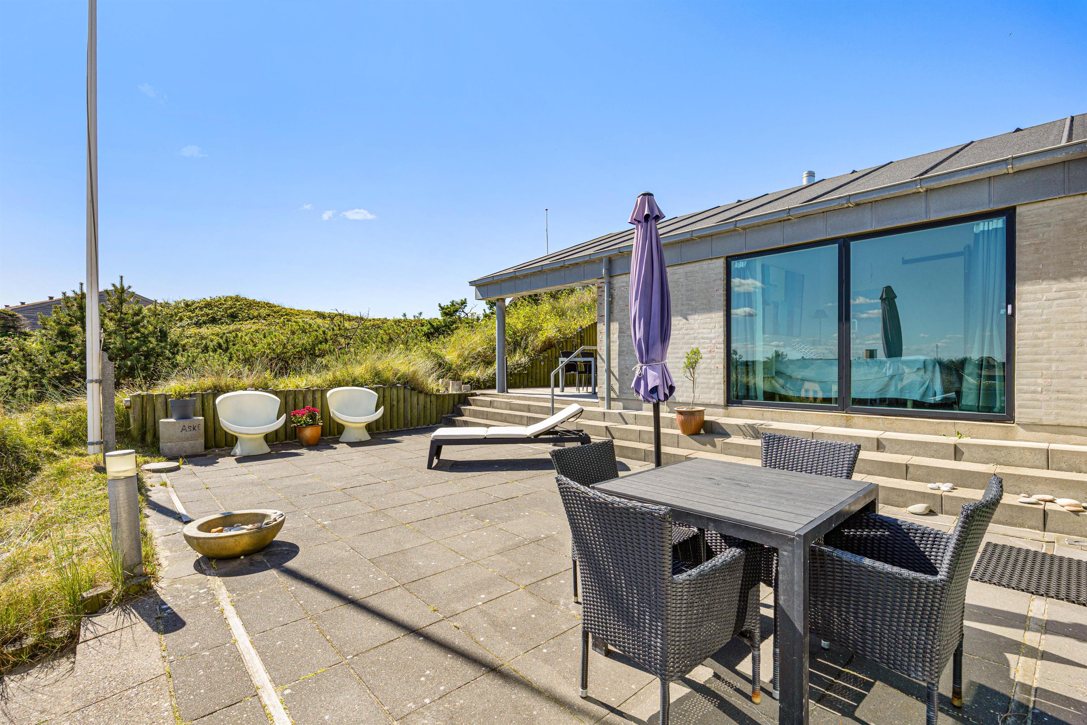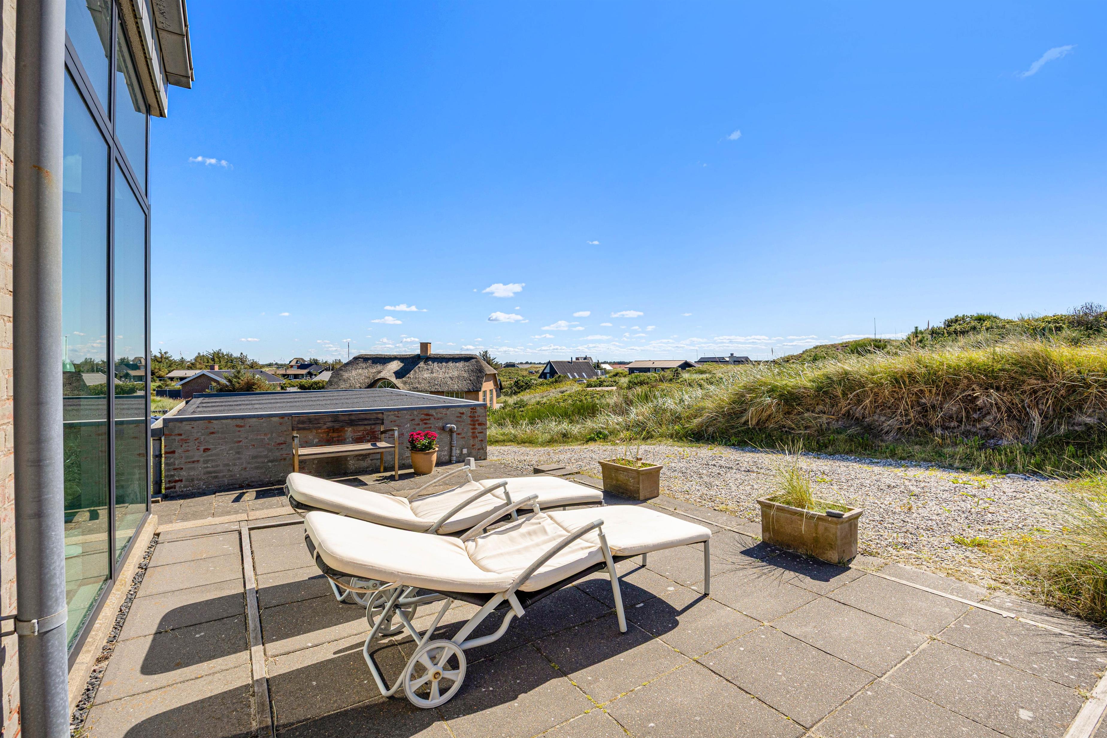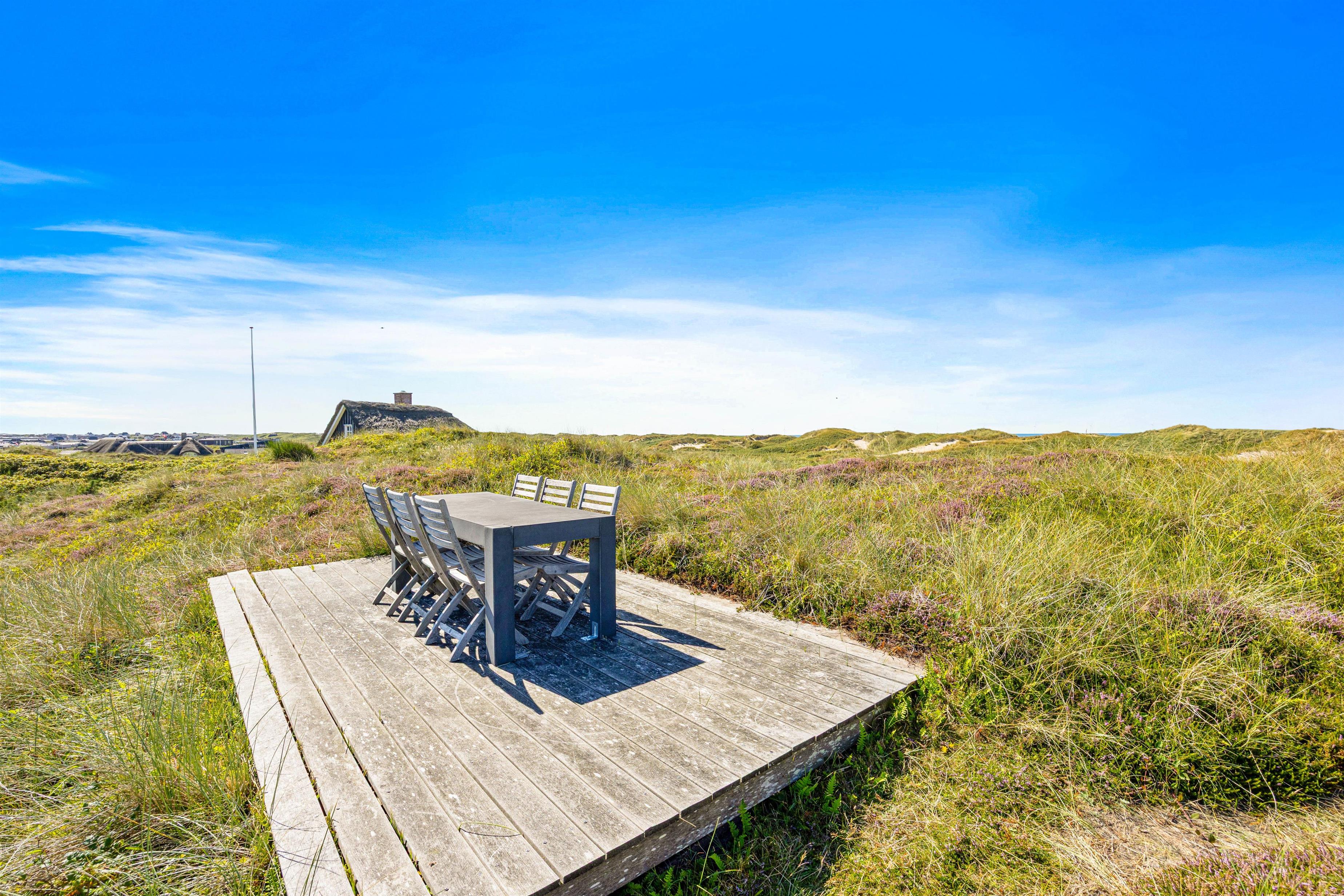 Vest for feriehuset finder du endnu en terrasse. Den ligger i det åbne klitlandskab og tilbyder dermed den smukkeste udsigt over klitterne og til Vesterhavet – helt ideel til de smukke solnedgange.