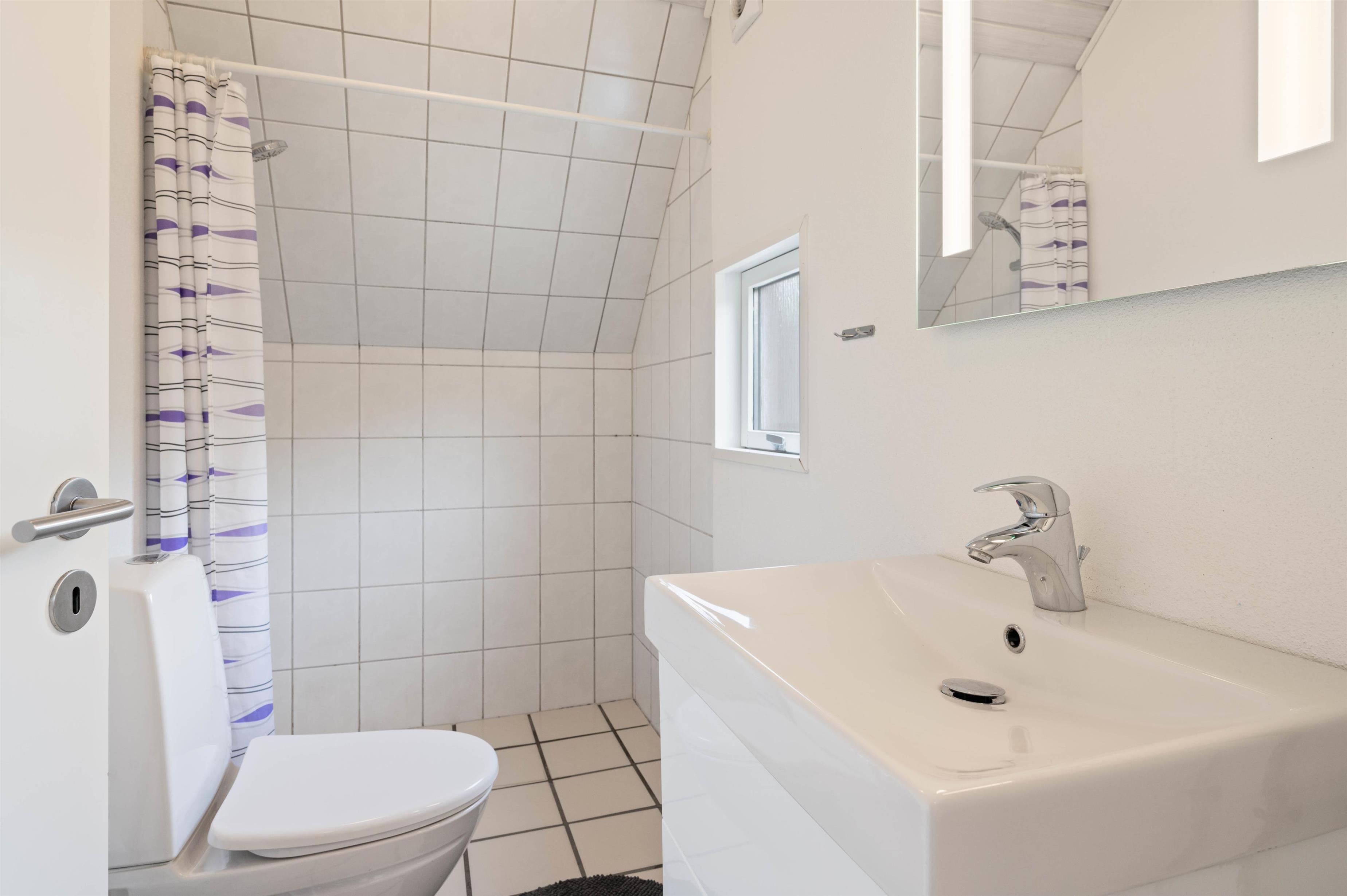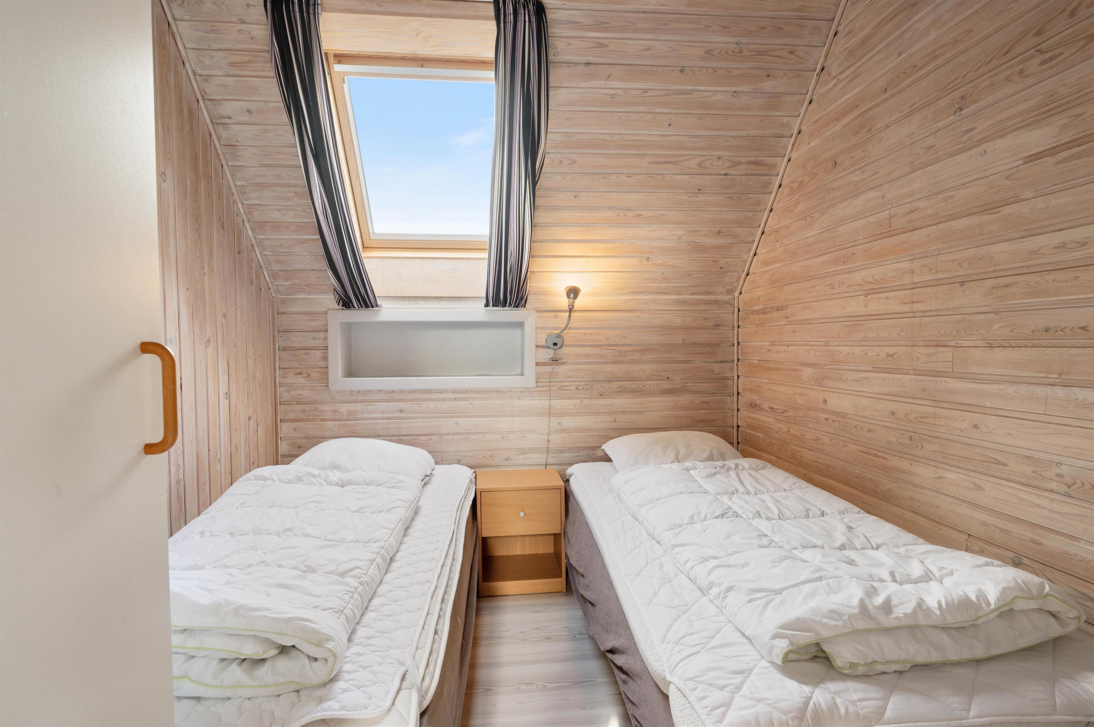Sommerhuset råder over 2 værelser, der begge er indrettet med hver 2 enkeltsenge. Ligesom resten af huset er disse værelser præget af de hyggelige panelvægge og lyse gulve, der er gennemgående i hele huset. Herudover er der et fint og funktionelt badeværelse med bruseniche og flisegulv.