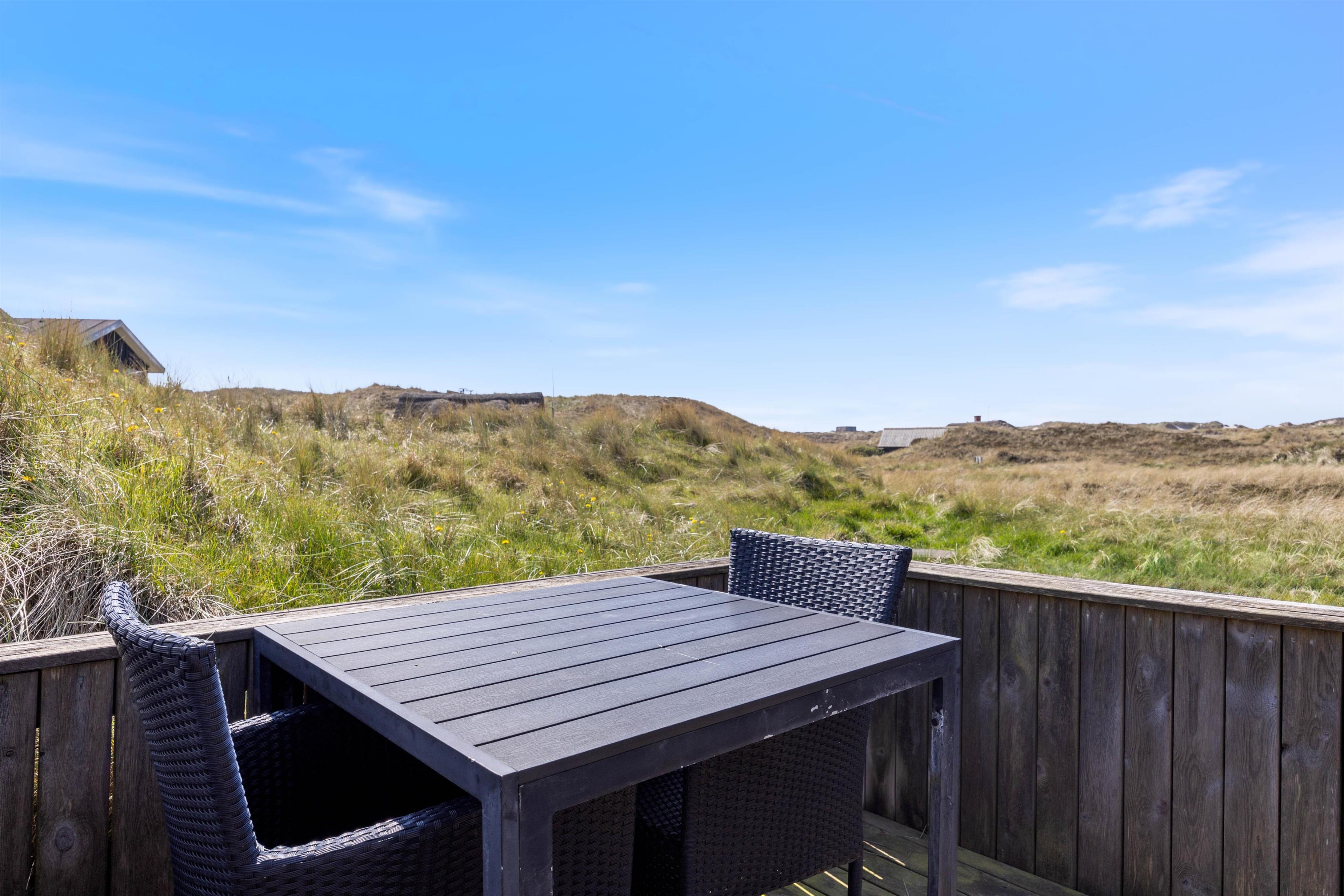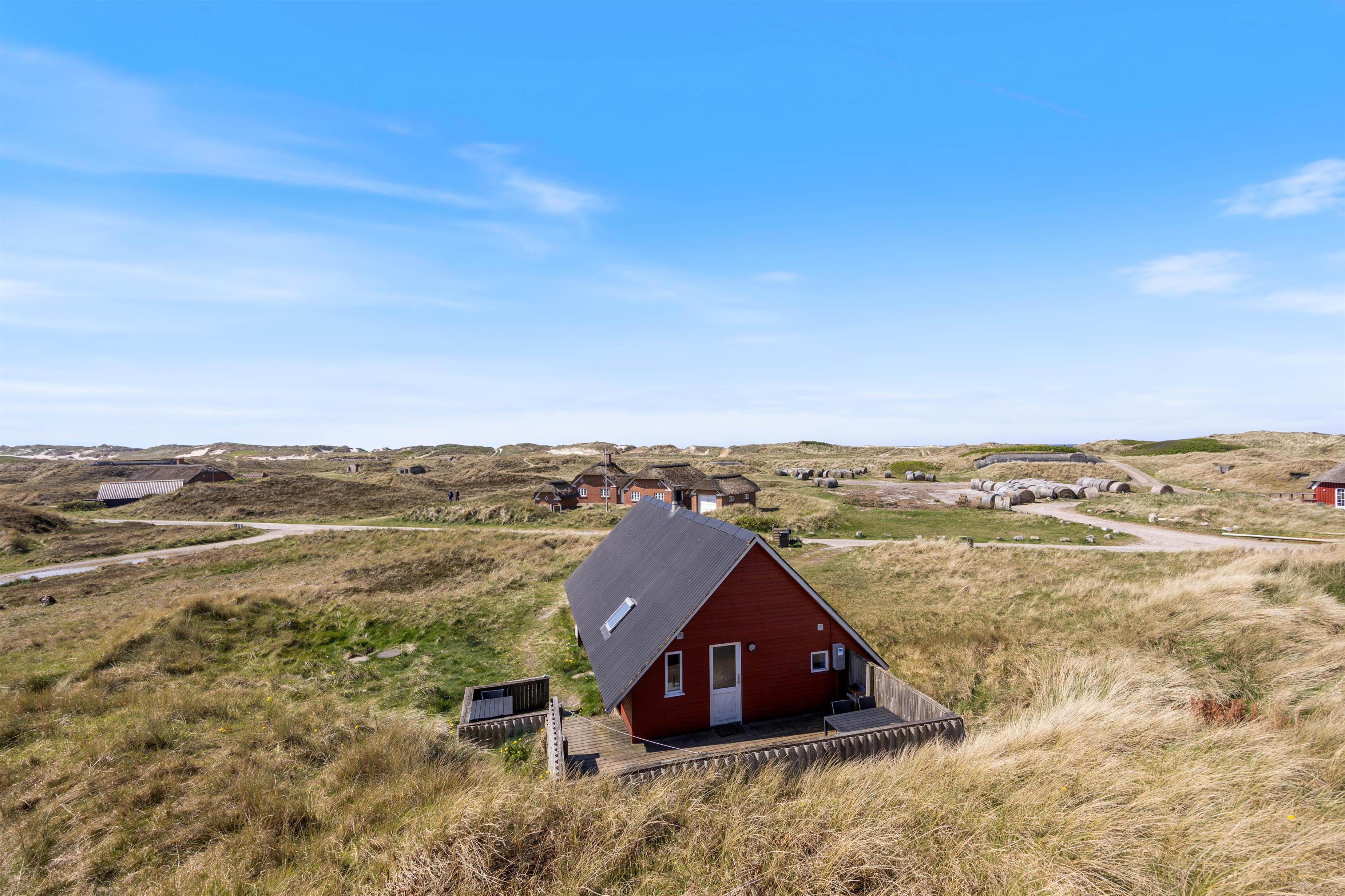 Det hyggelige, røde træsommerhus ligger som en lille, farvet bakketop i hedelandskabet på en ugeneret beliggenhed ud til første klitrække i Houvig. Huset har en hyggelig terrasse, der nærmest går i ét med det omkringliggende landskab af græsser og marehalm.