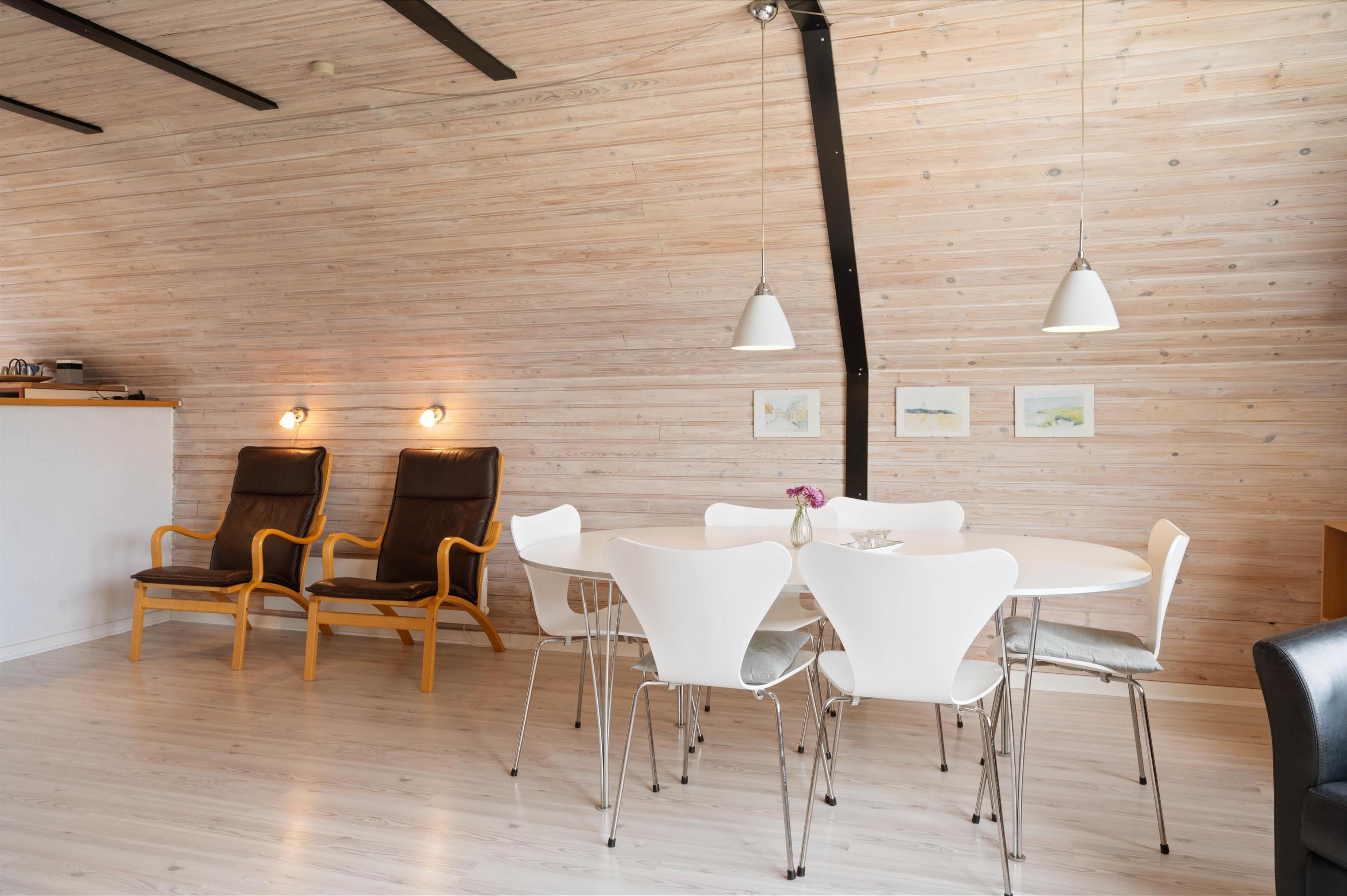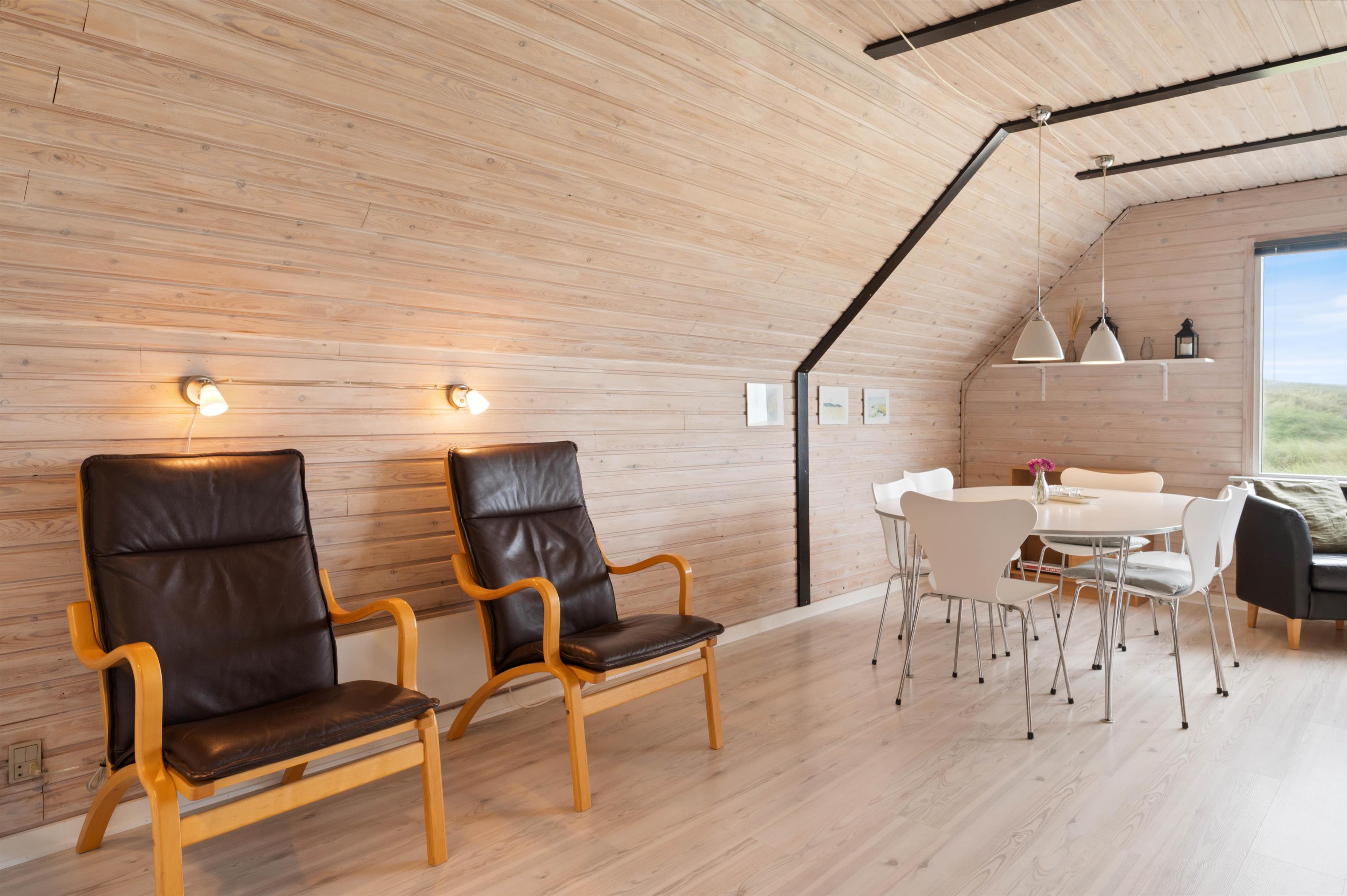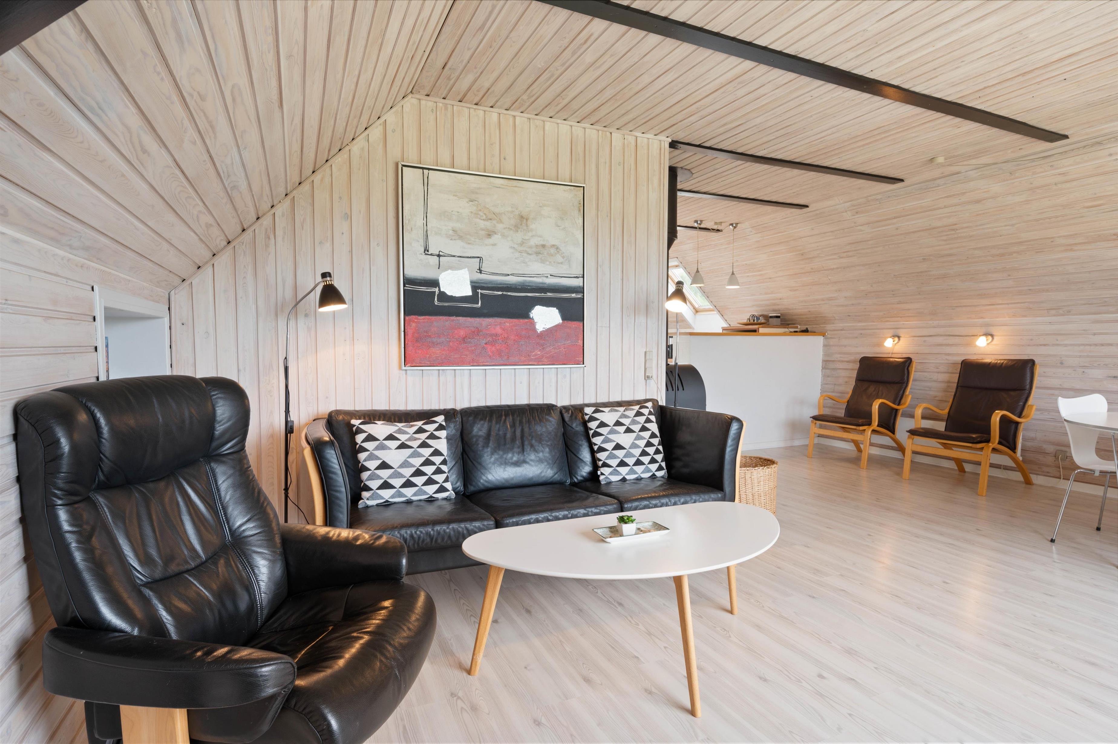 Sommerhusets hjerte er uden tvivl det skønne opholdsrum, hvor køkken, spisekrog og stue smelter sammen. I stueafdelingen kan I virkelig slappe af. Den er nemlig indrettet med gode og komfortable møbler, TV, radio, DVD og CD-afspiller. Fra pladsen i sofaen kan I betragte den smukke udsigt ud gennem vinduerne, eller I kan rykke over til de to siddepladser foran brændeovnen og nyde dens behagelige varme og beroligende knitren. Sommerhuset er også udstyret med en Luft-til-Luft varmepumpe, der sikrer en god og billig opvarmning af huset.