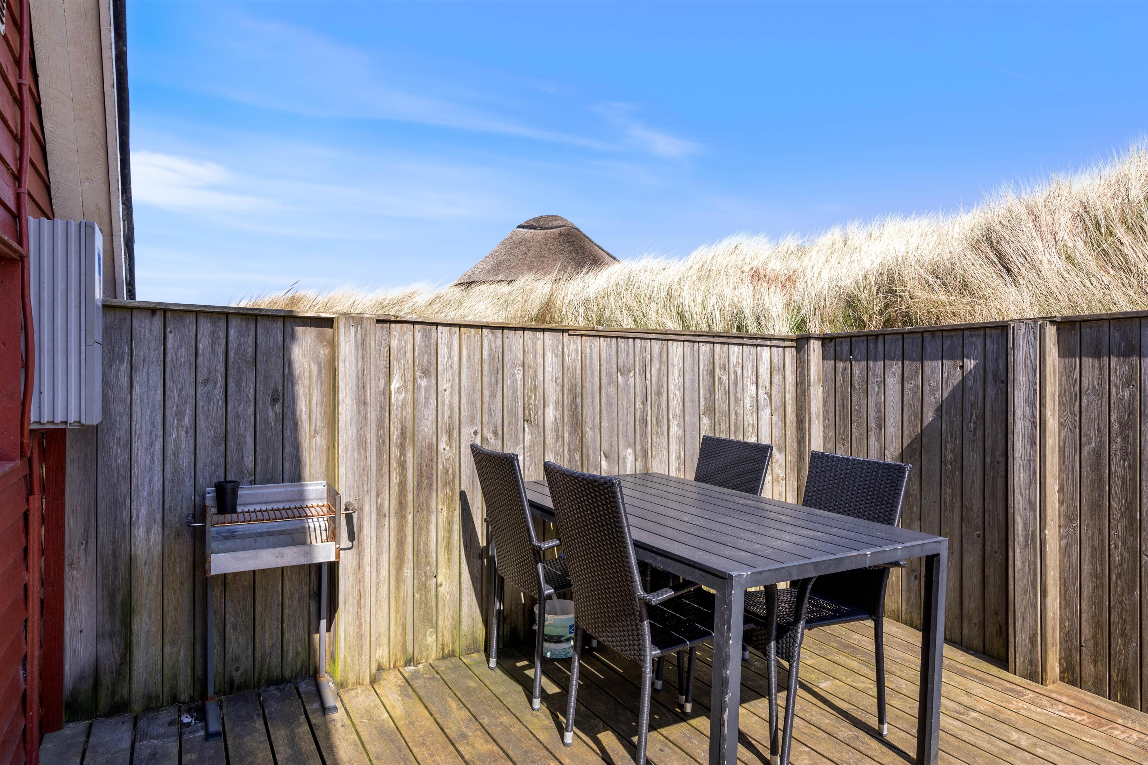 På terrassen kan I virkelig nyde feriedagene med solbadning og hygge. Og her er selvfølgelig både havemøbler og grill til rådighed, så I kan tilberede jeres bøffer over kullene.