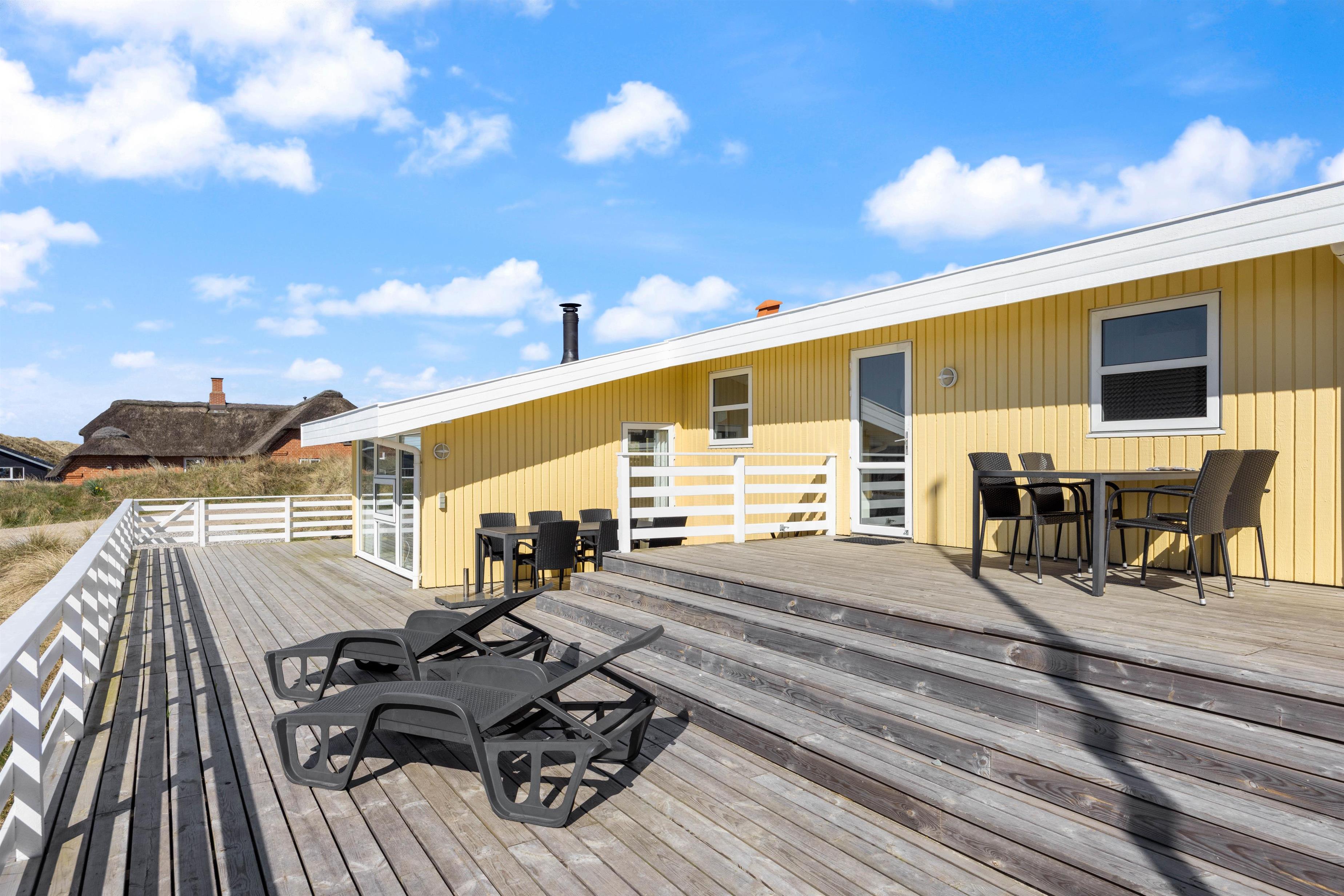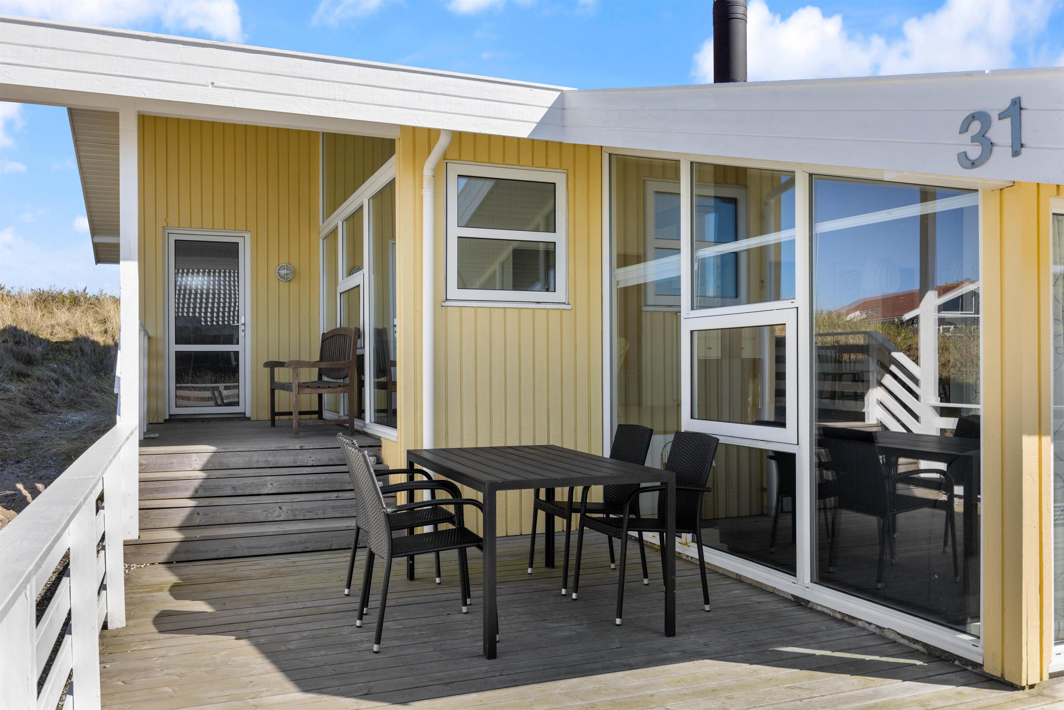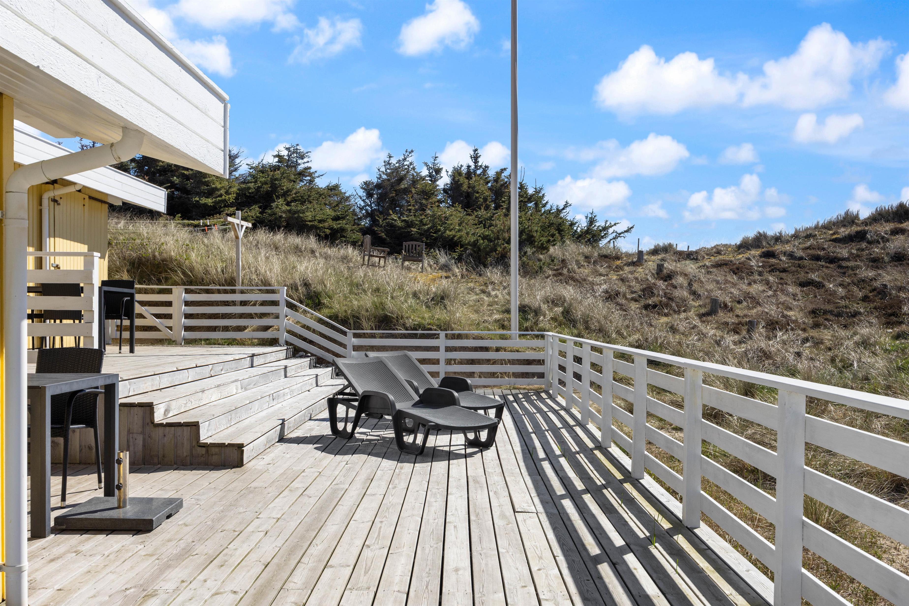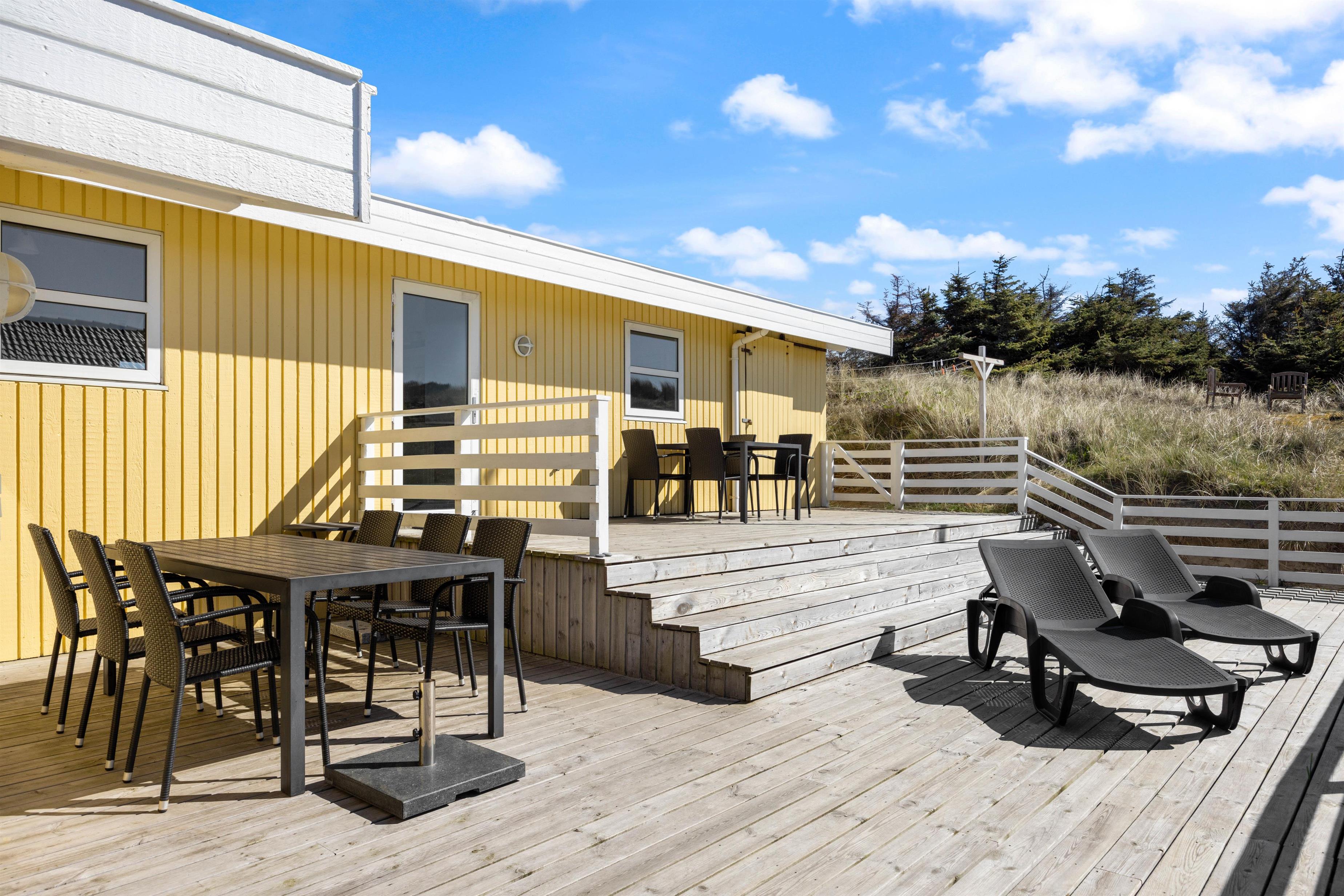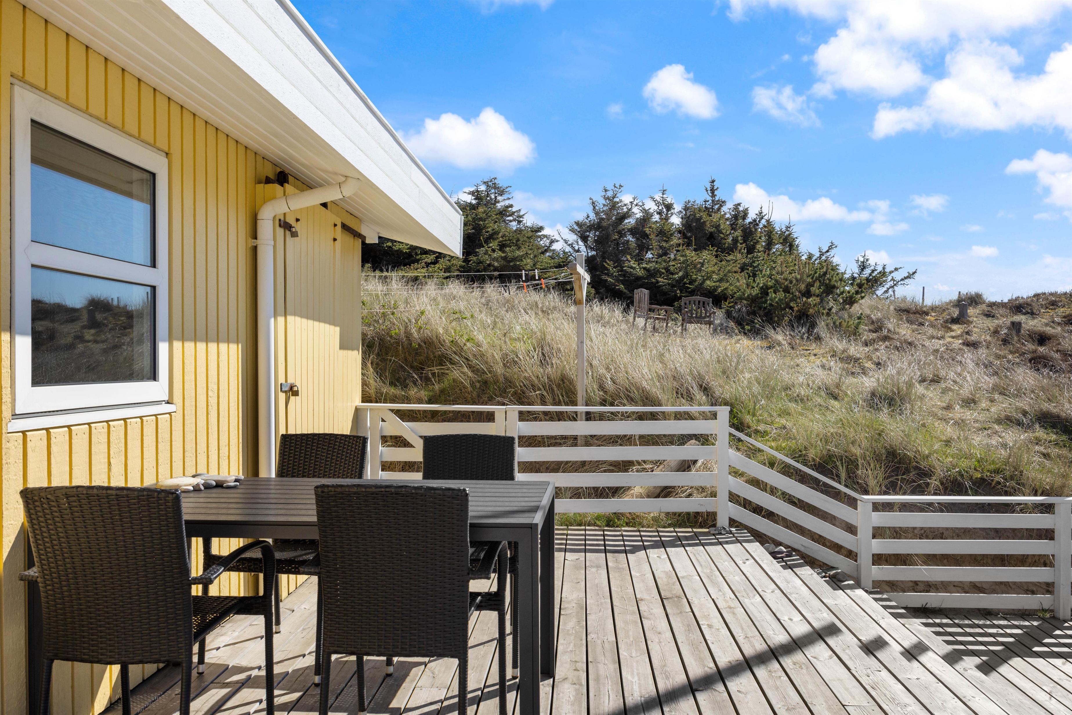 Noget af det skønneste ved et ophold i sommerhuset er den korte afstand til havet og de brede strande. Faktisk kræver det ikke mere en 5-10 minutter på gåben for at nå vandet, der ligger 450 meter fra adressen. Når I ikke tilbringer dagene ved vandet, kan I slappe af på terrassen på den dejlige naturgrund, hvor der er havemøbler, grill og stangtennis til rådighed.