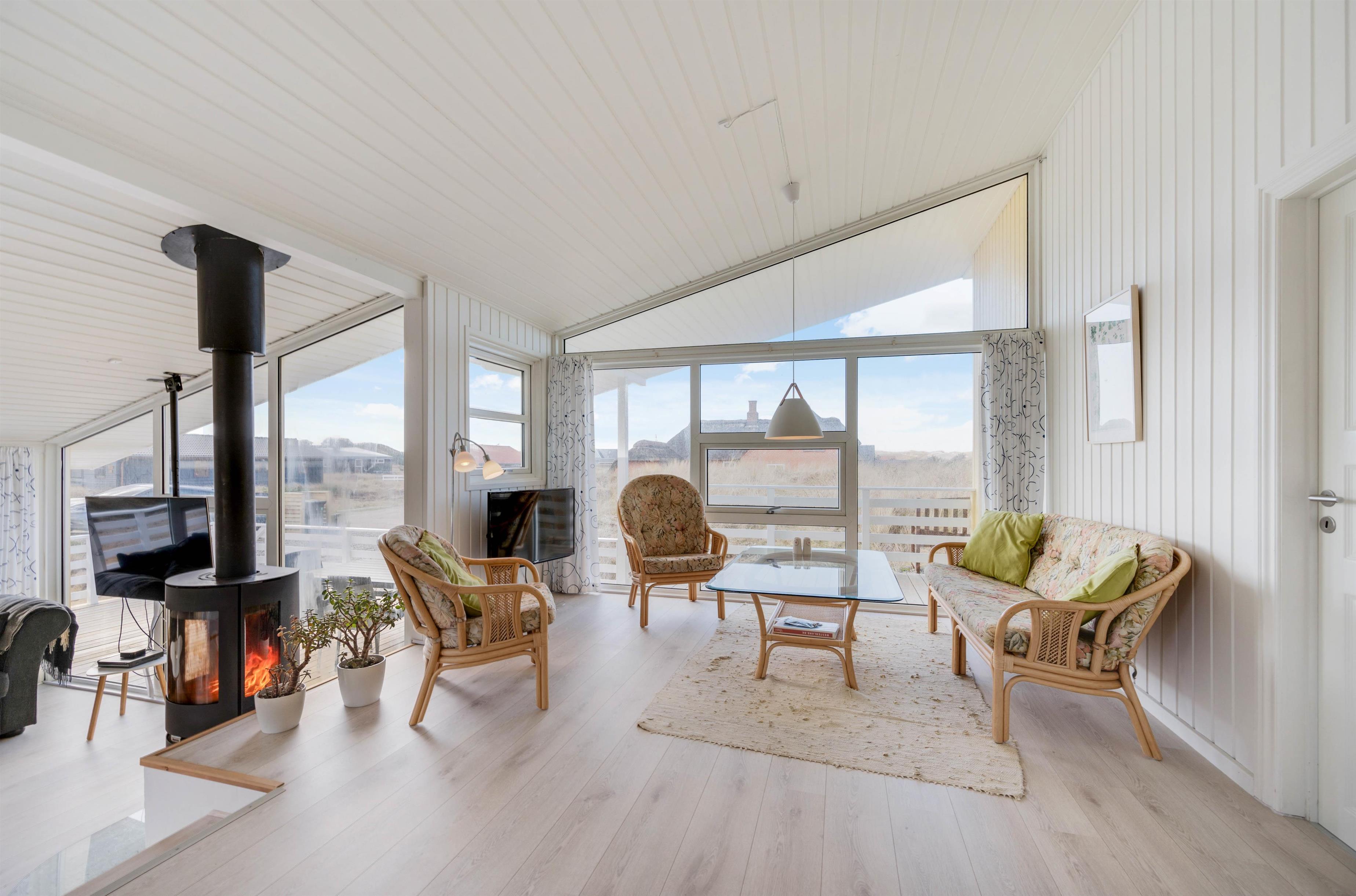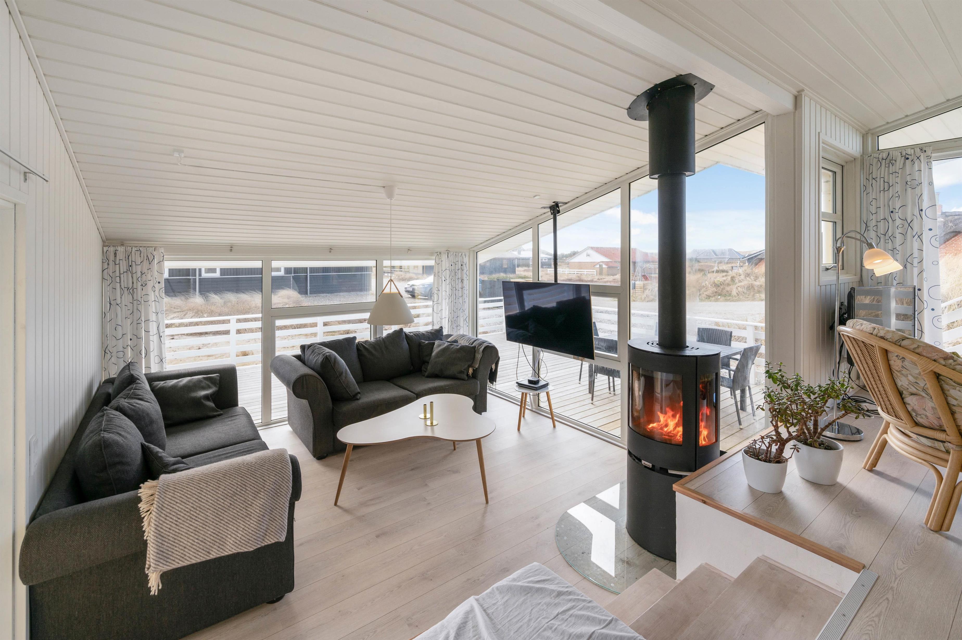 I stuen er der rig mulighed for både afslapning og aktivitet. Her er anbragt en stor fladskærm med mulighed for at tilknytte medbragte spillekonsoller eller chromecast. Det er også her, brændeovnen er placeret, og hvorfra den spreder en behagelig varme og afslappende atmosfære.