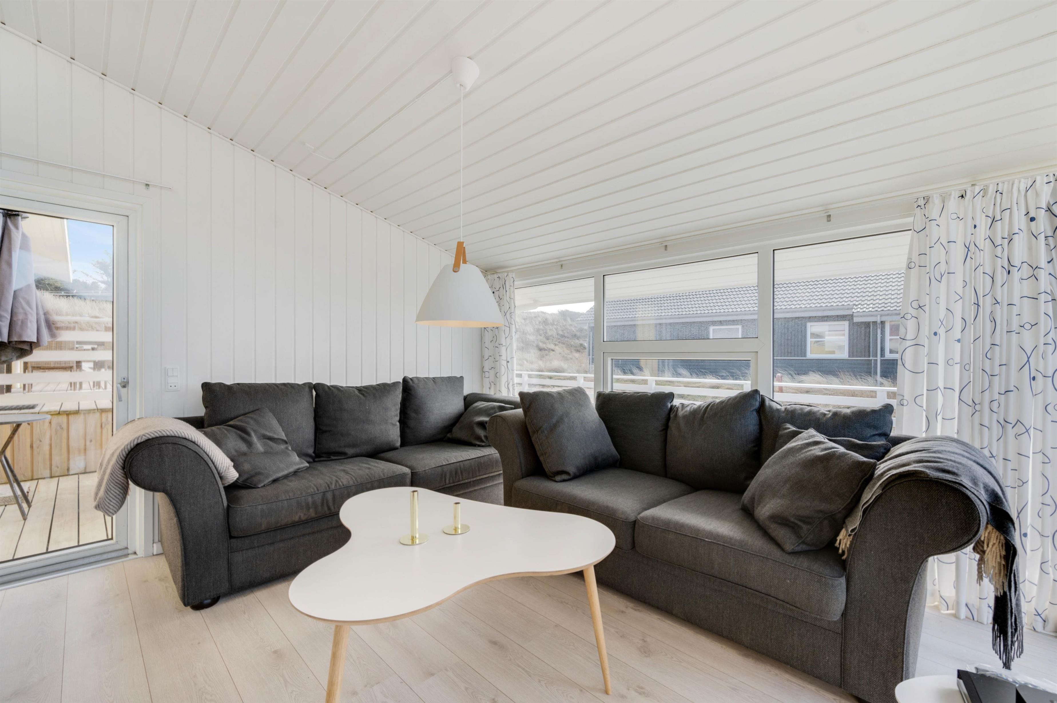 Loftet er åbent til kip, og sammen med de store vinduespartier i stuen sørger de for at bade opholdsrummene i et skønt lysindfald. Det bidrager til rummeligheden, så de 120 kvadratmeter virker endnu større. Men det er ikke vinduernes eneste formål: De sikrer også et flot udsyn til udsigten udenfor.
