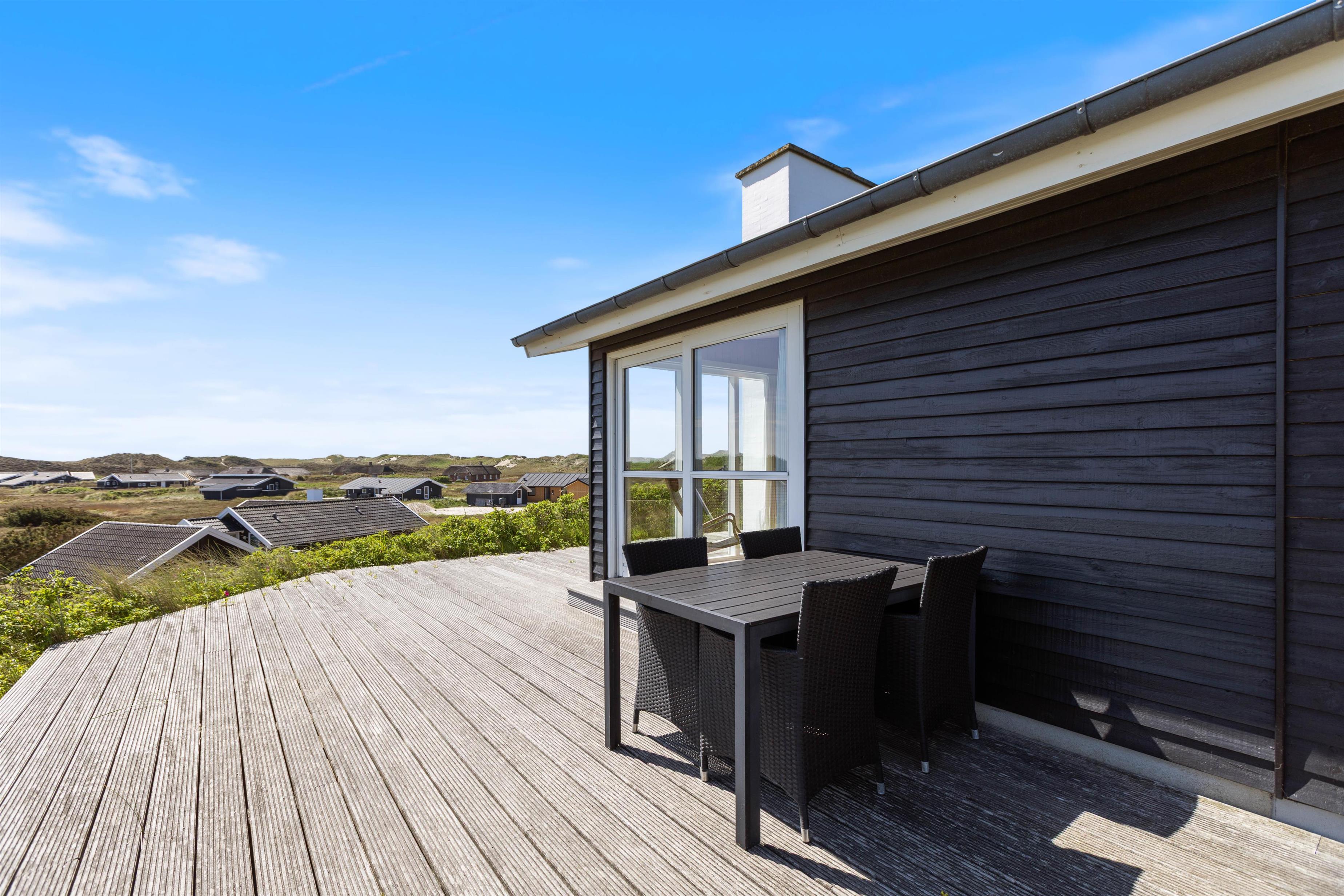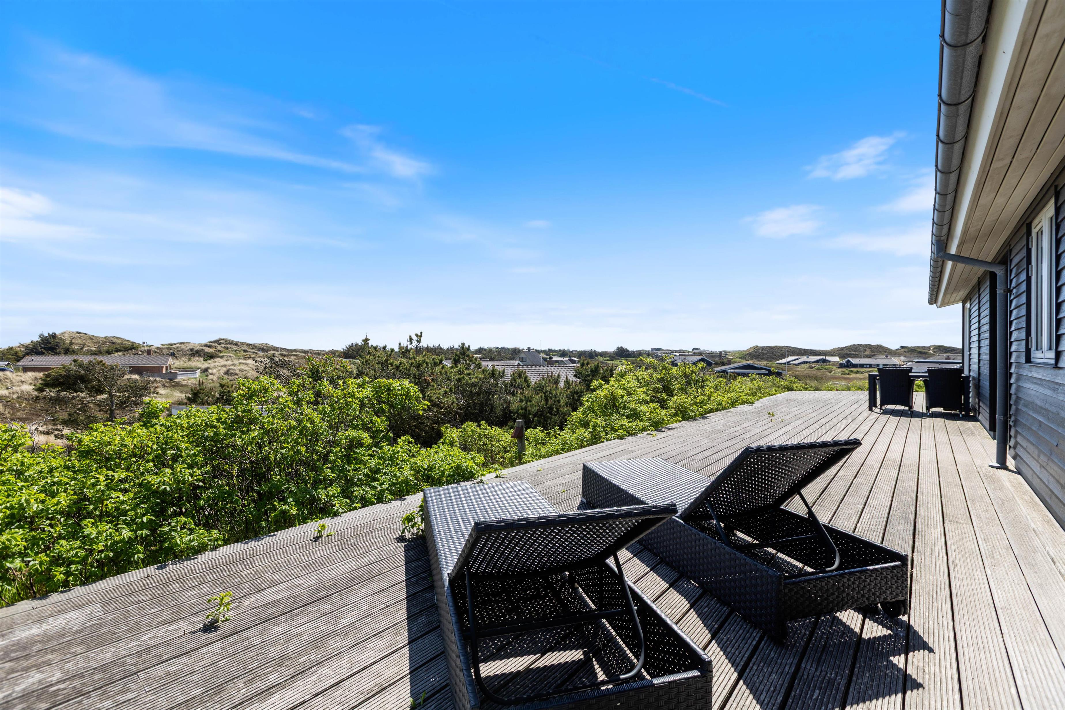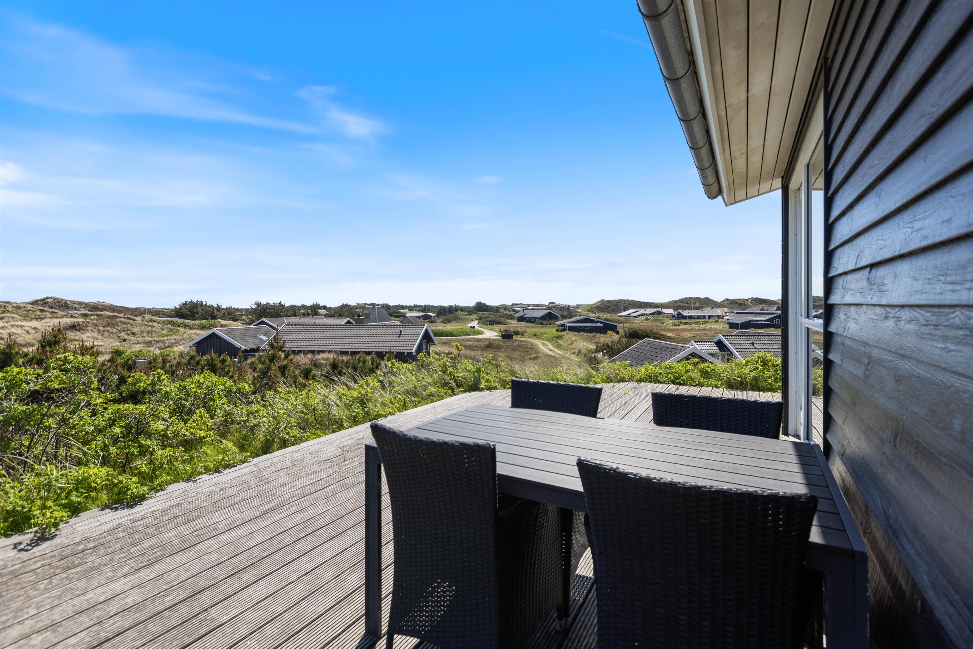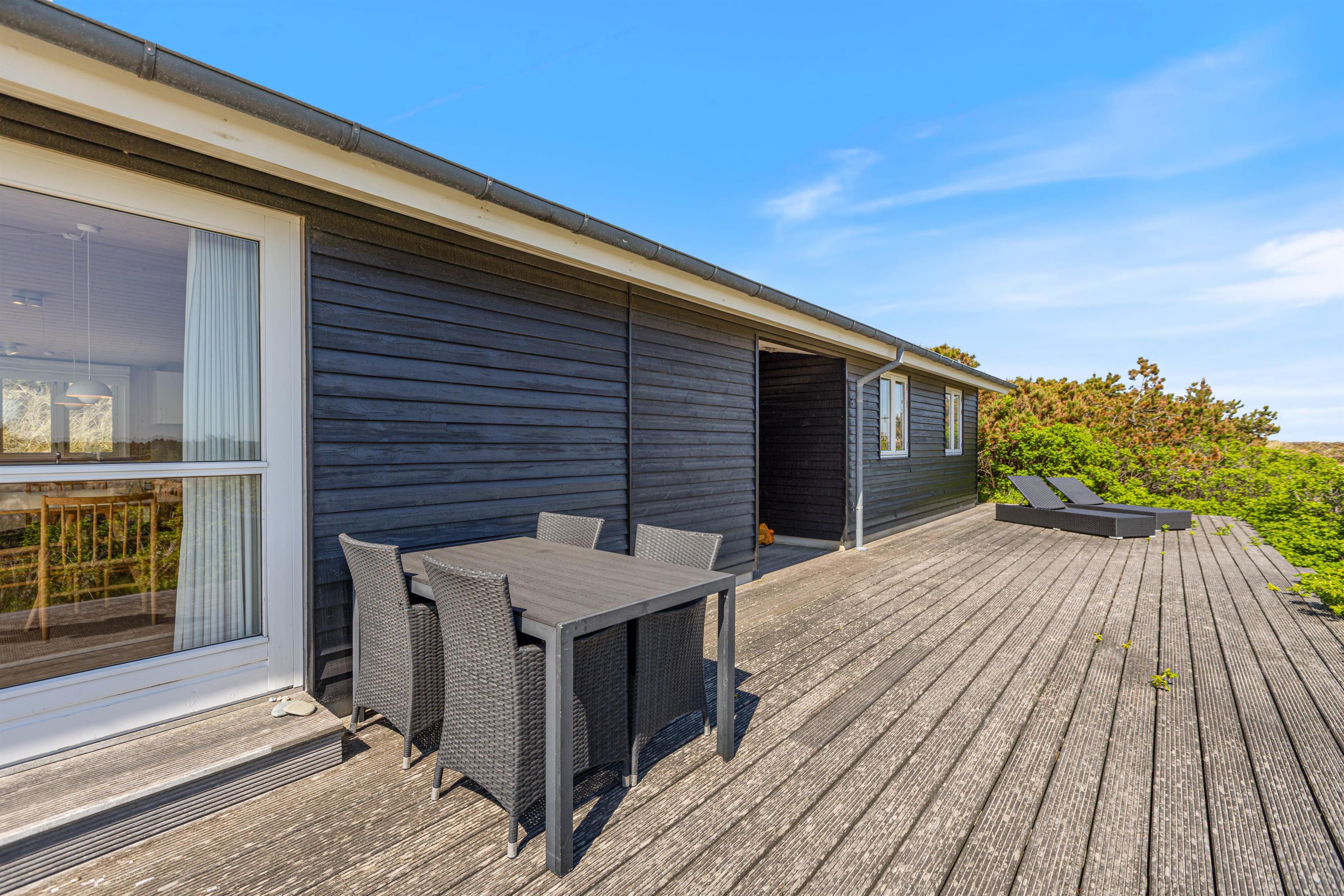 Sommerhusets skønne træterrasse spænder sig rundt om to sider af huset. Her finder I ikke kun havemøbler, liggestole og en grill, men også afskærmede hjørner, hvor I kan sidde og hygge jer i læ. Grundet husets hævede placering i klitten, kan I nyde panoramablikket over klitlandskabet og glemme alt om hverdagens stress og jag. Fra sommerhuset har I kun 300 meter til det vilde vesterhav, som altid er et besæg værd, uanset om det er på en kold februardag, eller på en dejlig varm sommerdag i august.