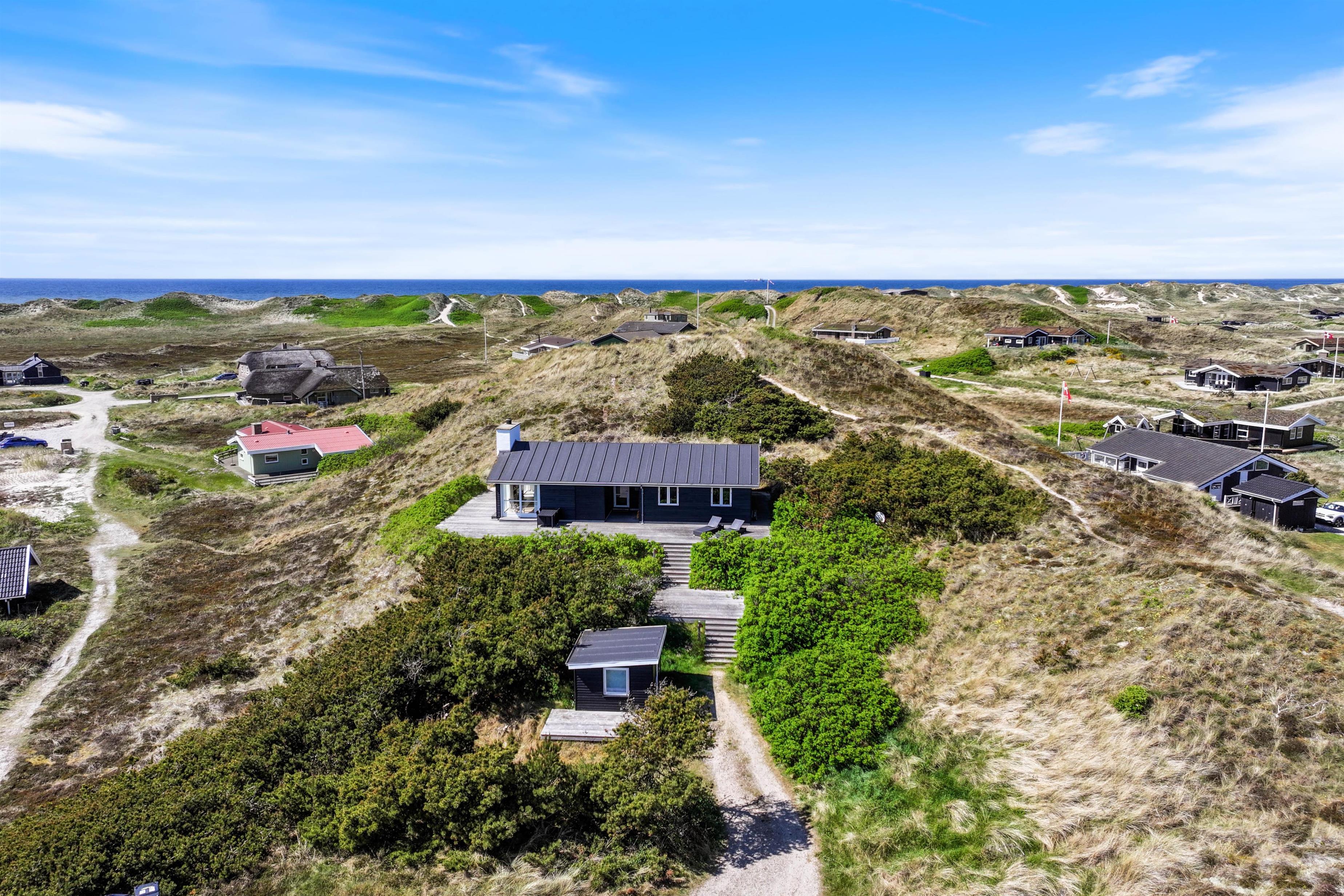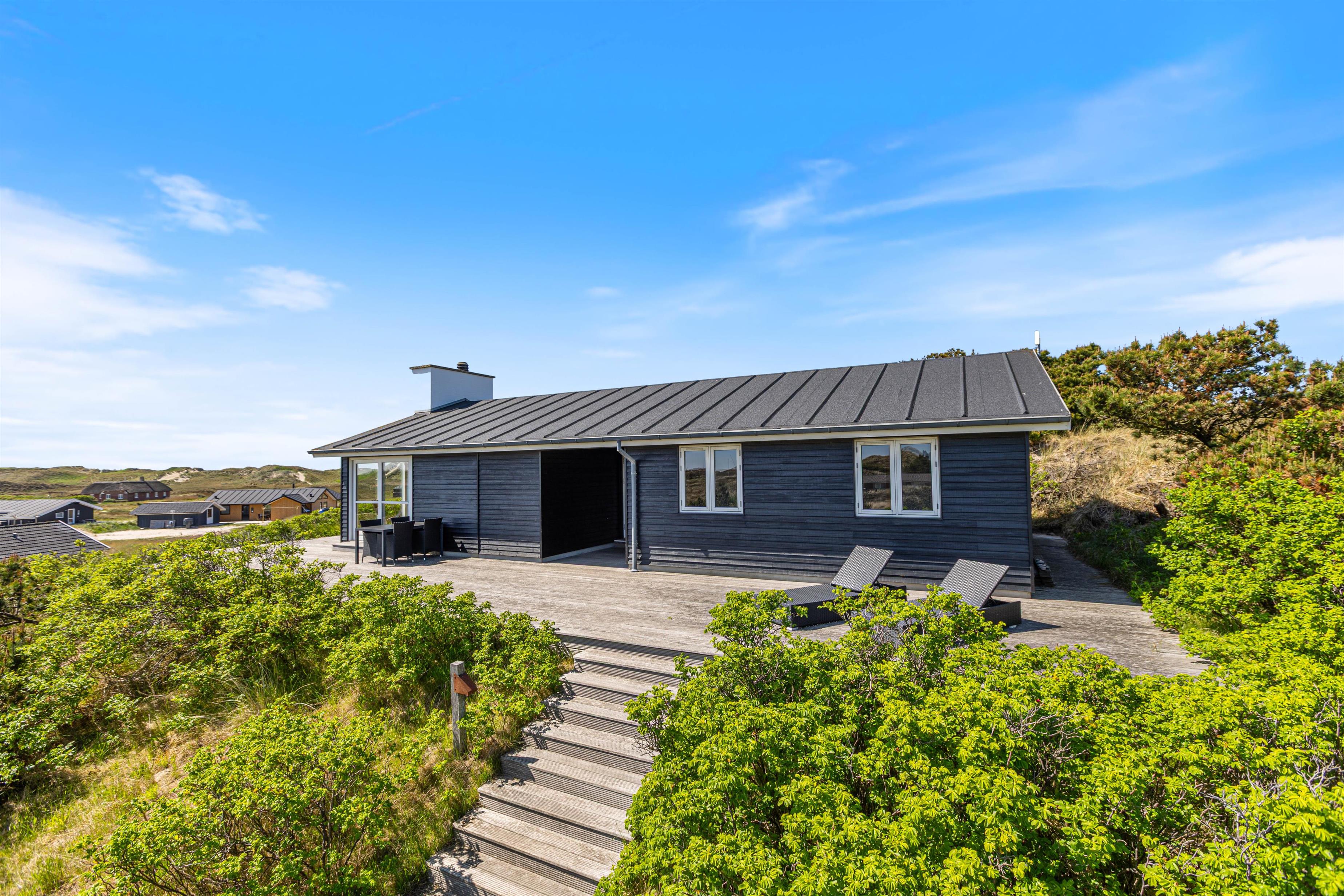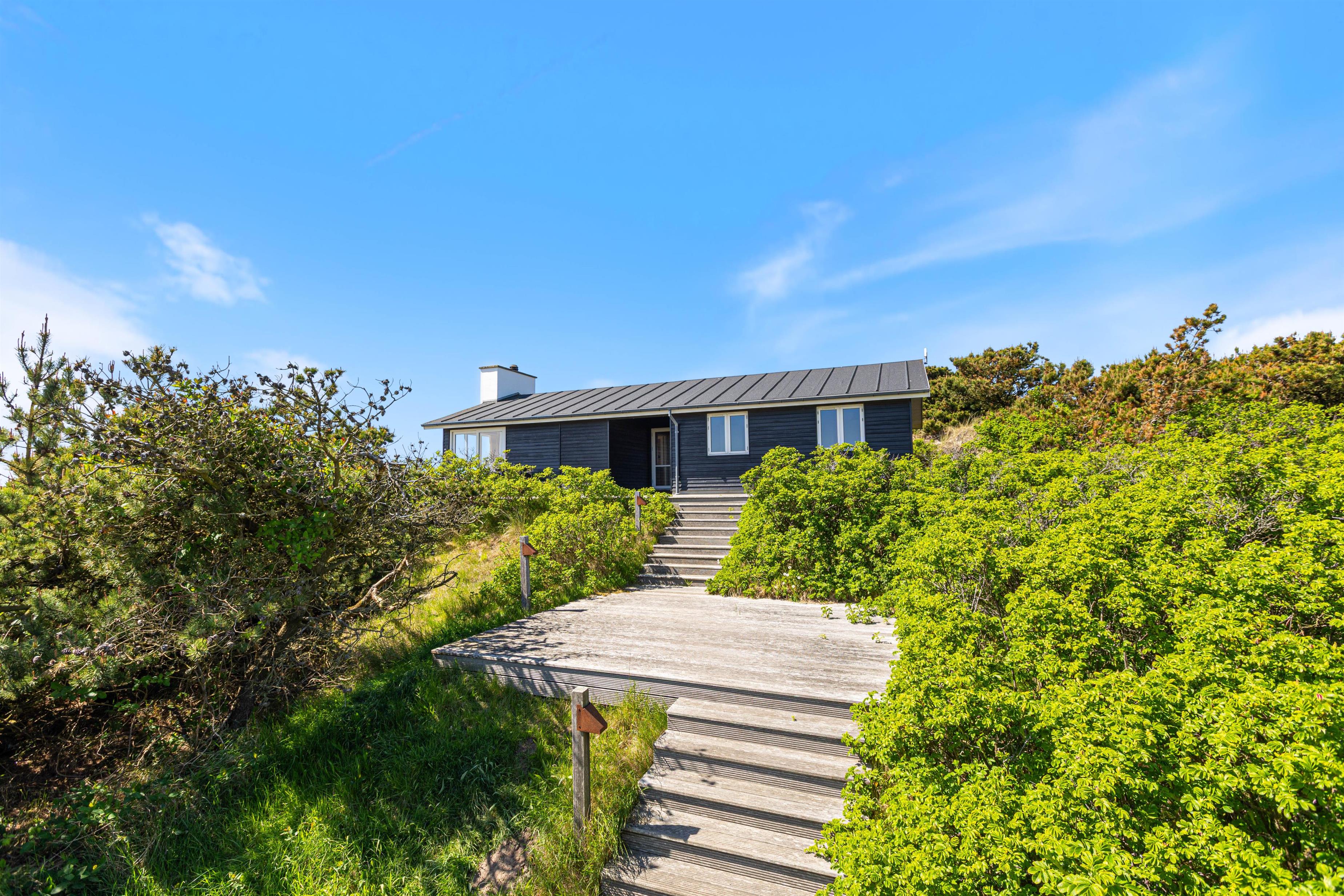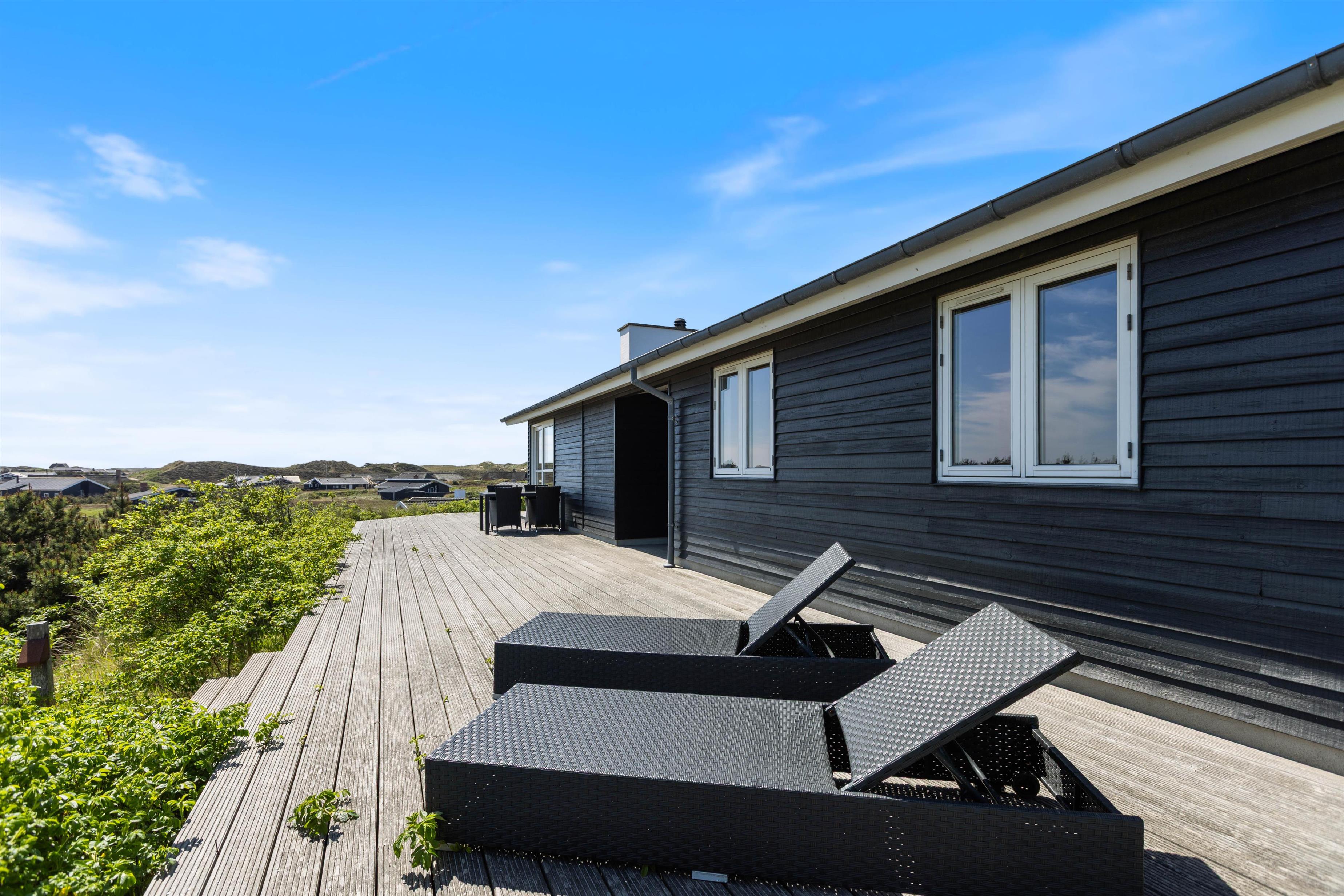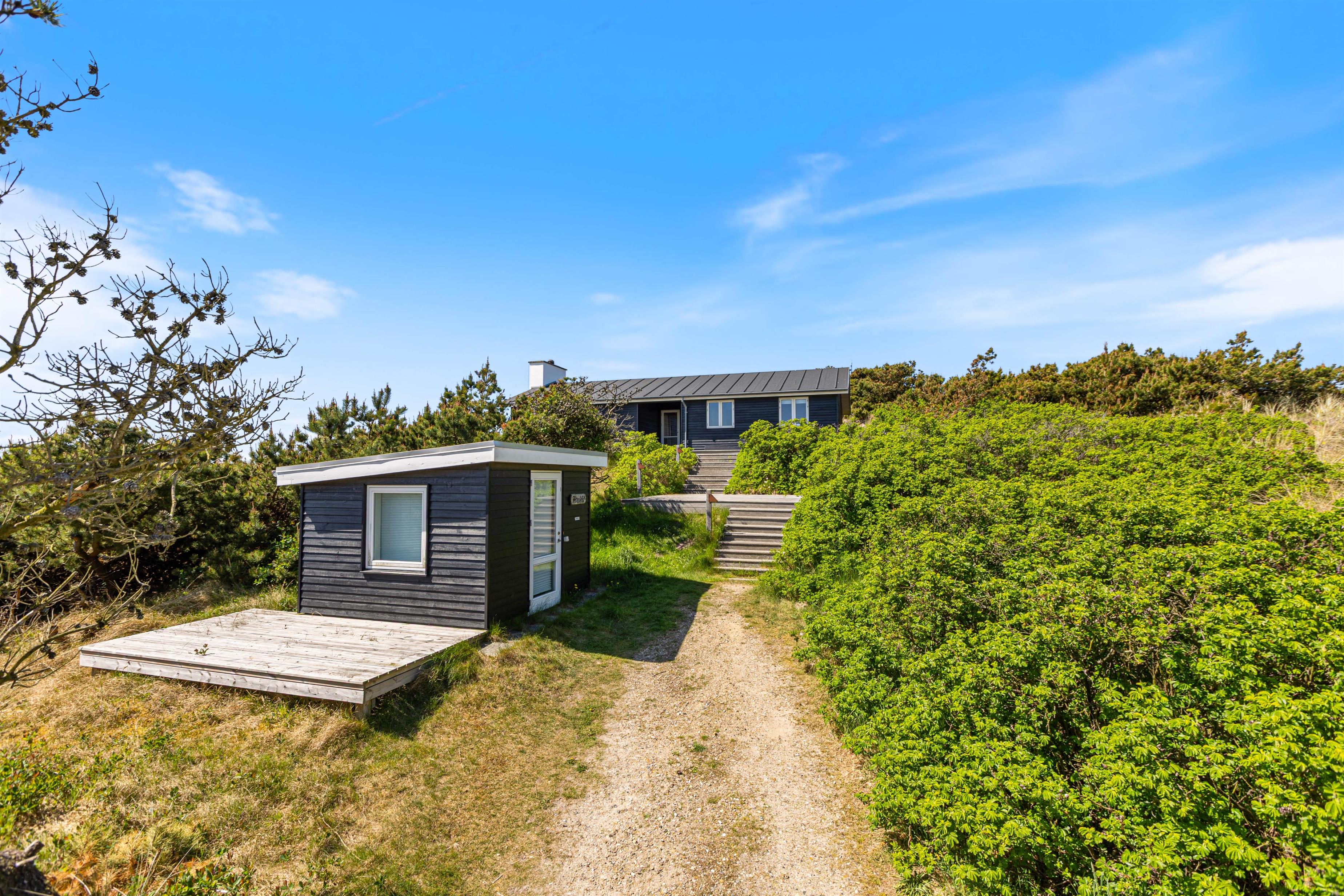 Sommerhusets skønne træterrasse spænder sig rundt om to sider af huset. Her finder I ikke kun havemøbler, liggestole og en grill, men også afskærmede hjørner, hvor I kan sidde og hygge jer i læ. Grundet husets hævede placering i klitten, kan I nyde panoramablikket over klitlandskabet og glemme alt om hverdagens stress og jag. Fra sommerhuset har I kun 300 meter til det vilde vesterhav, som altid er et besæg værd, uanset om det er på en kold februardag, eller på en dejlig varm sommerdag i august.