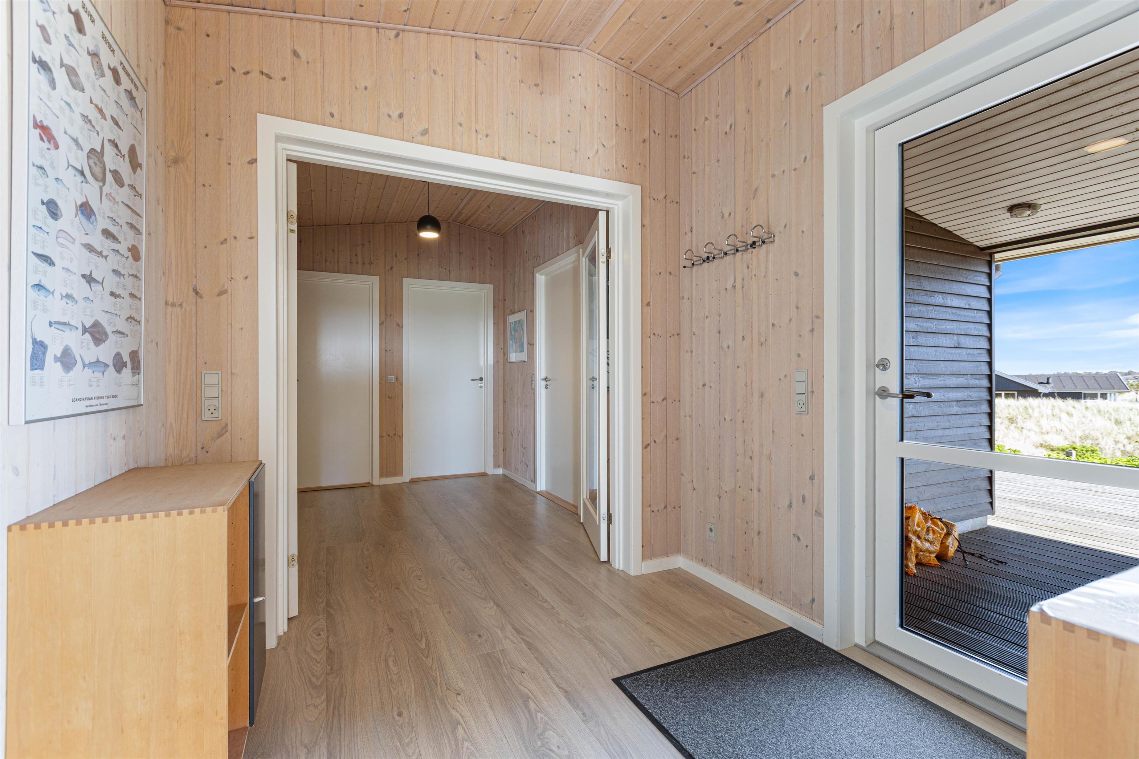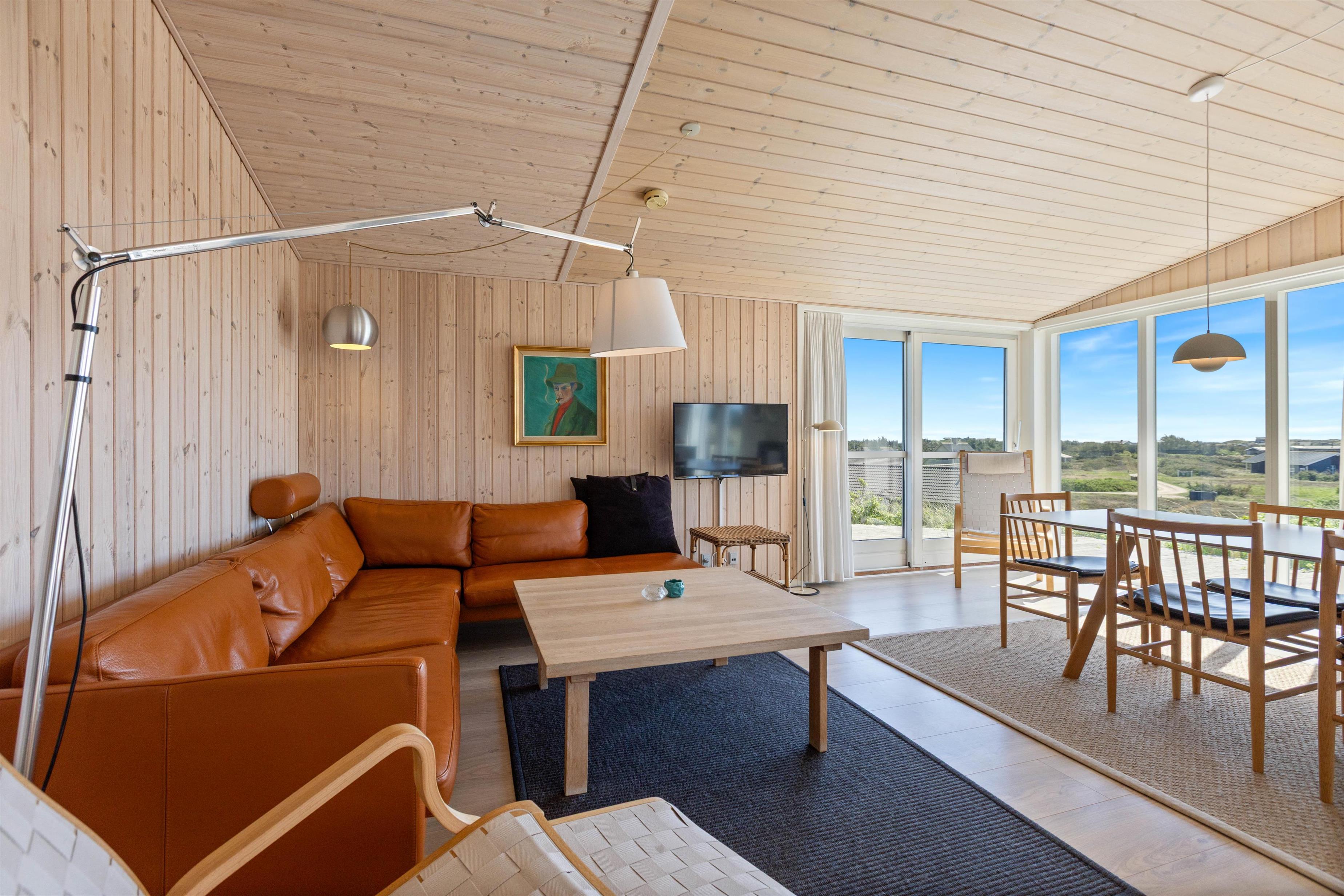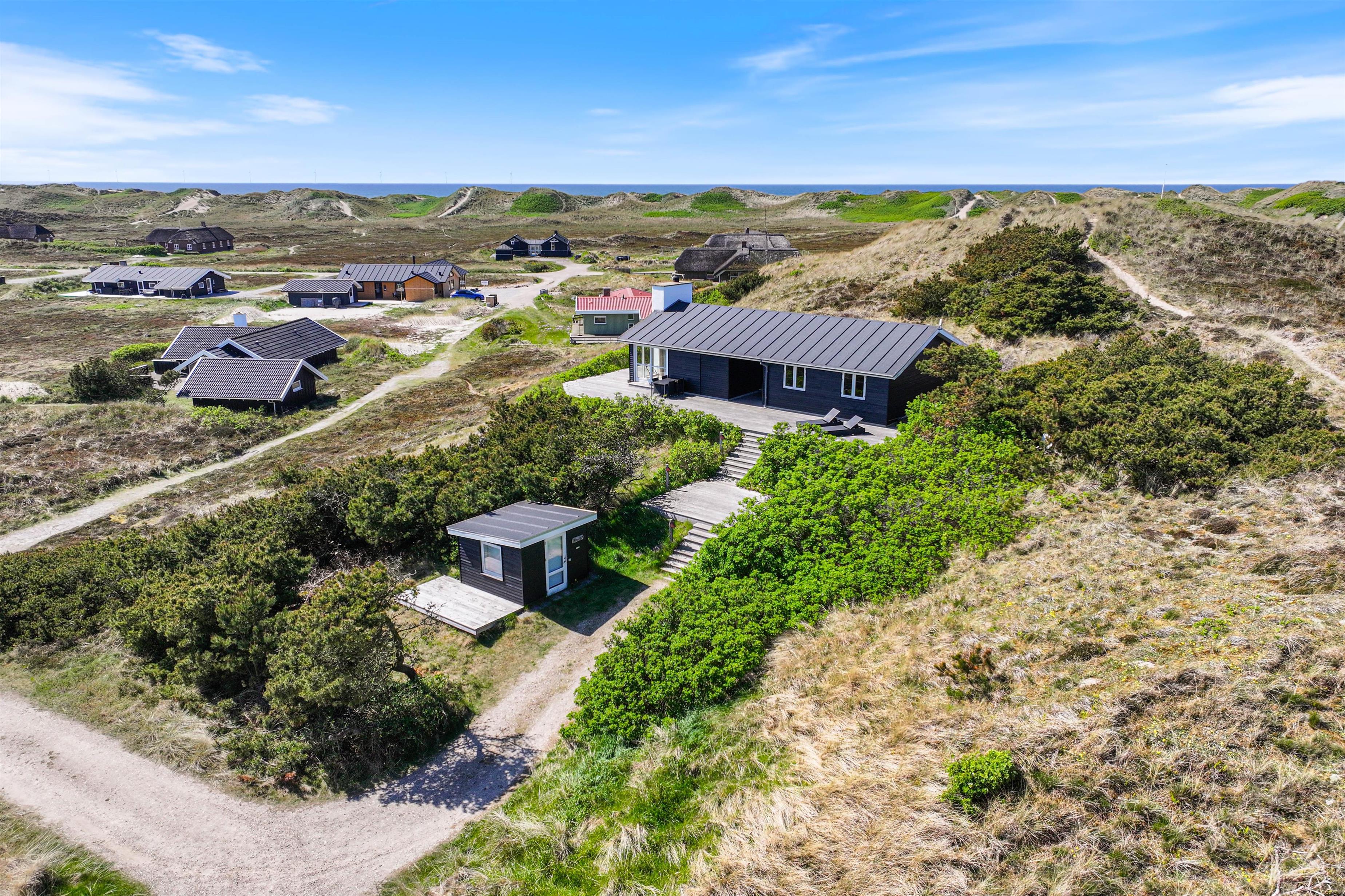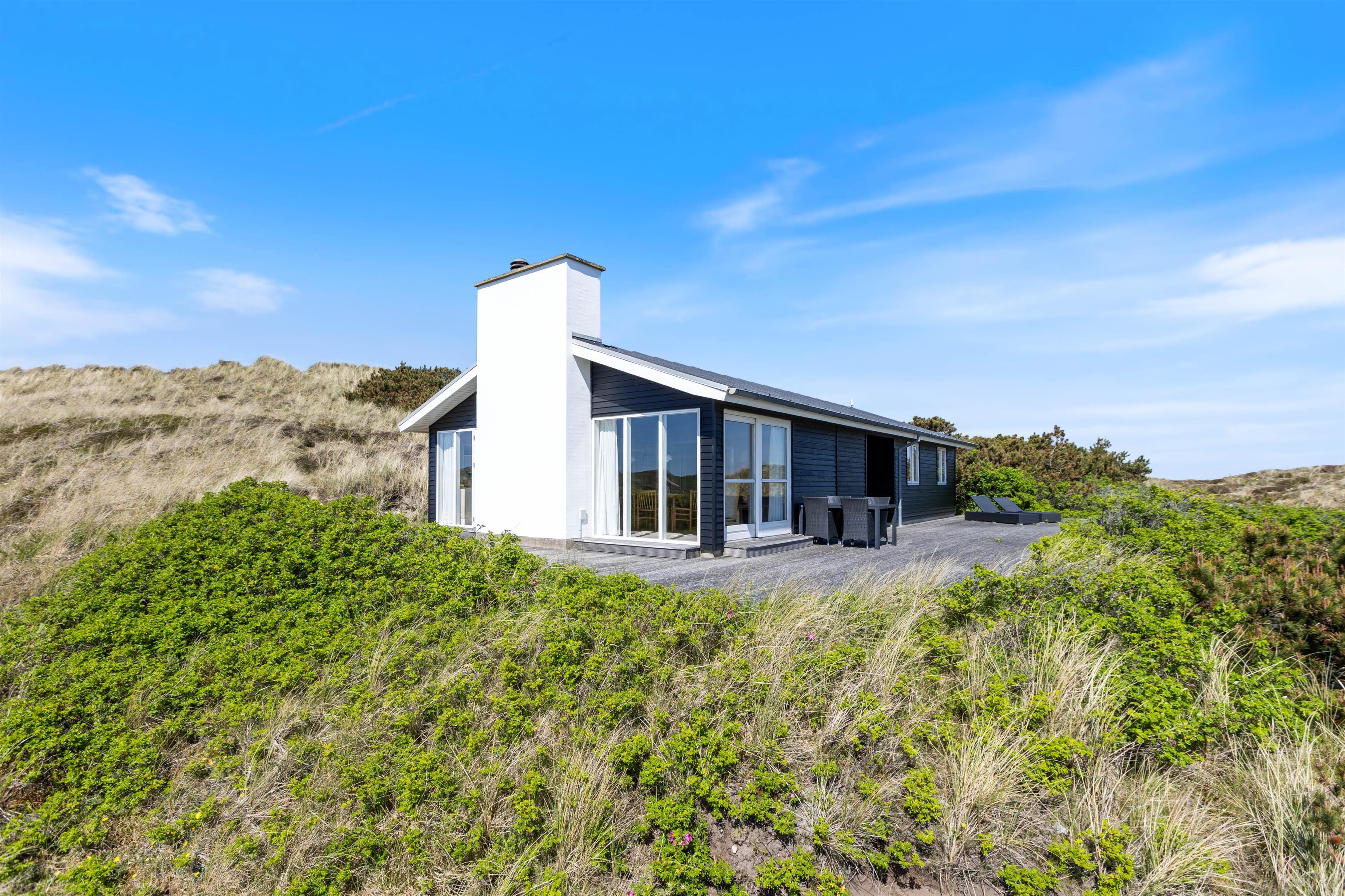 Sommerhusets skønne træterrasse spænder sig rundt om to sider af huset. Her finder I ikke kun havemøbler, liggestole og en grill, men også afskærmede hjørner, hvor I kan sidde og hygge jer i læ. Grundet husets hævede placering i klitten, kan I nyde panoramablikket over klitlandskabet og glemme alt om hverdagens stress og jag. Fra sommerhuset har I kun 300 meter til det vilde vesterhav, som altid er et besæg værd, uanset om det er på en kold februardag, eller på en dejlig varm sommerdag i august.