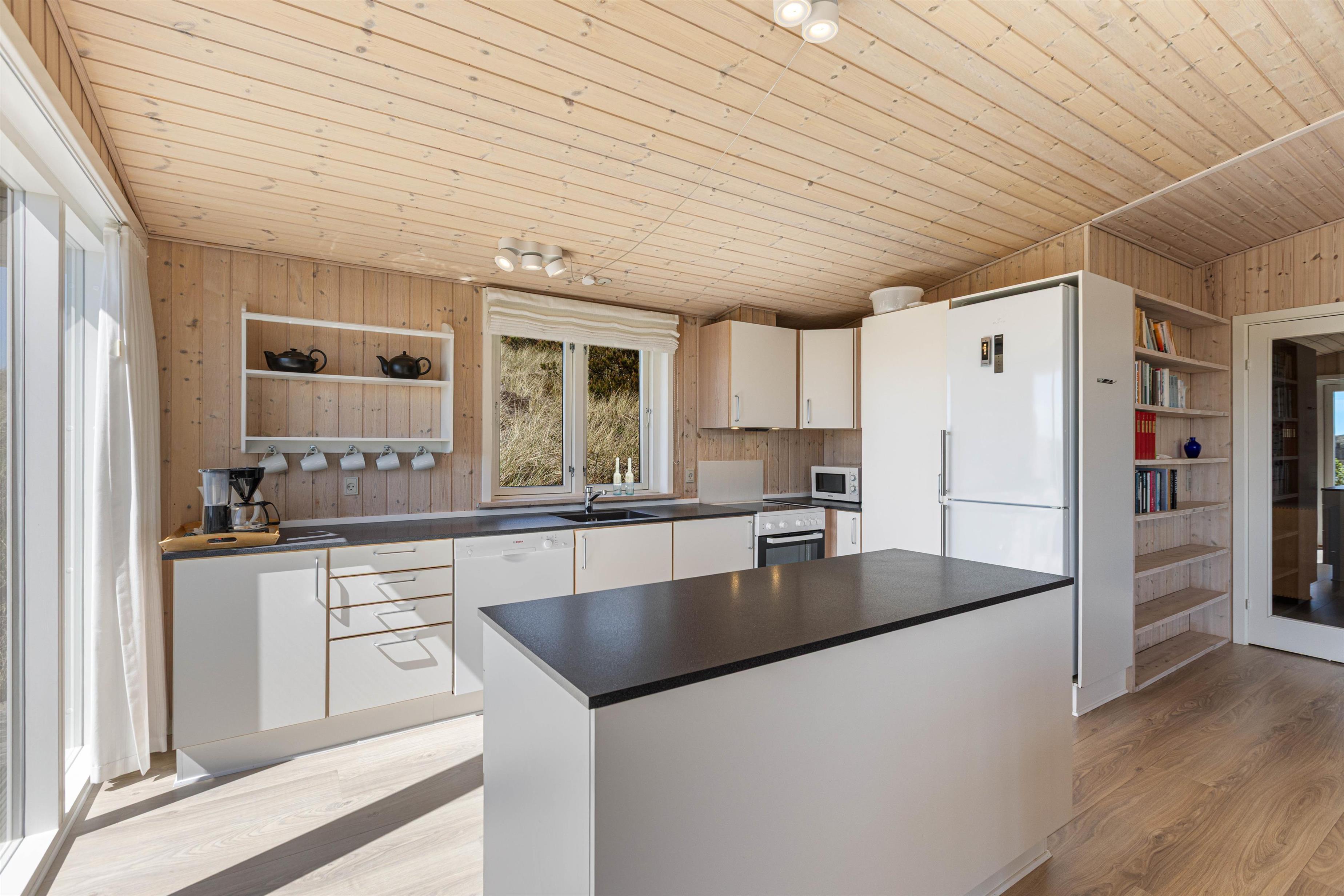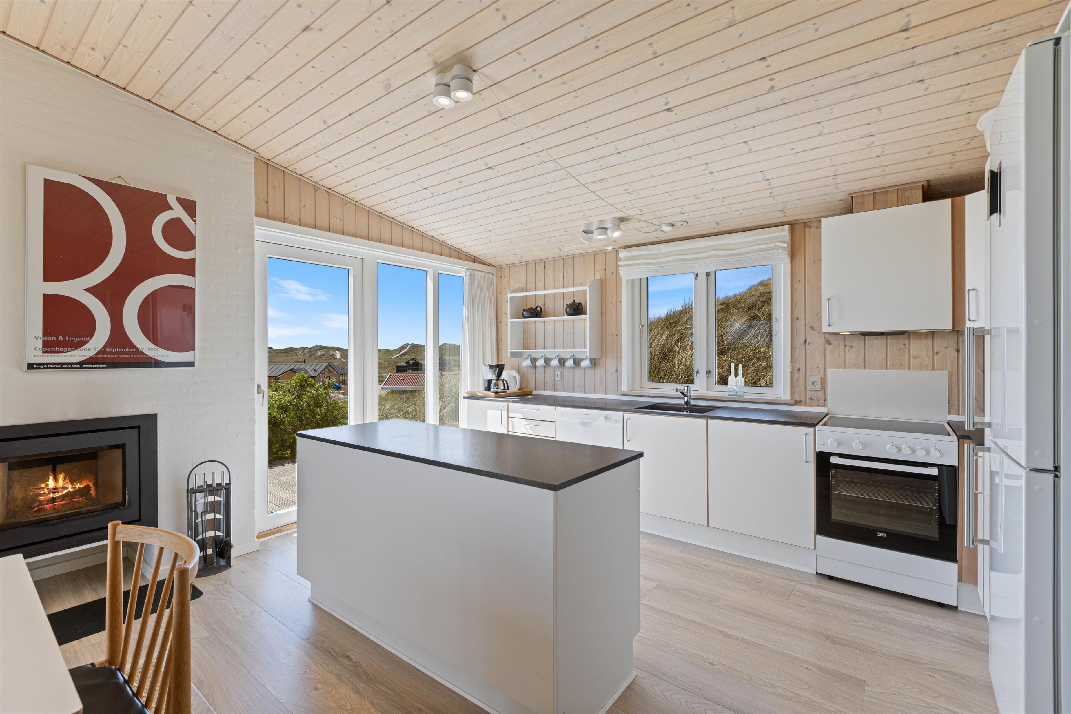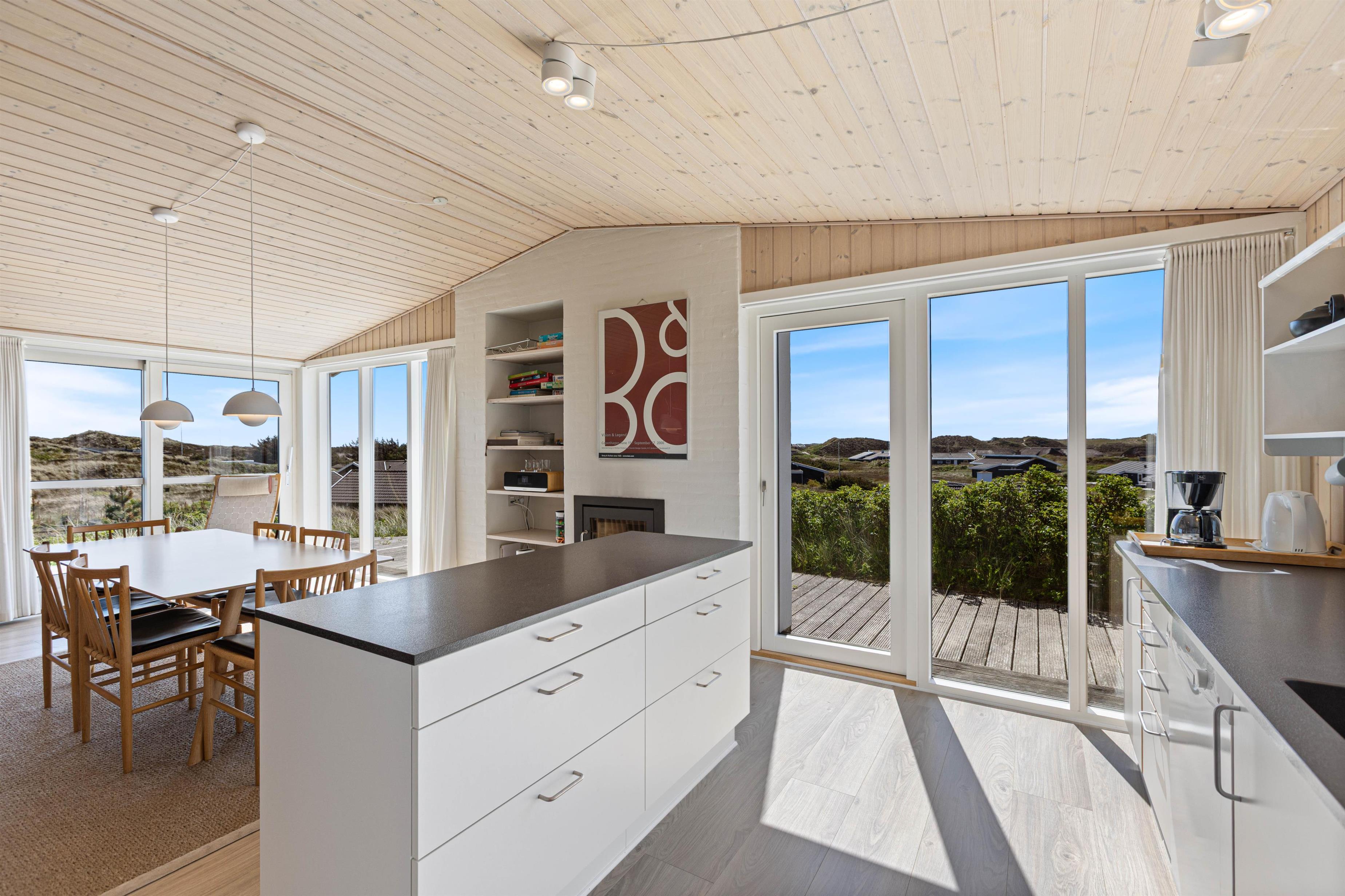 Sommerhuset er i 2020 blevet moderniseret. Det er smagfuldt indrettet med øje for detaljer. Den store opholdsstue huser ikke kun en behagelig sofa og lænestol, men også et stort spisebord, en pejs og det integrerede, åbne køkken. Køkkenet er veludstyret og har naturligvis en opvaskemaskine, som gør hverdagen i sommerhuset lige dét lettere. Sommerhuset fremstår lyst og pænt, og har et fint køkkenalrum, hvor der er god plads til masser af godt samvær med familien. De store flotte vinduespartier sørger både for et godt lysindfald og ikke mindst en dejlig udsigt.
