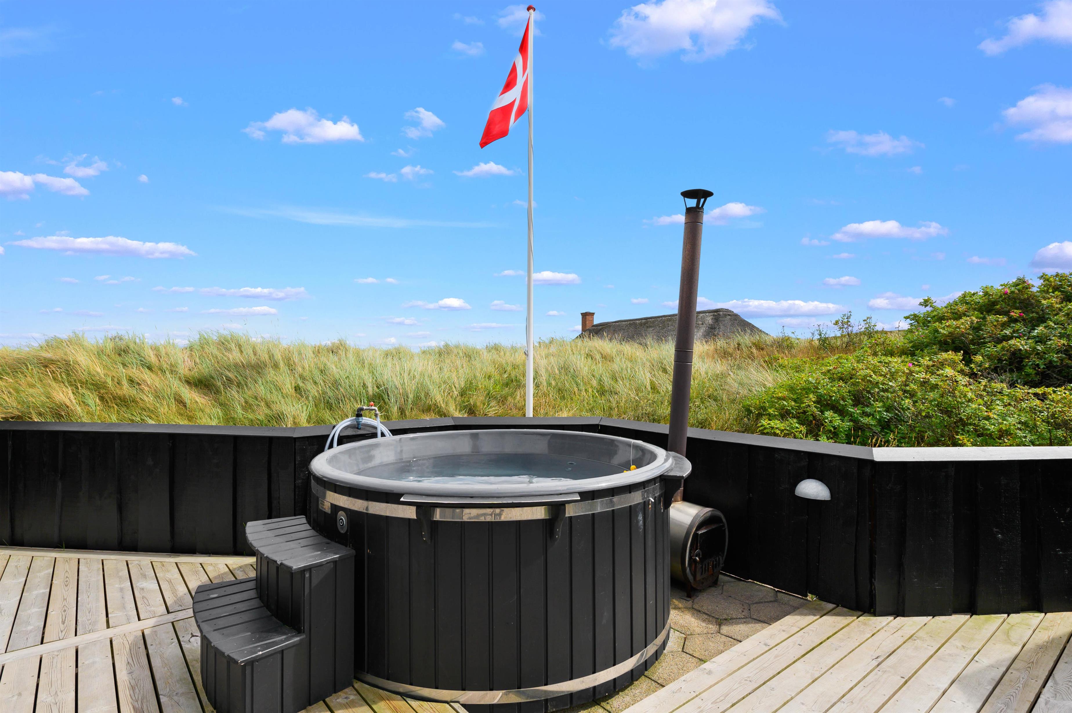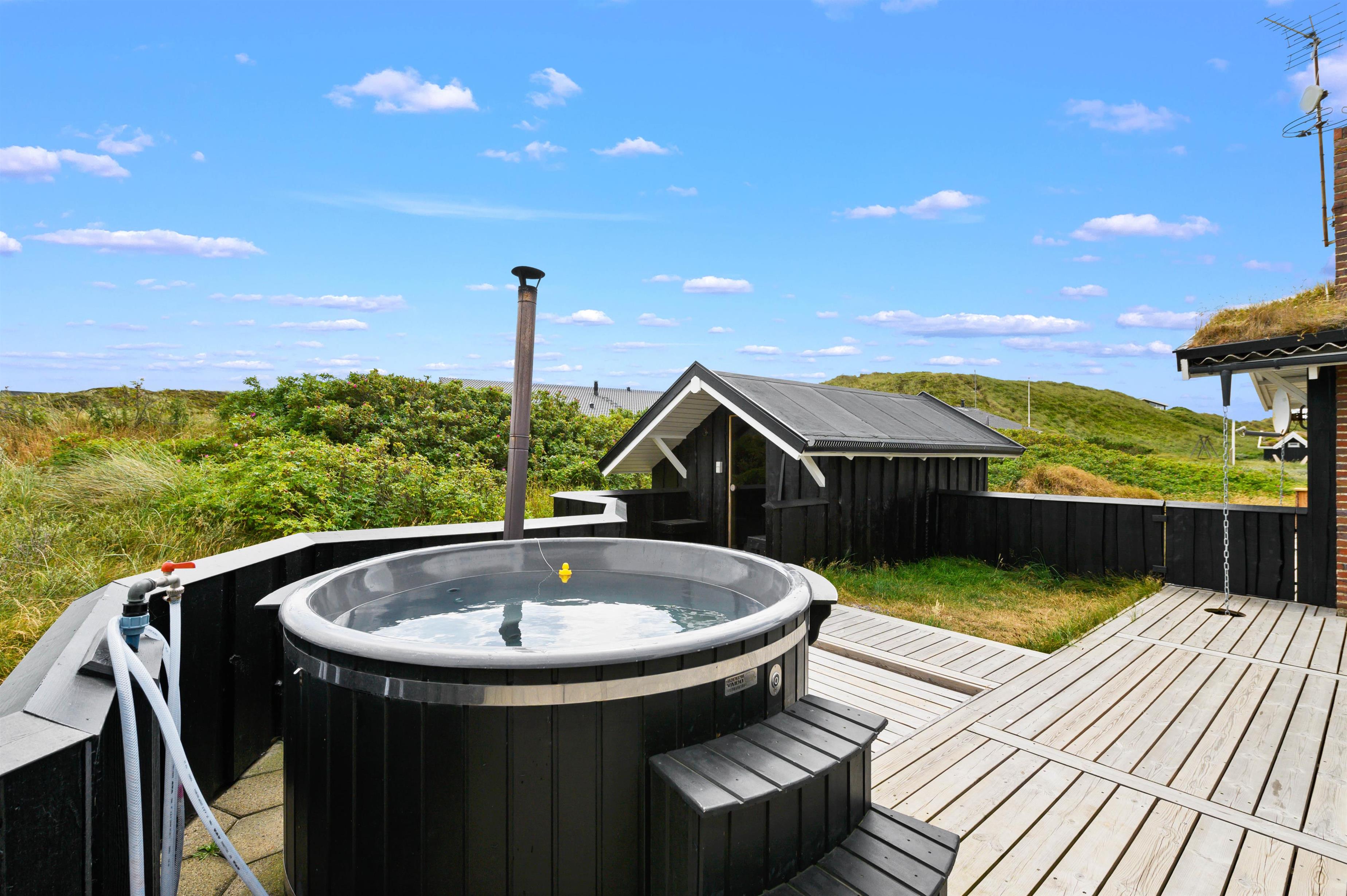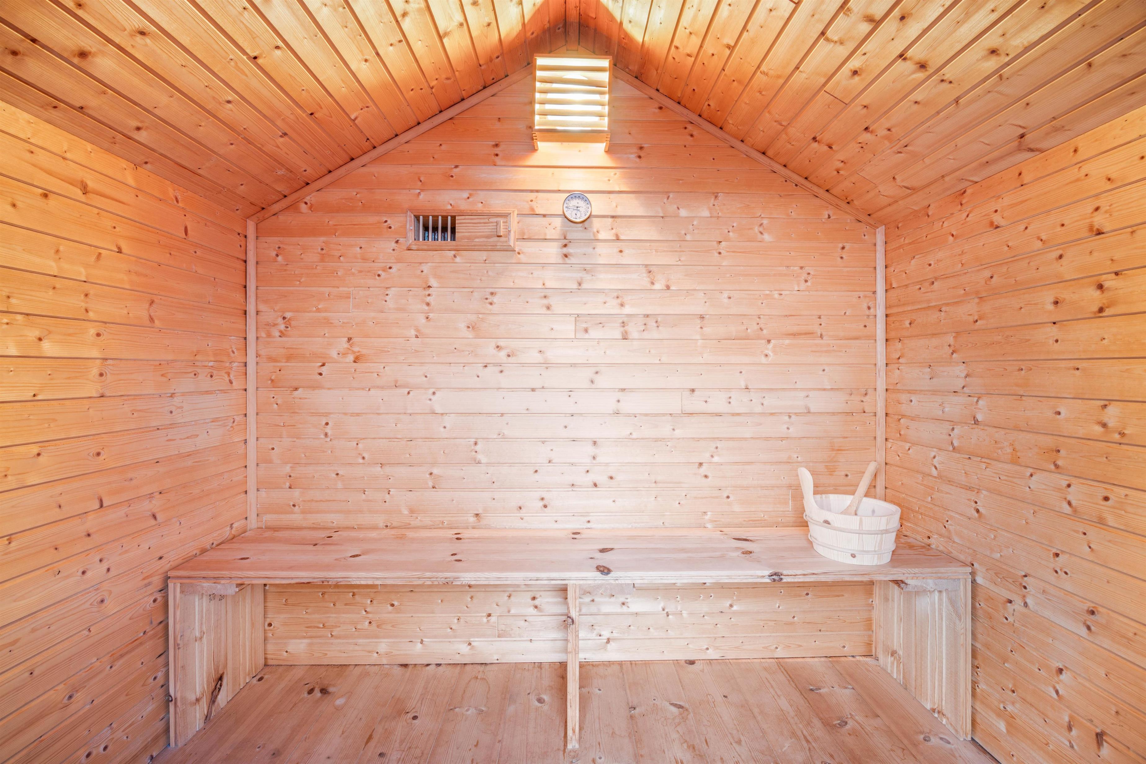 Fra den store terrasse er der desuden adgang til saunaen, som findes i en separat saunahytte. Den giver rig mulighed for at lidt ekstra selvforkælelse på ferien, og i varmen kan I tanke nye kræfter – måske efter en badetur i havet eller en forfriskende gåtur langs vandkanten?