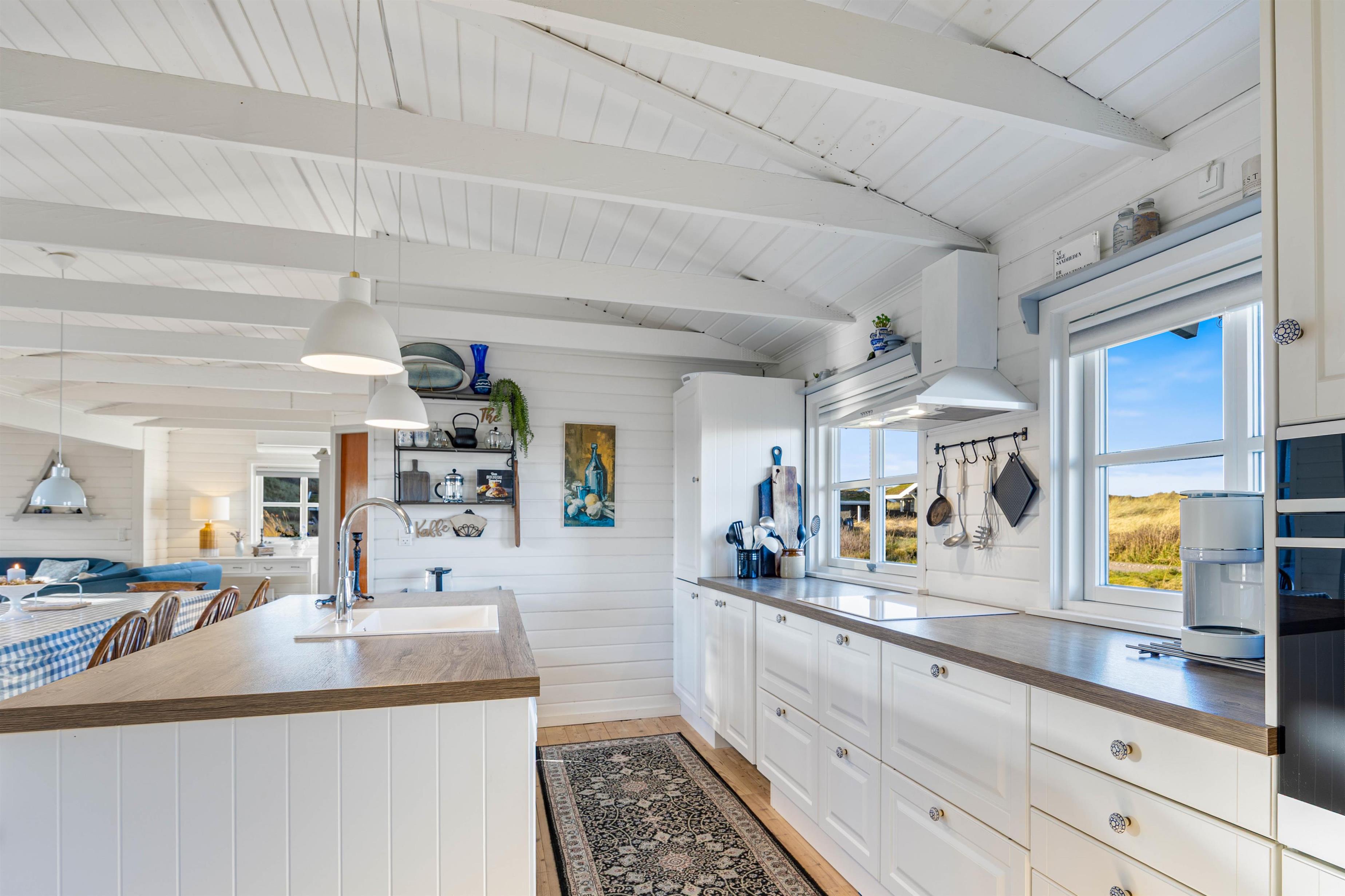 Køkken, spiseafdeling og stue ligger i forlængelse af hinanden og skaber til sammen et åbent opholdsrum, hvor I alle kan samles til de afslappende feriestunder – med lækre feriemiddage og hyggelige aftener med kortspil og planlægning af næste dags udflugter.