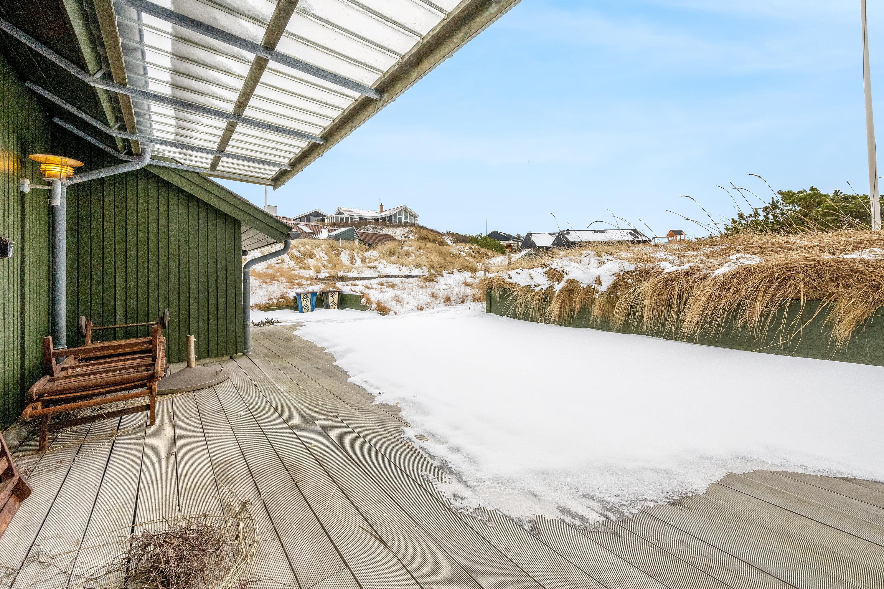 Udover de dejlige faciliteter indenfor kan sommerhuset på Mågedalen 30 også byde på gode udearealer. Her er en dejlig sydvendt træterrasse, der naturligvis er udstyret med behagelige møbler. Terrassen er afskærmet og delvist overdækket, hvilket altid er en fordel. Fordi terrassen er sydvendt, kan I nyde aftensolen og eventuelt en middag tilberedt på husets grill.