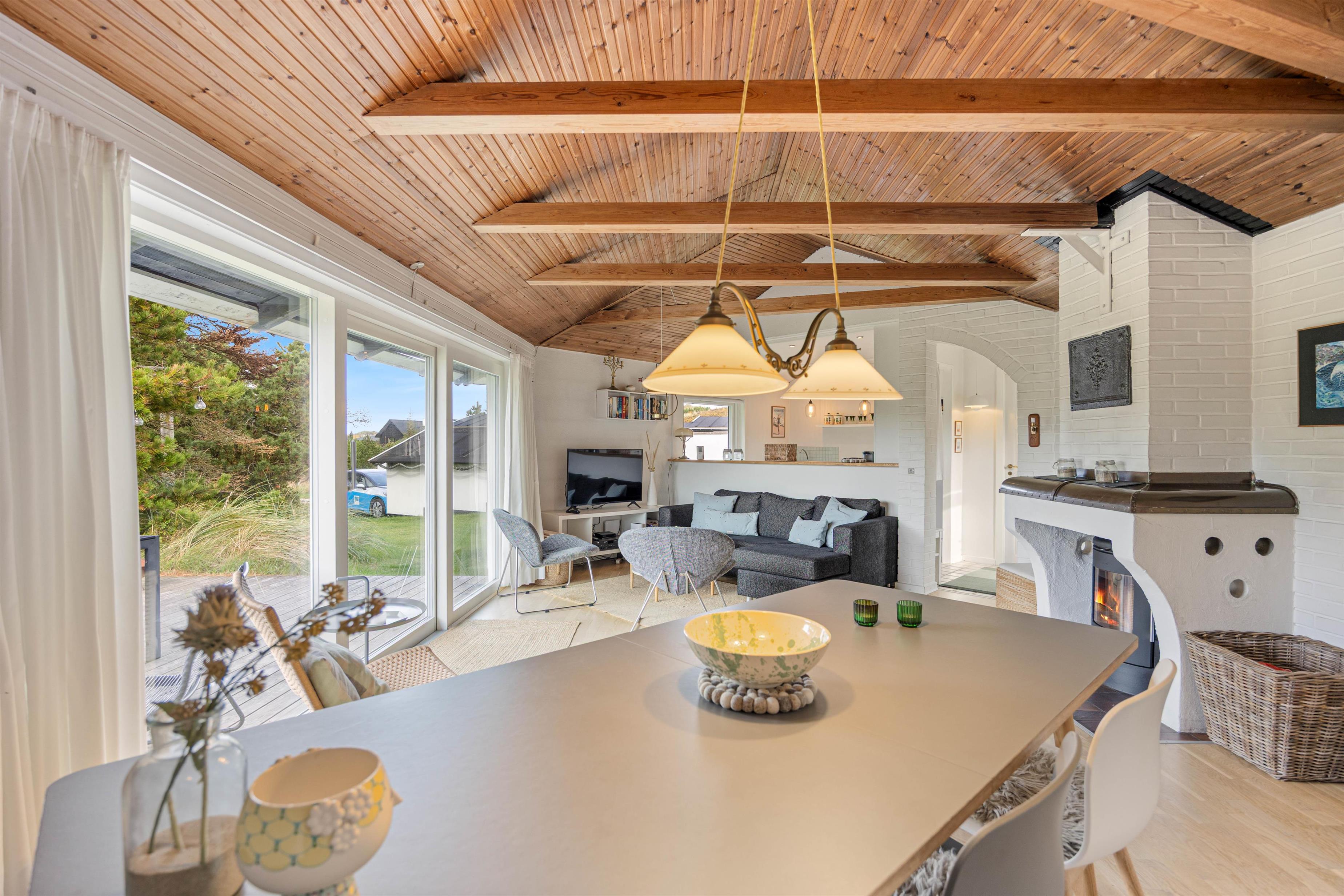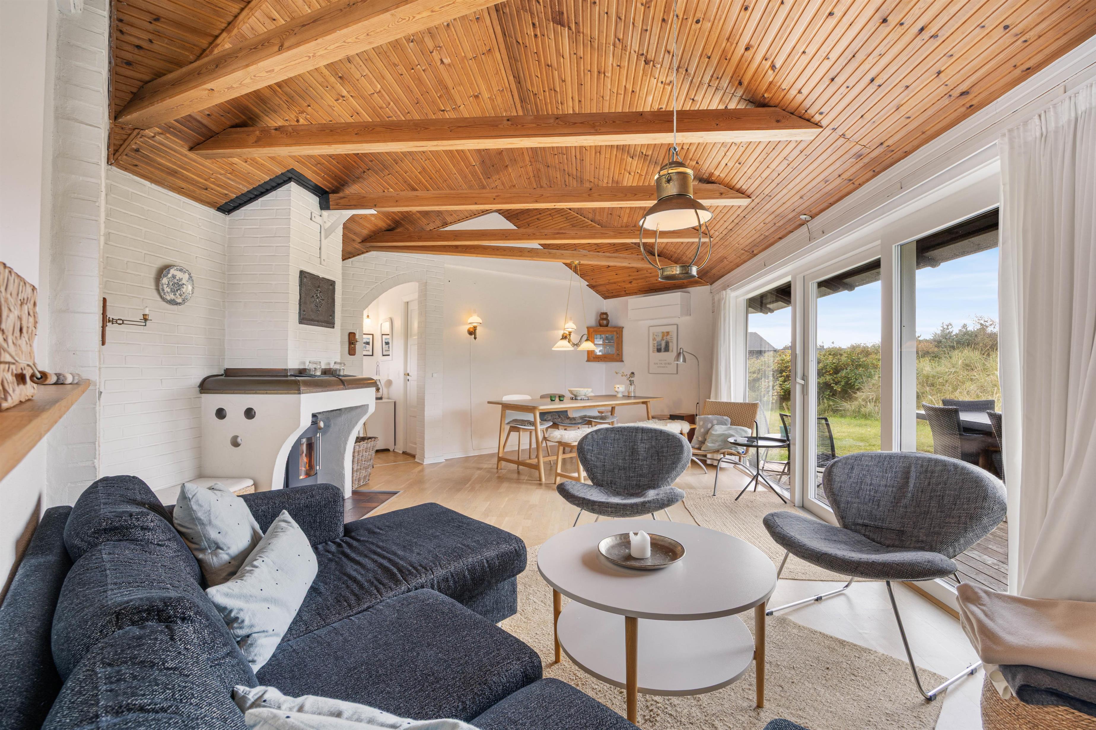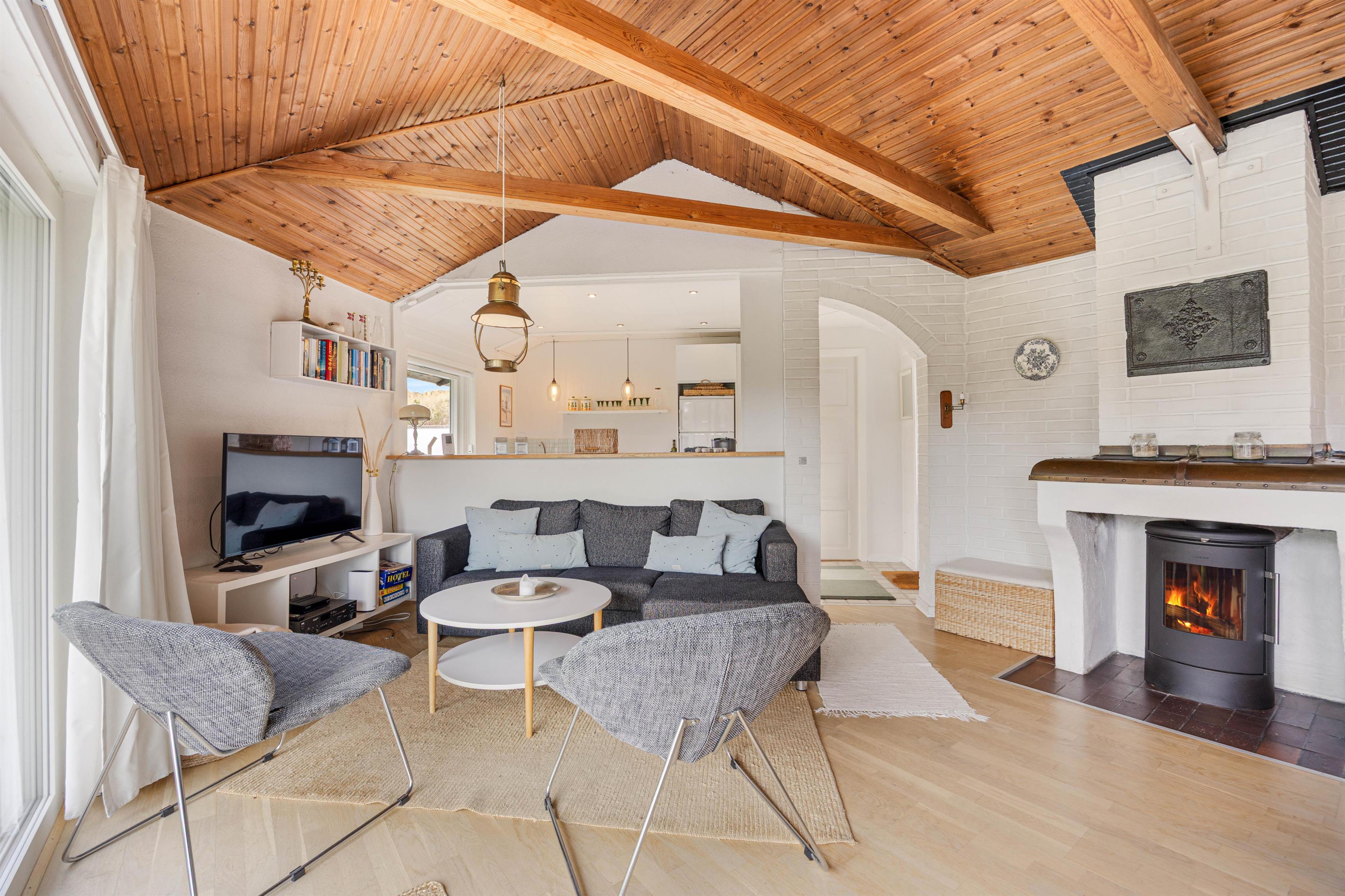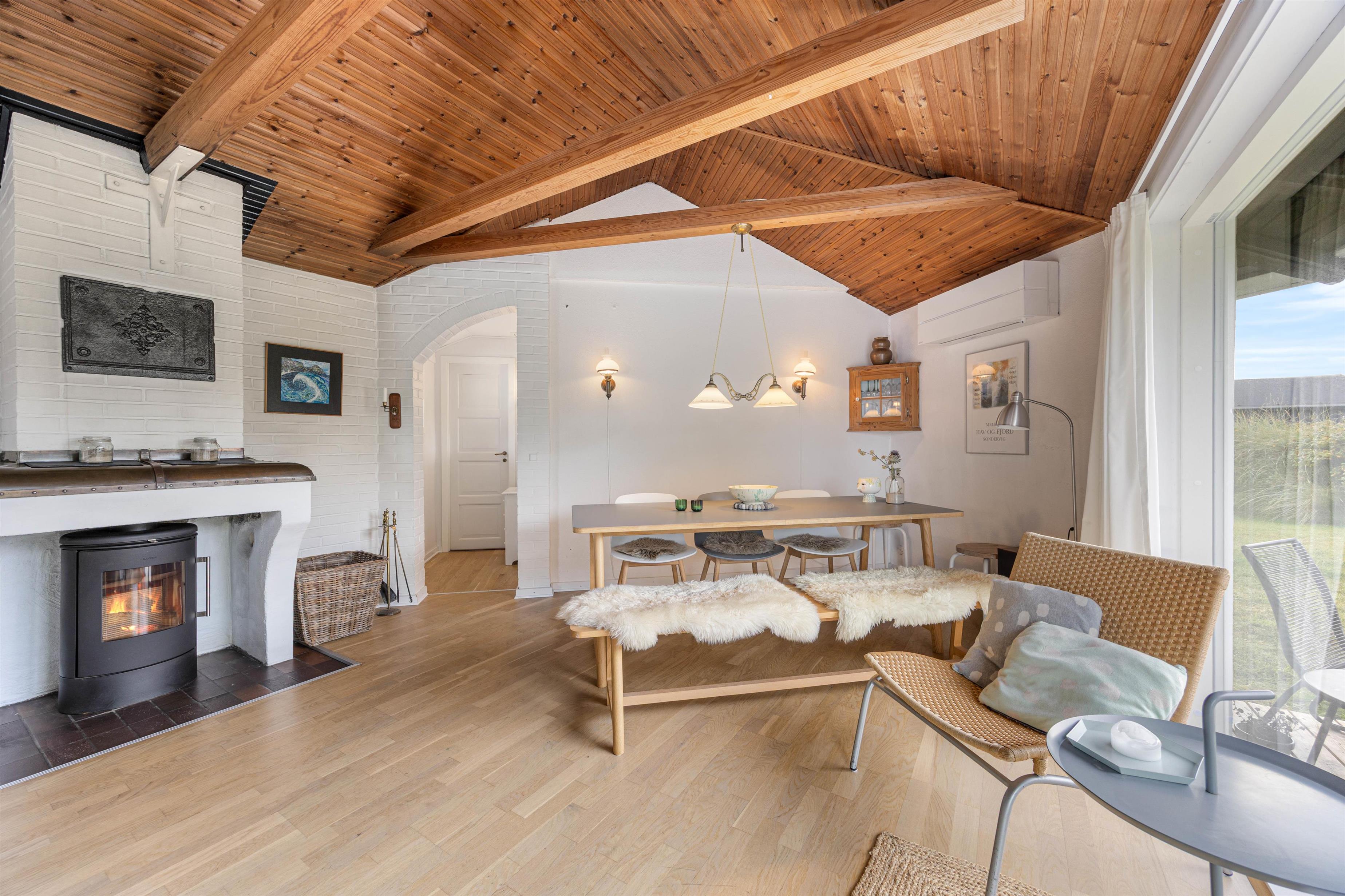 Sommerhusets køkken ligger i åben forbindelse med stuen, hvor store vinduer lukker solens lys og den flotte natur ind. På kolde dage kan I nyde godt af varmen fra brændeovnen, mens I slapper af på sofaen. I opholdsrummet går loftet hele vejen til kip, og oven i det er der også synlige egetræsbjælker, der alt I alt bidrager til en god og hyggelig indretning