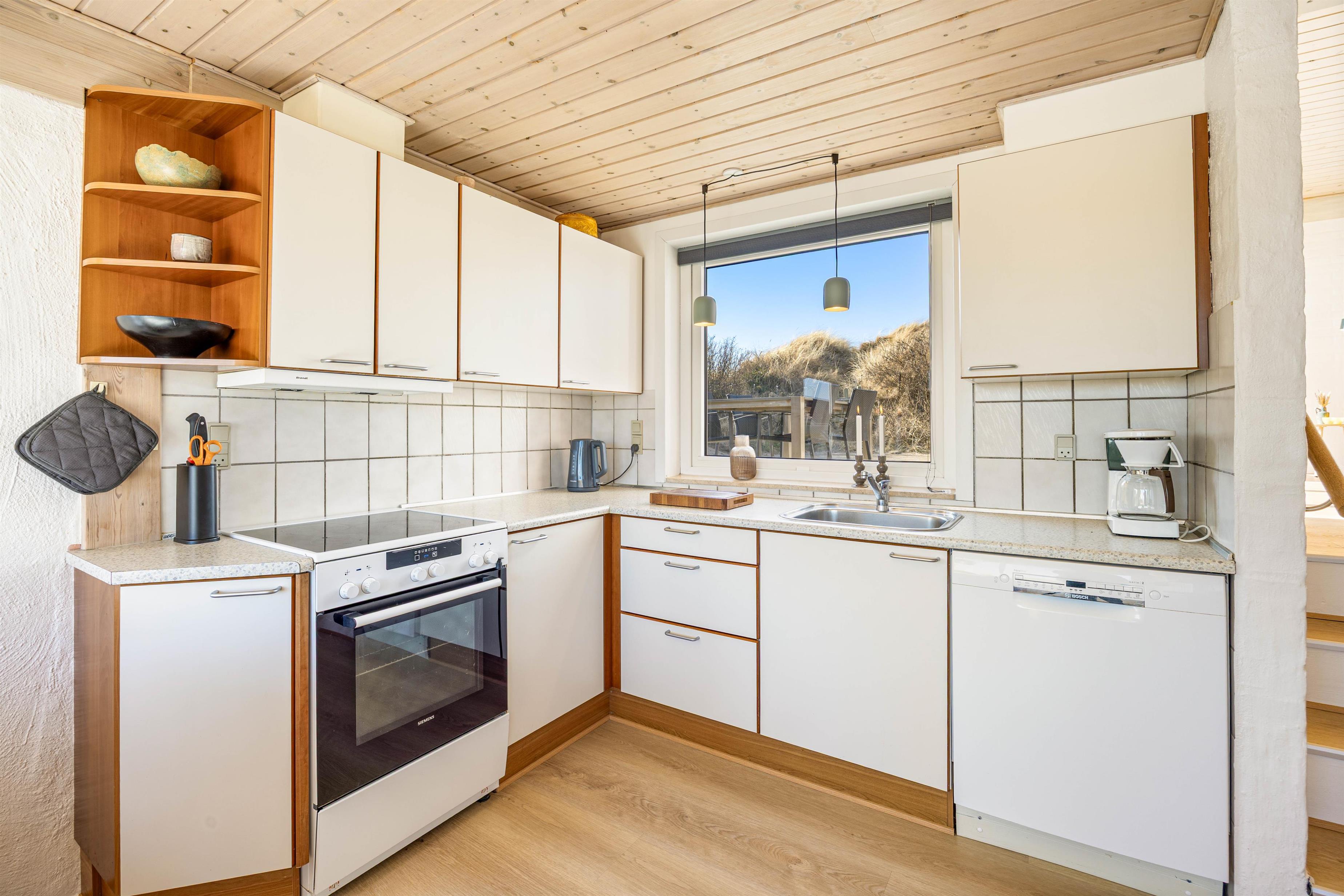Indretningen giver jer en skøn balance mellem fællesskab og ro. Med 5 soverum kan I fordele sengepladserne, så alle får deres eget fristed, mens de fælles opholdsrum lægger op til nærvær, spil og lange aftener. Når temperaturen falder, skaber brændeovnen ekstra hygge og en behagelig stemning, og med en luft til luft varmepumpe kan I nemt holde et stabilt indeklima året rundt. I hverdagen på ferien gør opvaskemaskinen det let at rydde af efter måltiderne, og både vaskemaskine og tørretumbler er praktiske, hvis I rejser med børn, planlægger mange strandture eller bare vil pakke let.