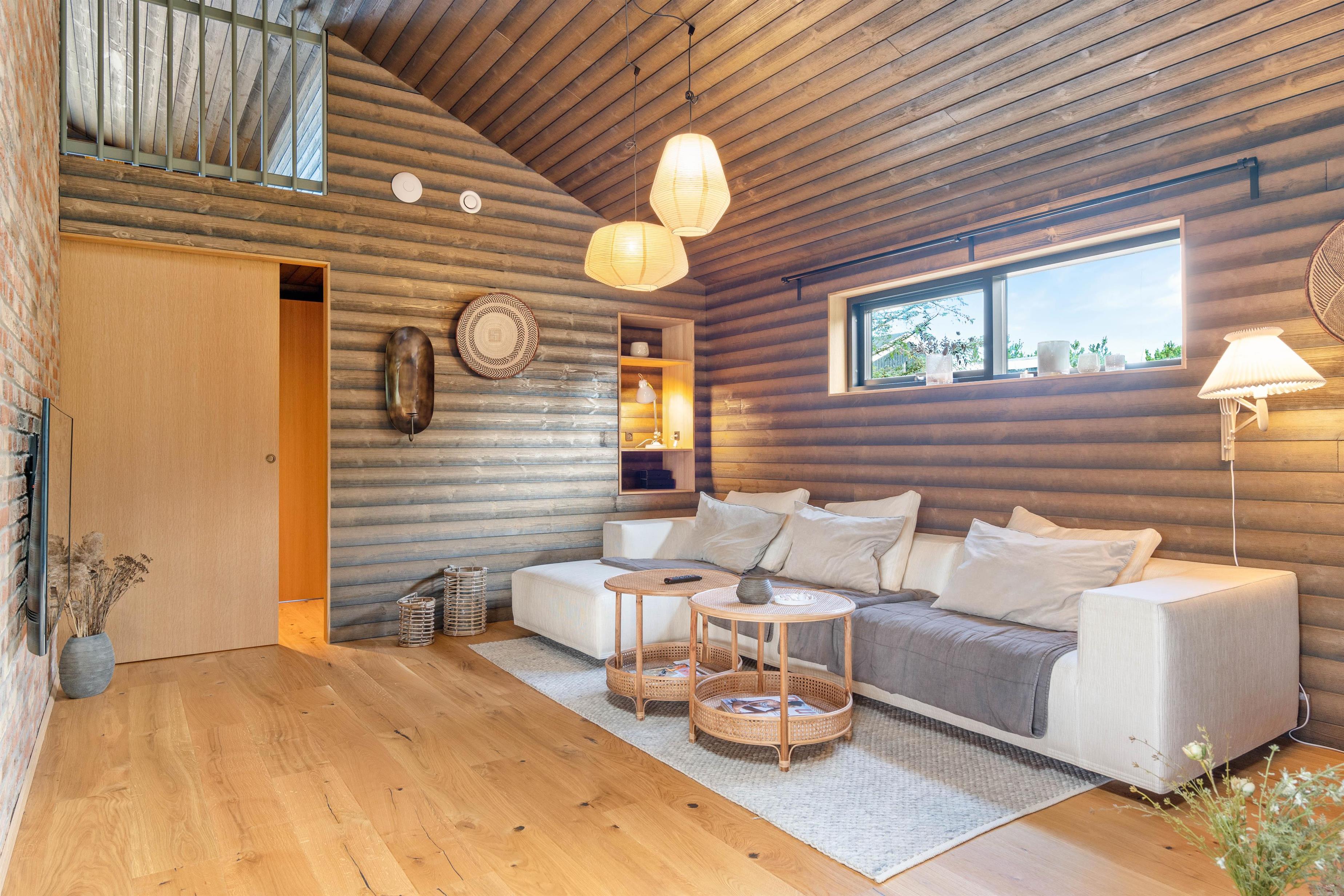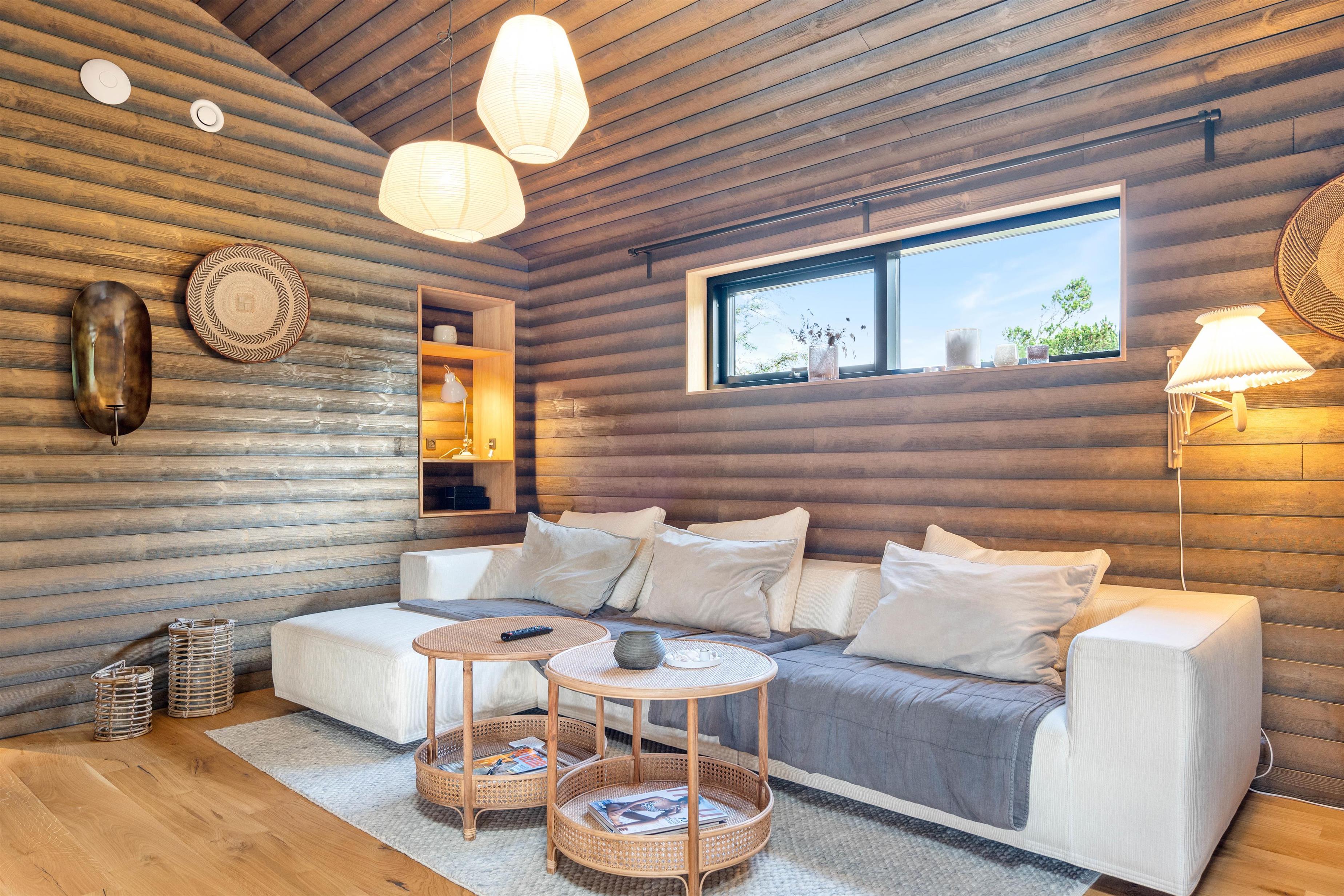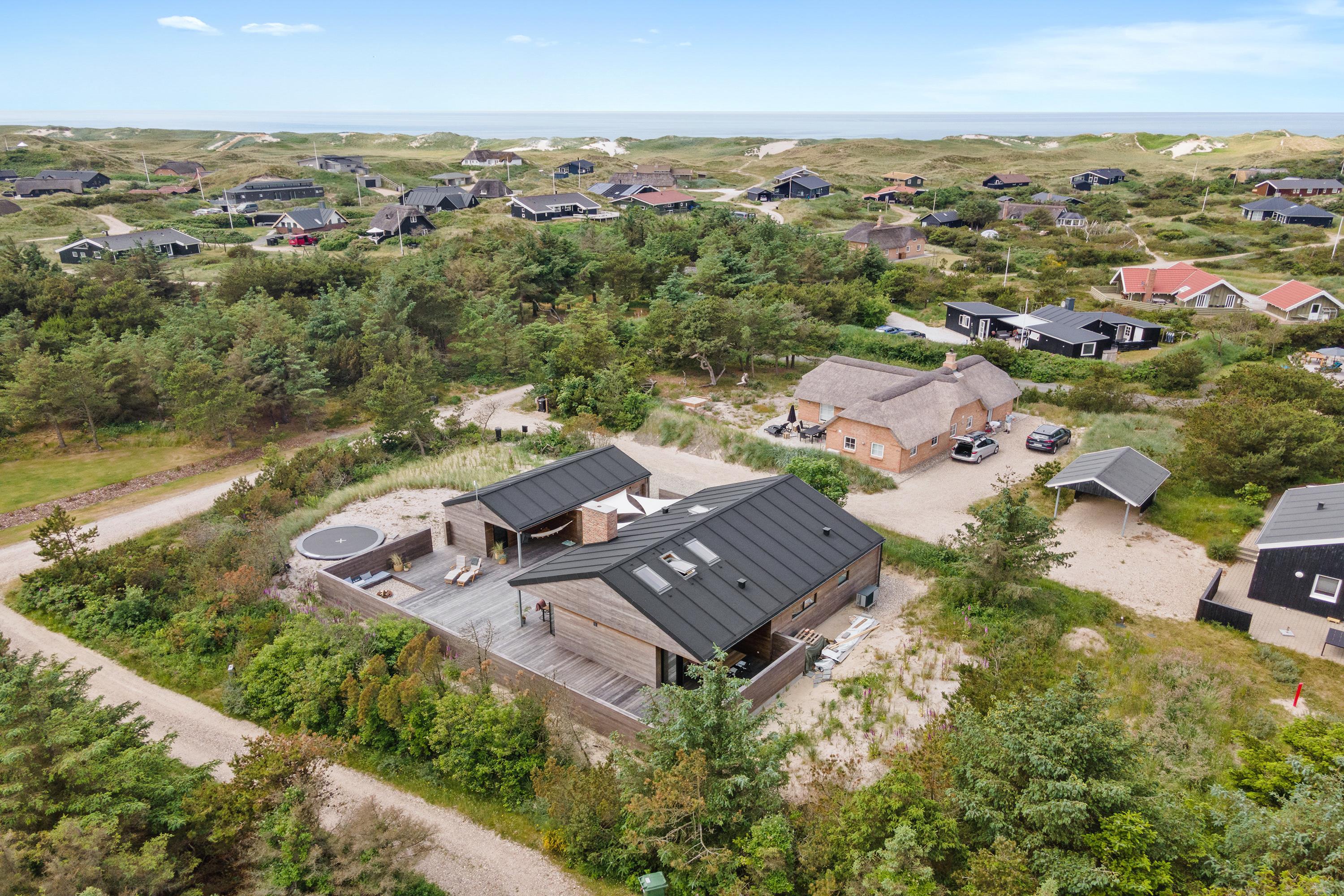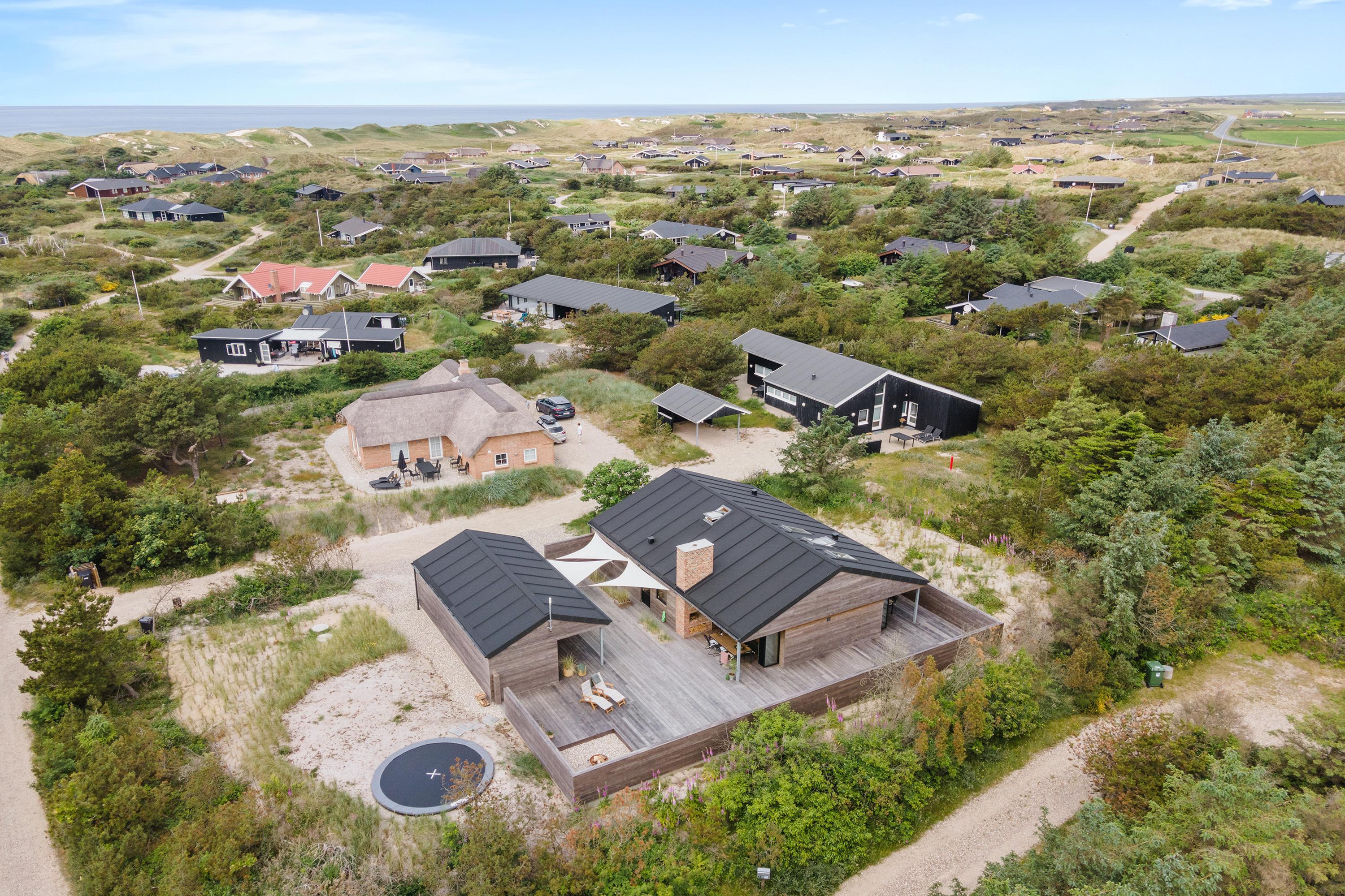 Sommerhuset har en helt unik indretning og de store Velux ovenlysvinduer tillader sollyset at strømme ind i feriehuset. Der er 3 soverum med dobbeltsenge og et flot badeværelse med badekar samt gæstetoilet. I stuen finder I bl.a 2 indbyggede biobrændere, hvor I kan sidde og slappe af og nyde flammerne i pejsen efter en dejlig spadseretur på stranden.
