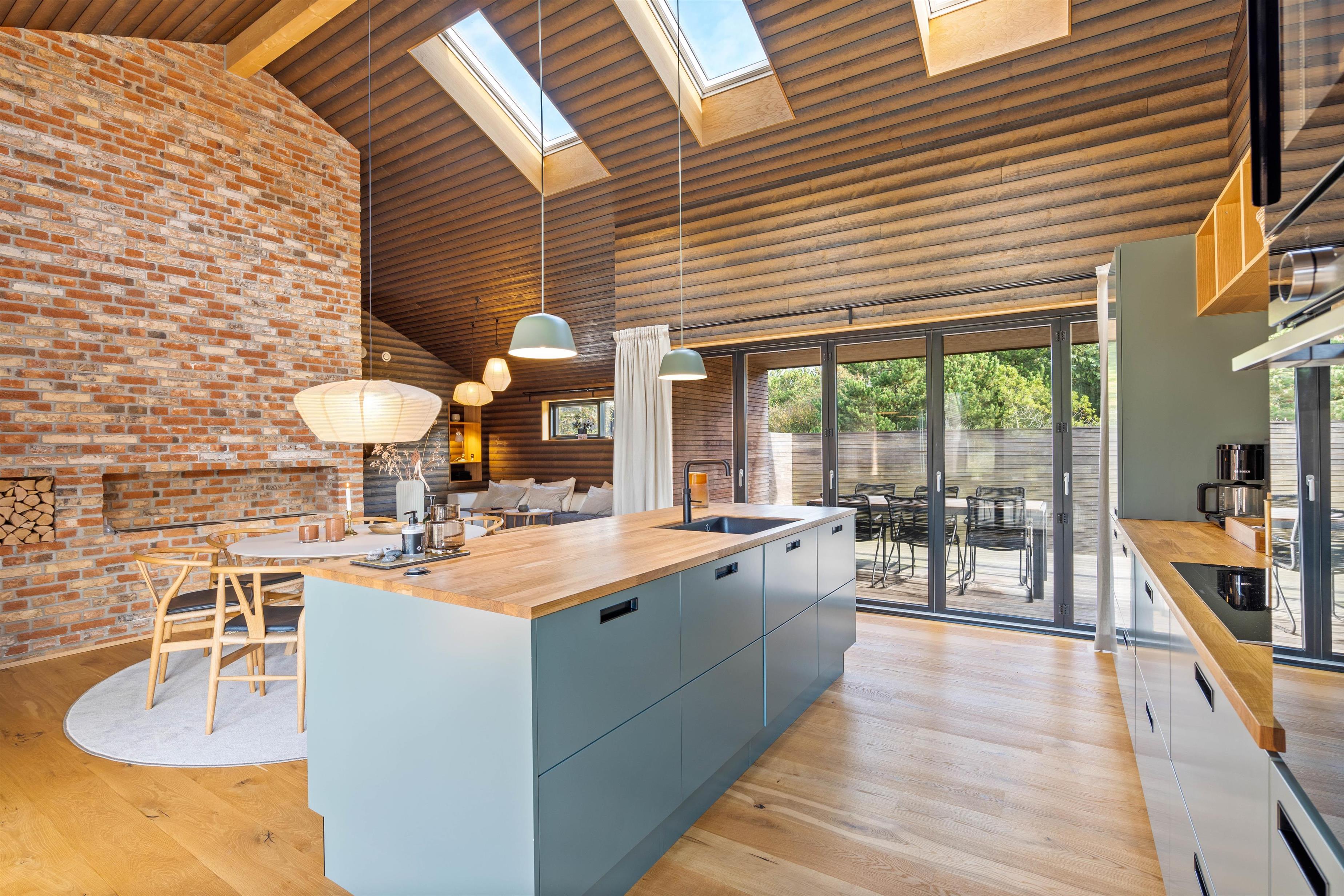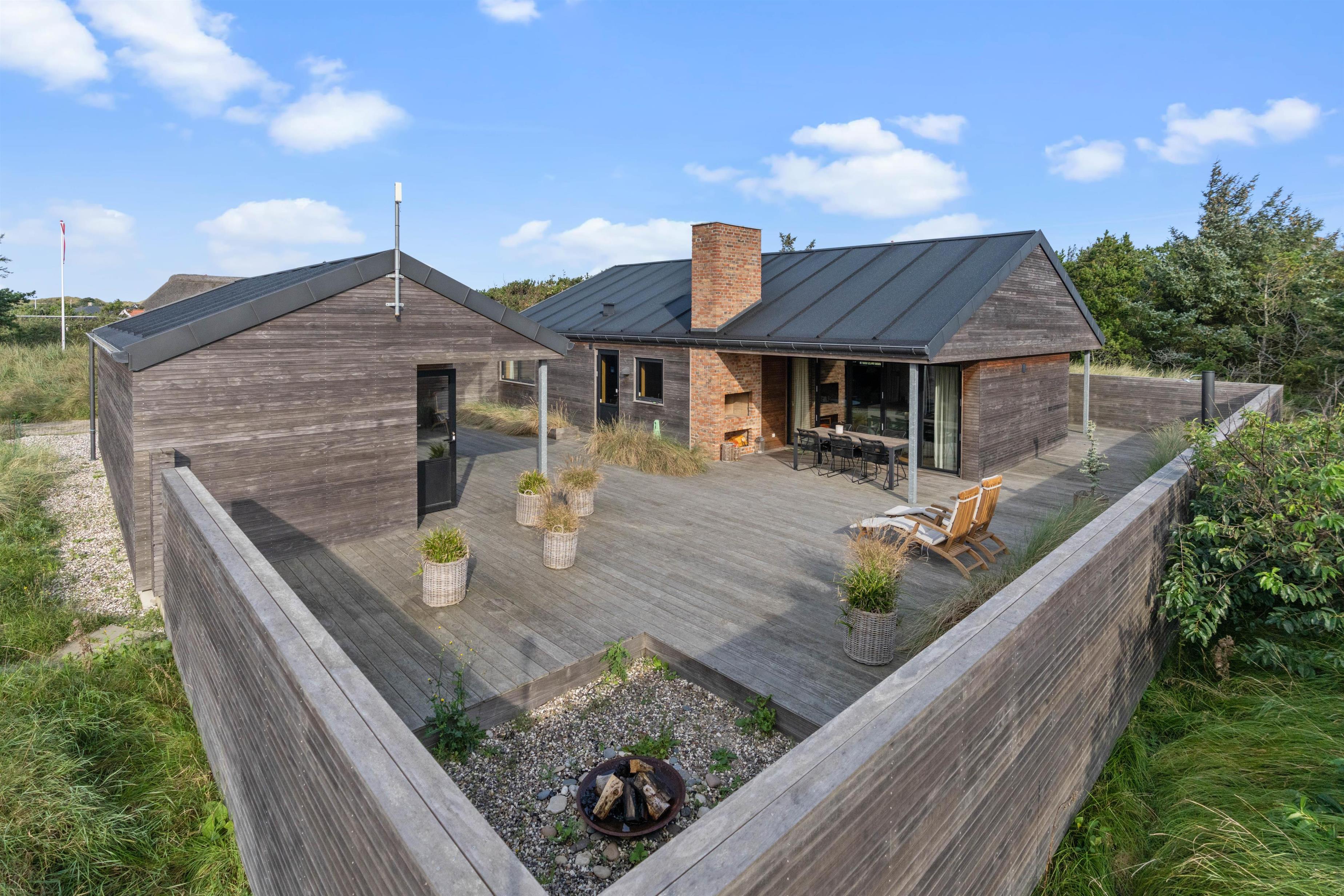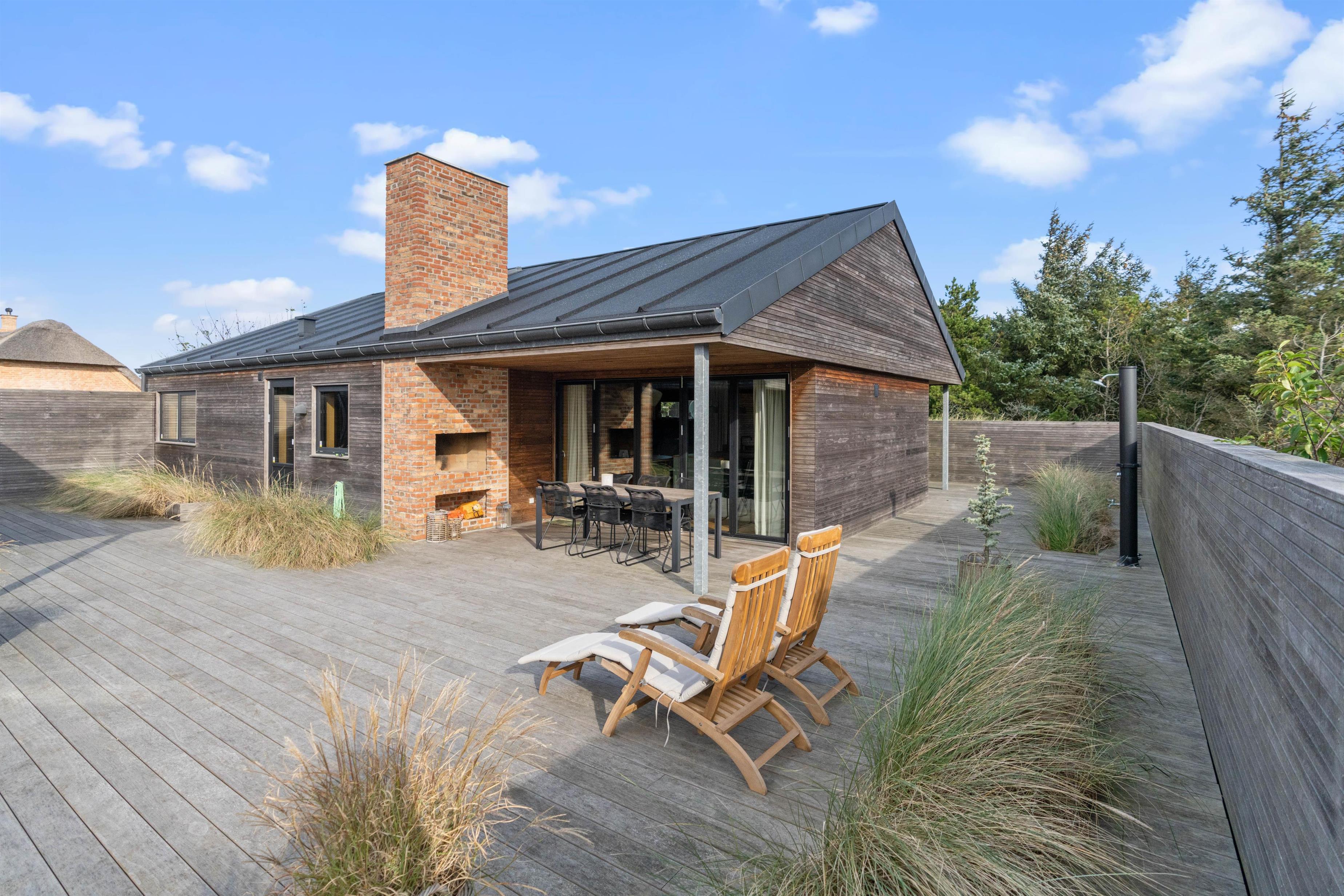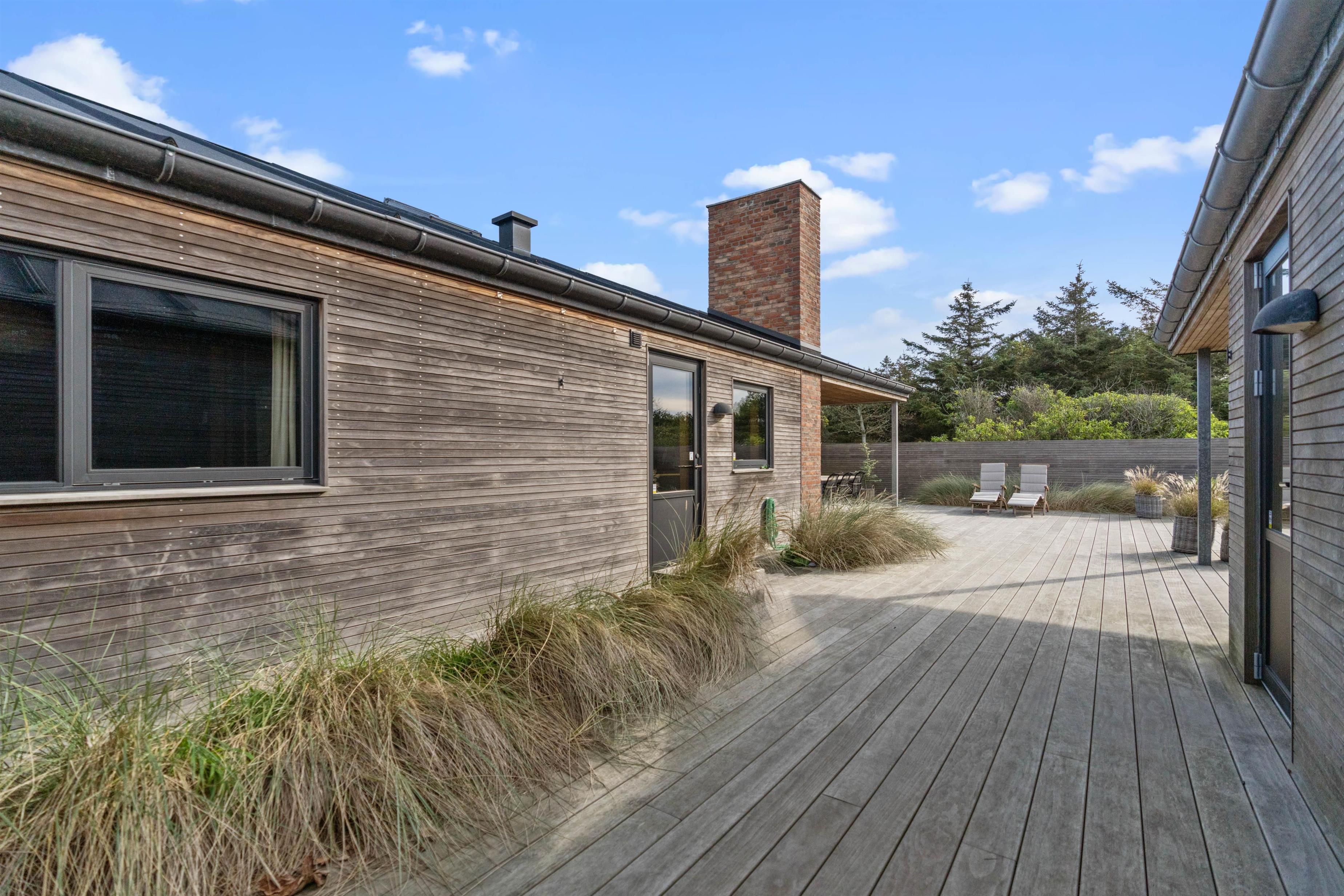 Sommerhuset har en helt unik indretning og de store Velux ovenlysvinduer tillader sollyset at strømme ind i feriehuset. Der er 3 soverum med dobbeltsenge og et flot badeværelse med badekar samt gæstetoilet. I stuen finder I bl.a 2 indbyggede biobrændere, hvor I kan sidde og slappe af og nyde flammerne i pejsen efter en dejlig spadseretur på stranden.
