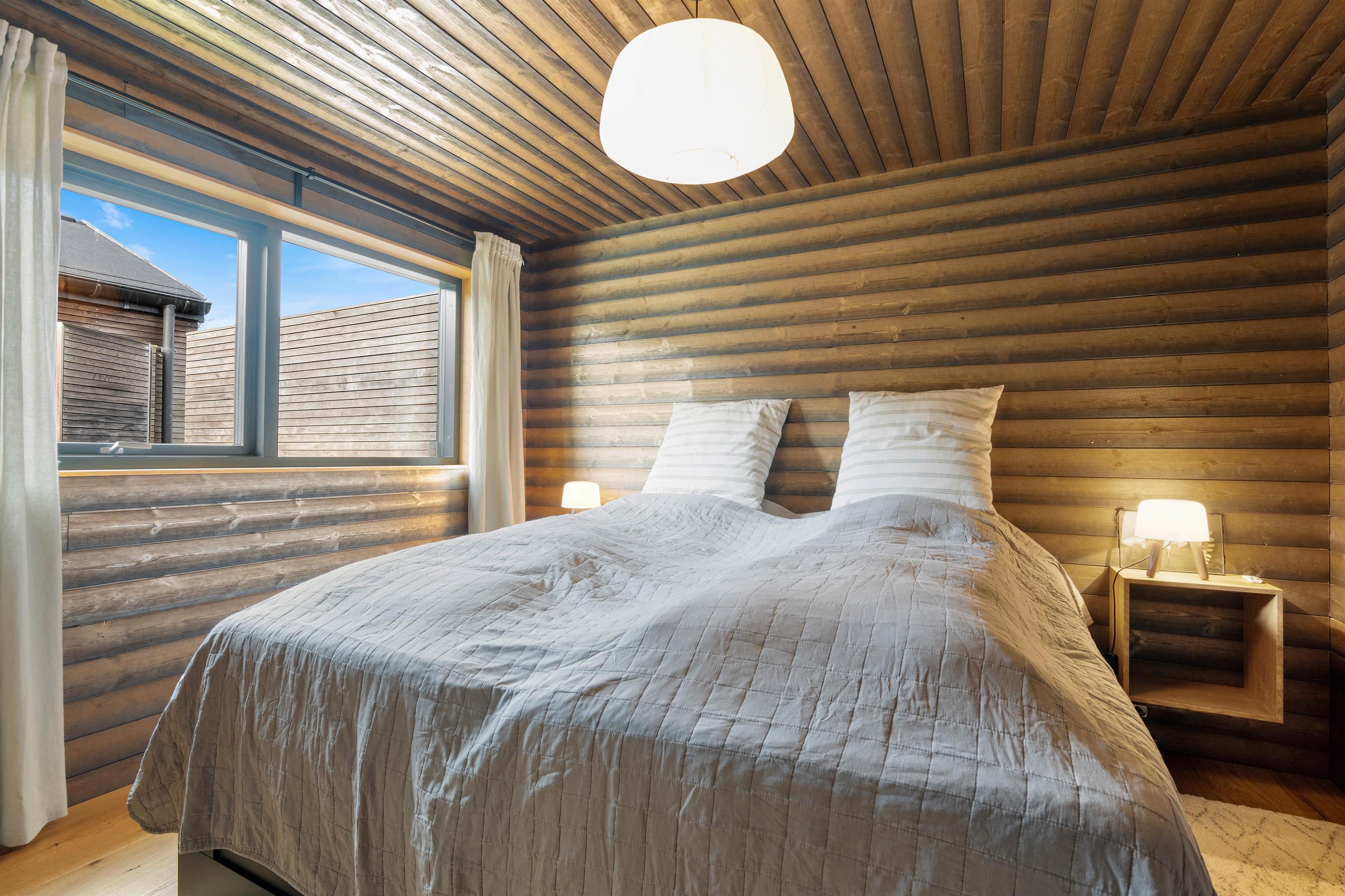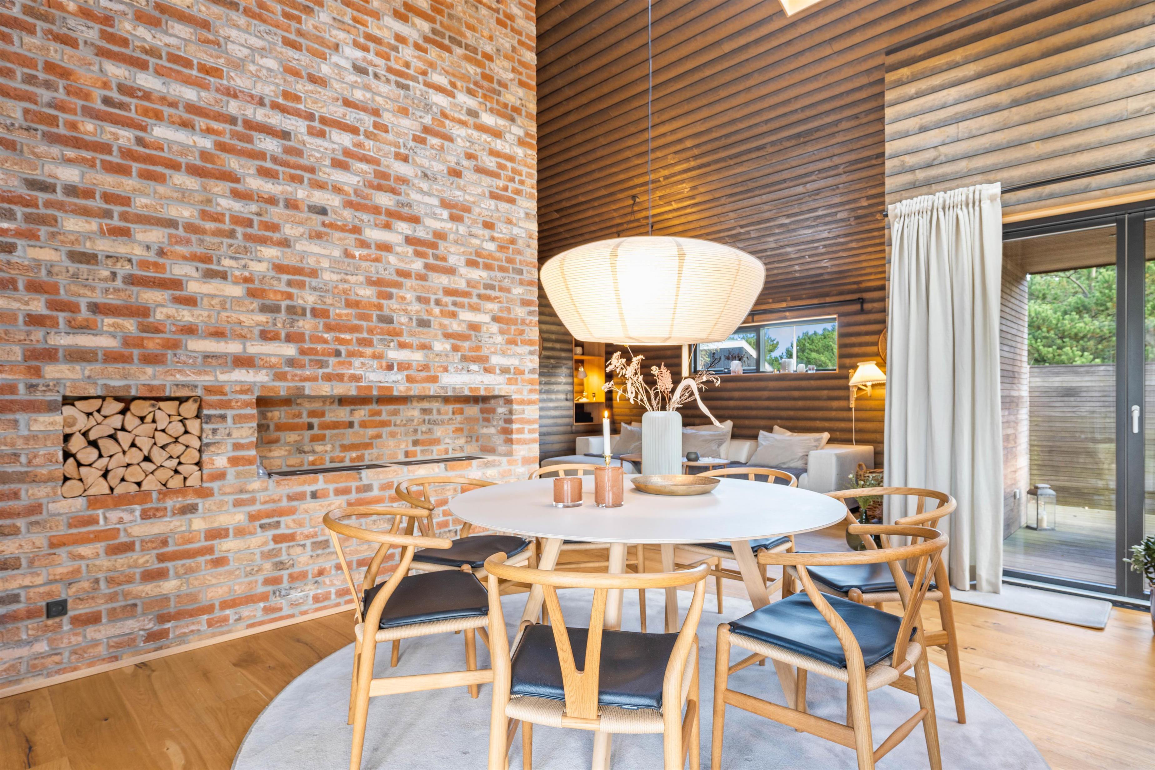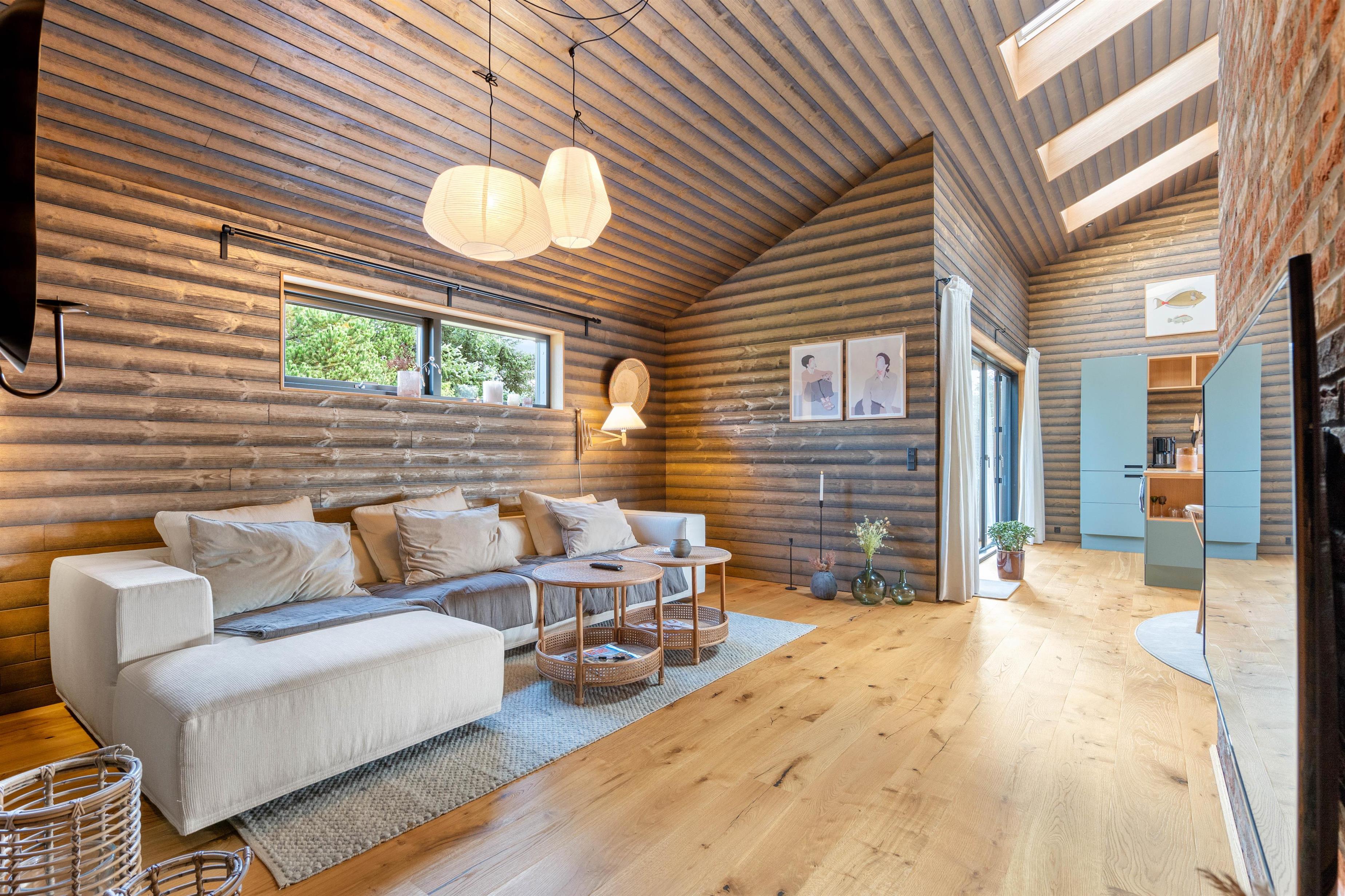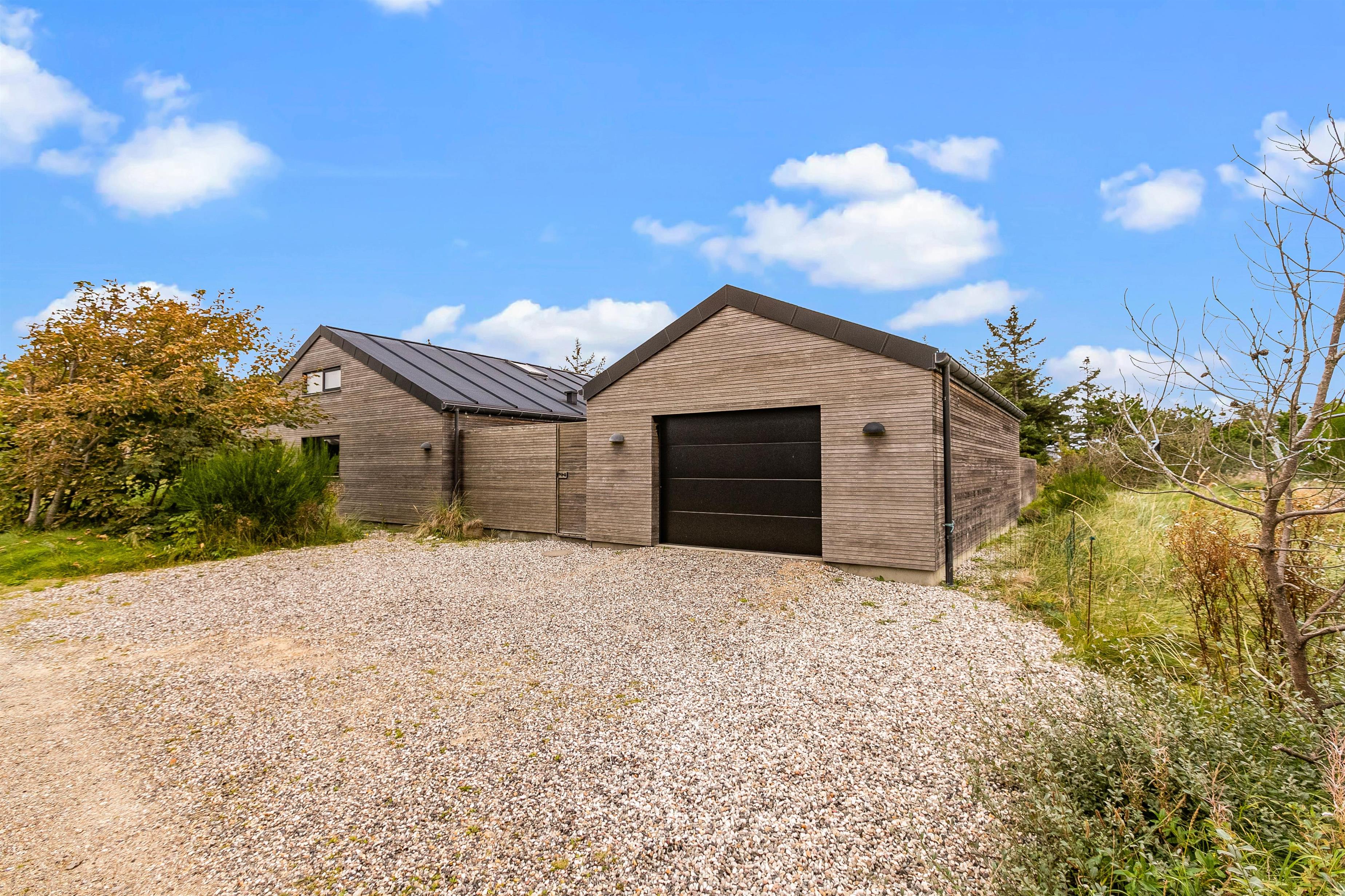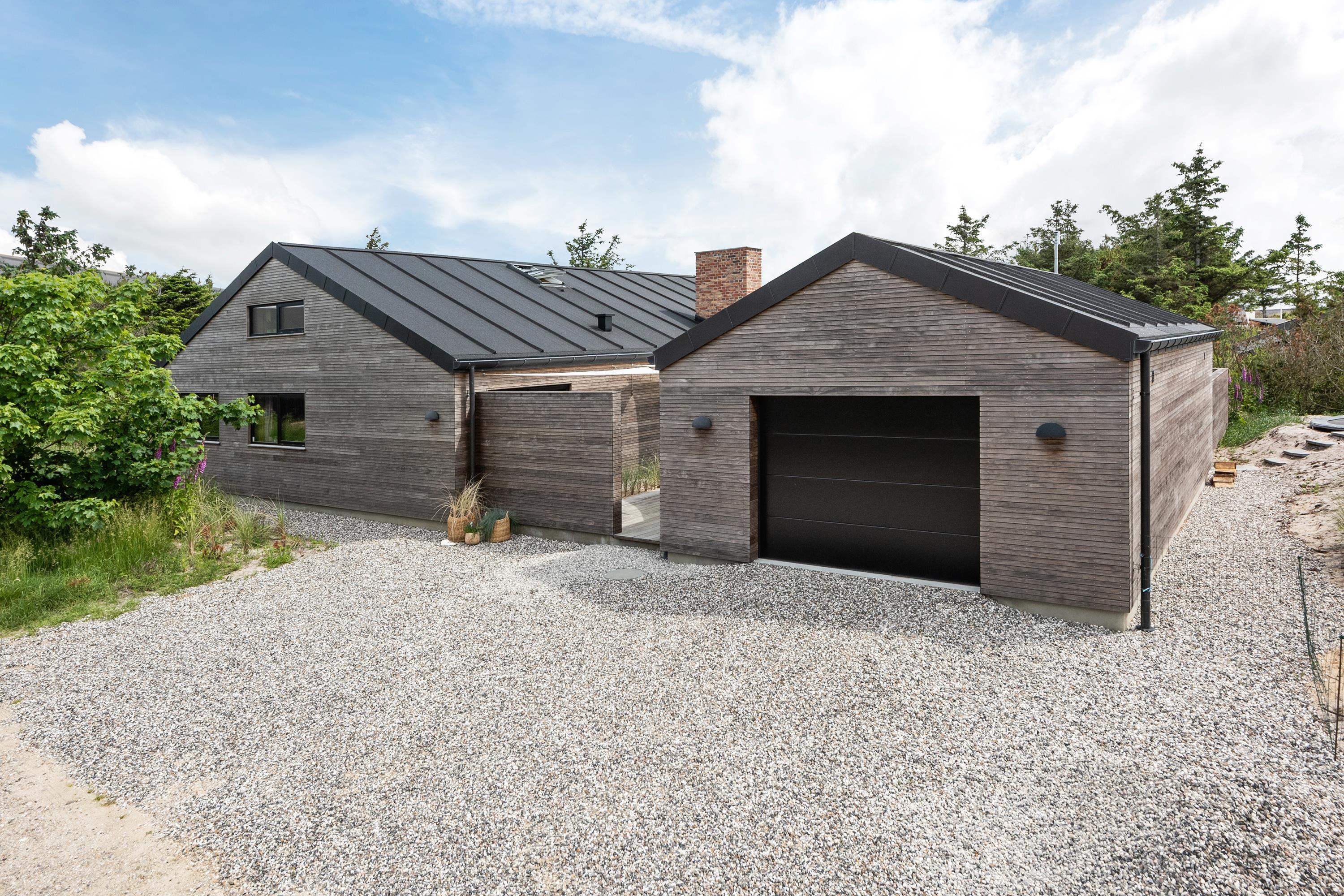 Sommerhuset har en helt unik indretning og de store Velux ovenlysvinduer tillader sollyset at strømme ind i feriehuset. Der er 3 soverum med dobbeltsenge og et flot badeværelse med badekar samt gæstetoilet. I stuen finder I bl.a 2 indbyggede biobrændere, hvor I kan sidde og slappe af og nyde flammerne i pejsen efter en dejlig spadseretur på stranden.