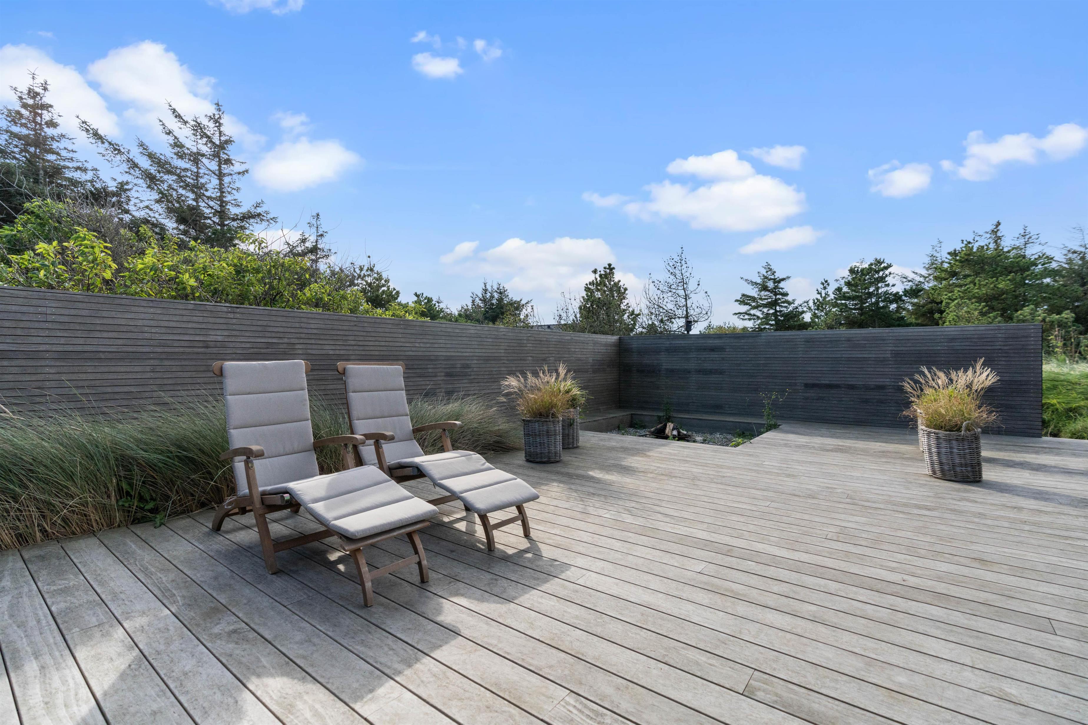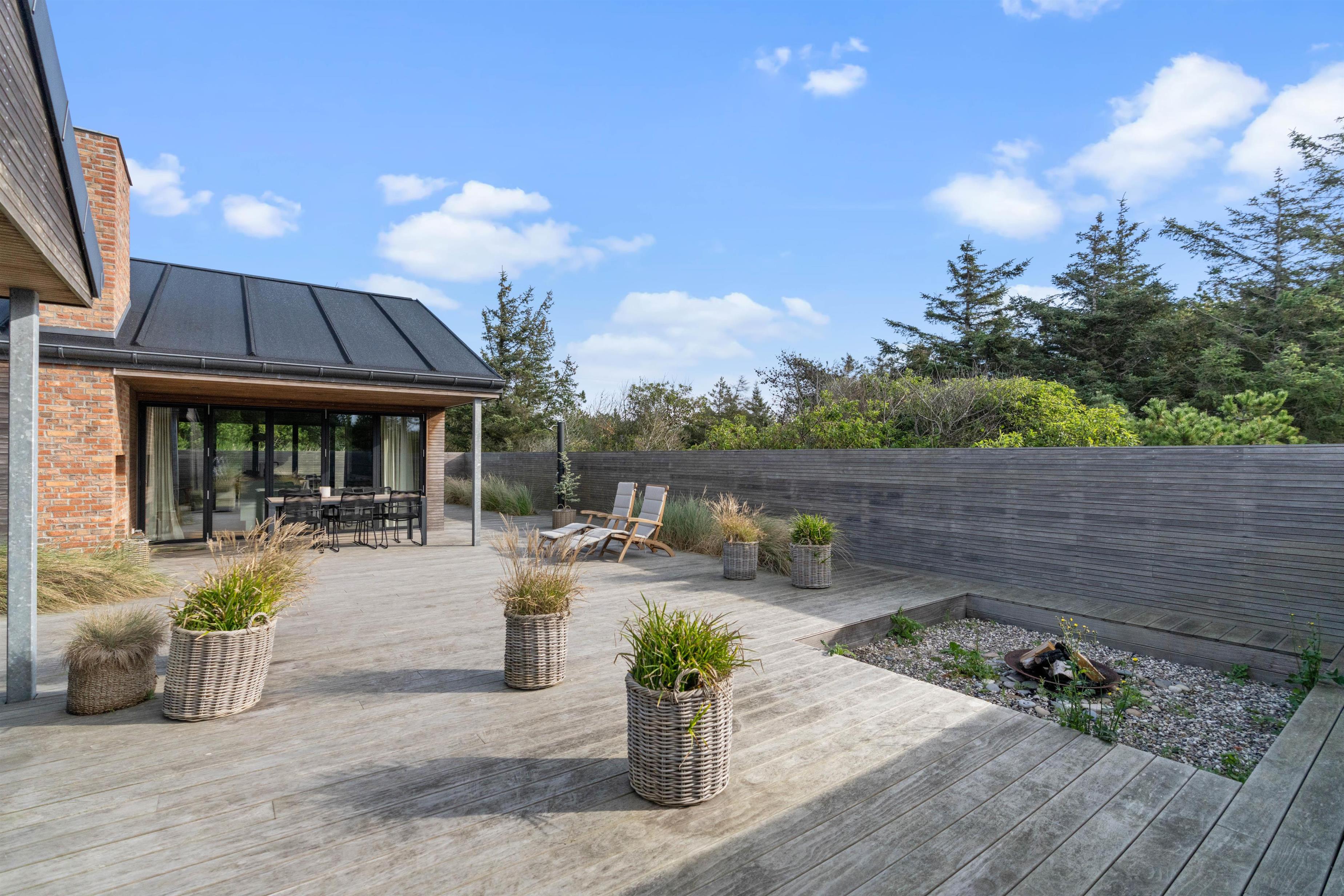 Skøn afskærmet træterrasse med bålplads, udebruser og hængekøje