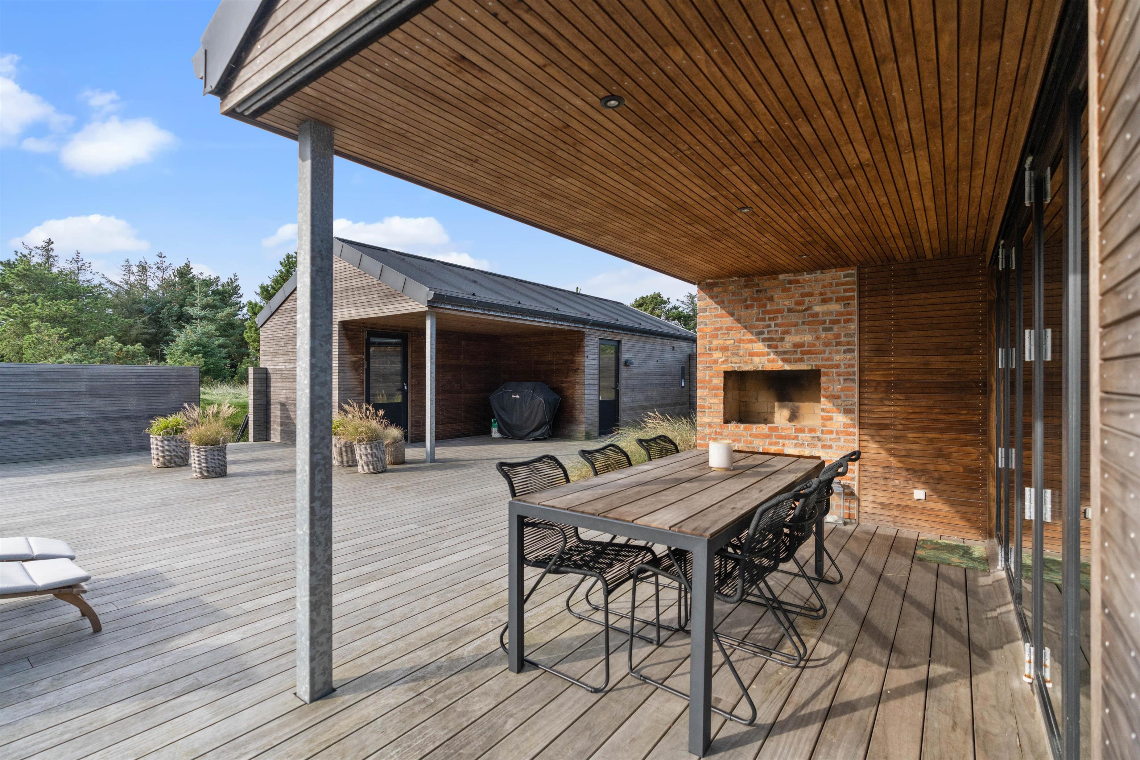 Sommerhuset på Skovdalen 14 er opført i 2019 og ligger på en 1319m2 stor naturgrund. Der er en stor, skøn afskærmet træterrasse, som omgiver hele feriehuset, og som noget helt specielt er der en integreret bålplads, hvor I kan sidde og hygge. Både grill og havemøbler står til rådighed på terrassen, hvor der også er en hængekøje under solsejlet, som i dén grad indbyder til en middagslur.