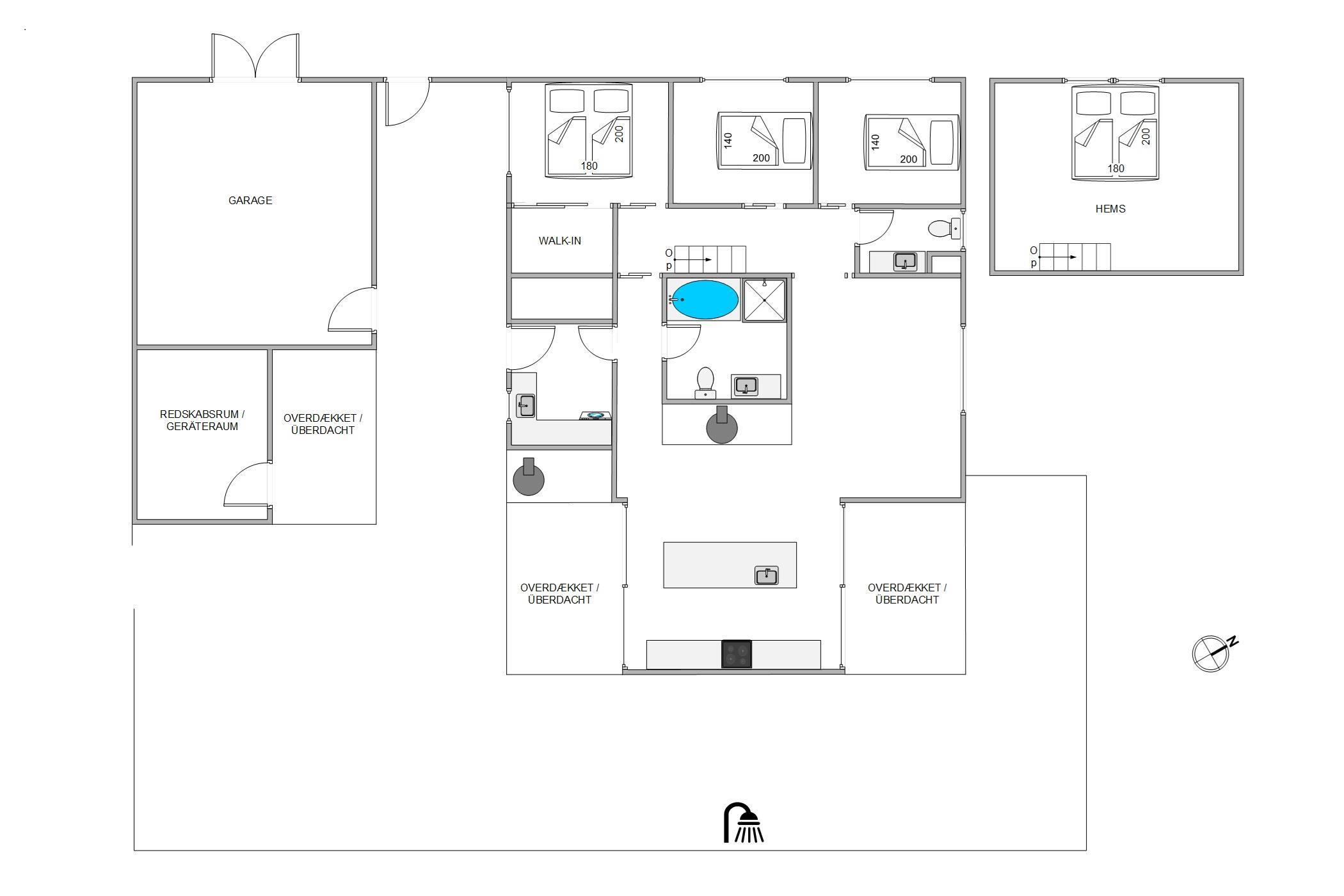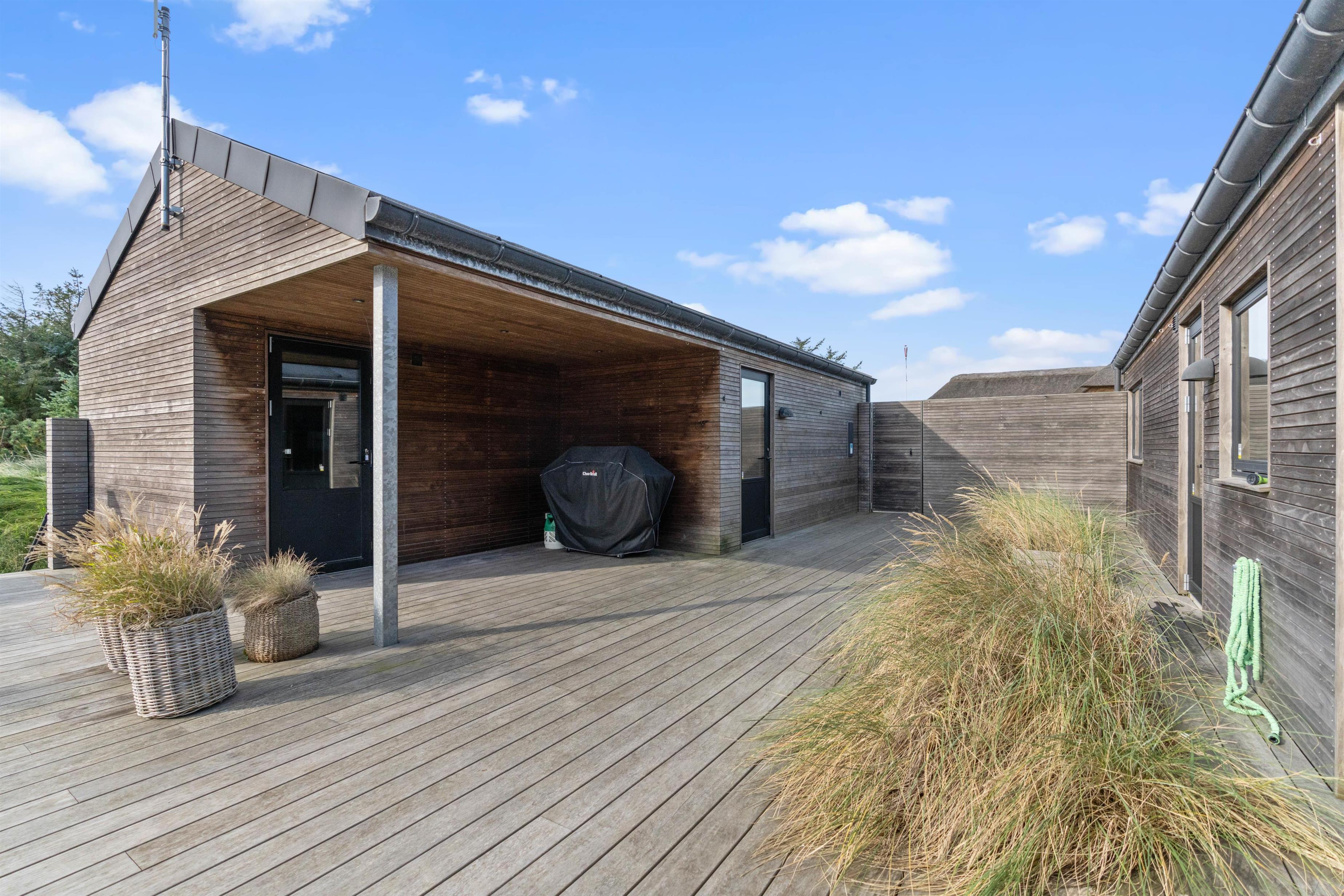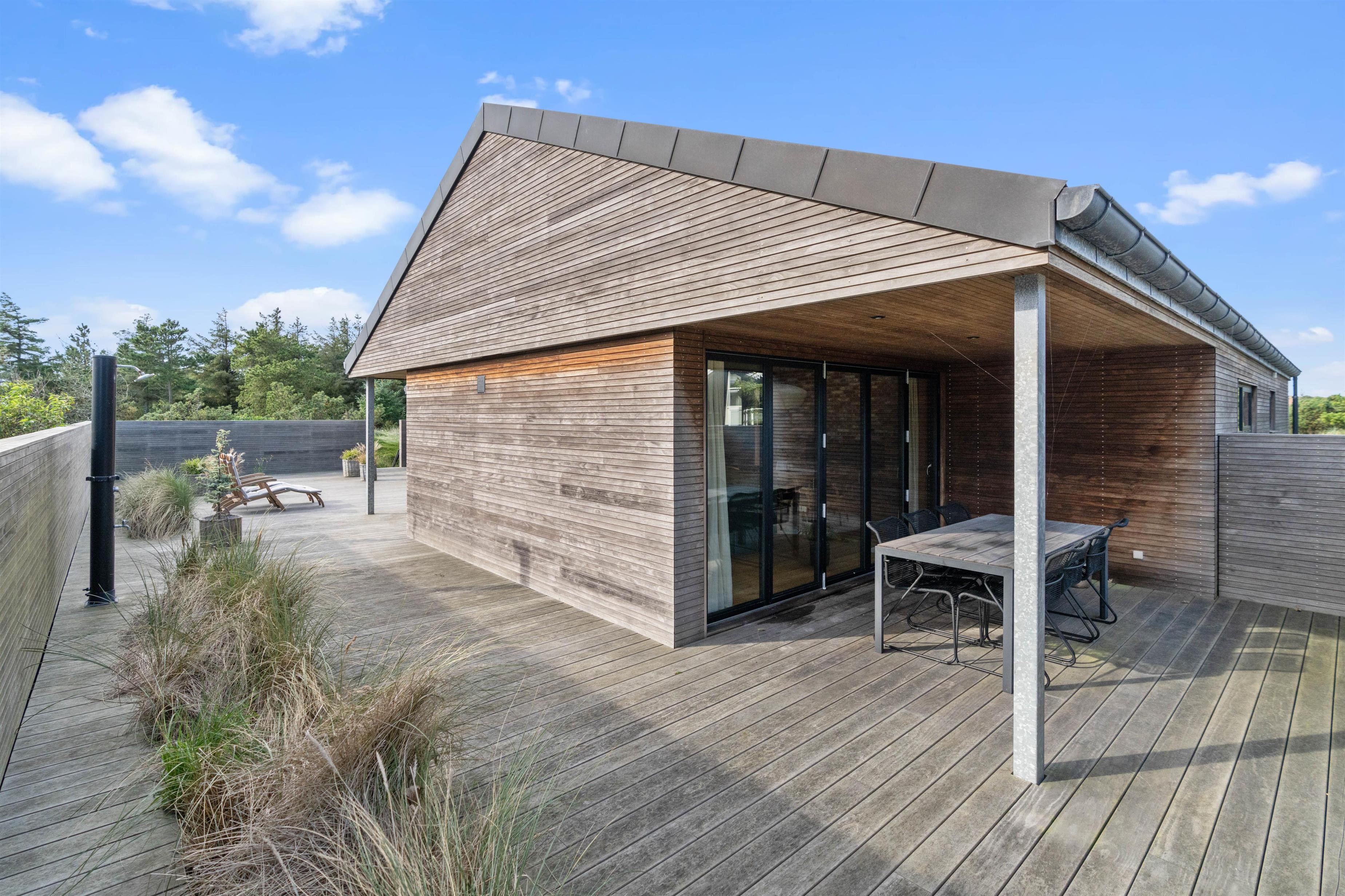 Efter en gåtur ved stranden kan I skylle sandet af under sommerhusets udebruser, der kan benyttes fra april til november.