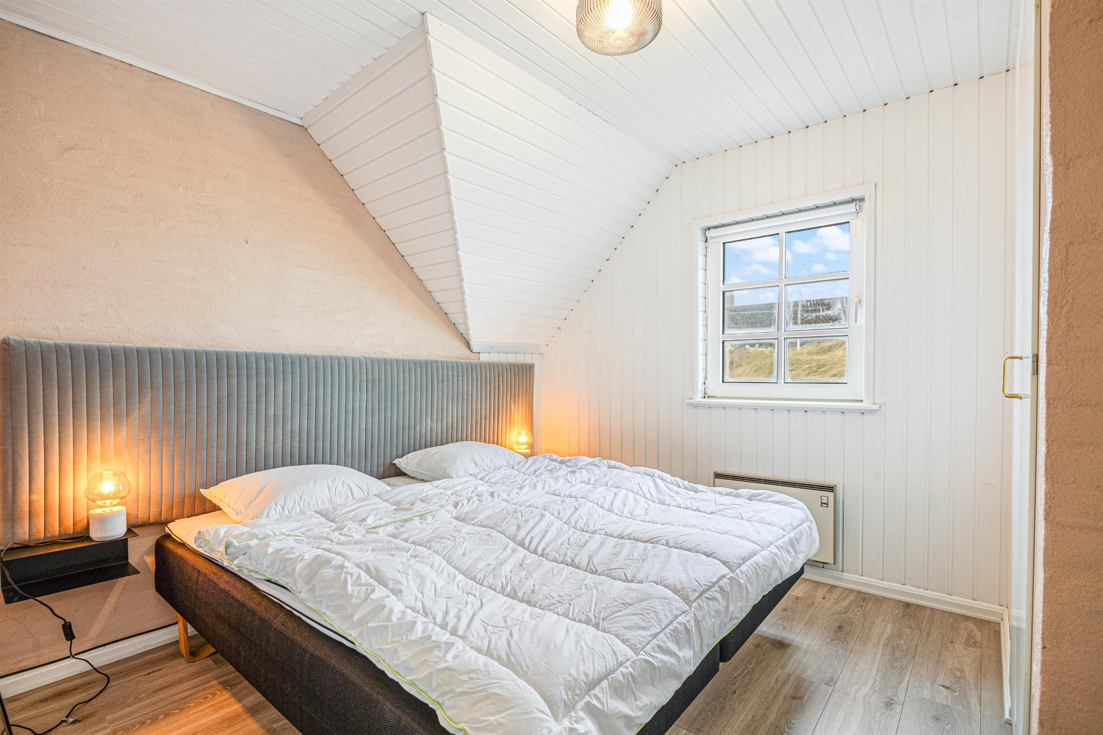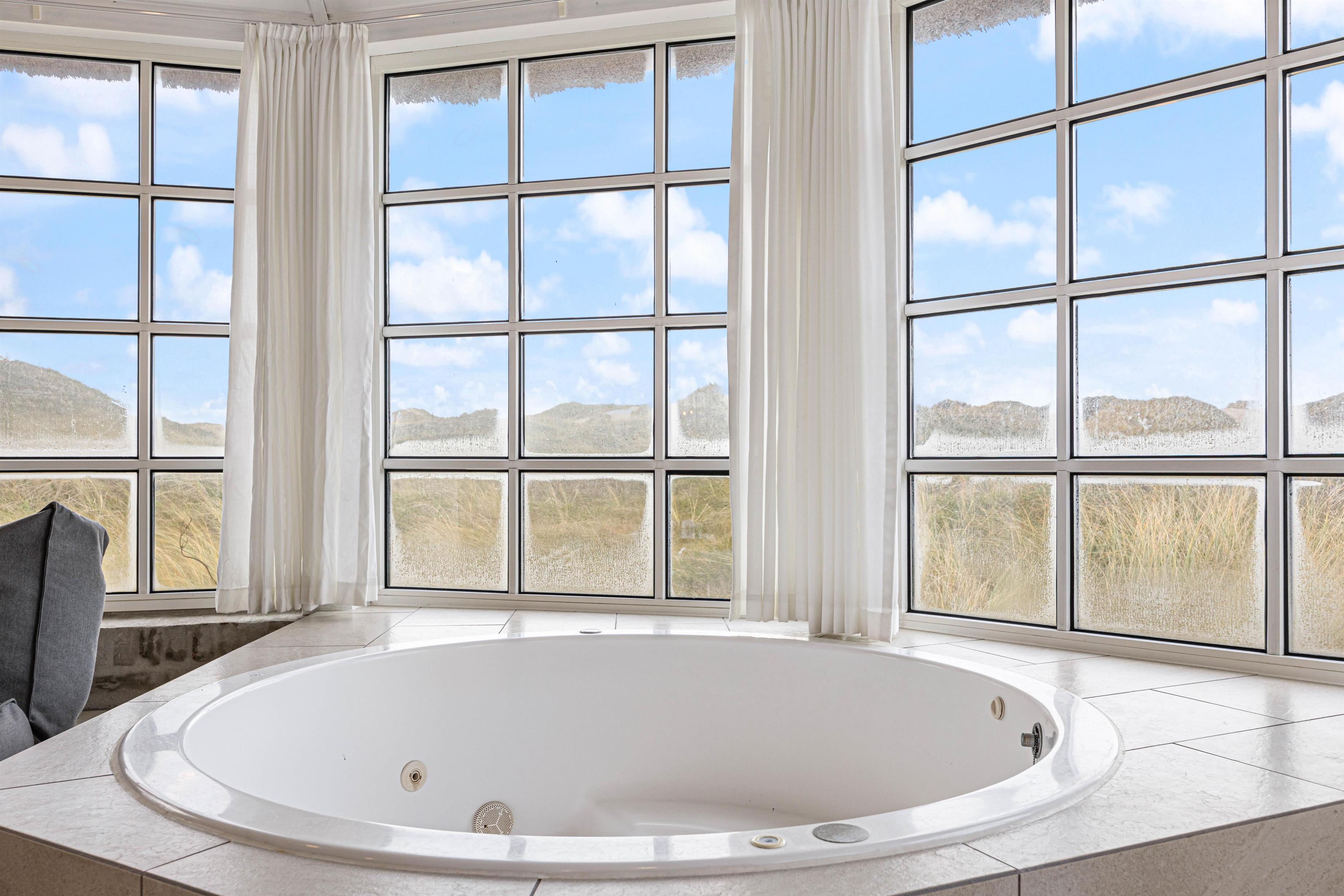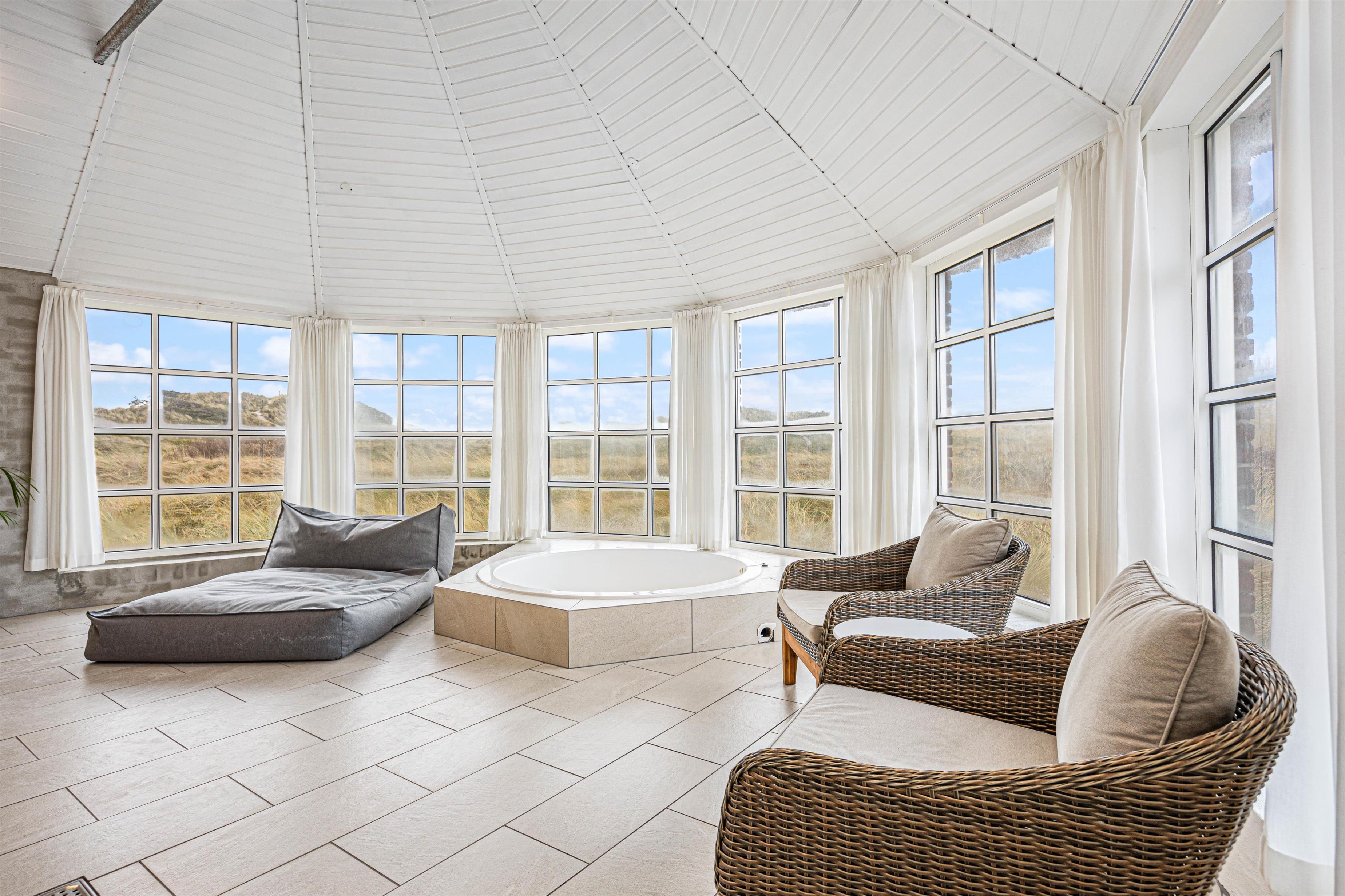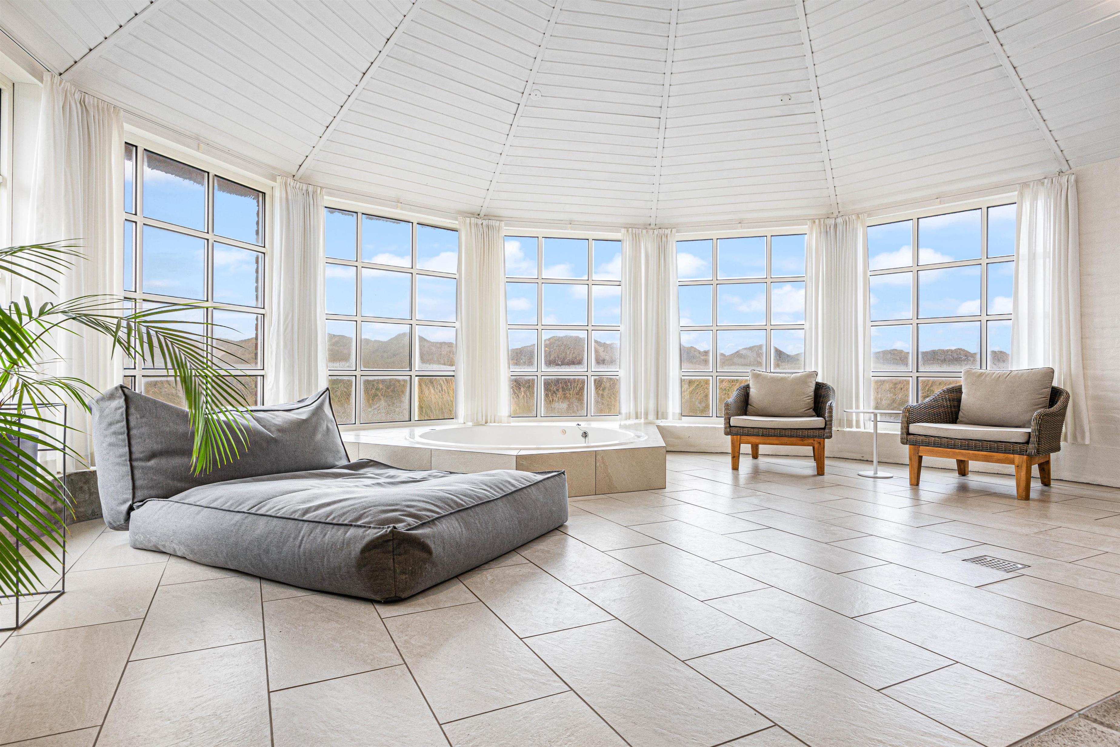 Med dette sommerhus er I ikke afhængige af vejret udenfor. Den 16 m2 store pool byder på timevis af underholdning for store og små i alle aldre. Selv når landskabet ligger dækket af en blød dyne af hvid sne, kan ungerne hoppe i vandet i husets pool. Poolen bliver opvarmet med en energivenlig varmepumpe, hvilket betyder et mindre forbrug. Sommerhuset har desuden en dejlig sauna og et stort spabad til 4 personer. Fra spabadet har du en helt fantastisk udsigt til det bølgende klitlandskab udenfor. Det giver velvære til krop og sjæl efter en lang dag i den friske luft.