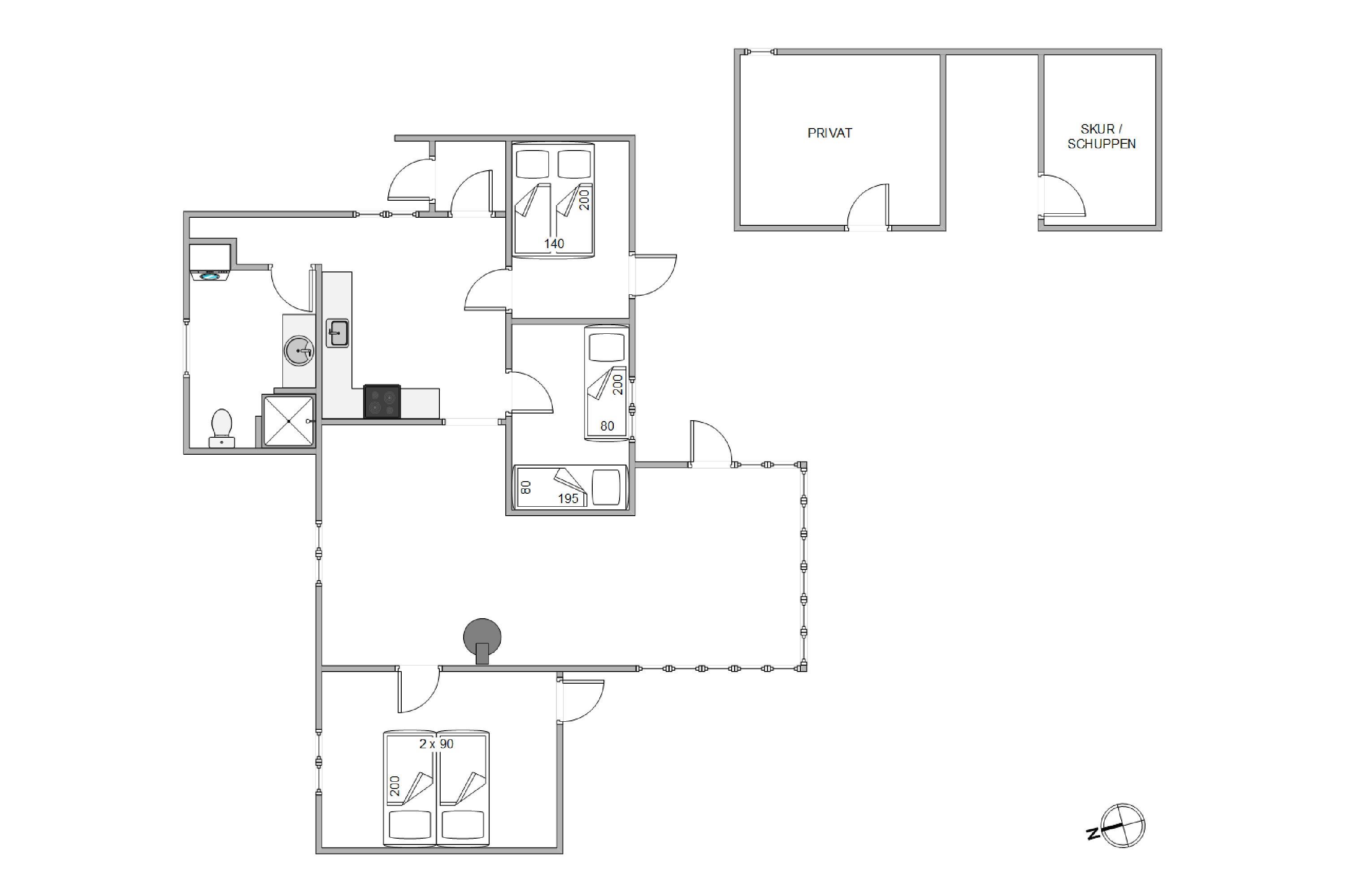 Sommerhuset byder på en god planløsning, der inkluderer 3 soverum. Her finder I 2 dobbeltsenge og 2 enkeltsenge, så der er god plads til hele familien eller en gruppe venner. Jeres hund er også meget velkommen her. I stuen kan I nyde hyggen fra brændeovnen på de køligere aftener, mens den energibesparende luft-til-luft-varmepumpen sikrer komfort året rundt.