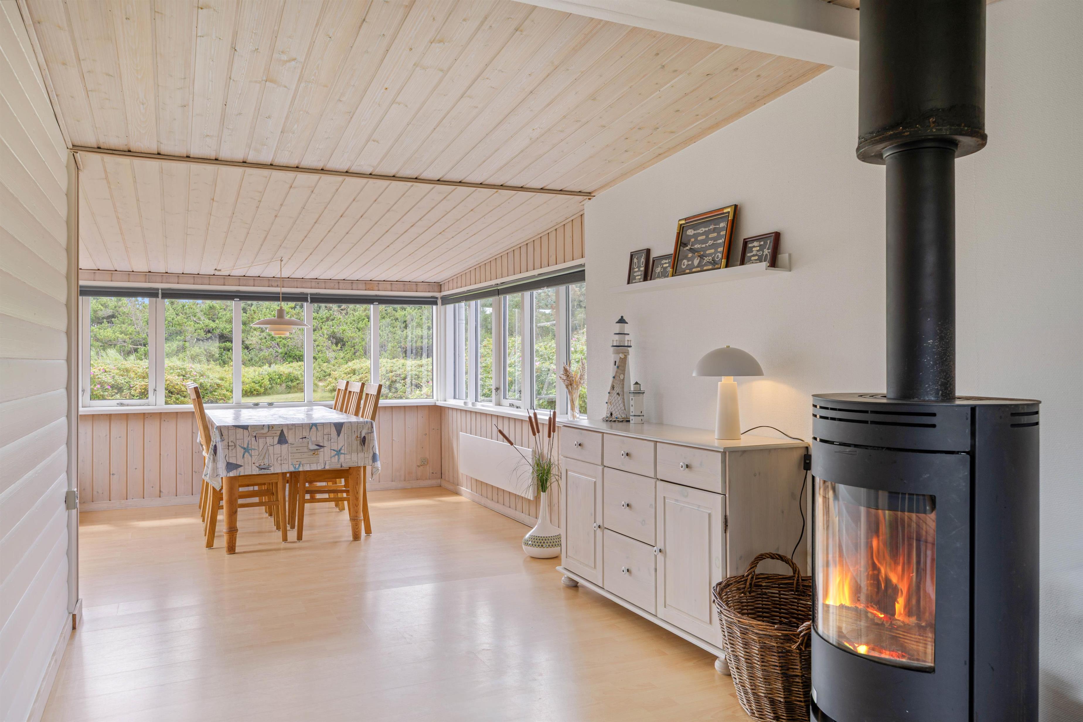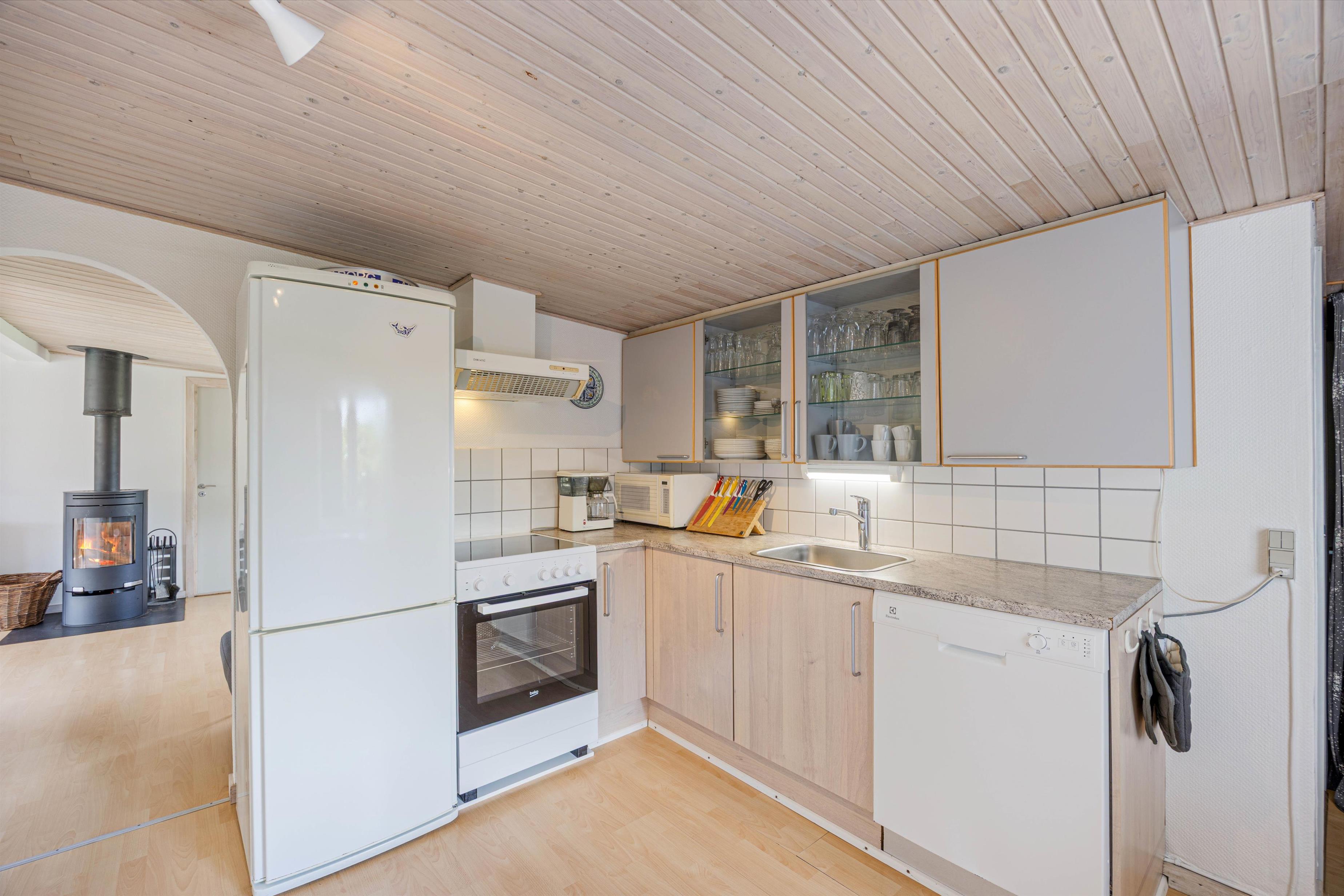 Det åbne køkken er veludstyret og har en separat fryser på 60 liter, så madlavning og opbevaring bliver en leg. Sommerhuset har desuden en skøn lille udestue i forlængelse af stuen, hvor I kan nyde det gode lysindfald fra de mange vinduer. Her kan I planlægge morgendagens strabadser eller spille hyggelige, medbragte brætspil. I sommerhuset kan I nemt rydde af bordet efter aftensmaden, da opvaskemaskinen klarer opvasken for jer.