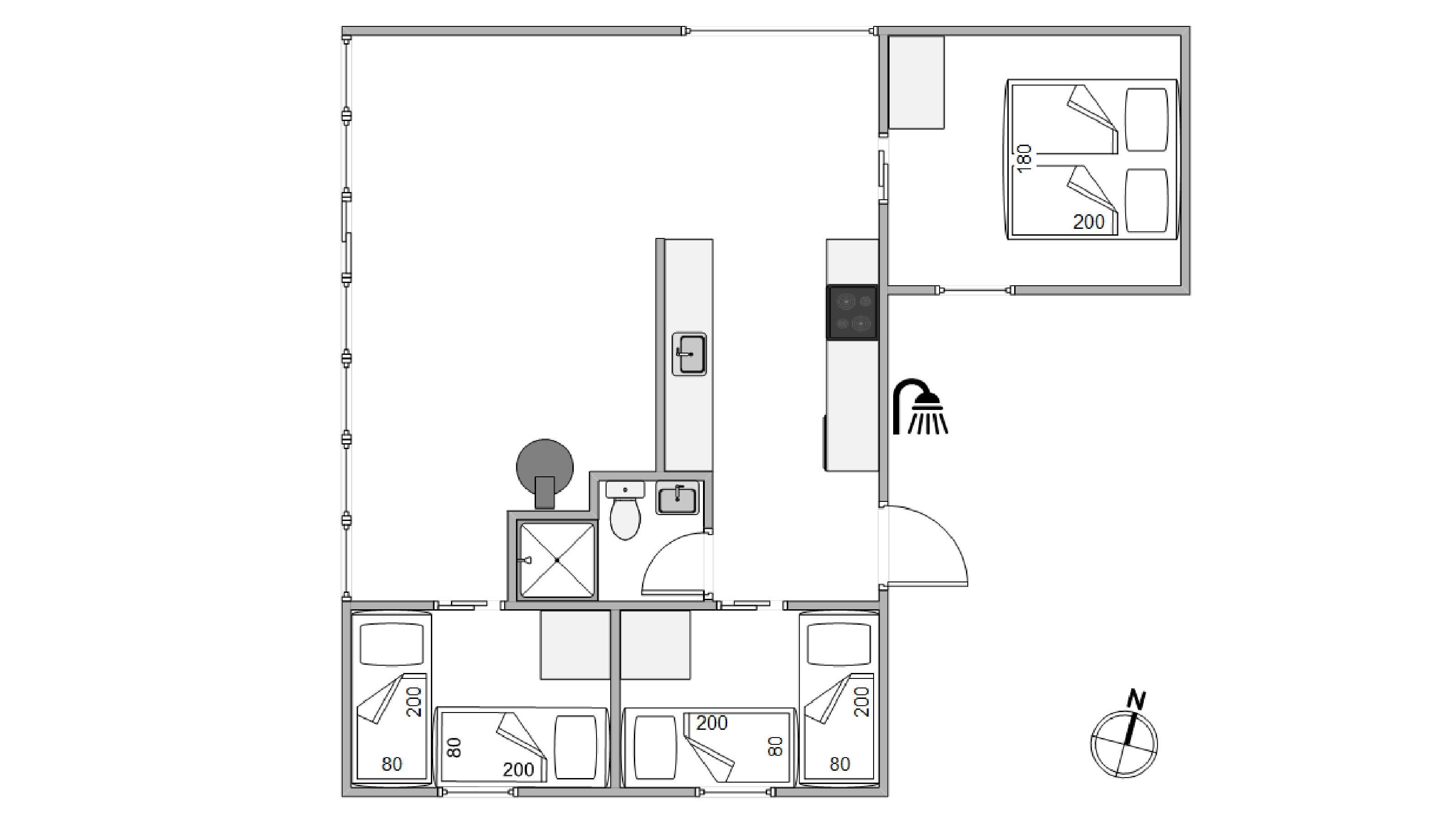 Sommerhuset er på 60 m2 og trods dets størrelse, rummer det fin plads til seks personer. Den åbne stue er i direkte forbindelse med både køkken og spisestue. Her kan I spille brætspil, lave mad eller slappe af sammen foran den knitrende ild i kaminen. Den energivenlige varmepumpe sikrer en behagelig og konstant temperatur.
