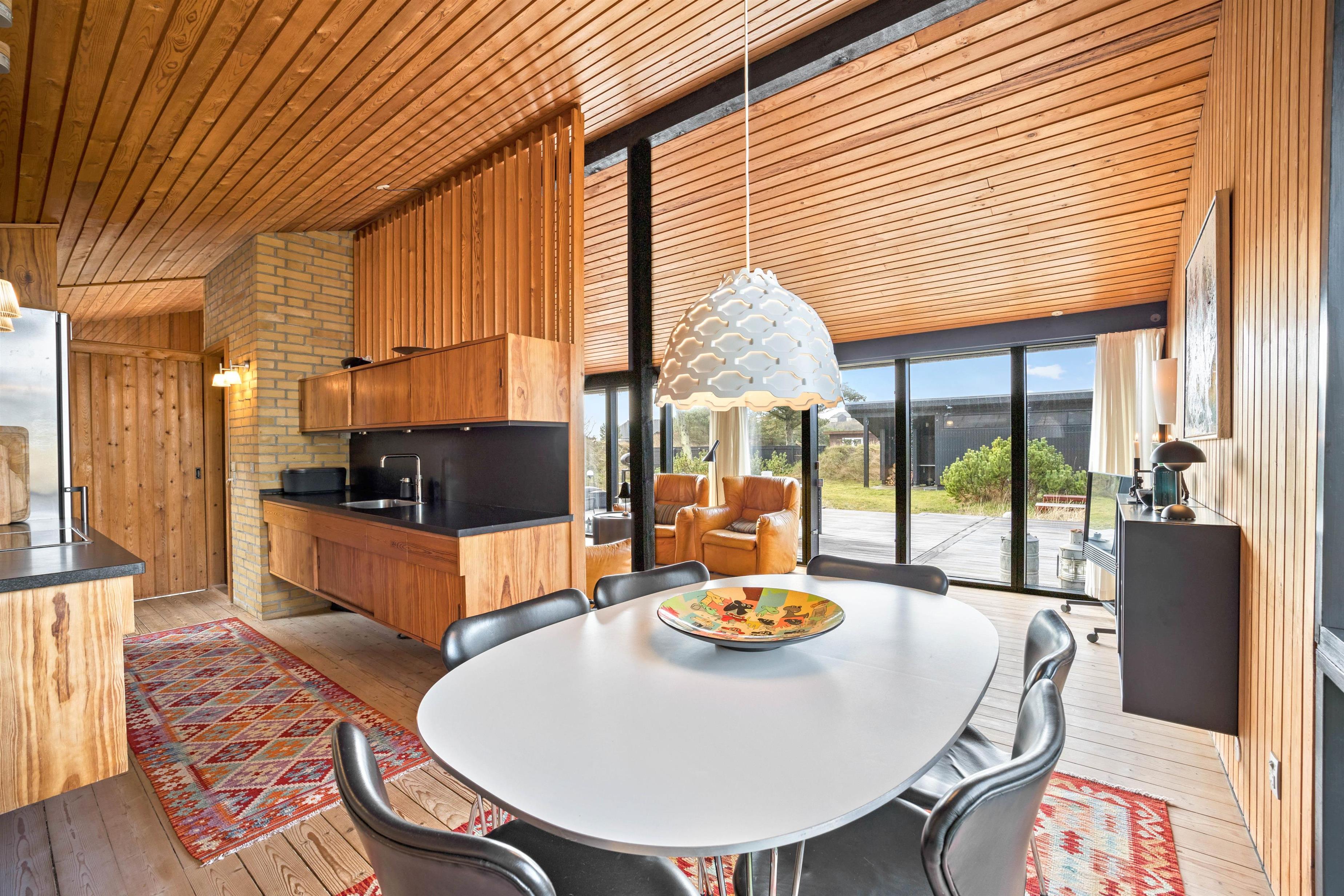 Når I træder ind i Skovdalen 8, bliver I mødt af et sommerhus, der kombinerer det klassiske med det moderne. Træpaneler og bjælkerne i loftet sørger for klassisk feriehuscharme, mens møblerne, køkkenet og de store vinduespartier bidrager til et moderne islæt.